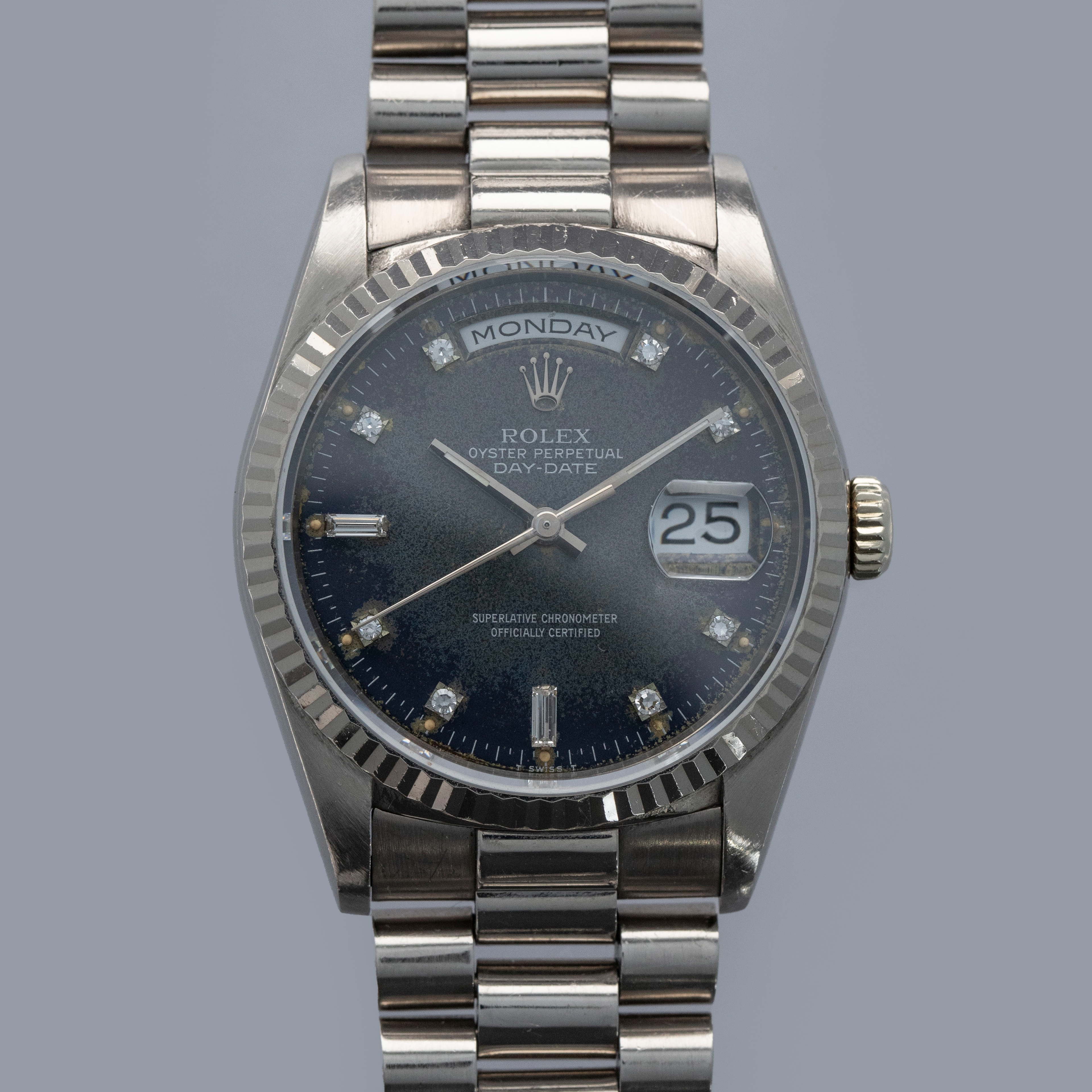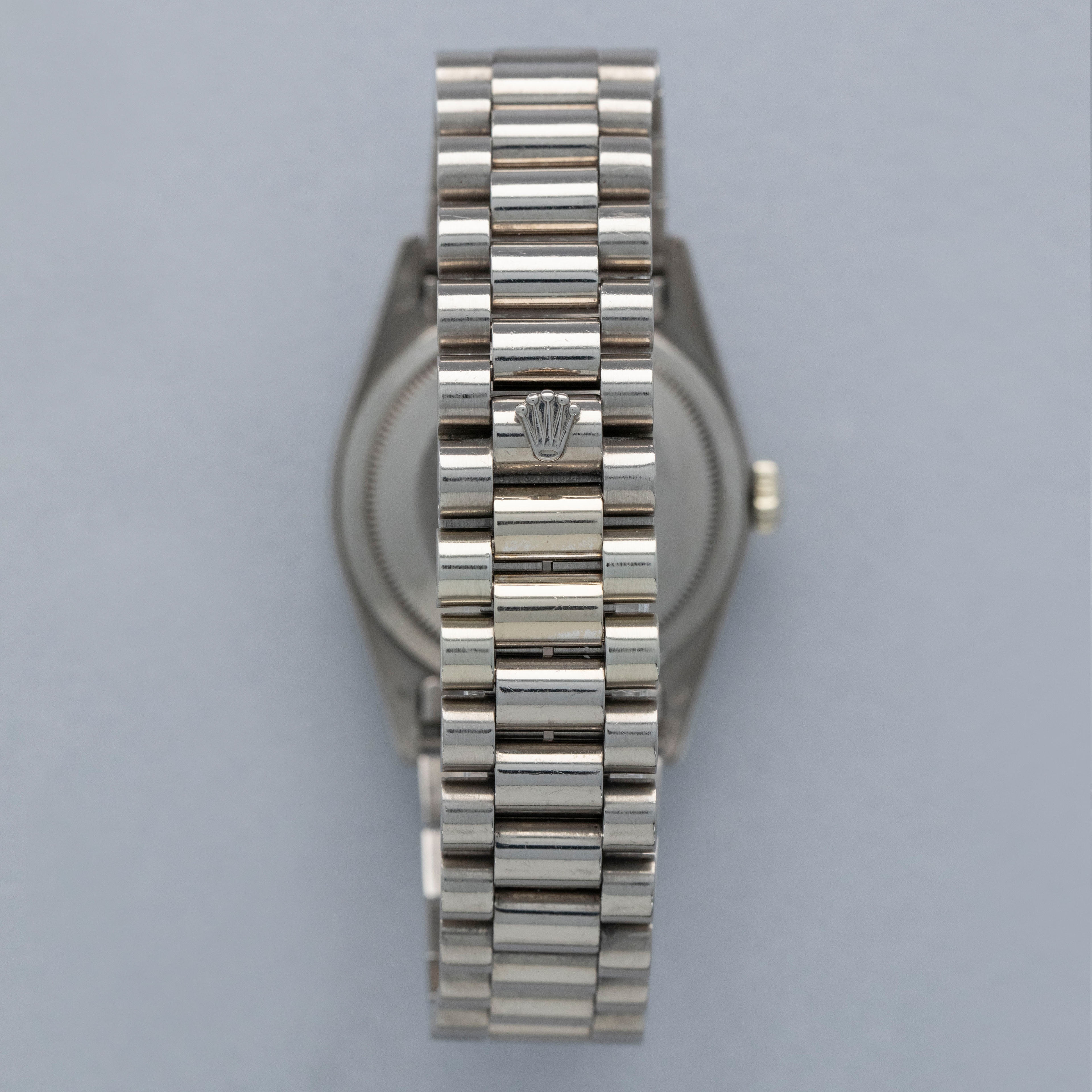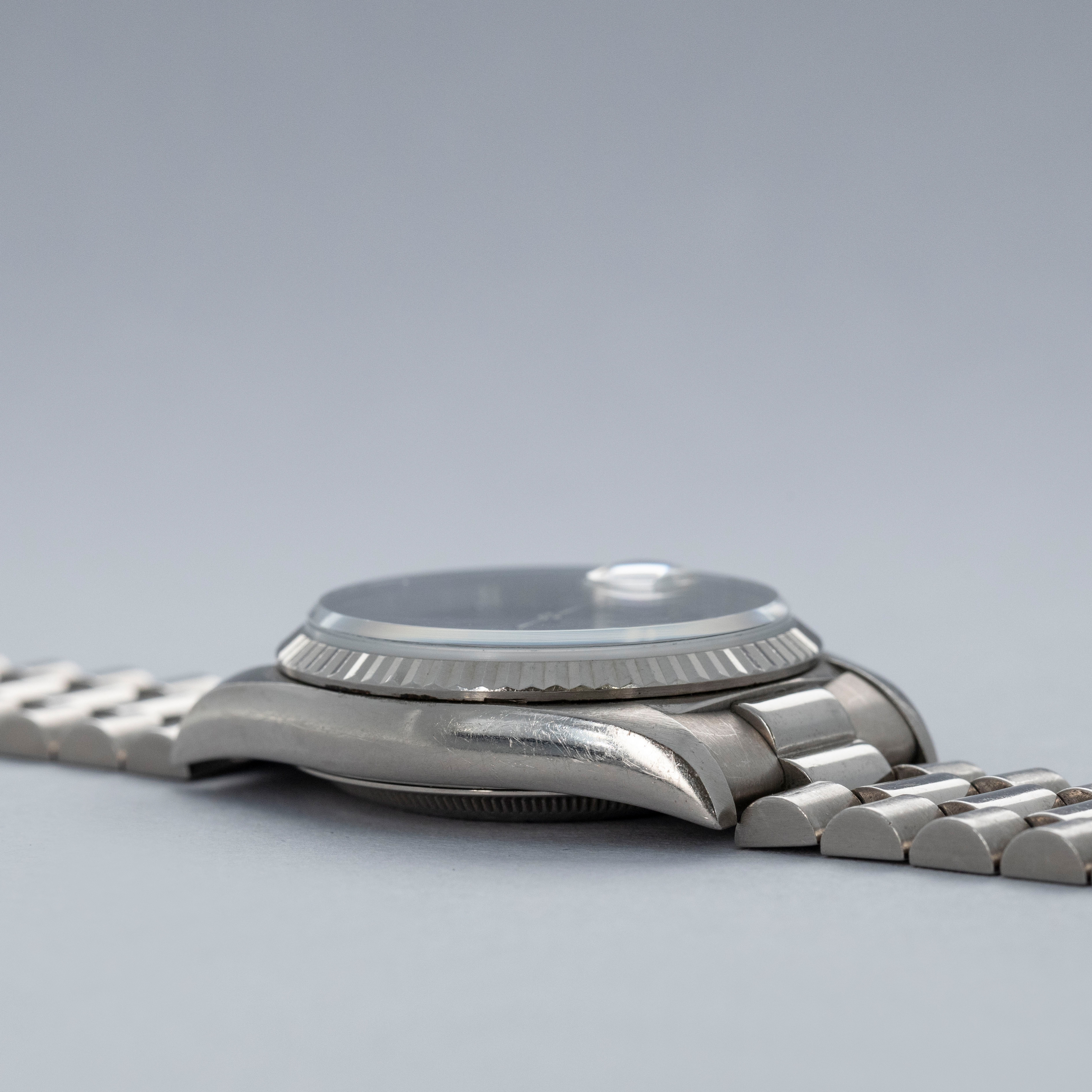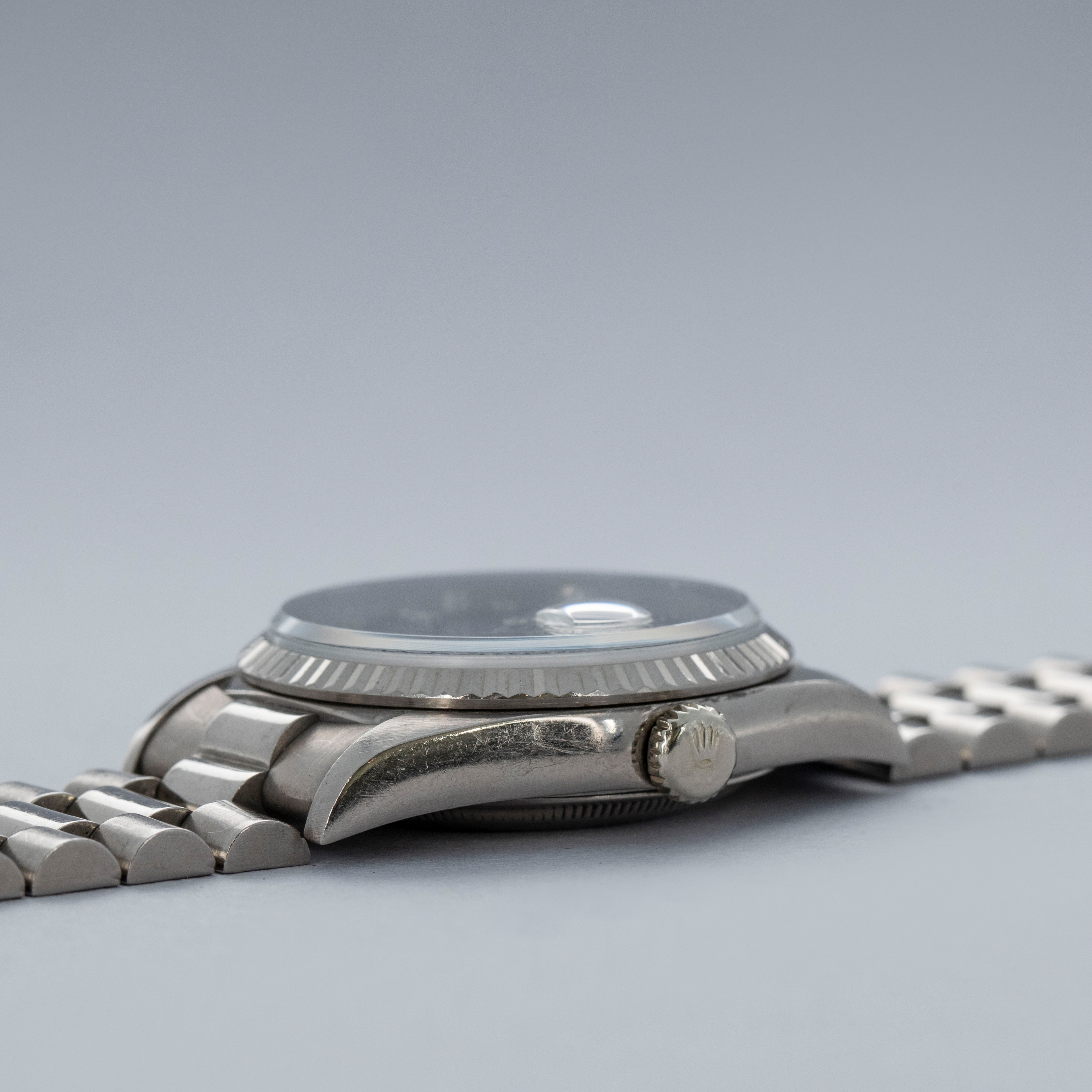 Watch is in overall very good condition. The white gold case shows numerous surface scratches and nicks, while the hallmarks on the backs of the lugs remain well defined. The bezel shows scratches with some nicks to the peaks, and the winding crown displays noticeable wear. The dial shows degradation across the surface with some lume plots missing. It is fitted with a white gold President bracelet with concealed clasp showing scratches and moderate play between the links. The bracelet is fitted with 24 links, 5 of which are removable, and fits approximately a 7¾” wrist.