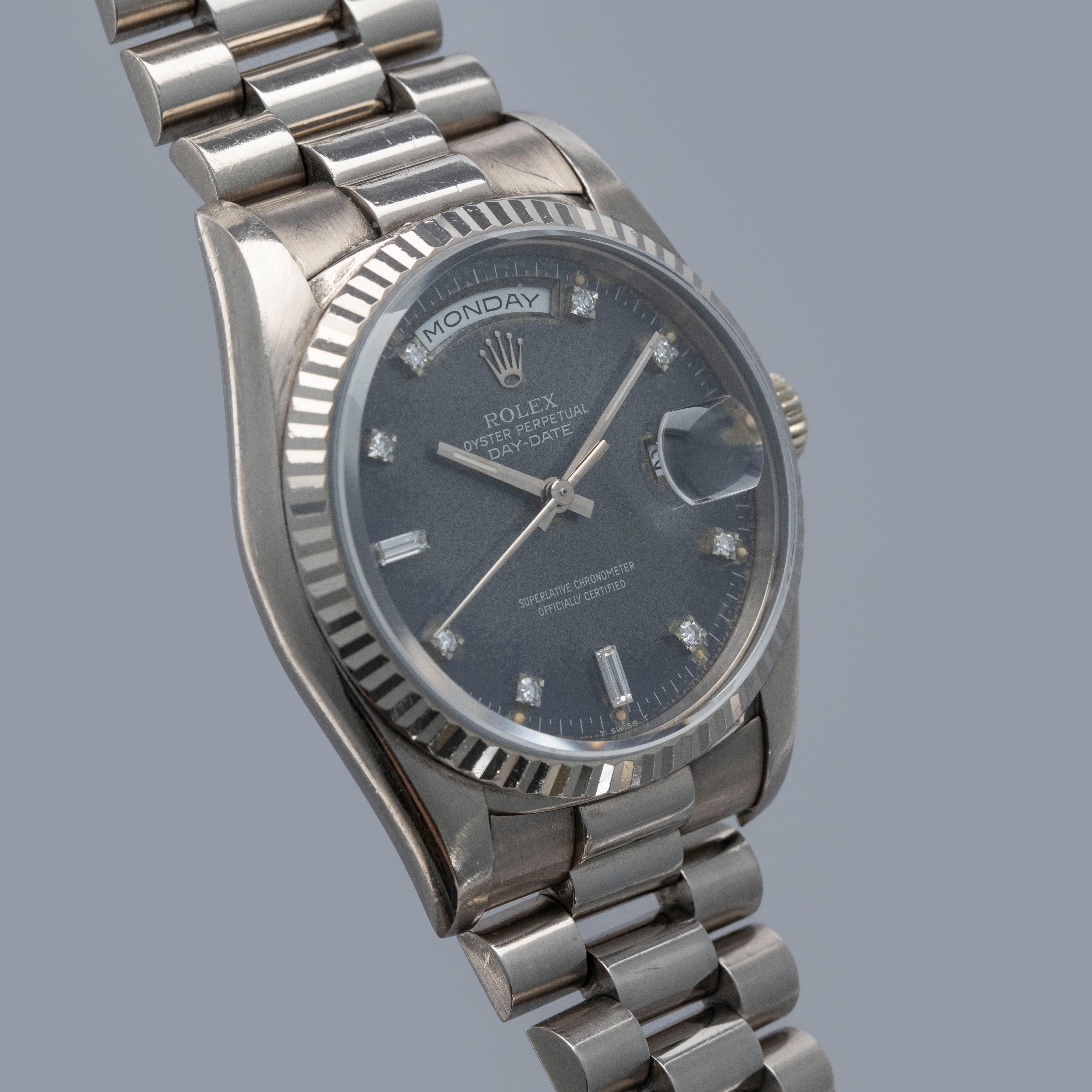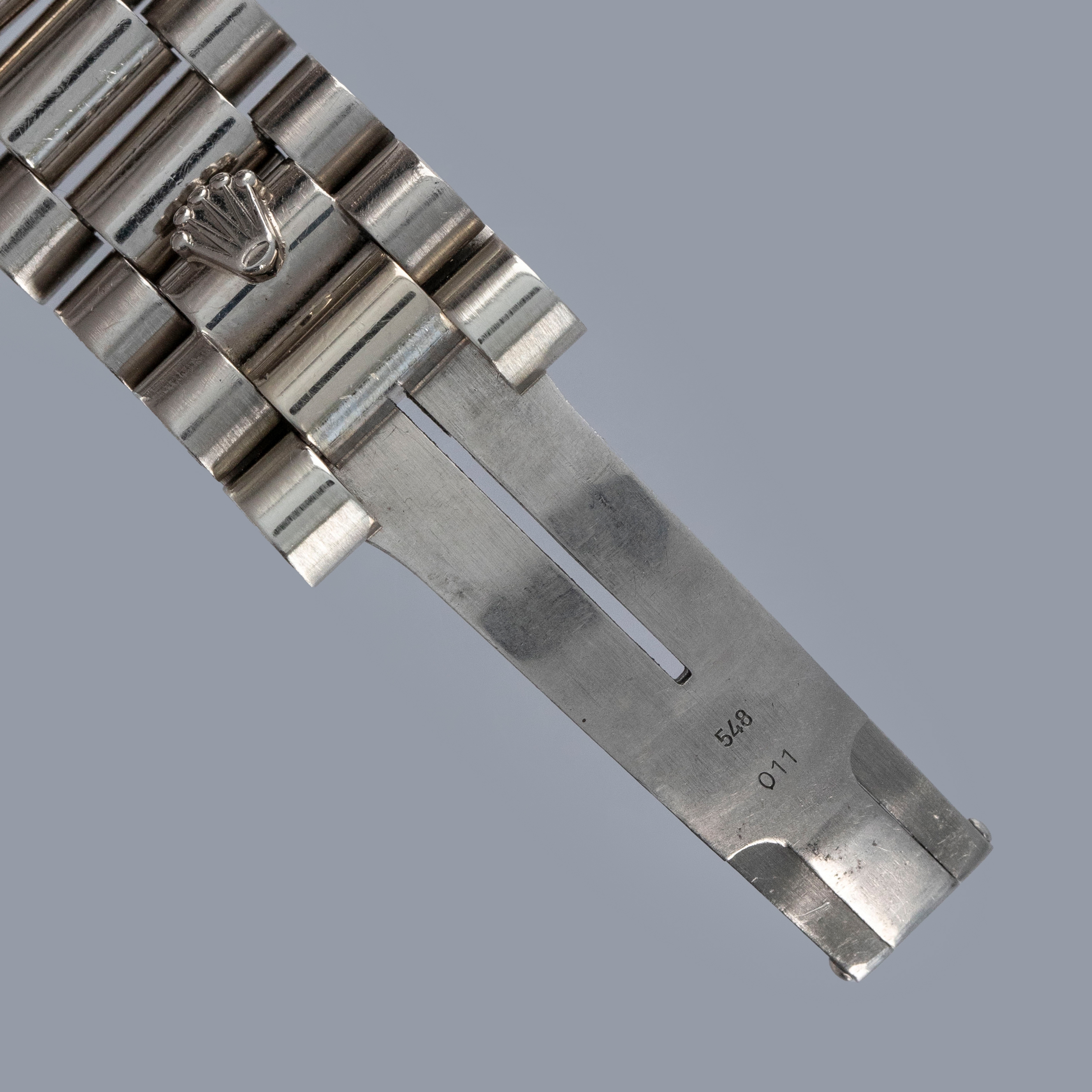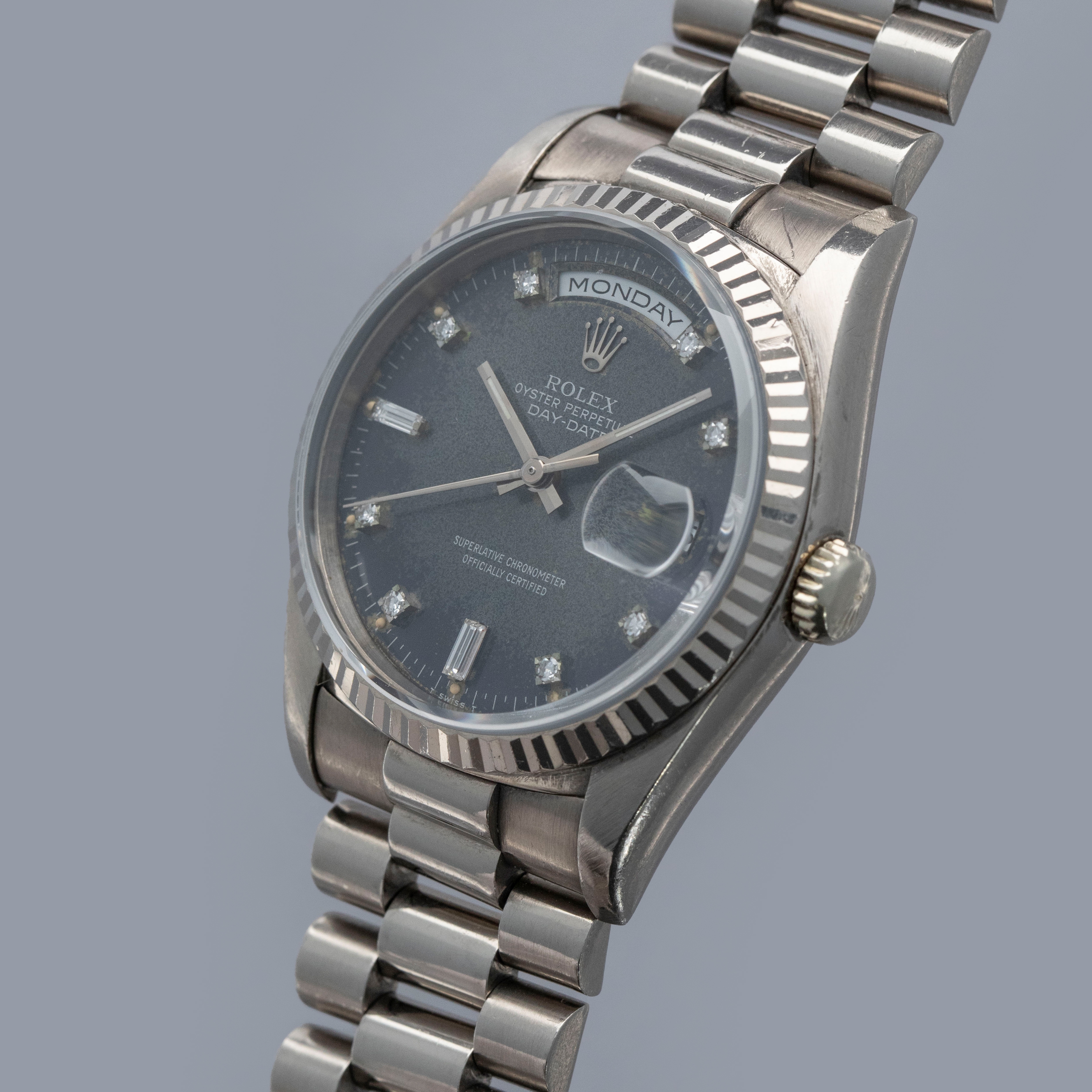 Boasting the Day-Date's presidential bracelet and Rolex's iconic fluted bezel, this example's 18kt white gold construction beautifully enhances its subtle silver dial and monochromatic design.