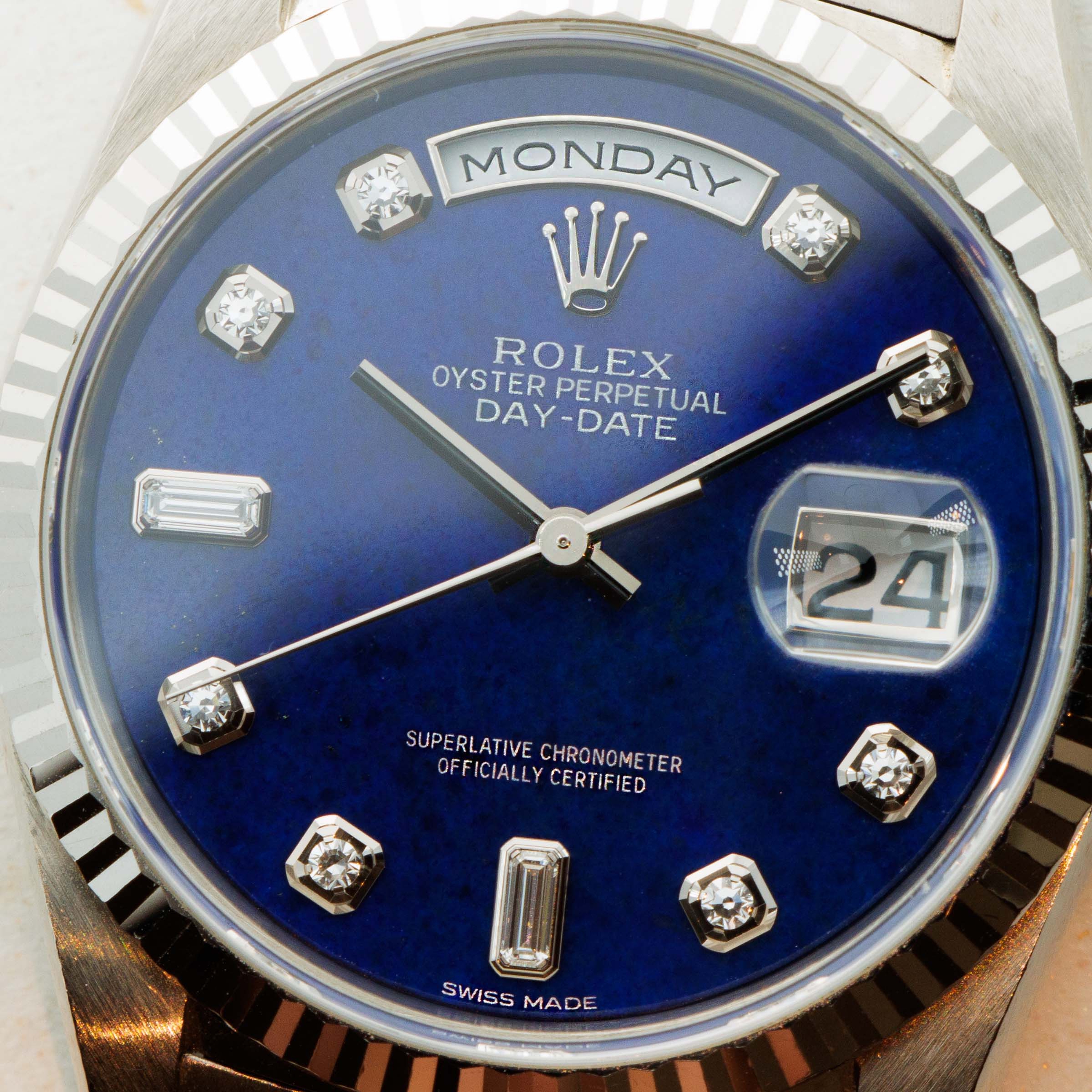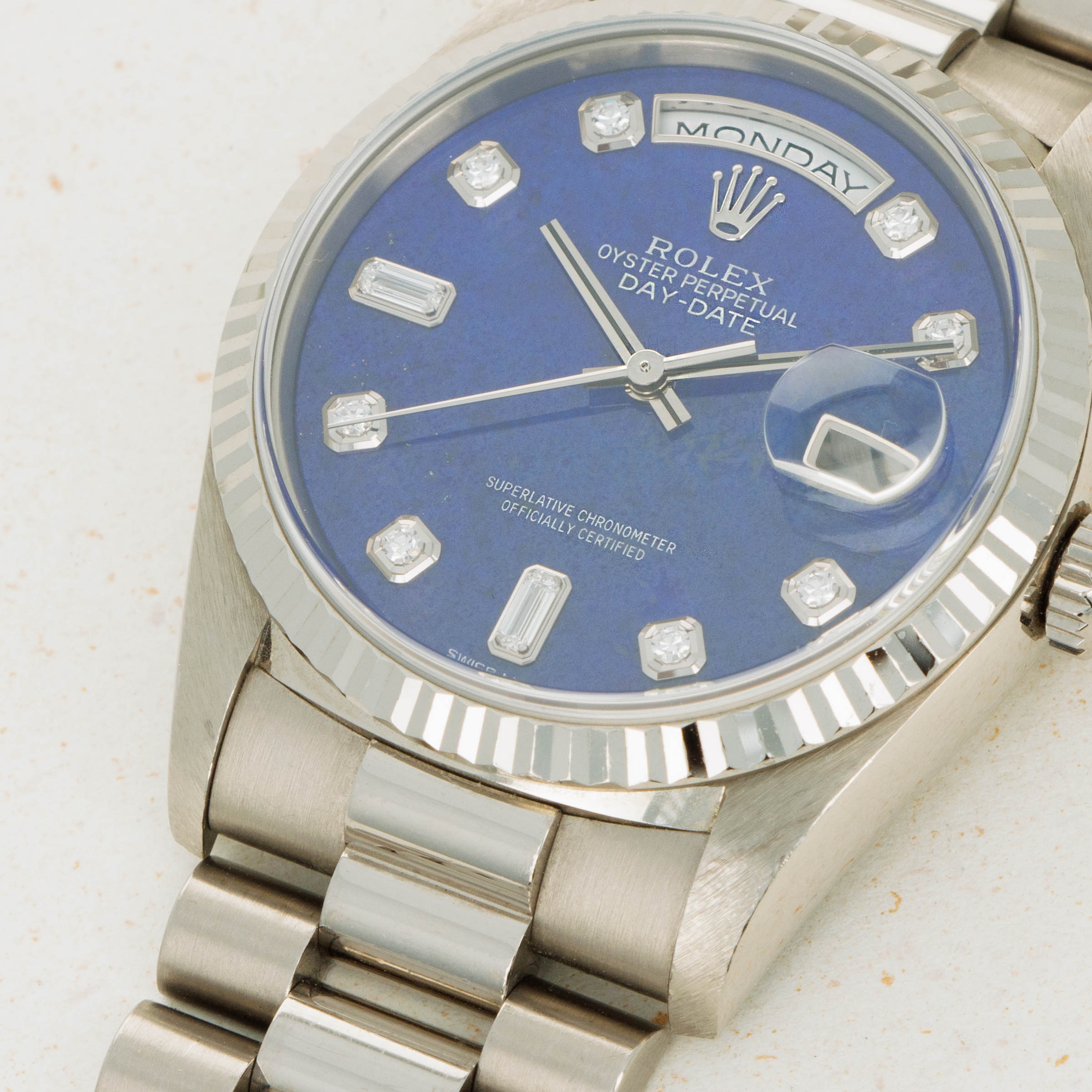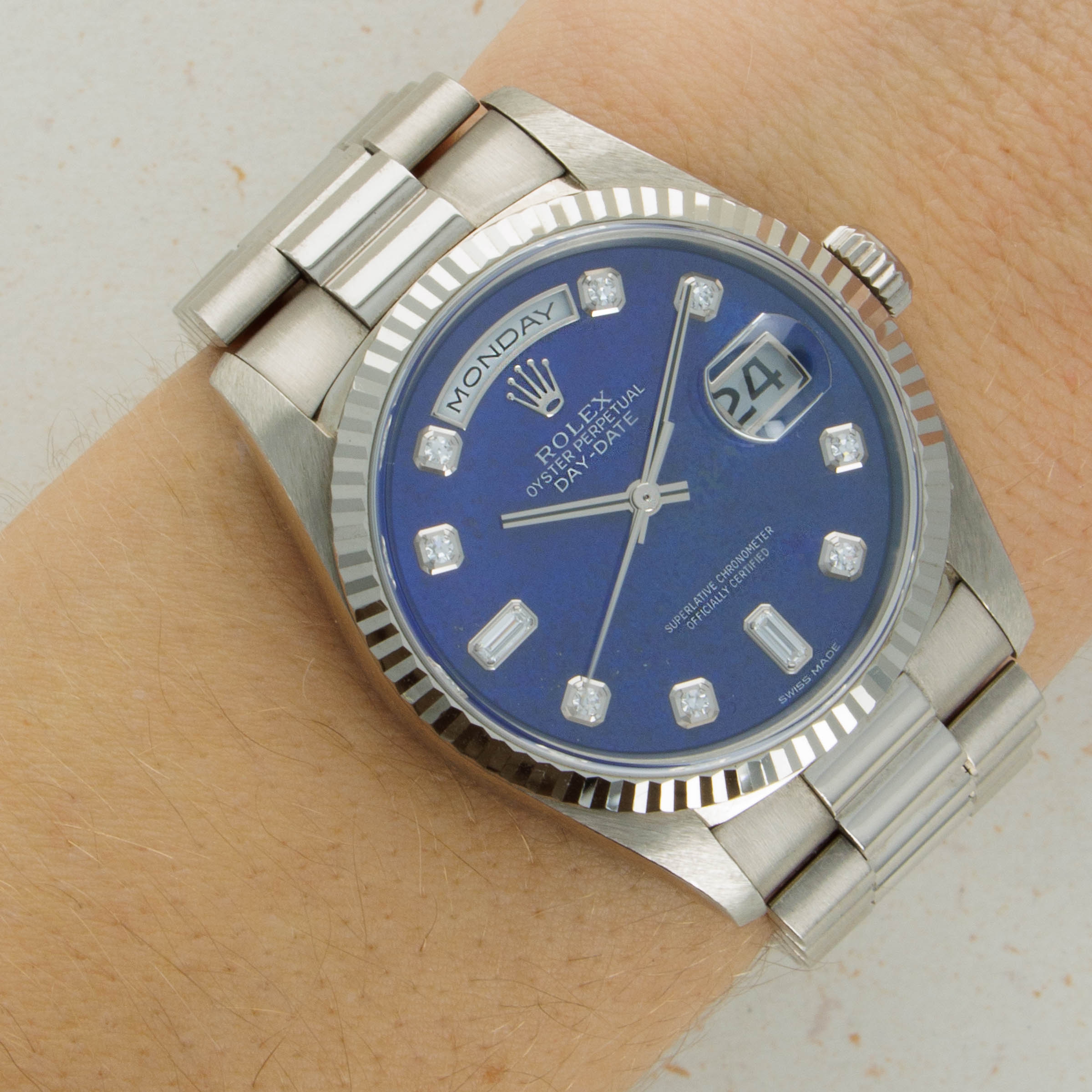 Fitted with a rich blue dial with diamond-set hour markers and two large baguette diamonds to add balance to the day and date apertures, the ref. 18239 is a wonderfully executed piece of luxurious watchmaking from Rolex.