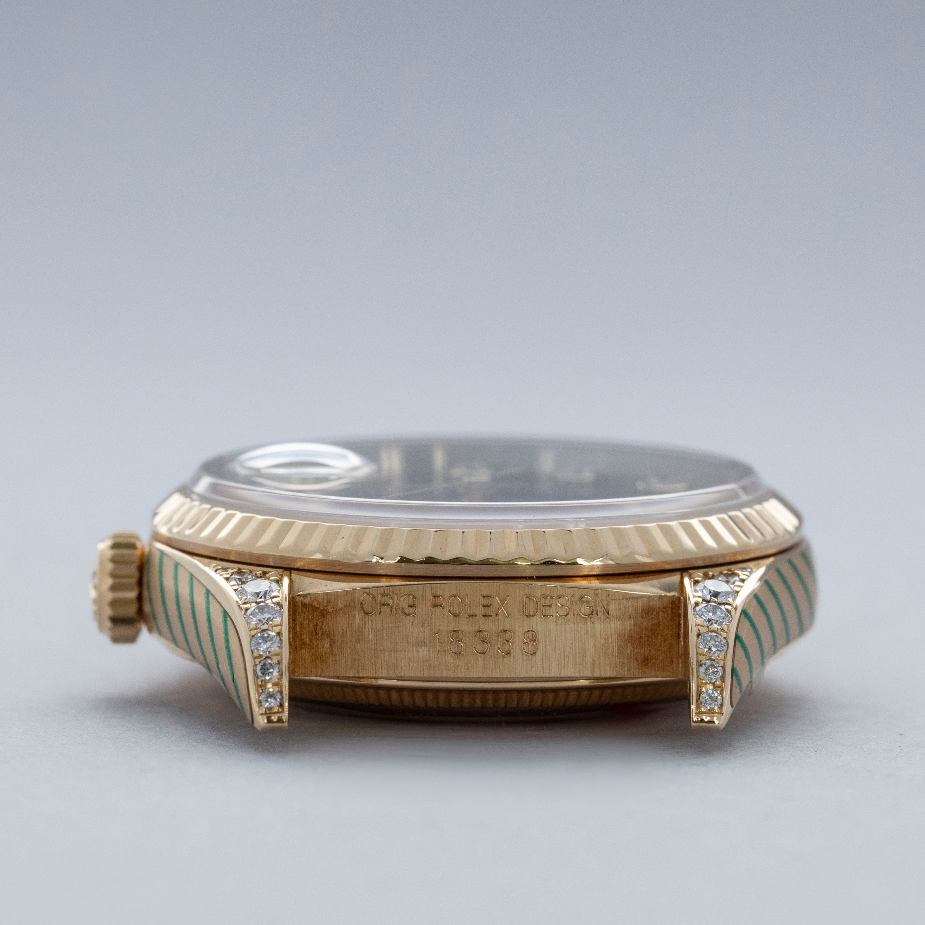 Encapsulating the very finest craftsmanship that Rolexc had to offer, the Day-Date ref. 18338 combines a diamond-set stone dial with a diamond-set construction and the collection's signature design elements to create the perfect Rolex.