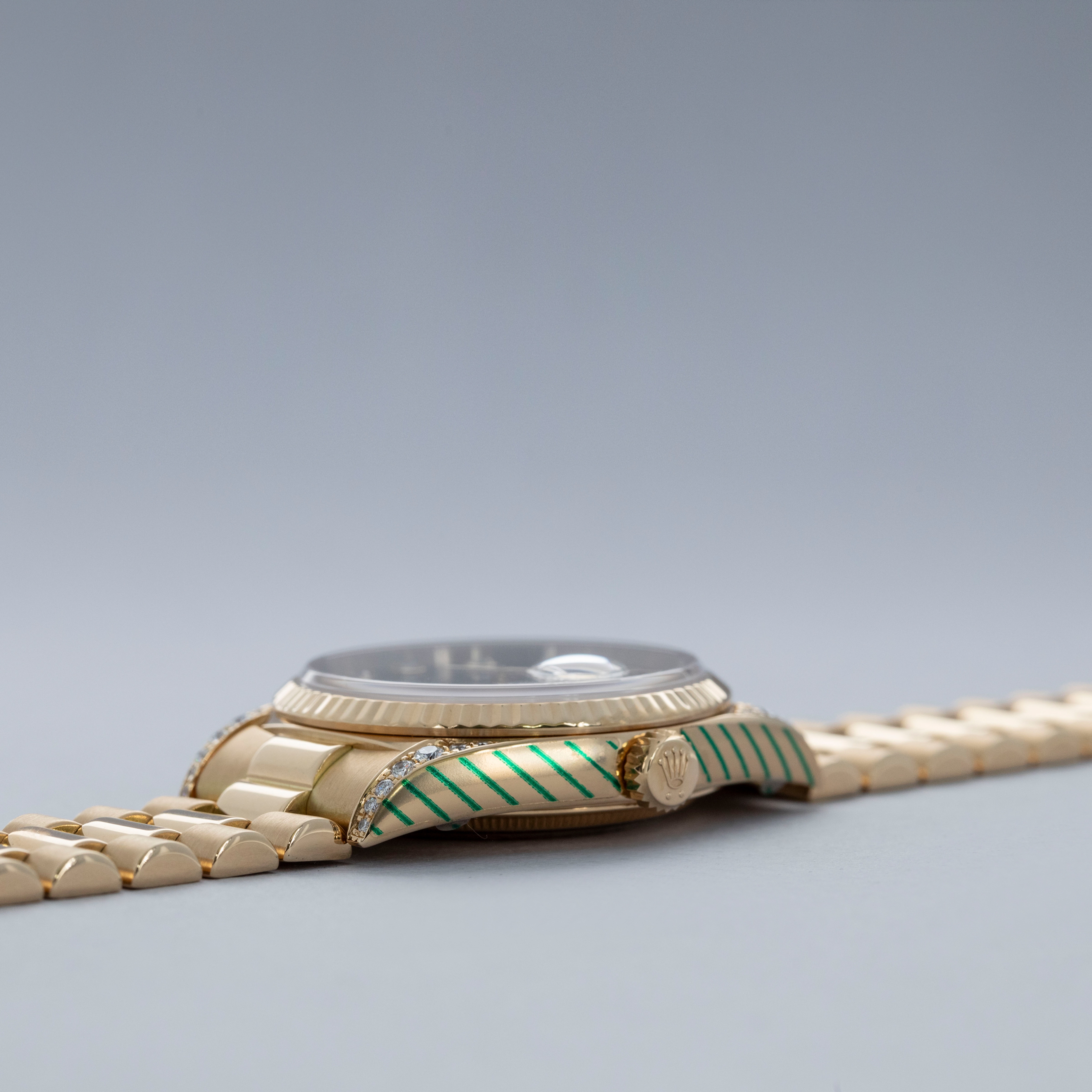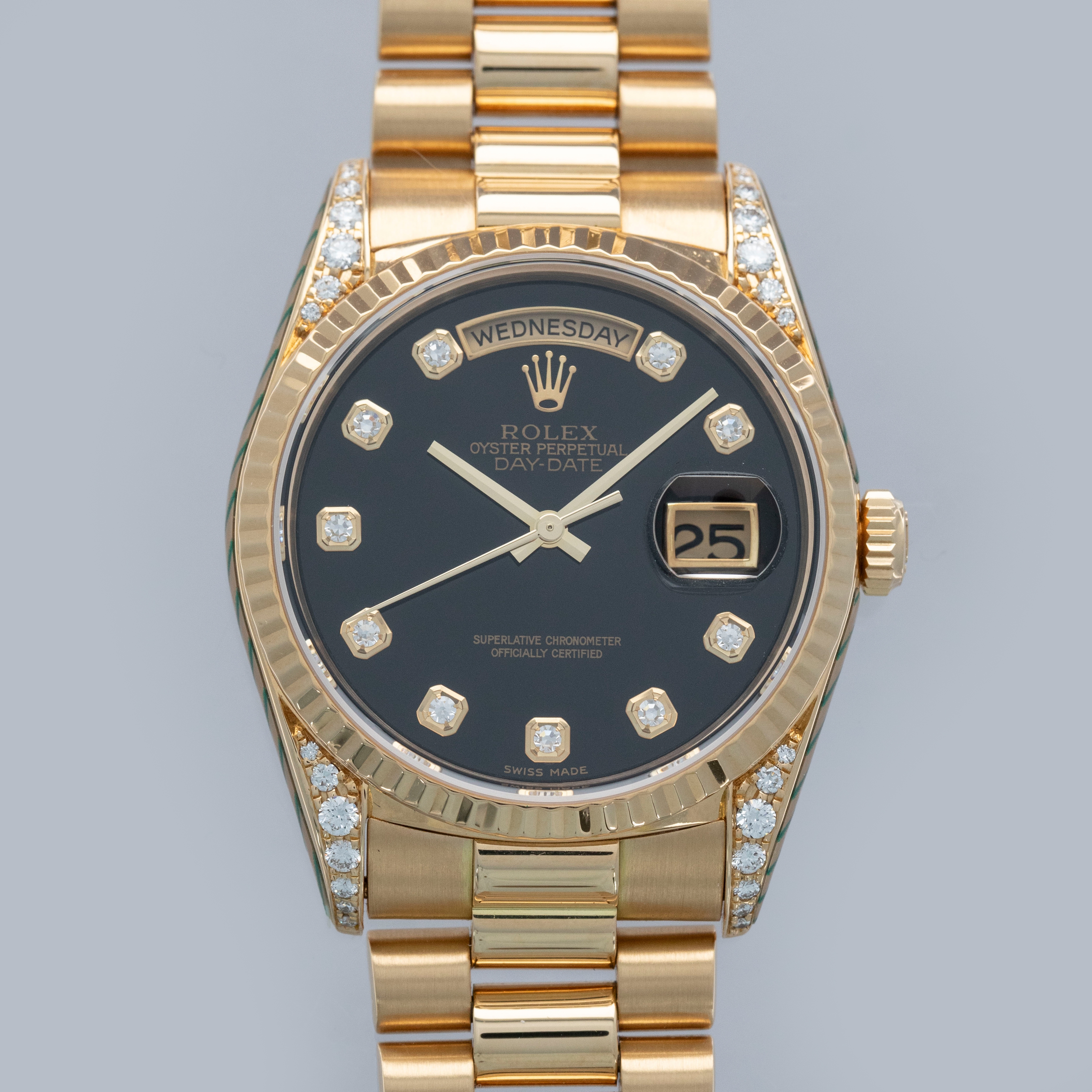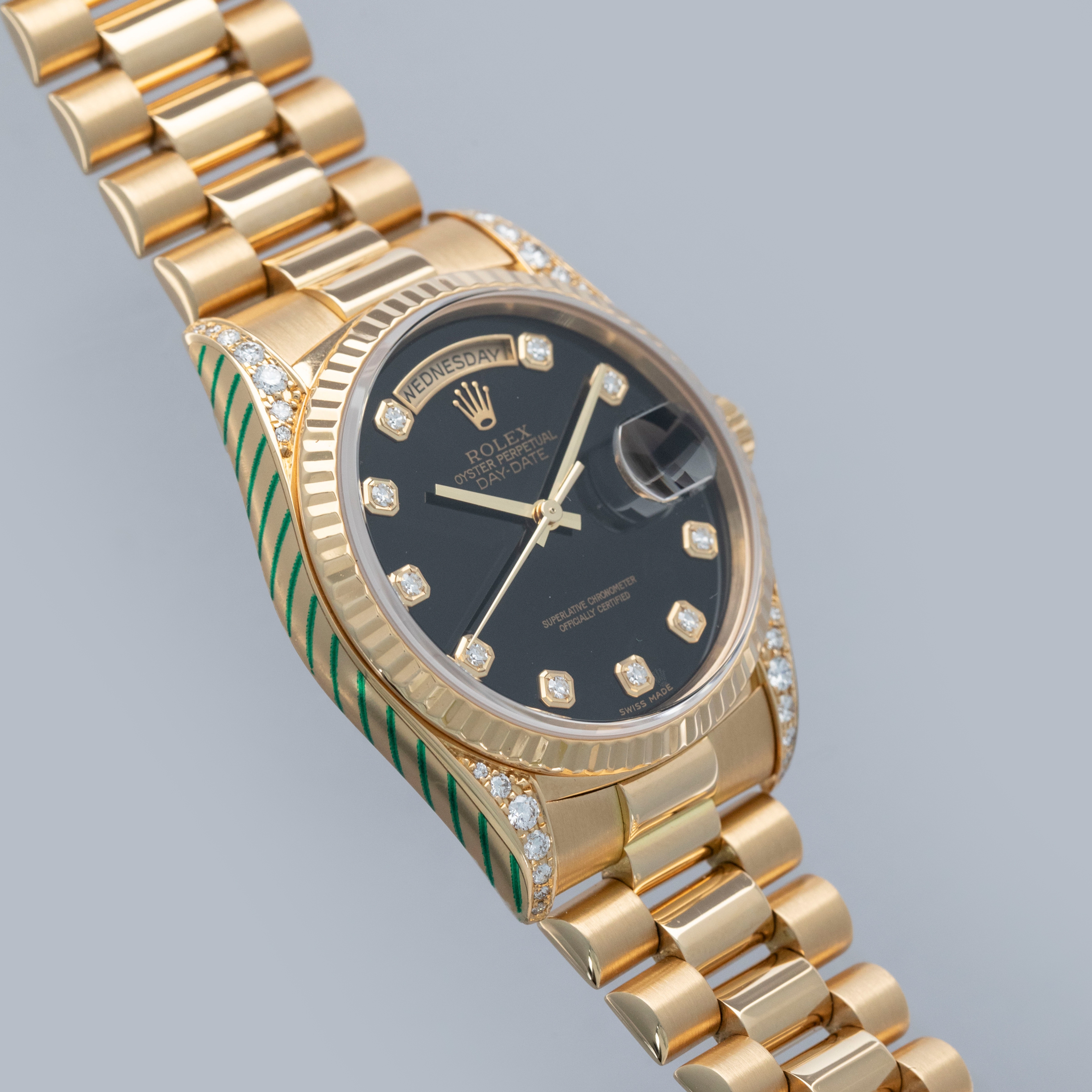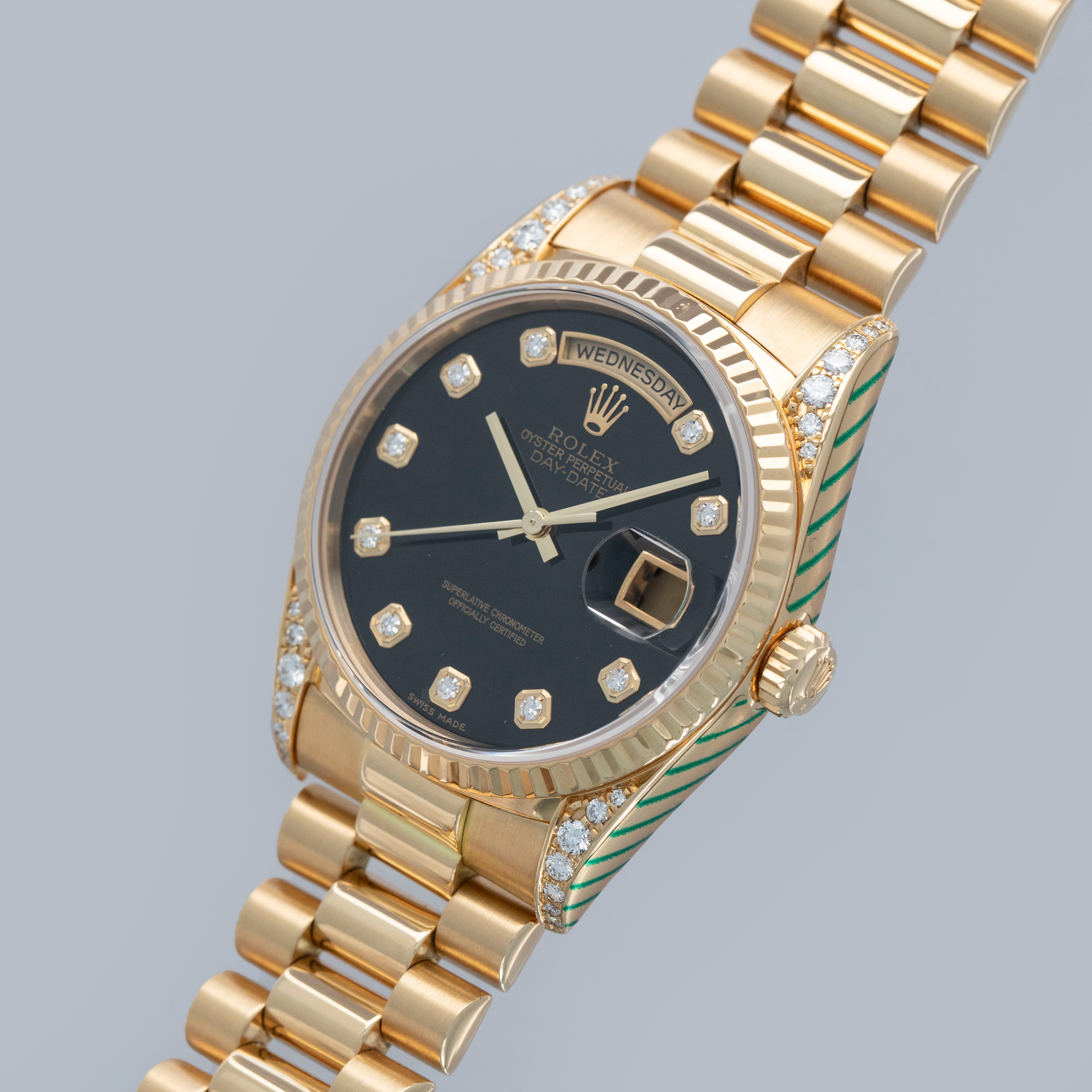 This particular day-date is a true unicorn- not only does it come with a diamond-set onyx dial, but the lug hoods are also diamond-set from the Rolex factory.