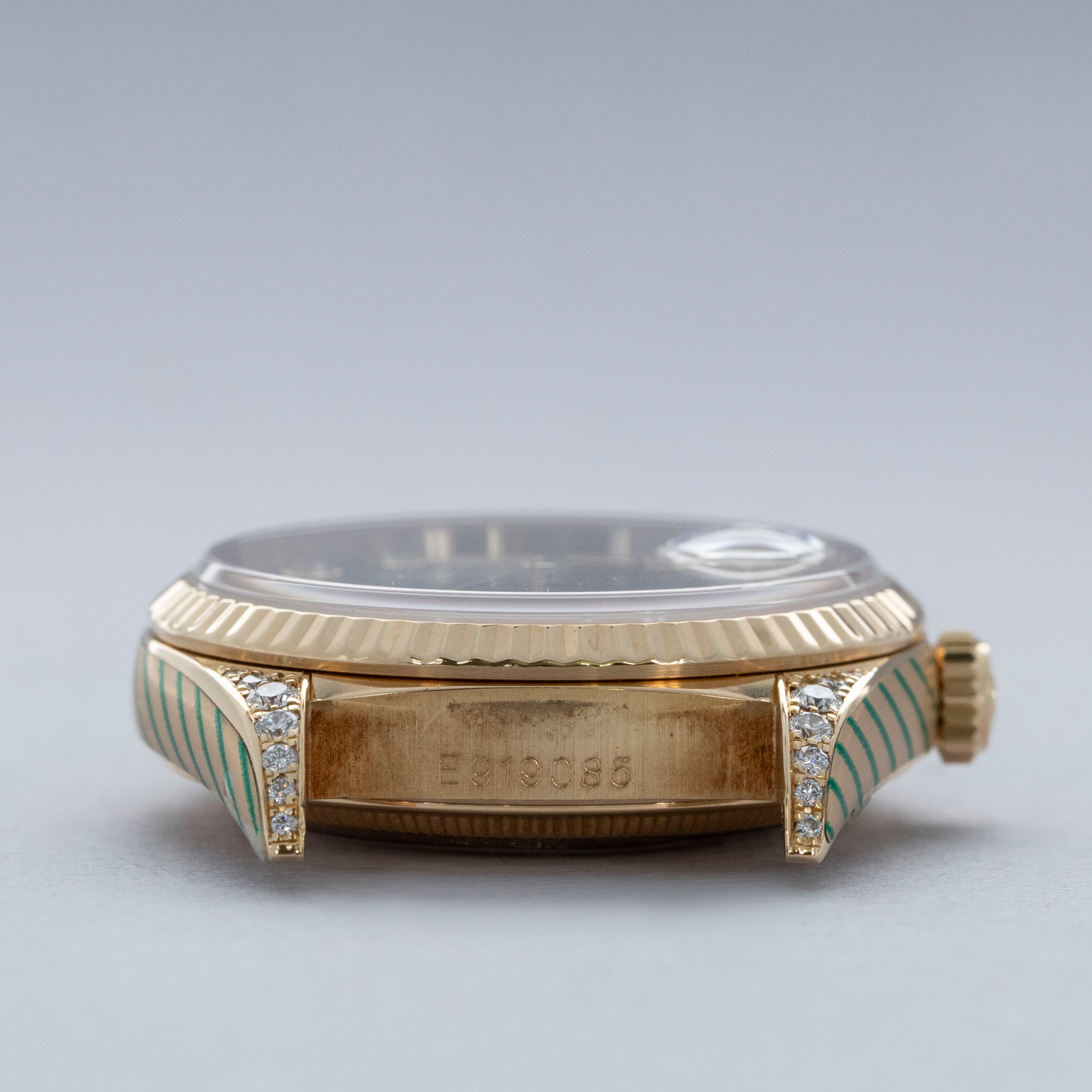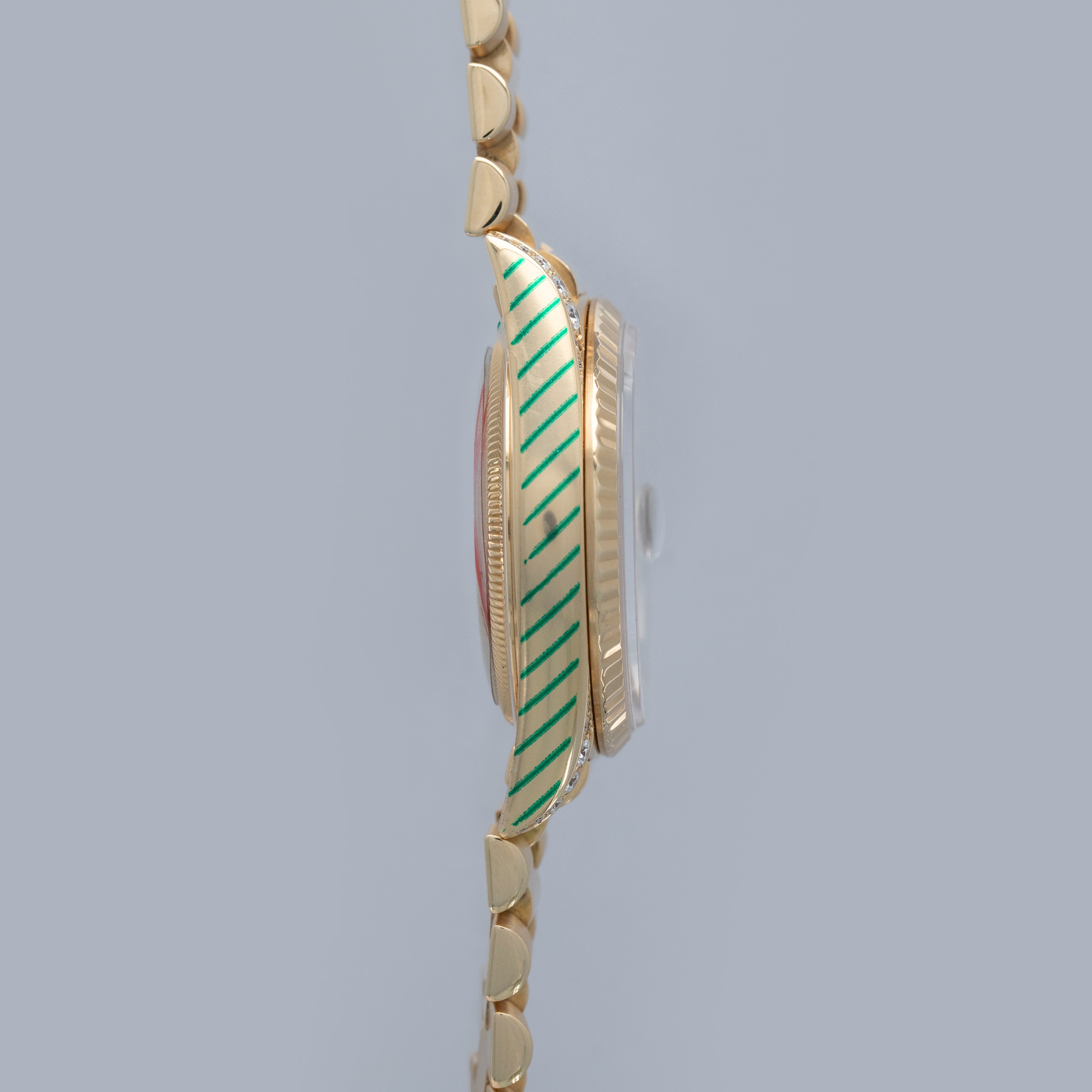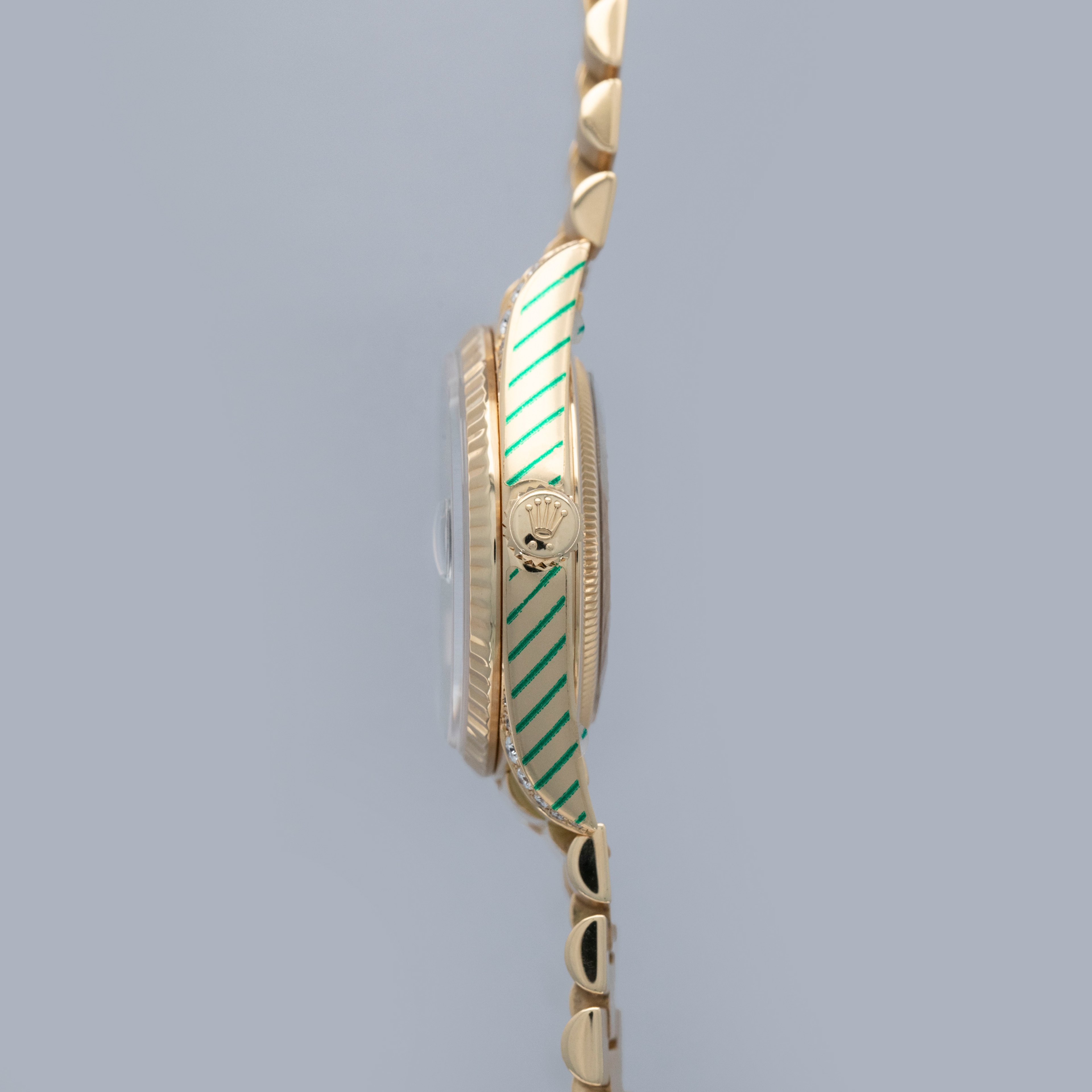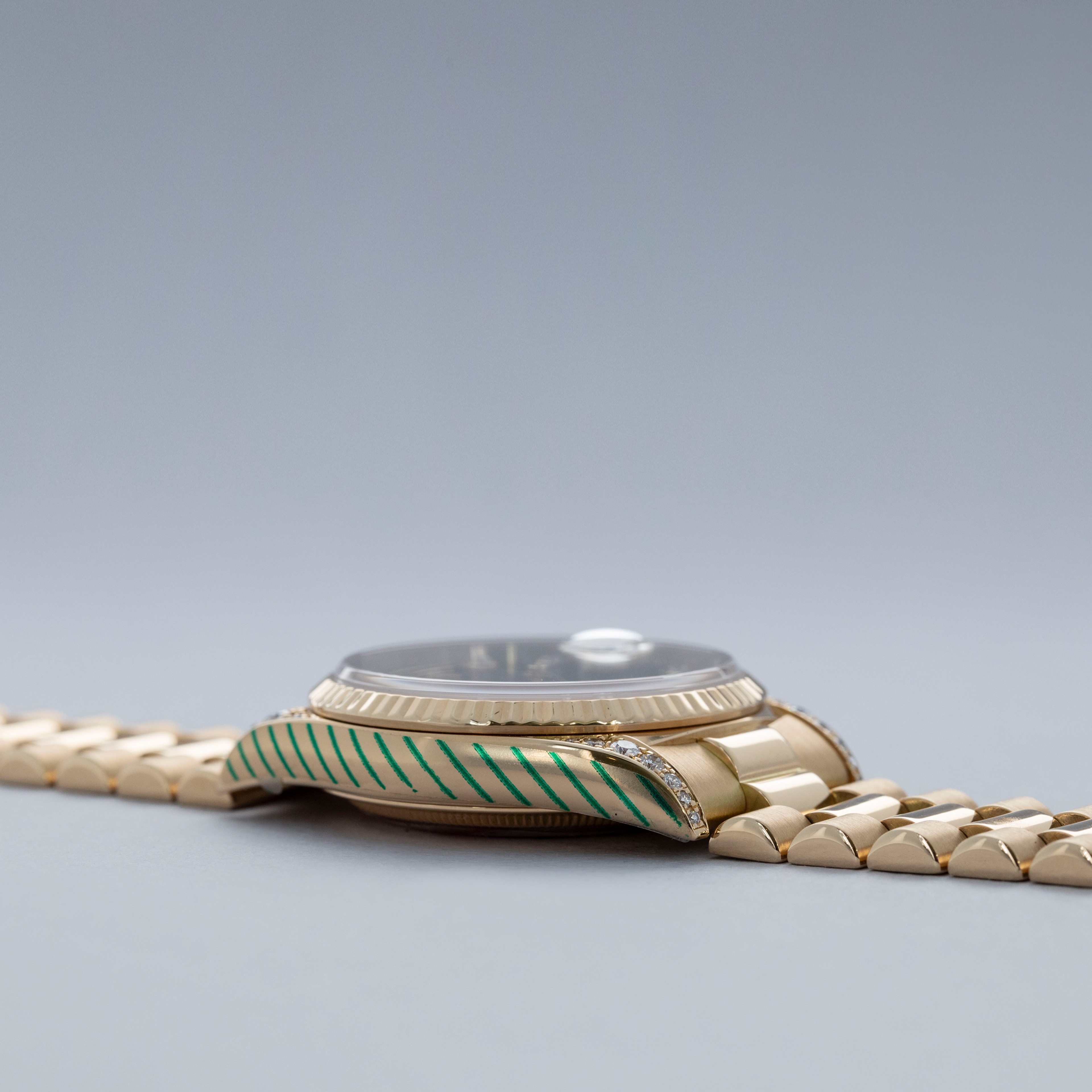This particular day-date is a true unicorn- not only does it come with a diamond-set onyx dial, but the lug hoods are also diamond-set from the Rolex factory.