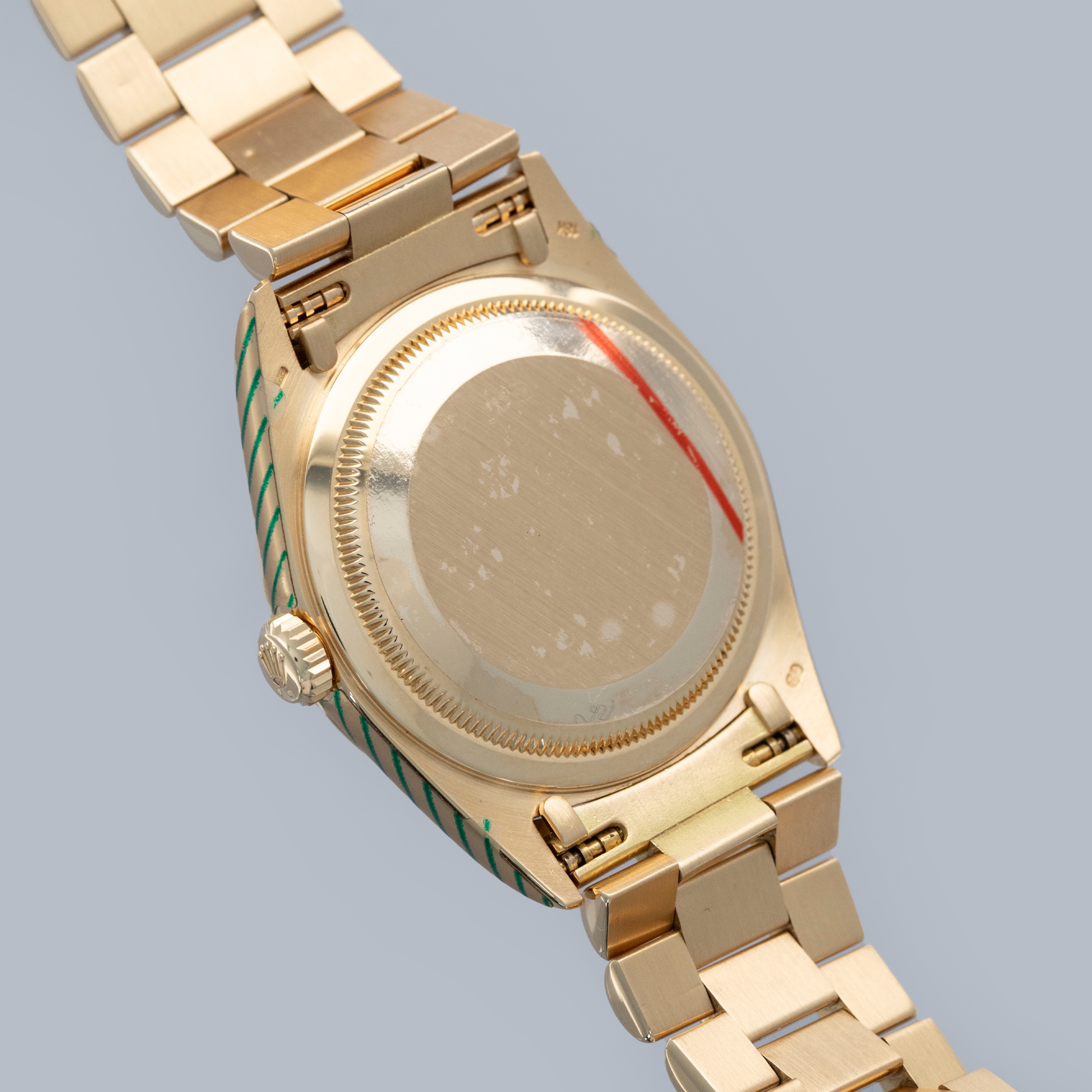 The watch is in overall excellent condition. The yellow gold case has recently been refinished as part of a full service by Rolex, and both the case side and case back stickers are still attached. The diamond-set case is well defined and the hallmarks are fully legible. The onyx dial is near-mint with no visible marks, cracks or fissures. The no-lume gold hands are very clean. The watch is fitted with a concealed clasp yellow gold President bracelet that has light stretch between the links and couple of small dings on the backs of the links. The bracelet currently fits a 7" wrist and has 19 links, 2 of which are removable. Comes with an NFC-enabled Rolex service card that shows the factory warranty is valid until 3/2027.
