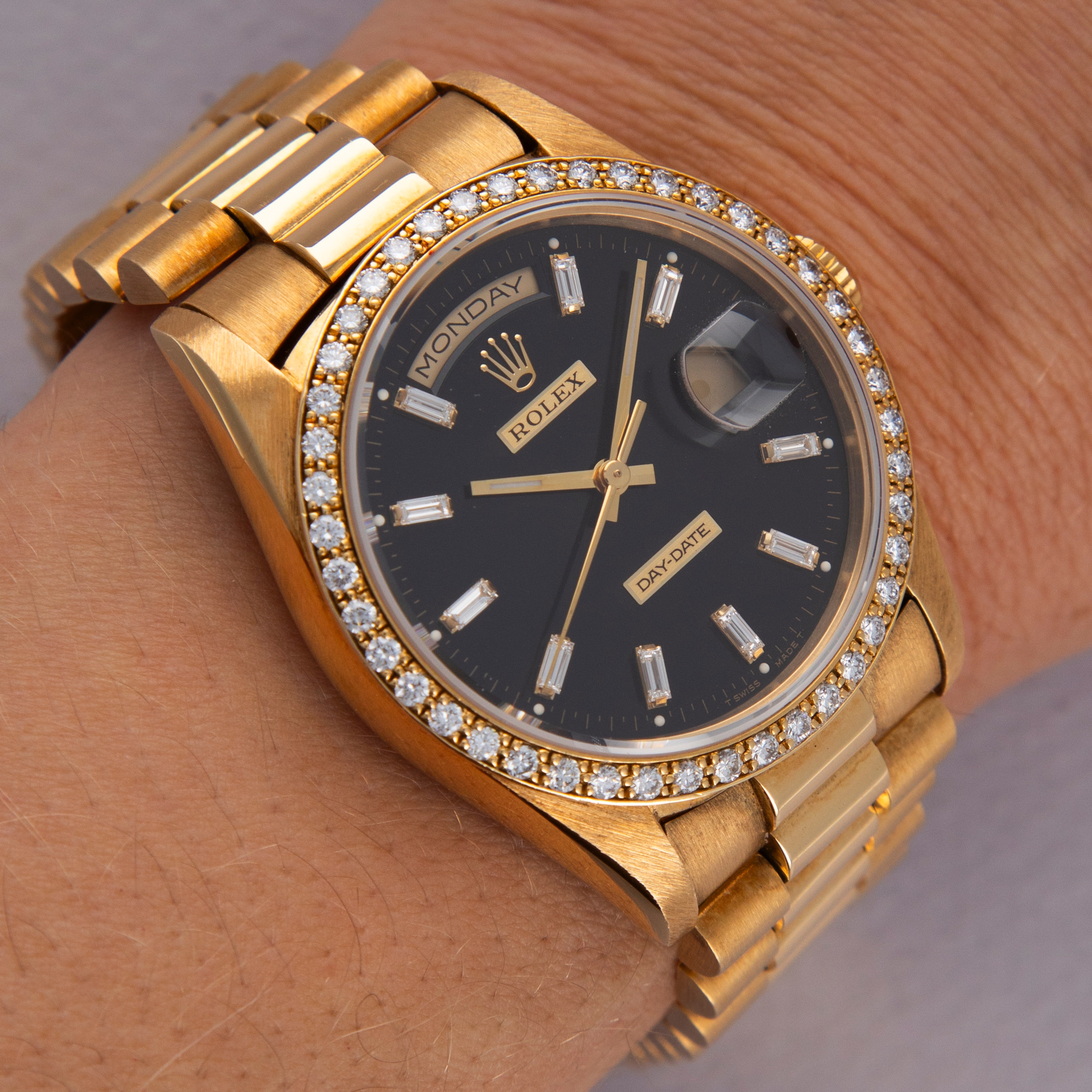 A legendary timepiece with an unrivaled history, the Rolex Day-Date has earned its place as "The Ultimate Watch of Prestige" from its decades on the wrists of the world's most influential people. Released in 1956, the Day-Date quickly became synonymous with luxury, prestige, and exclusivity thanks to being the watch of choice for the world's athletes, visionaries, and world leaders alike. Only ever constructed of precious metals, the Day-Date's aesthetic is that of sheer elegance and grace. Aside from the beautiful array of dial options that have been available over the decades, the Day-Date's most iconic piece of design is its three-piece "Presidential" or "President" bracelet. Forming the bedrock of its design, the Presidential bracelet has become synonymous with Rolex's flagship collection and their desire to create the very best and most iconic watches that the world has ever seen. With its timeless design and inescapable impact on horology, the Day-Date stands as a vivid reminder of just how successful they have been in realizing that very mission.