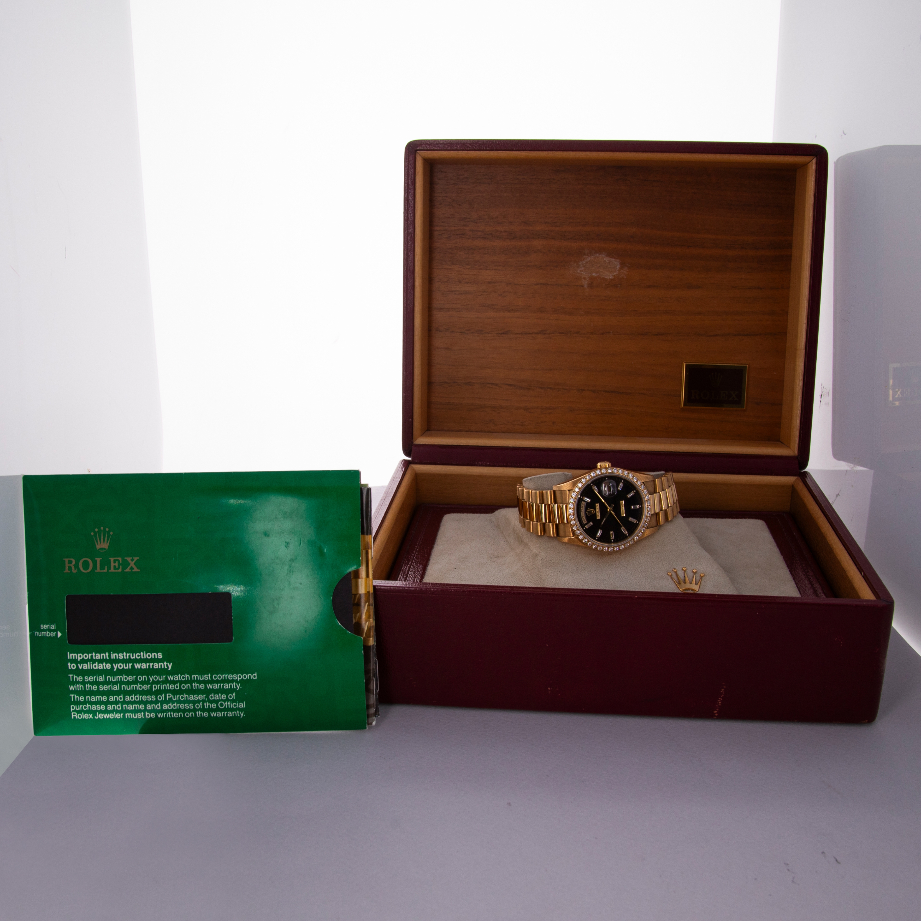Rolex Day-Date 18348 Diamond Bezel Baguette Black Dial Box and Papers