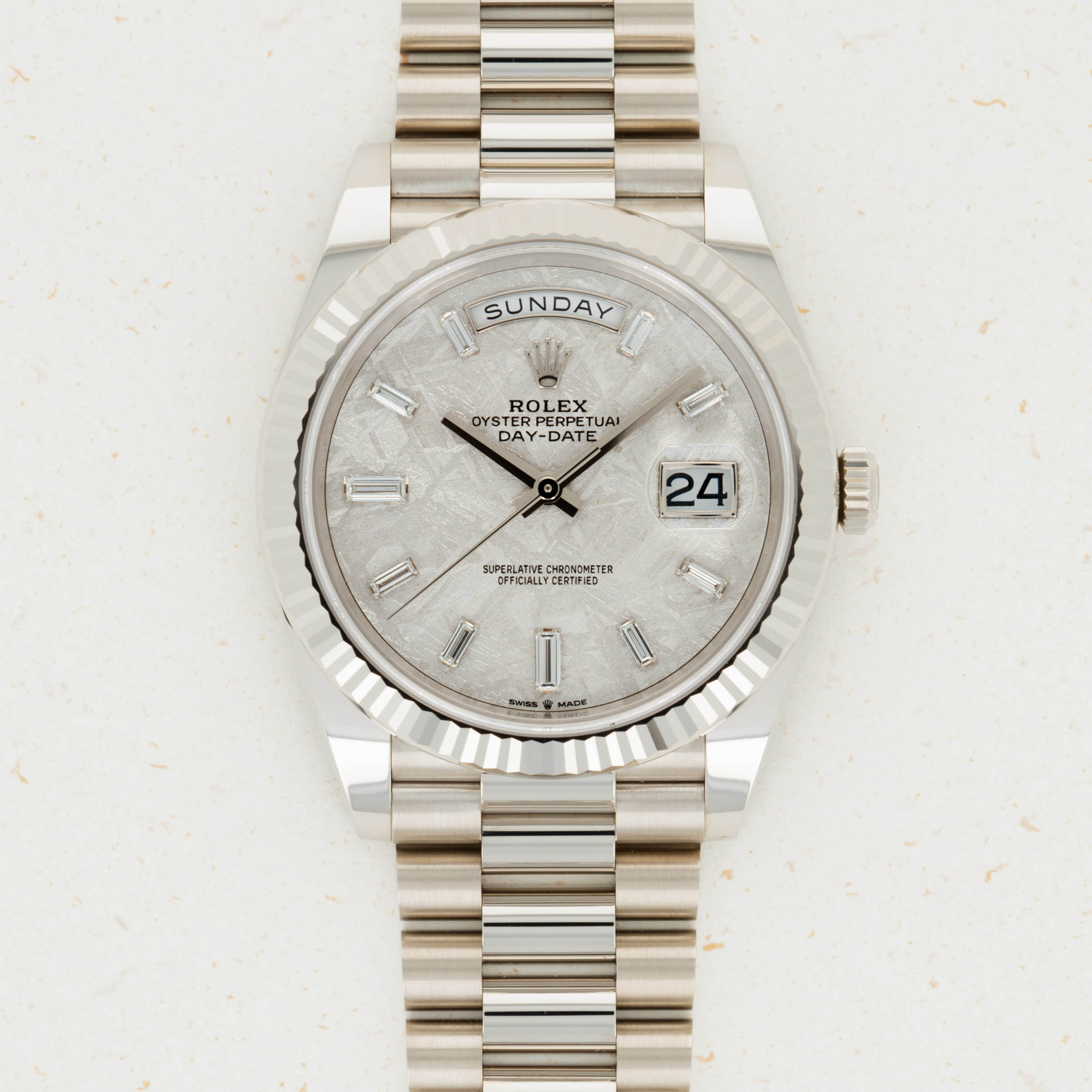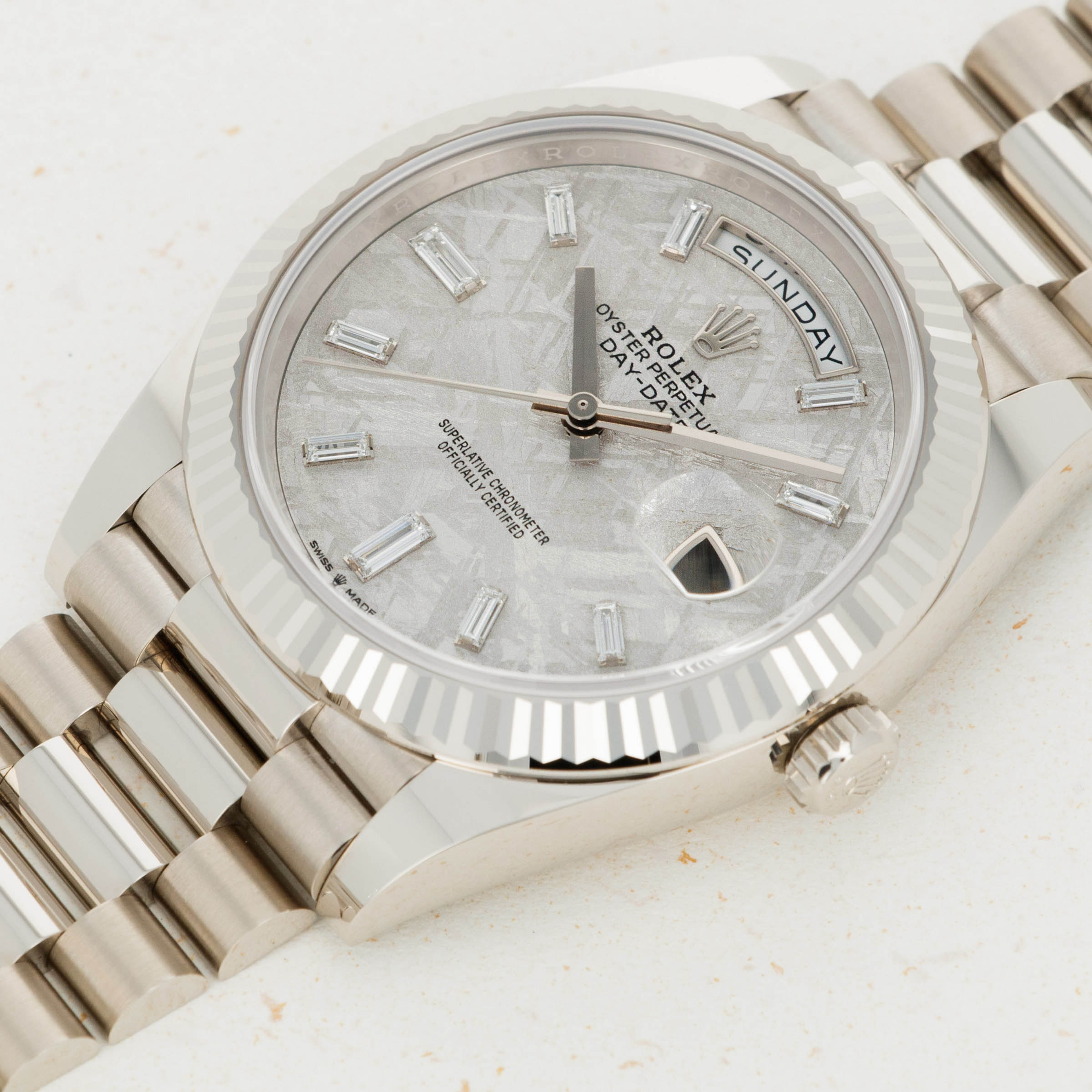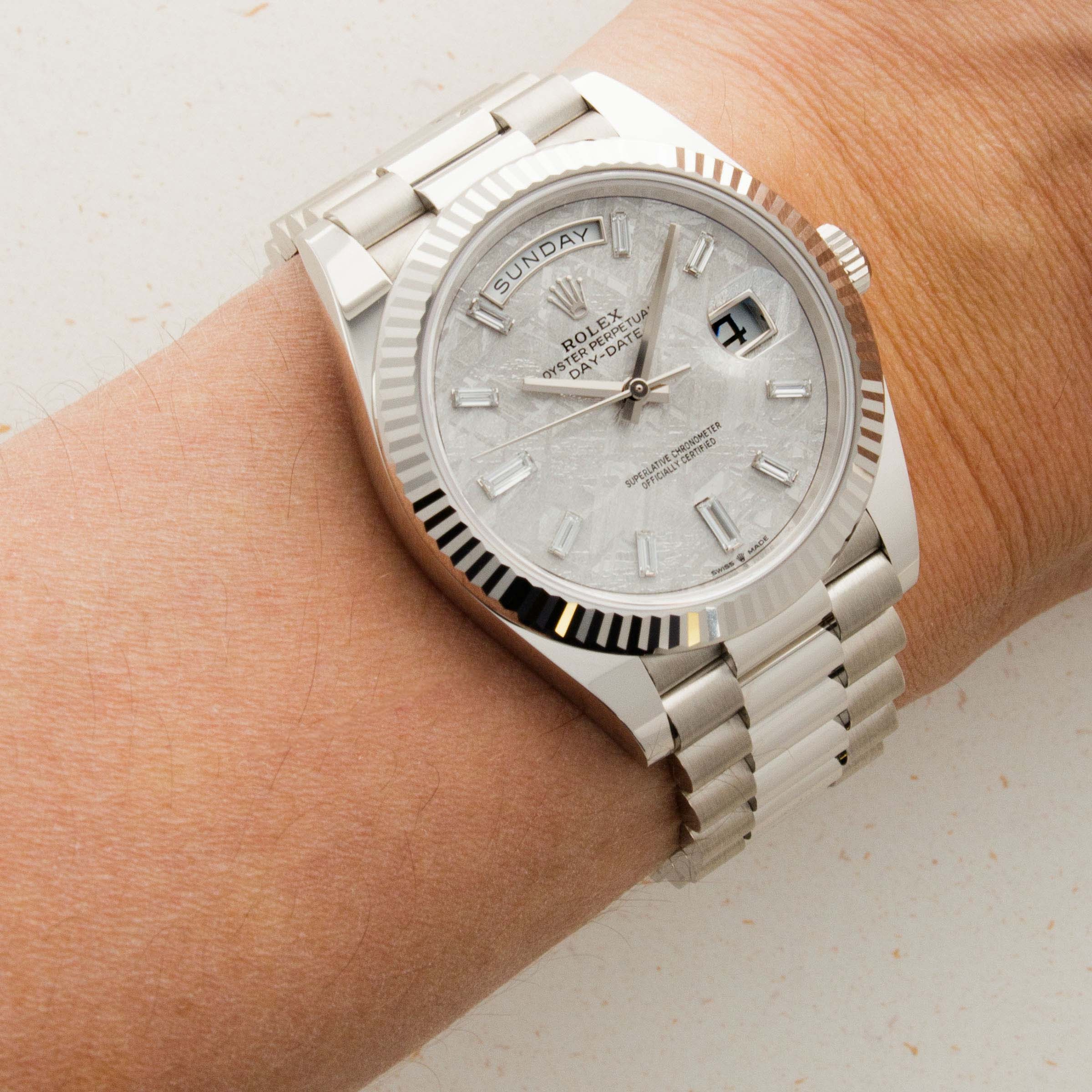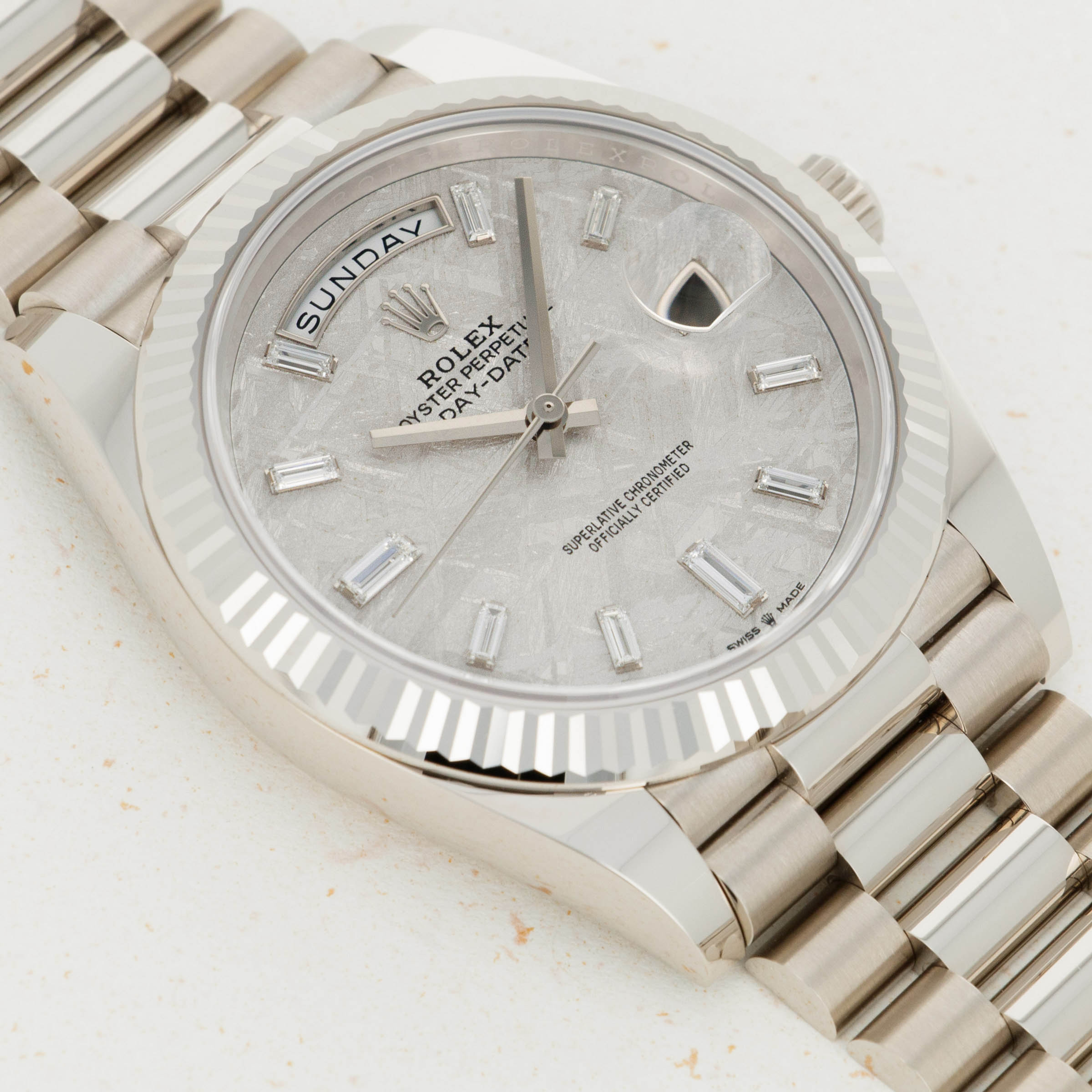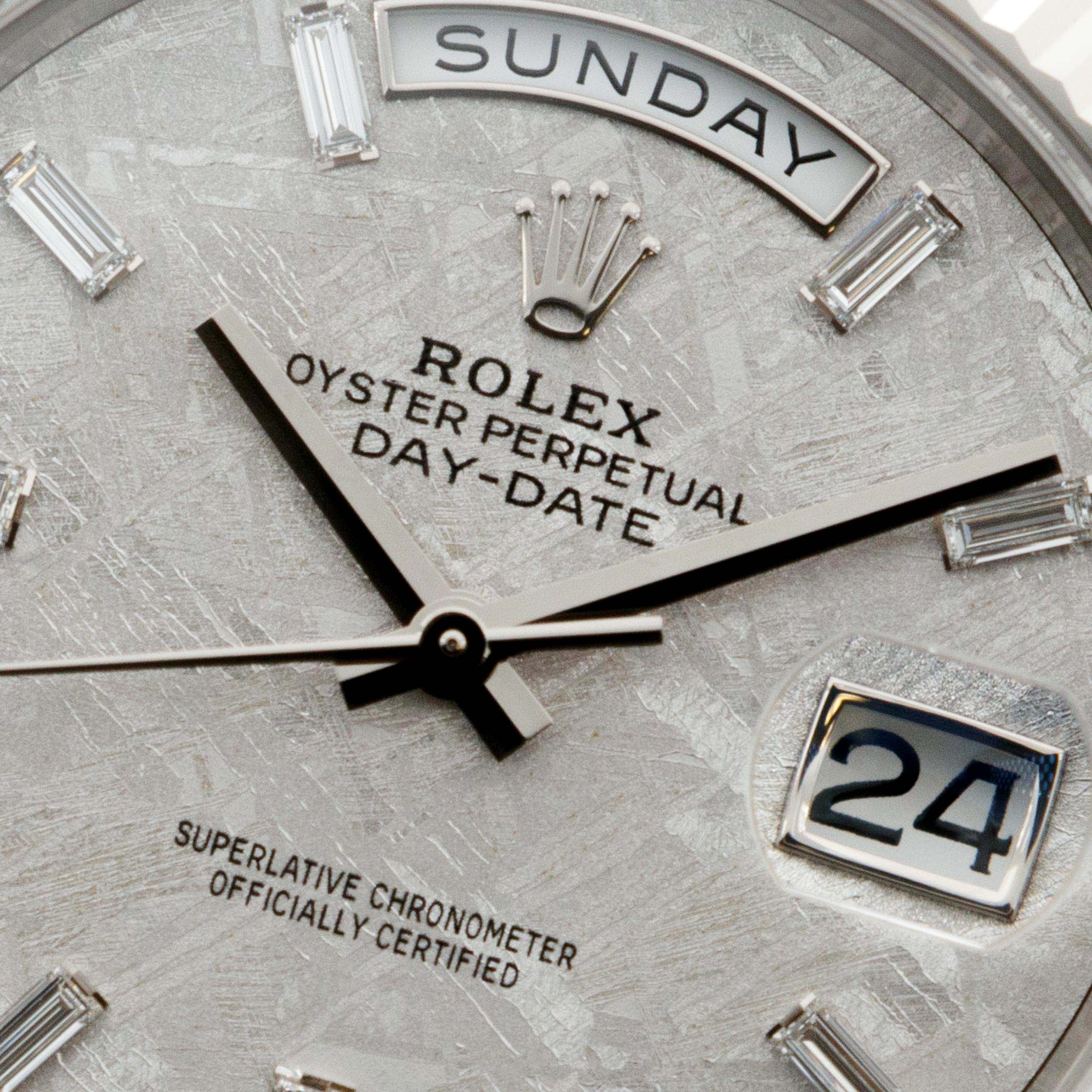 Featuring the Day-Date's most iconic elements, this example sports Rolex's signature fluted bezel and Presidential bracelet alongside its incredible diamond-studded meteorite dial.