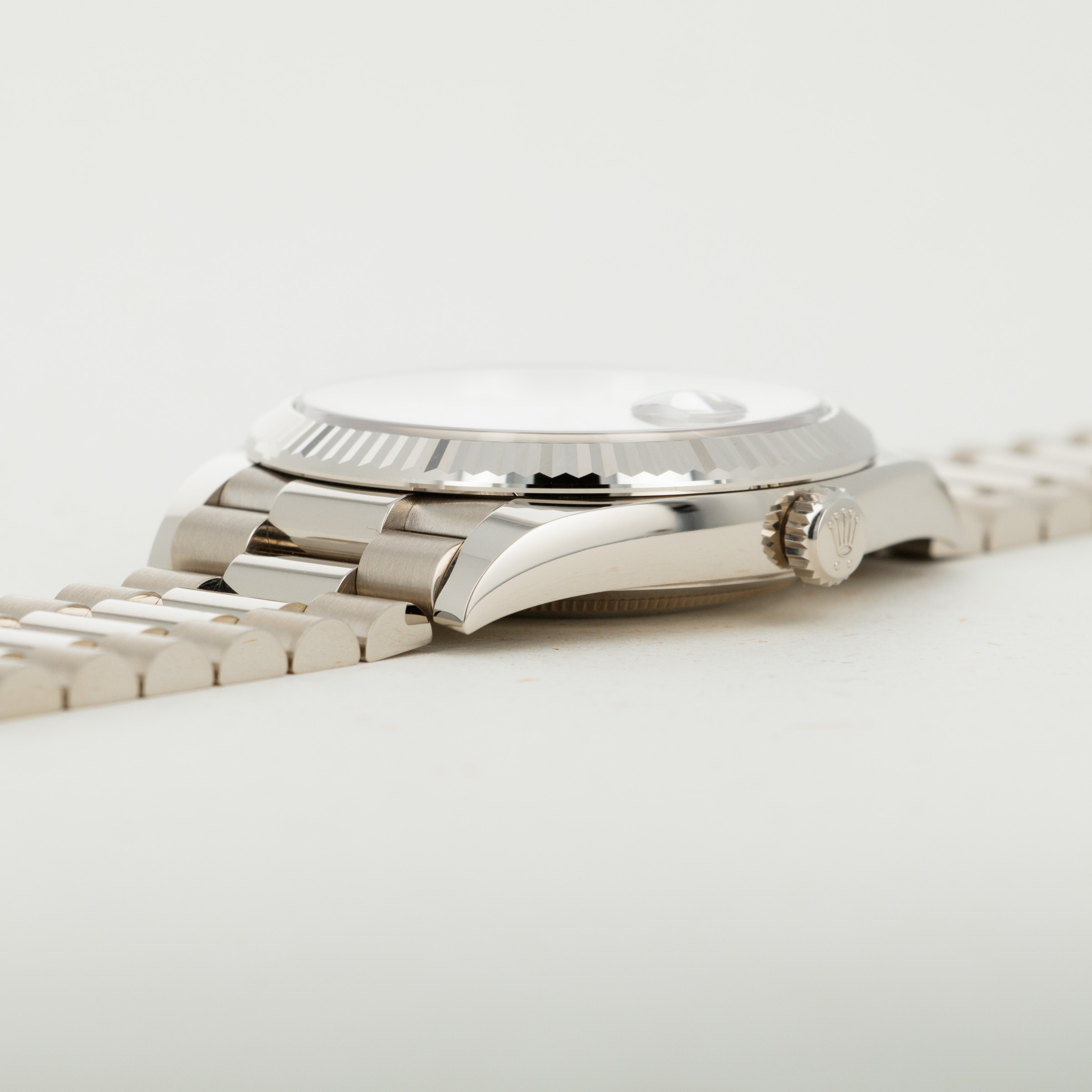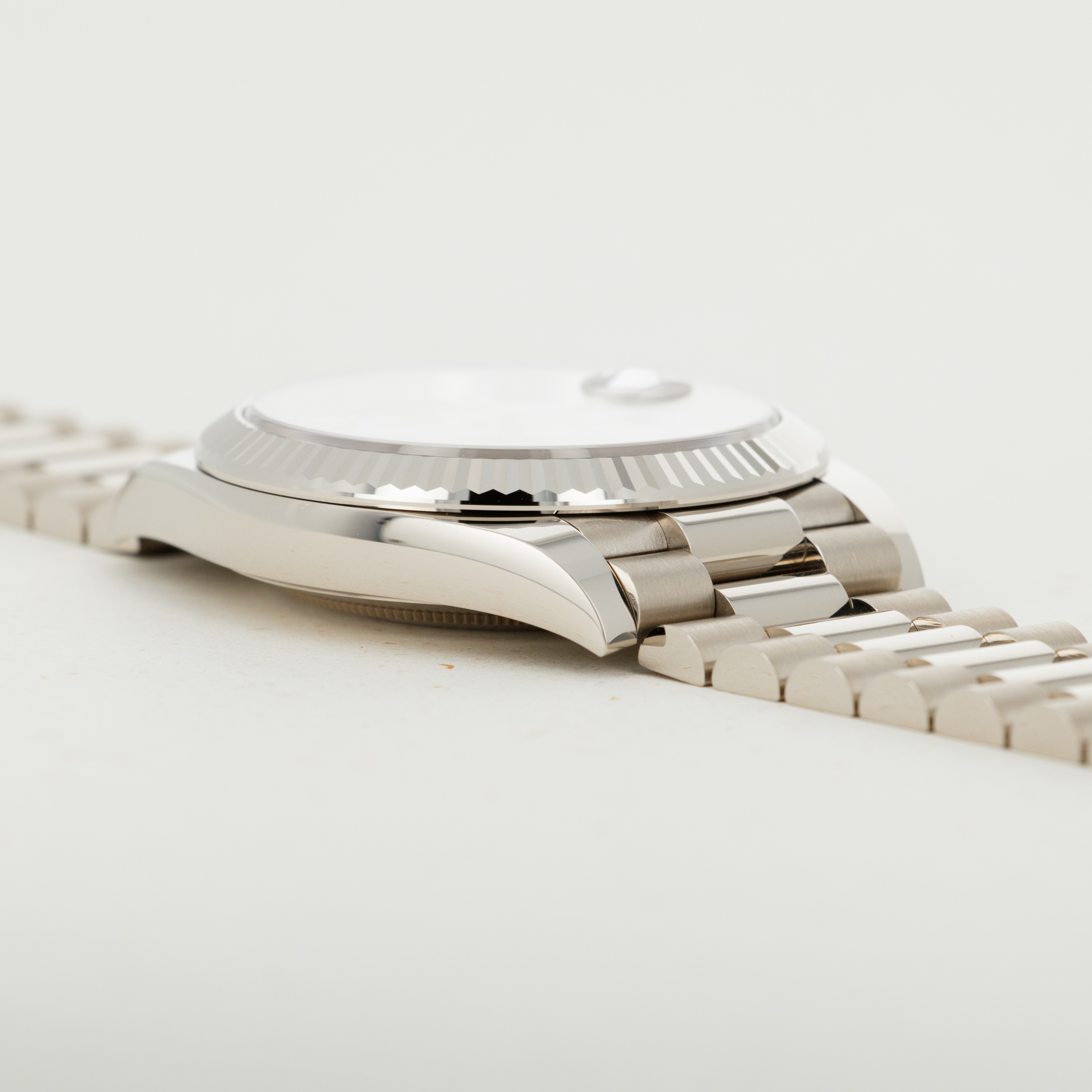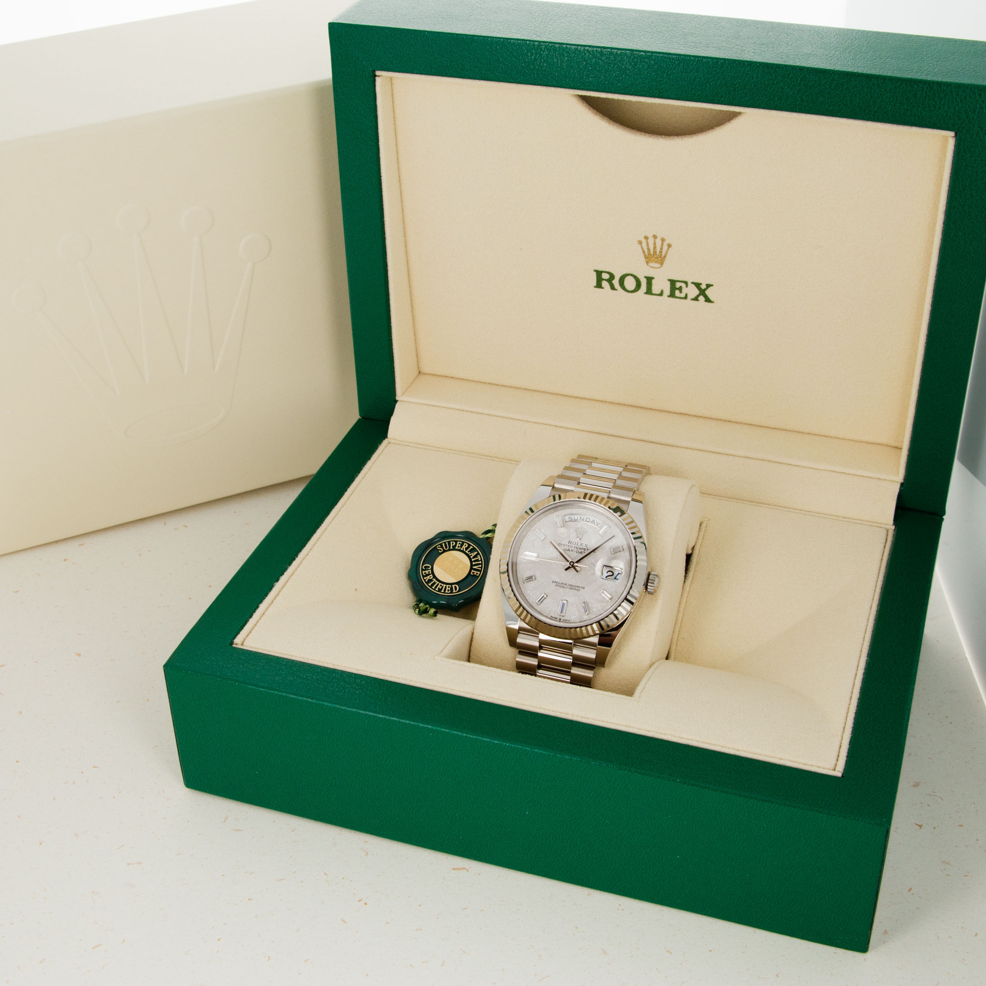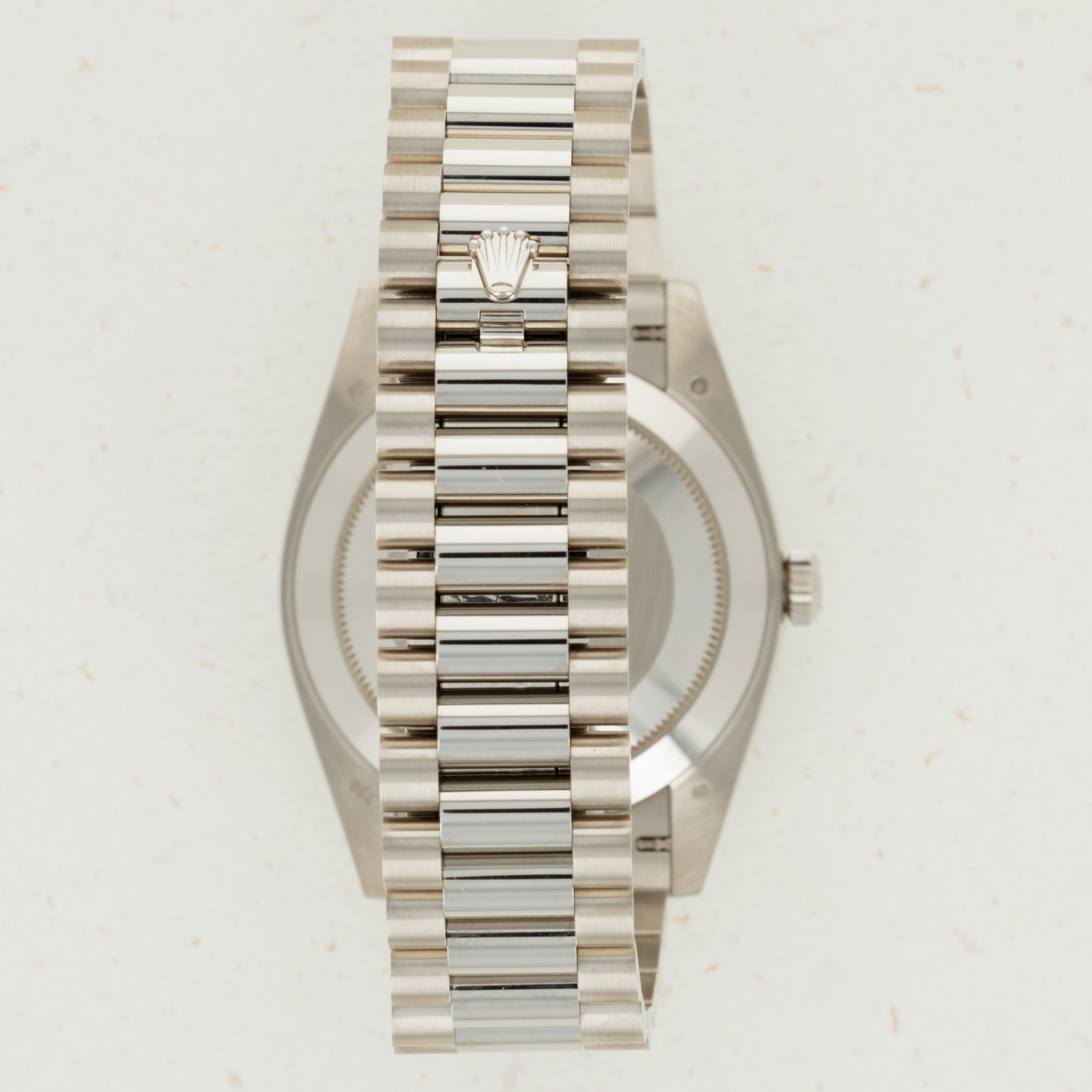 A legendary timepiece with an unrivaled history, the Rolex Day-Date has earned its place as "The Ultimate Watch of Prestige" from its decades on the wrists of the world's most influential people. Released in 1956, the Day-Date quickly became synonymous with luxury, prestige, and exclusivity thanks to being the watch of choice for the world's athletes, visionaries, and world leaders alike. Only ever constructed of precious metals, the Day-Date's aesthetic is that of sheer elegance and grace. Aside from the beautiful array of dial options that have been available over the decades, the Day-Date's most iconic piece of design is its three-piece "Presidential" or "President" bracelet. Forming the bedrock of its design, the Presidential bracelet has become synonymous with Rolex's flagship collection and their desire to create the very best and most iconic watches that the world has ever seen. With its timeless design and inescapable impact on horology, the Day-Date stands as a vivid reminder of just how successful they have been in realizing that very mission.