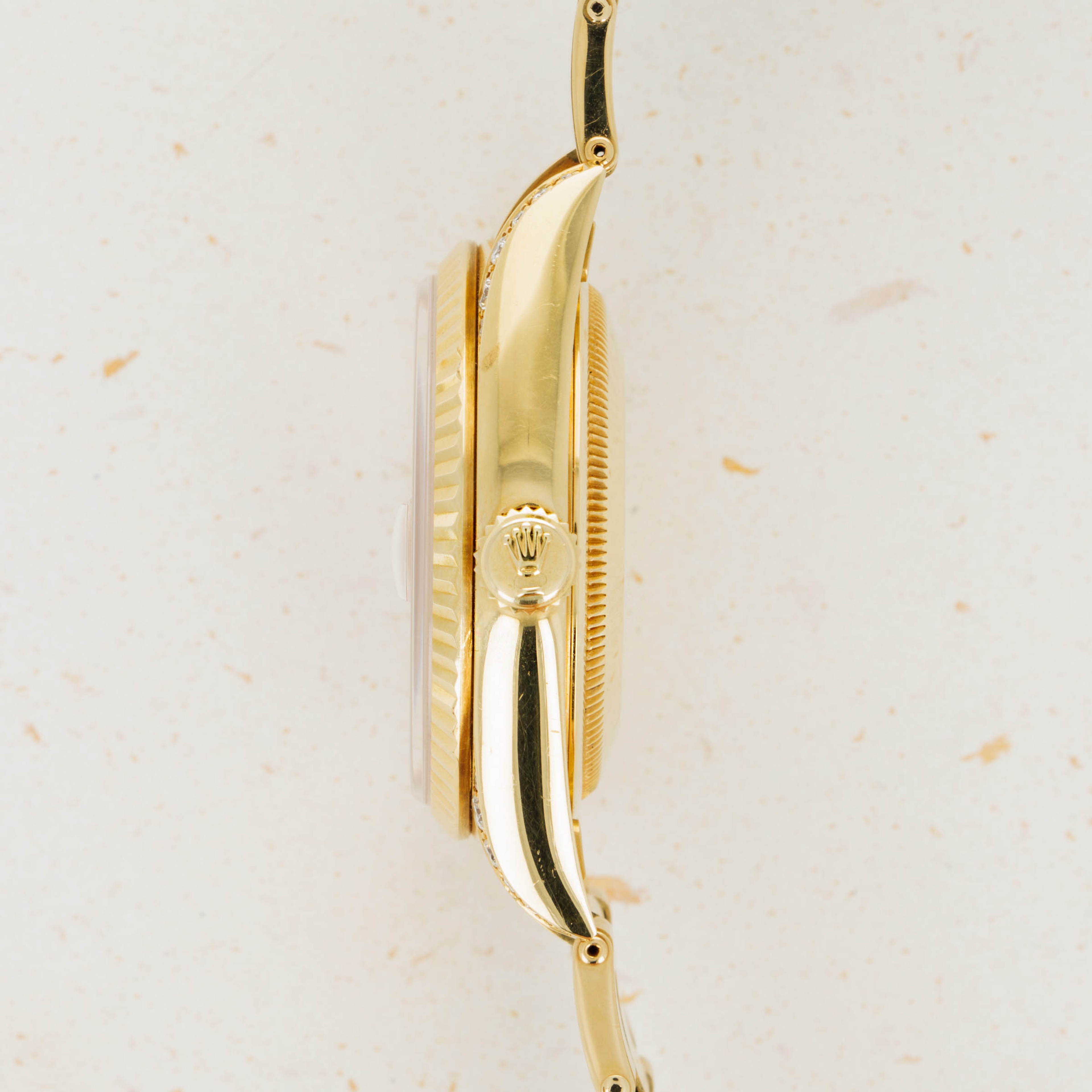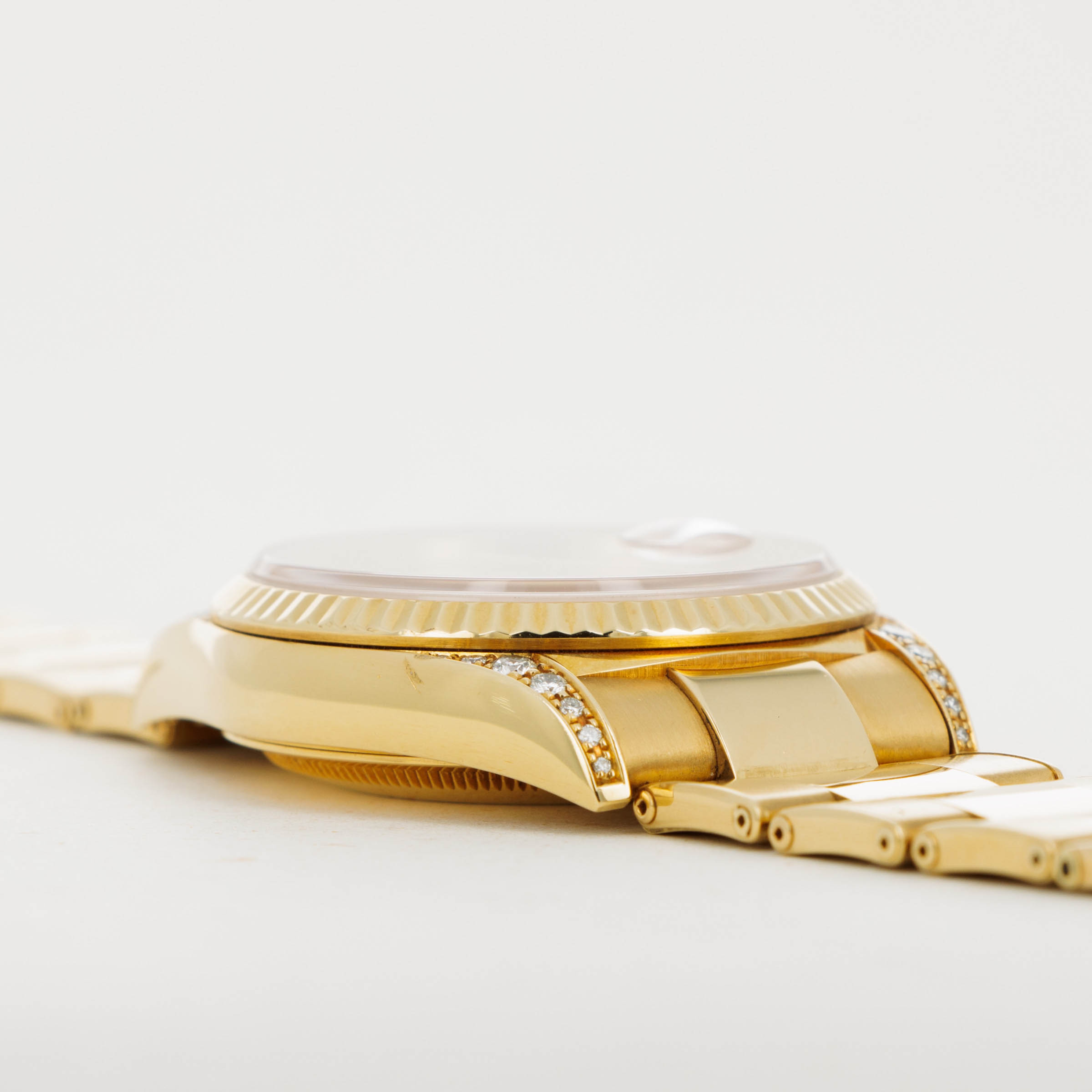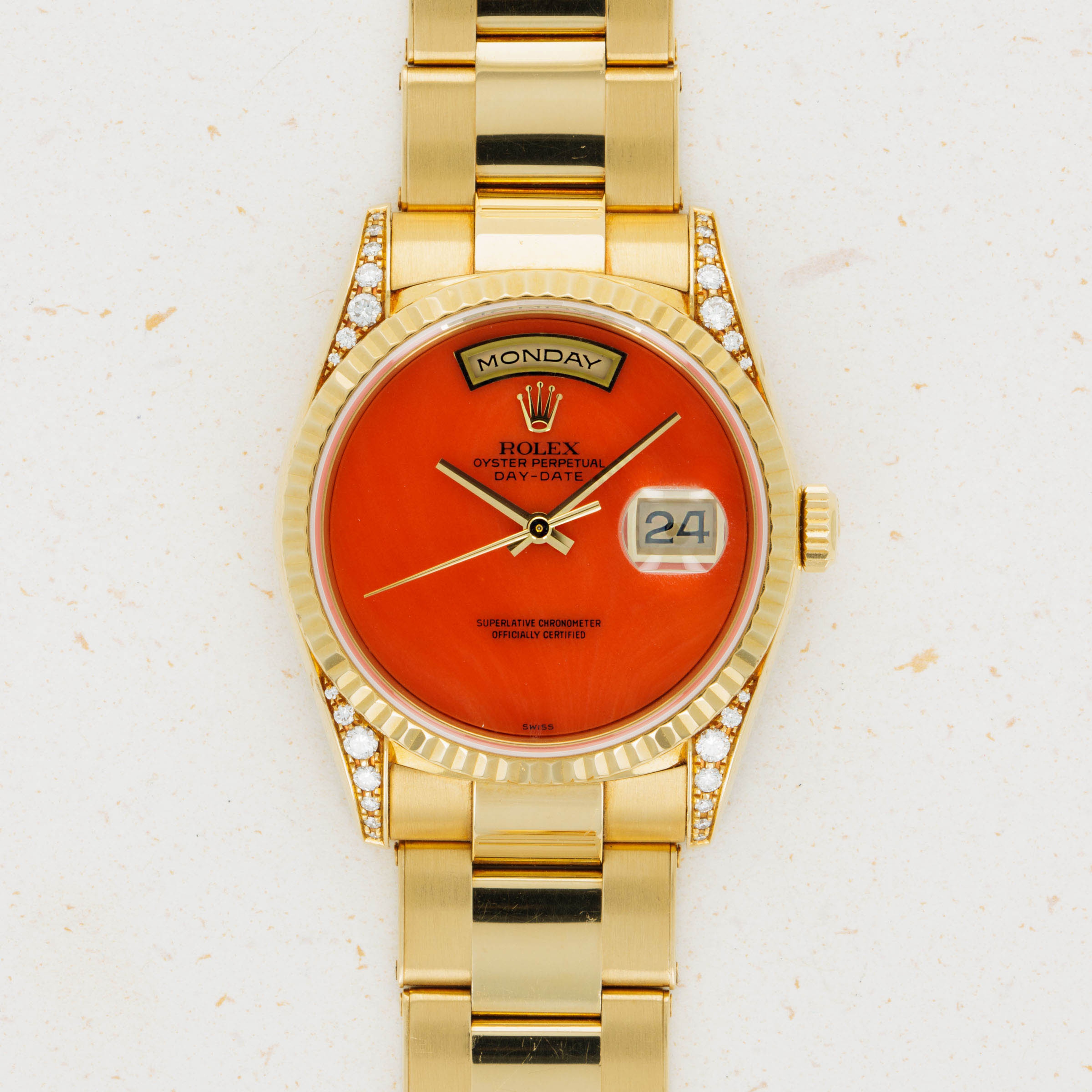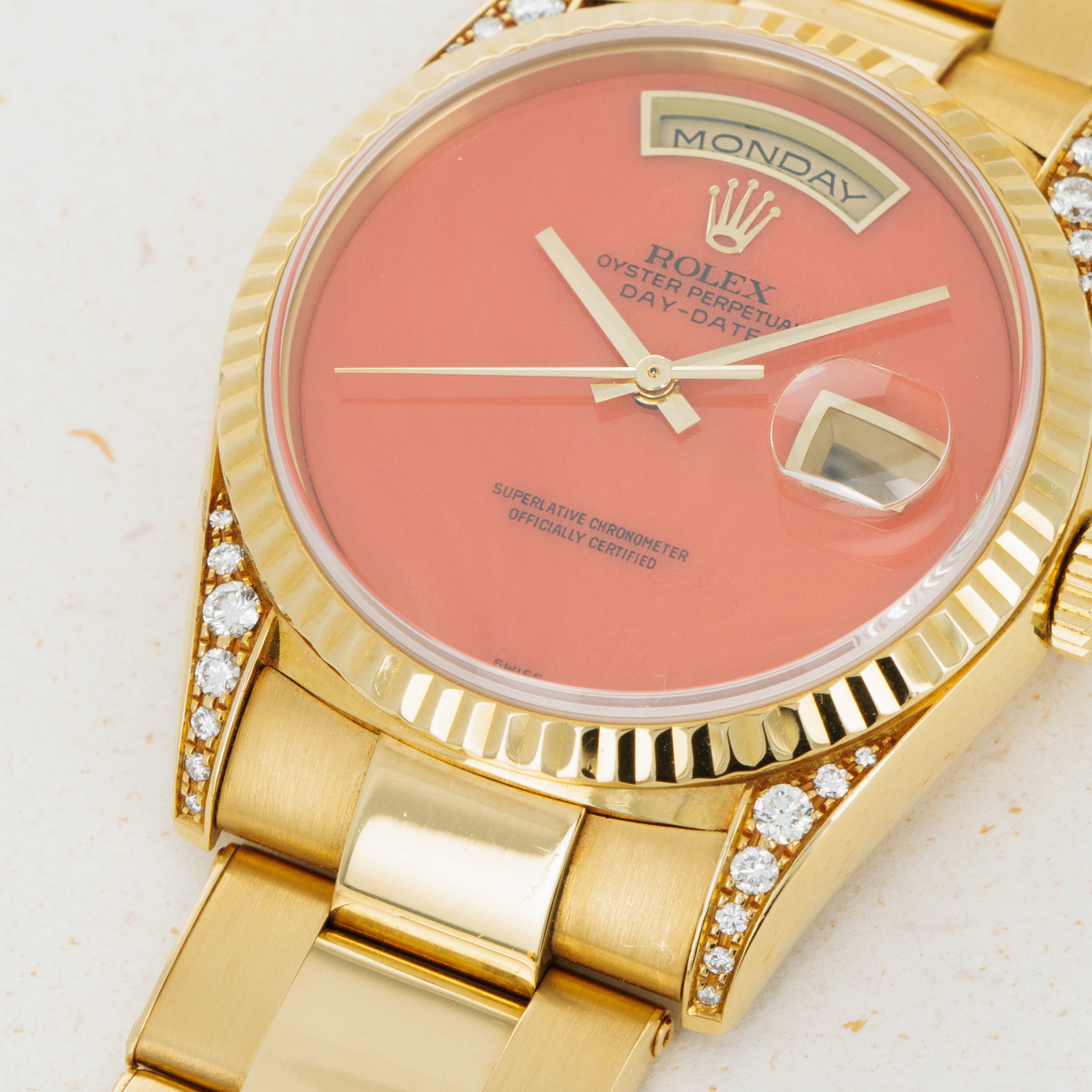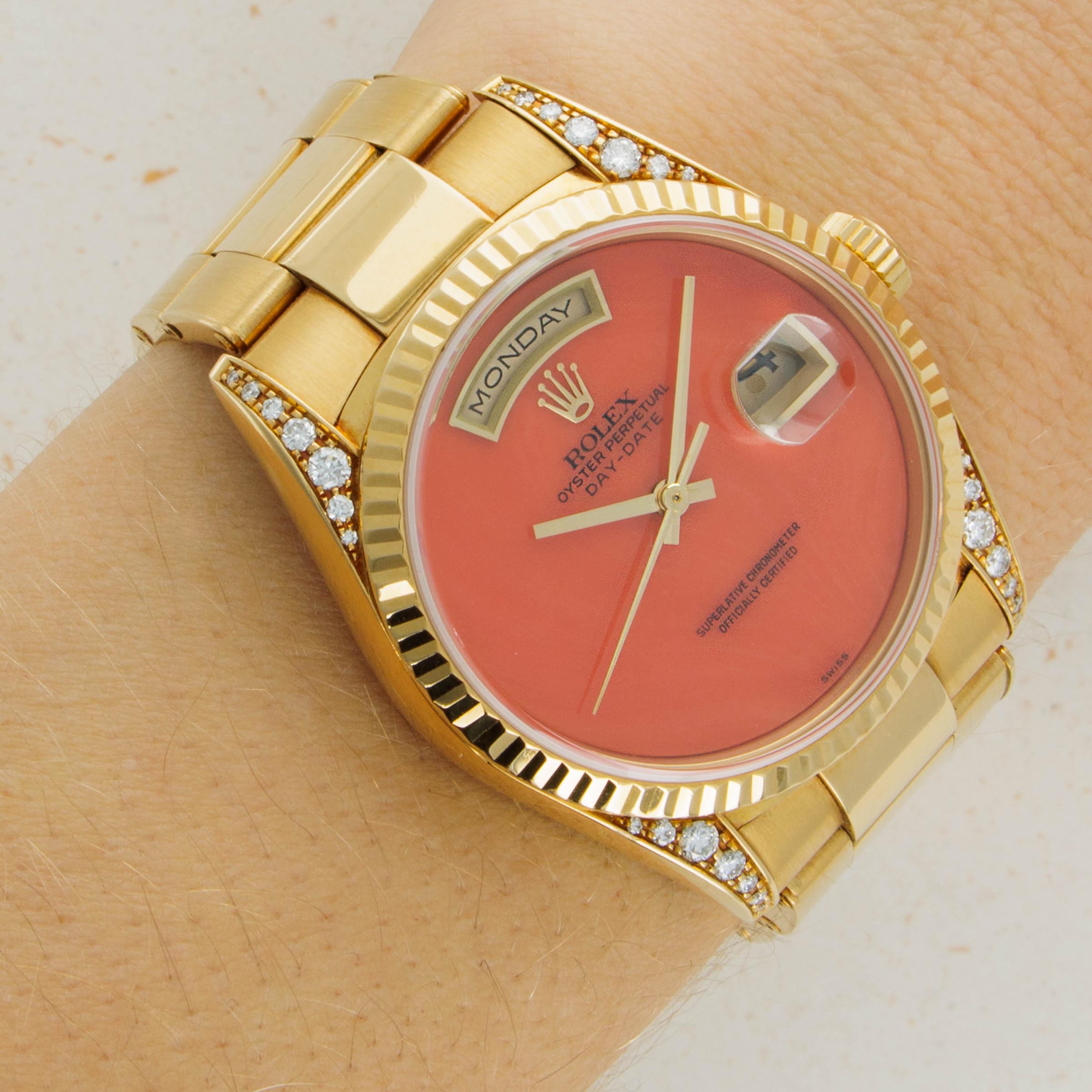 Fitted with a diamond-set case, its stunning coral dial,and the Day-Date's signature Presidential bracelet and fluted bezel, this example showcases the very best Rolex has to offer in luxury watchmaking.