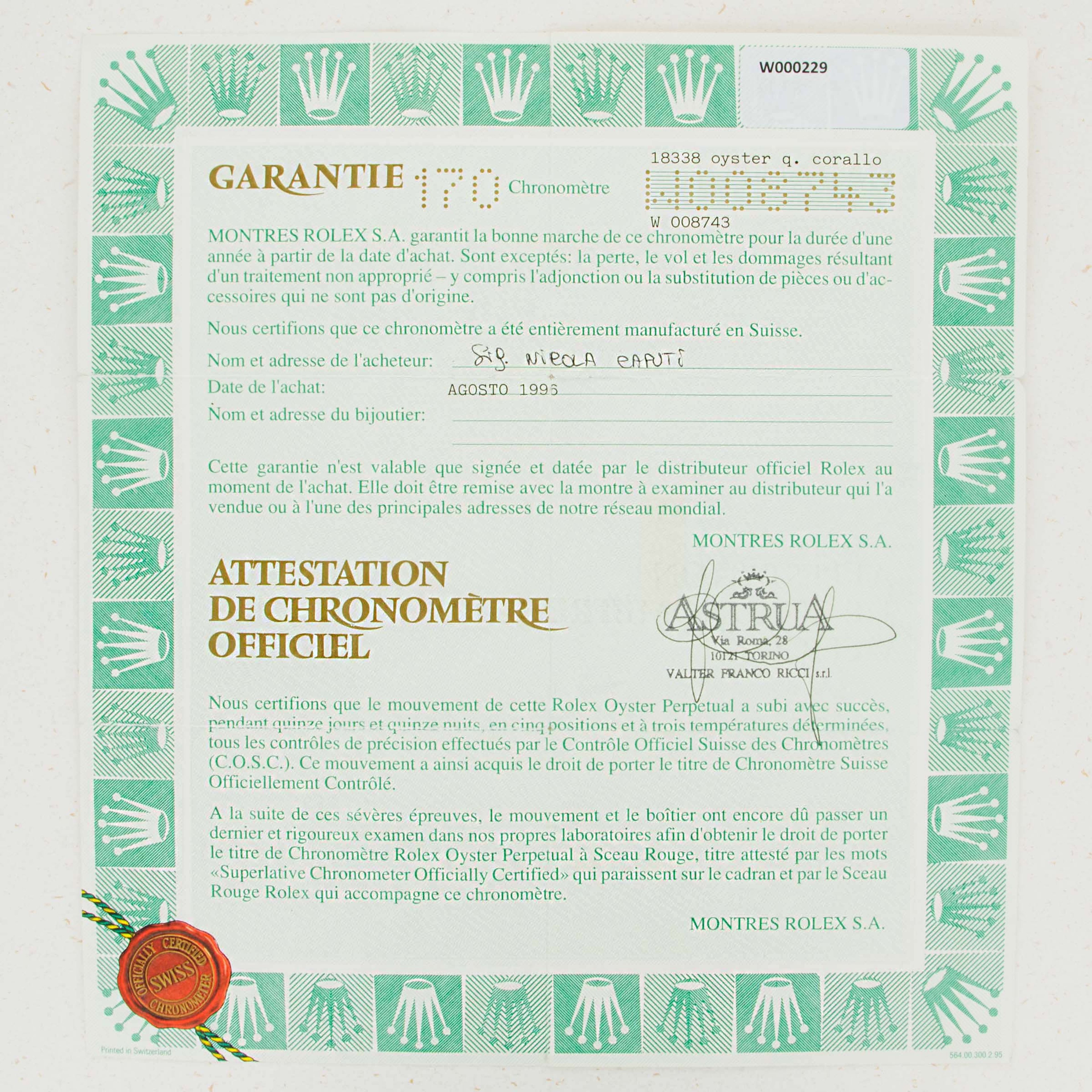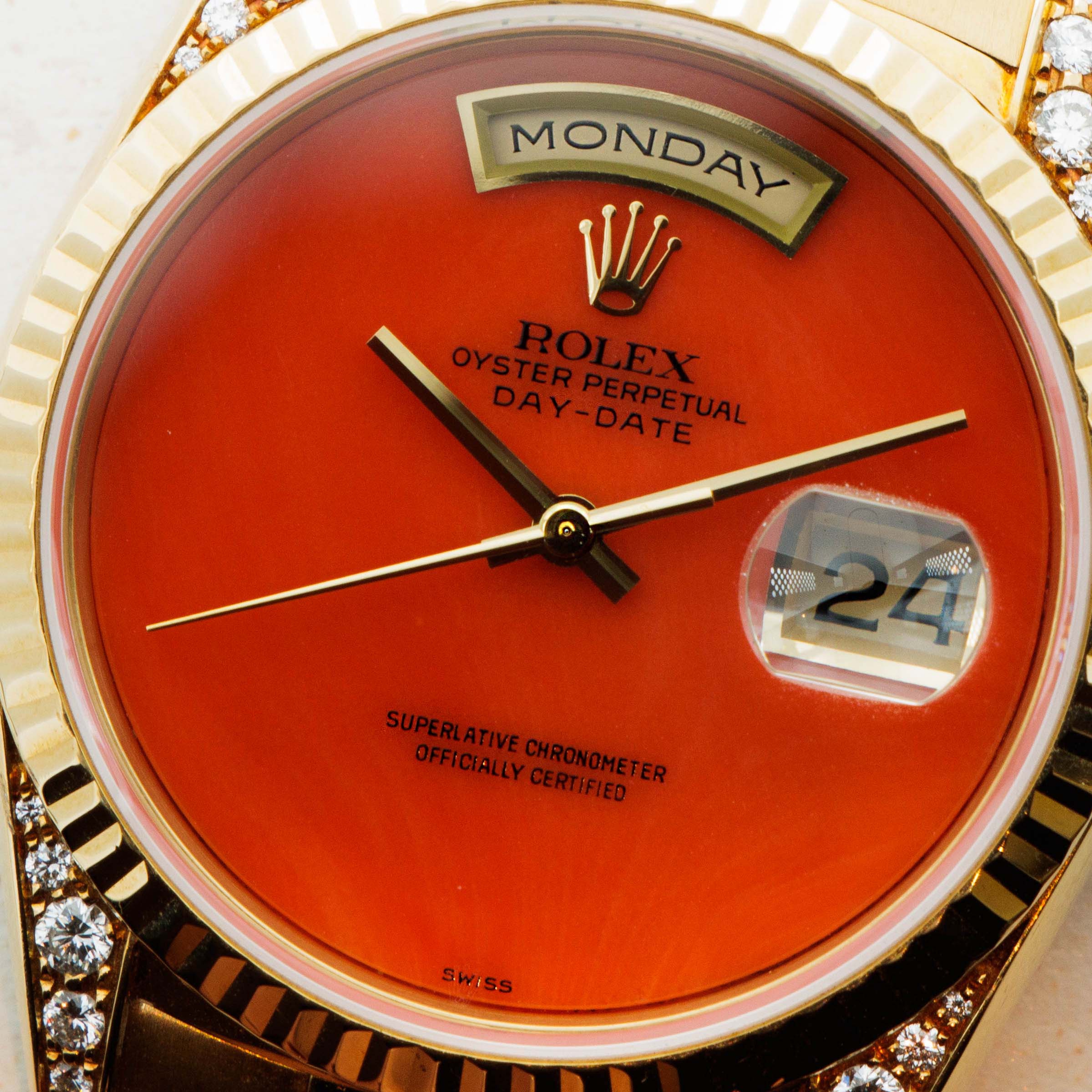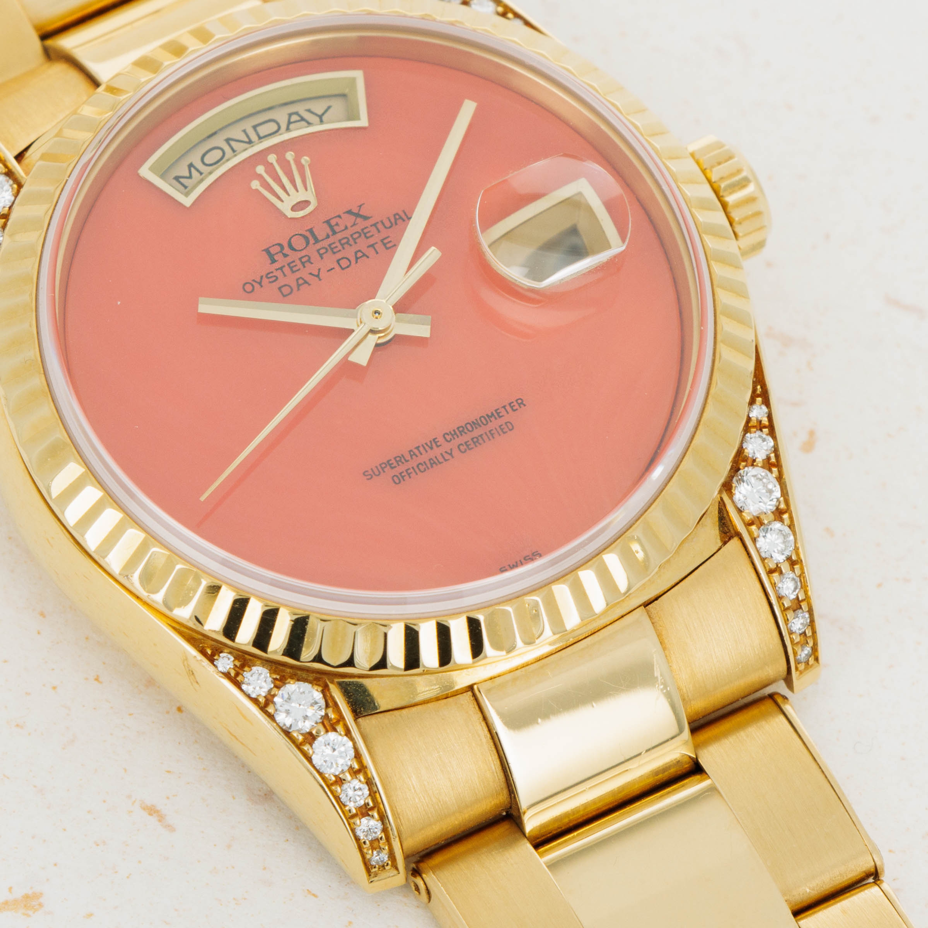 Rolex Day-Date Coral Dial Diamond Lugs 18338 with Guarantee Certificate