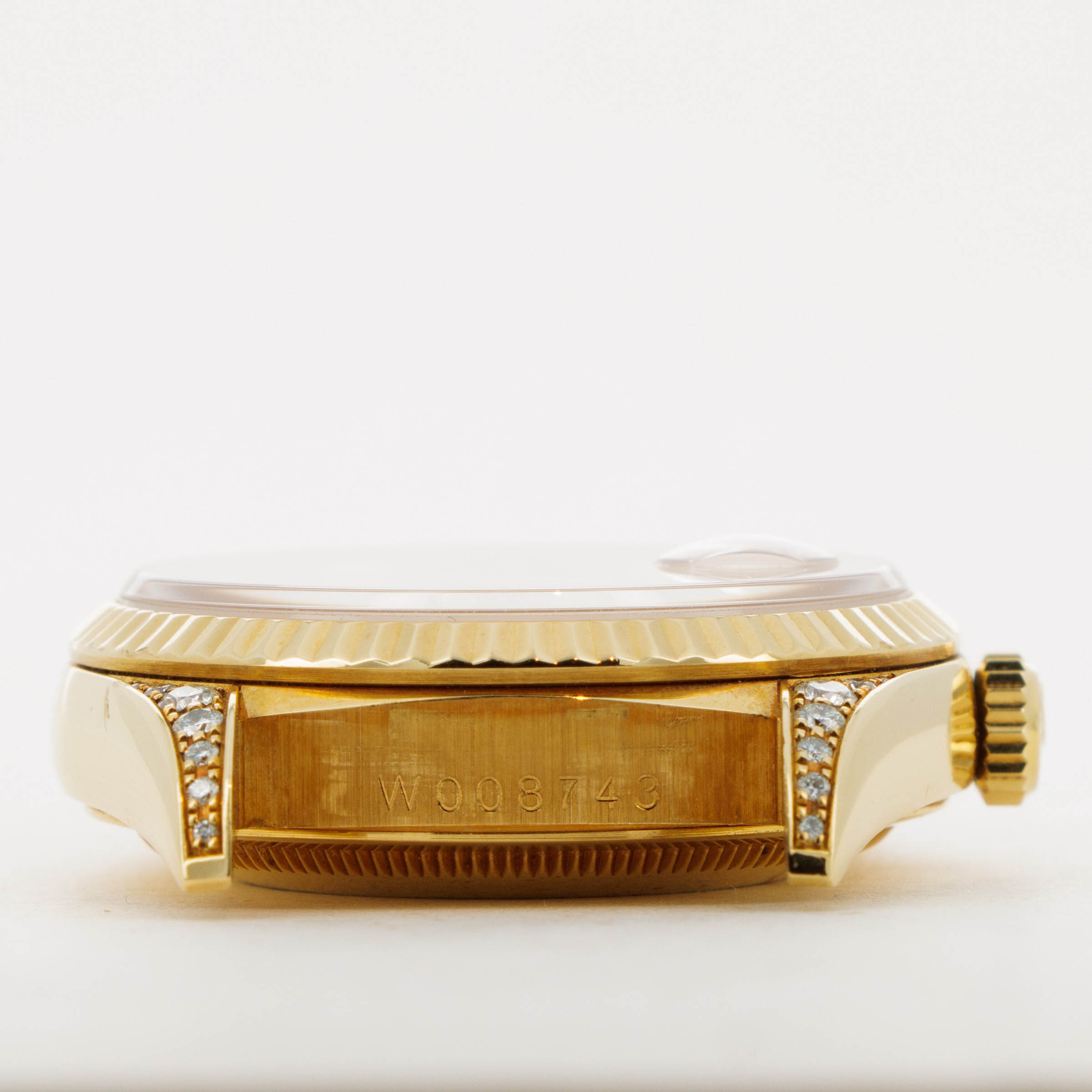 Watch is in overall near-mint condition. The diamond set case has thick lugs and only minor superficial wear. Hallmarks on back of lugs are deep and crisp. The fluted bezel exhibits some light wear and softness. Coral dial does not show any signs of chips or cracks and is in near-mint condition. The non-luminous hands are near-mint as well. The bracelet exhibits no stretch and some minor surface wear matching the rest of the watch. It has 14 links and is very long.