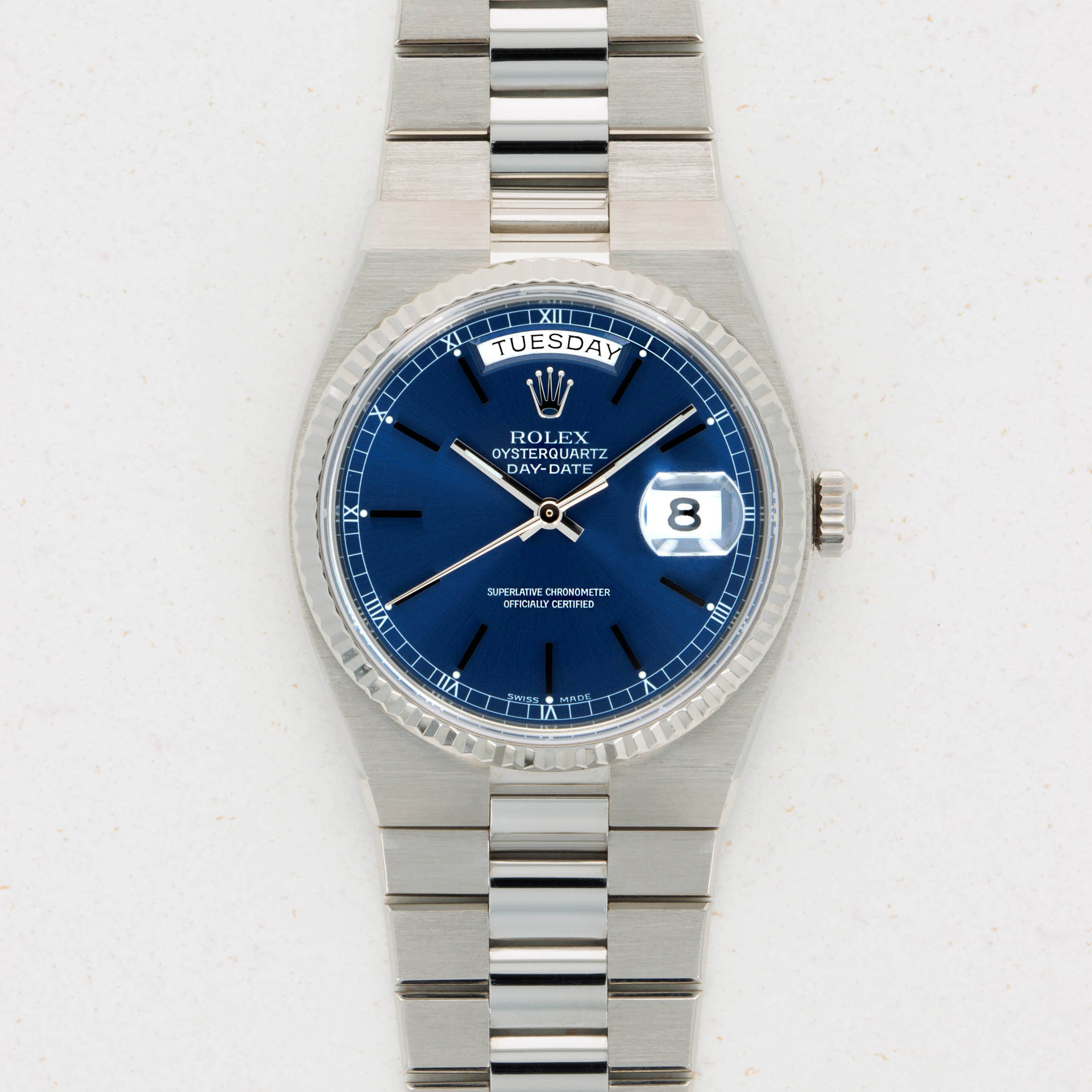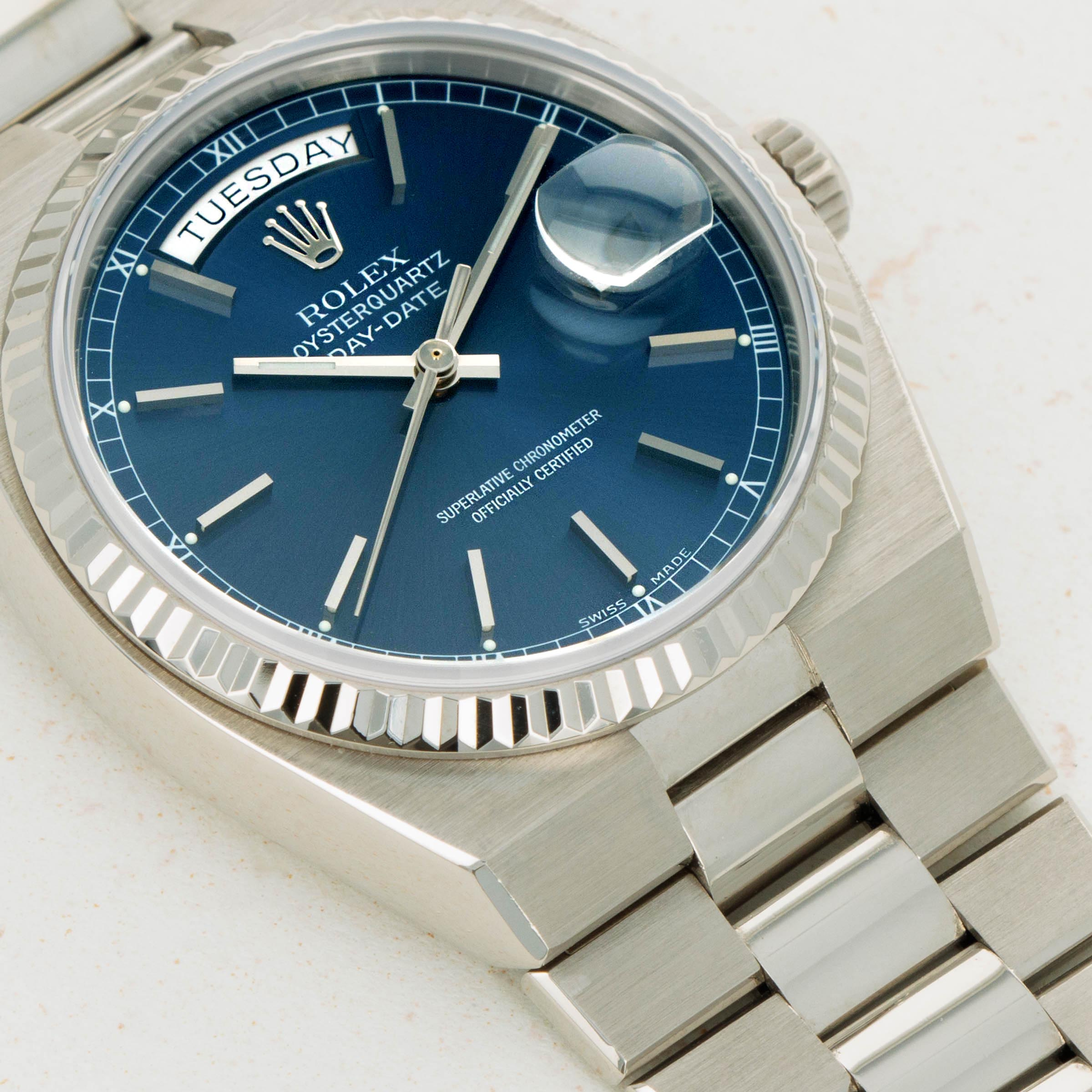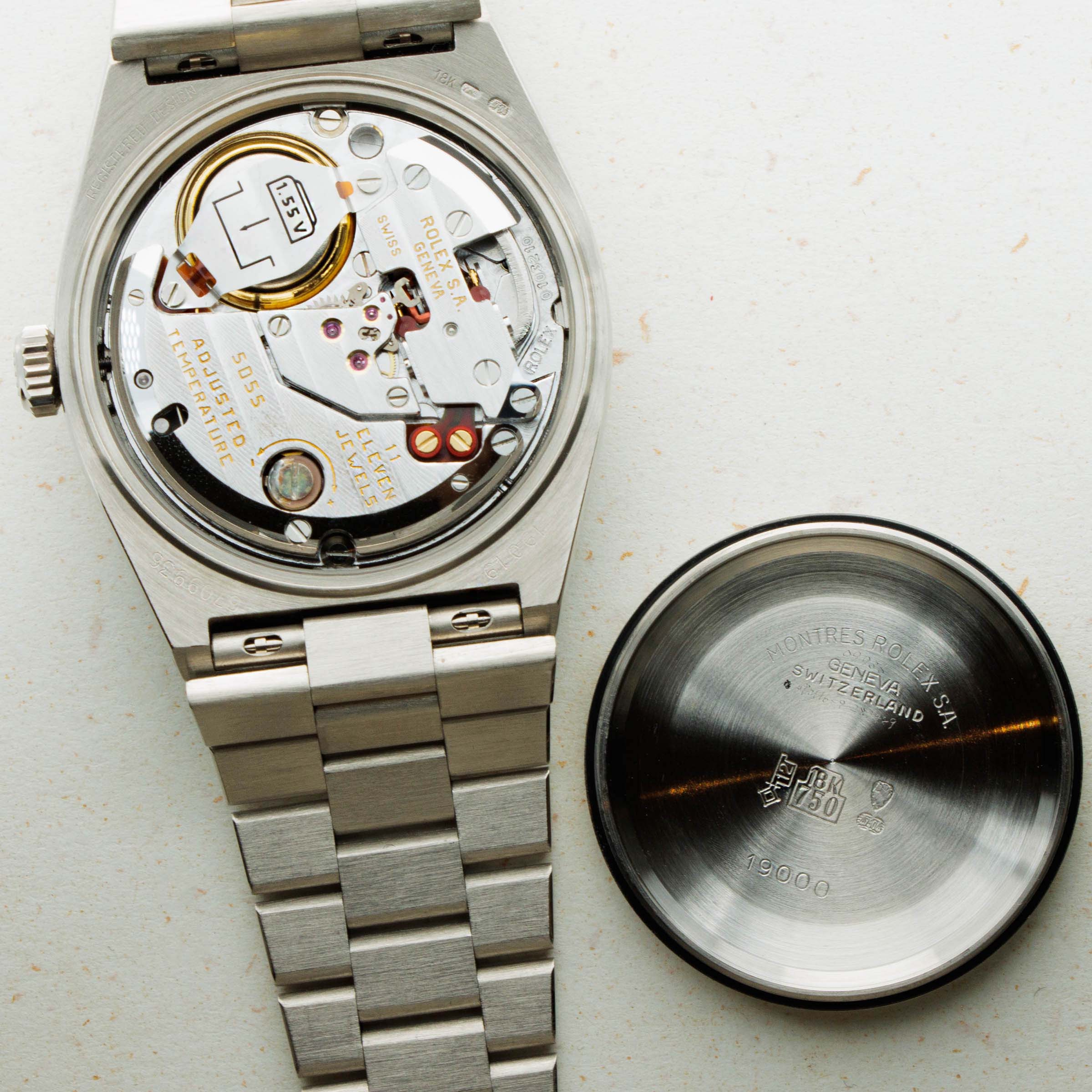 During the onslaught of the Japanese-led Quartz Crisis of the 70s and 80’s, Swiss watchmakers for forced to adapt to remain competitive in the market, or let themselves be swallowed up by their competition. As a way to deal with the Quartz Crisis, Rolex decided to release their own quartz timepiece in 1977, the Oysterquartz. In 1970, Rolex had released the precursor to the Oysterquartz, the Quartz Date 5100, powered by the Beta 21 movement, the result of a large-scale Swiss collaboration. While the Oysterquartz was loosely based on the ref. 5100, the Oysterquartz’ movement was in a league of its own. With 11 jewels, the latest CMOS circuitry, a 32000-hertz oscillator, and analog thermocompensation to regulate the quartz crystal, the Oysterquartz’s movement was held to just as high a standard as Rolex’s more typical mechanical movements. Besides its unusual movement, the Oysterquartz also features a unique construction in terms of its case shape and bracelet design, with an integrated bracelet attaching to a tonneau-shaped case. Additionally, the ref. 19019 is one of the most sought-after Oysterquartz variants with its Day-Date functionality, fluted bezel, hefty 18kt gold construction, and the Oysterquartz's version of the Day-Date's legendary president bracelet complete with a concealed clasp - something every Day-Date connoisseur can appreciate.