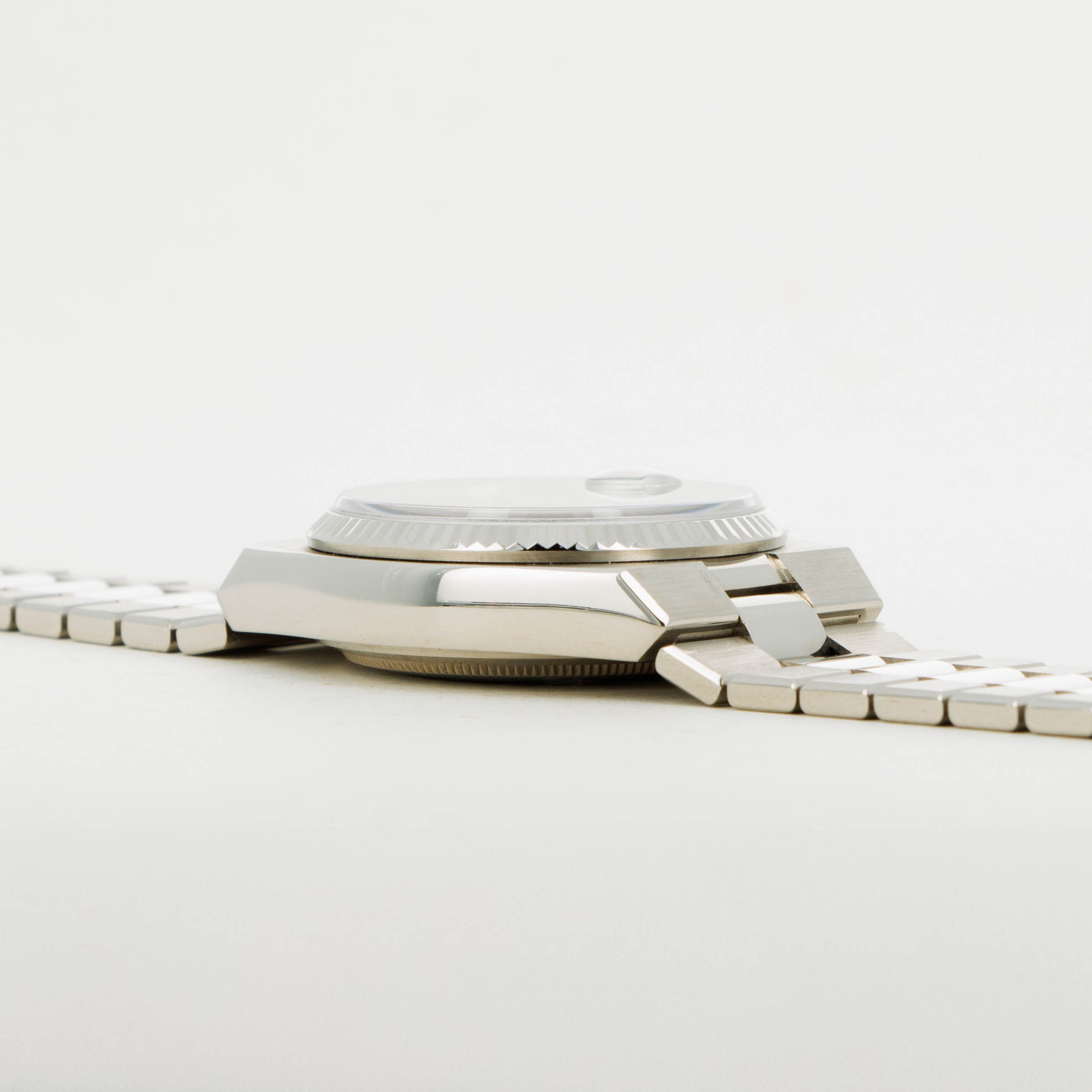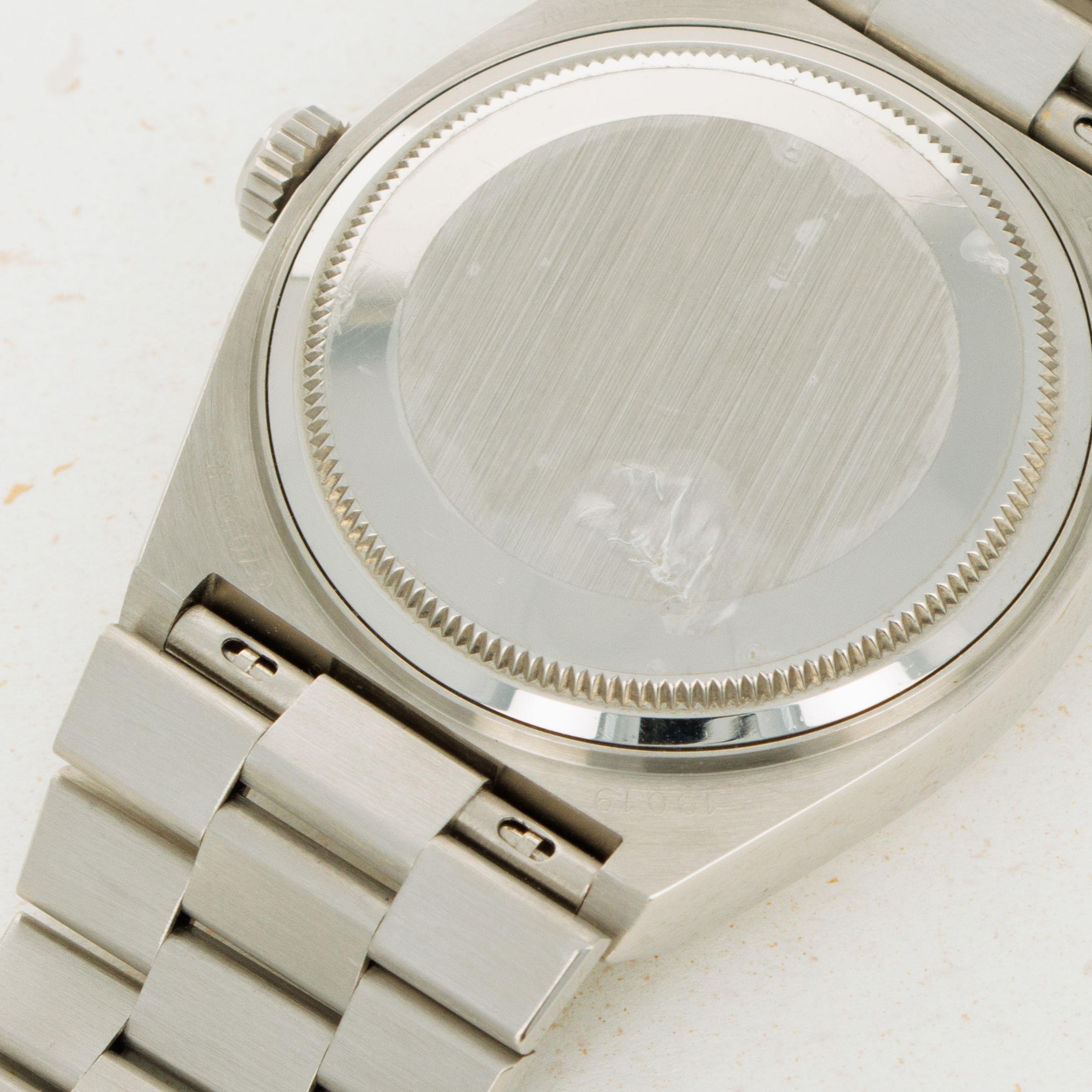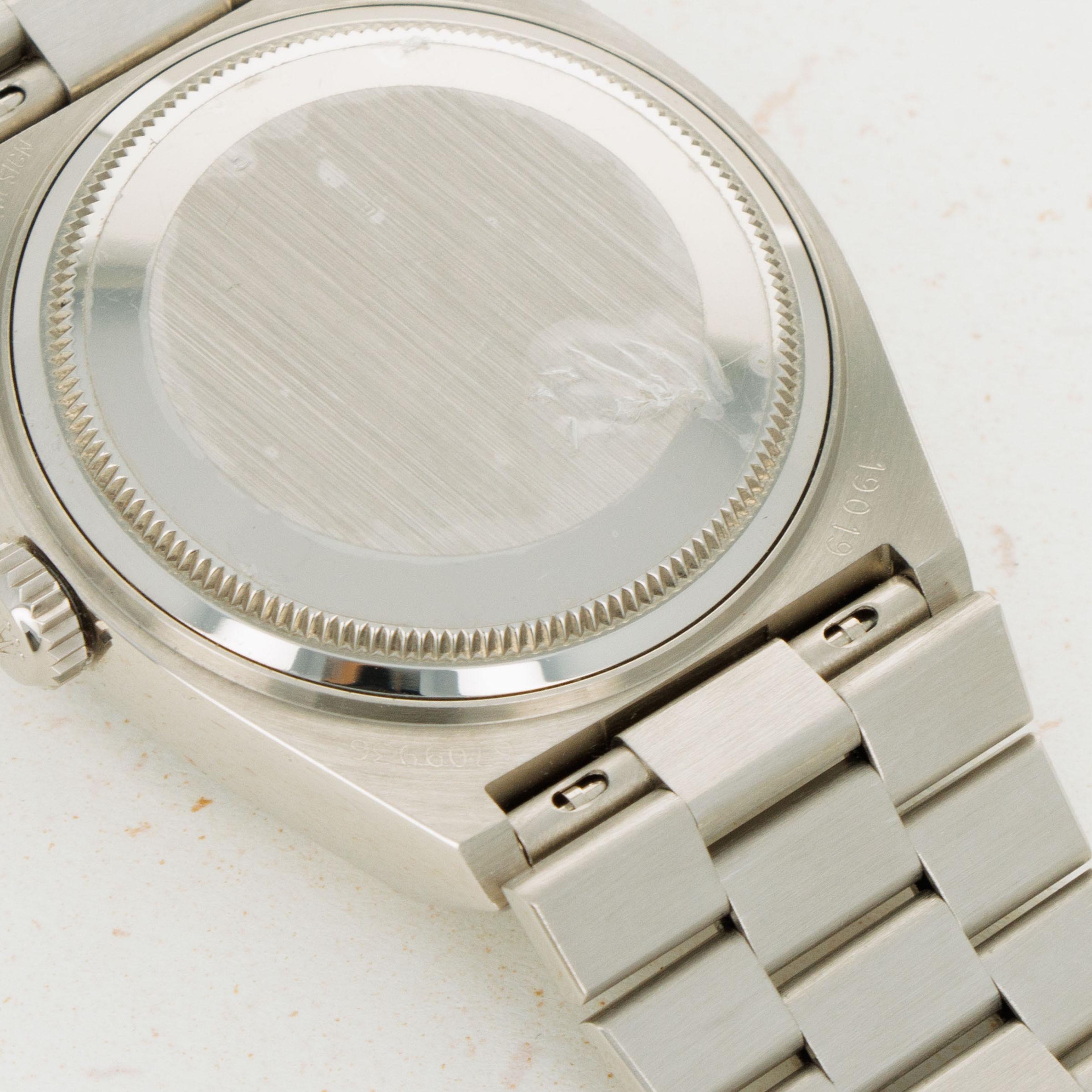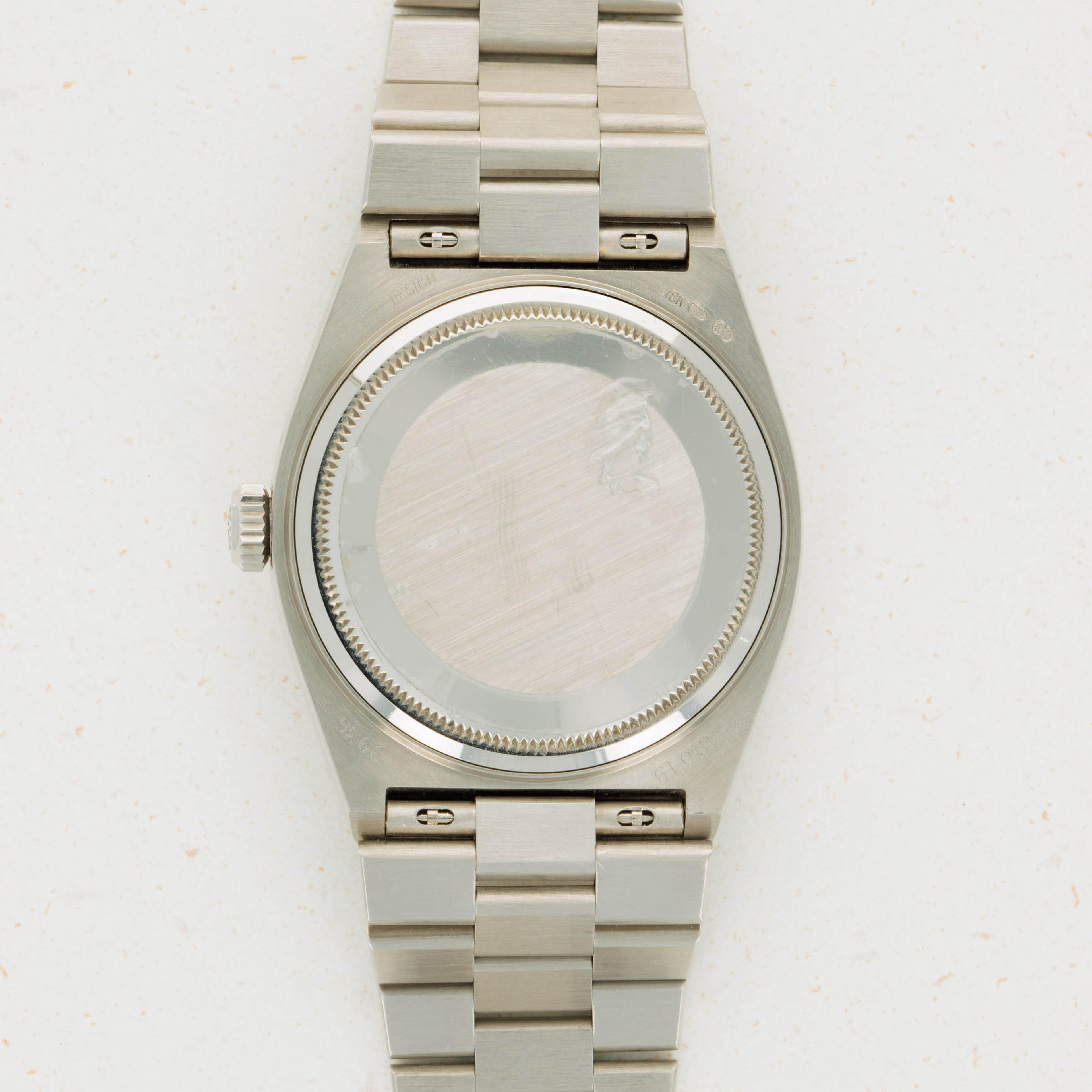 During the onslaught of the Japanese-led Quartz Crisis of the 70s and 80’s, Swiss watchmakers for forced to adapt to remain competitive in the market, or let themselves be swallowed up by their competition. As a way to deal with the Quartz Crisis, Rolex decided to release their own quartz timepiece in 1977, the Oysterquartz. In 1970, Rolex had released the precursor to the Oysterquartz, the Quartz Date 5100, powered by the Beta 21 movement, the result of a large-scale Swiss collaboration. While the Oysterquartz was loosely based on the ref. 5100, the Oysterquartz’ movement was in a league of its own. With 11 jewels, the latest CMOS circuitry, a 32000-hertz oscillator, and analog thermocompensation to regulate the quartz crystal, the Oysterquartz’s movement was held to just as high a standard as Rolex’s more typical mechanical movements. Besides its unusual movement, the Oysterquartz also features a unique construction in terms of its case shape and bracelet design, with an integrated bracelet attaching to a tonneau-shaped case. Additionally, the ref. 19019 is one of the most sought-after Oysterquartz variants with its Day-Date functionality, fluted bezel, hefty 18kt gold construction, and the Oysterquartz's version of the Day-Date's legendary president bracelet complete with a concealed clasp - something every Day-Date connoisseur can appreciate.