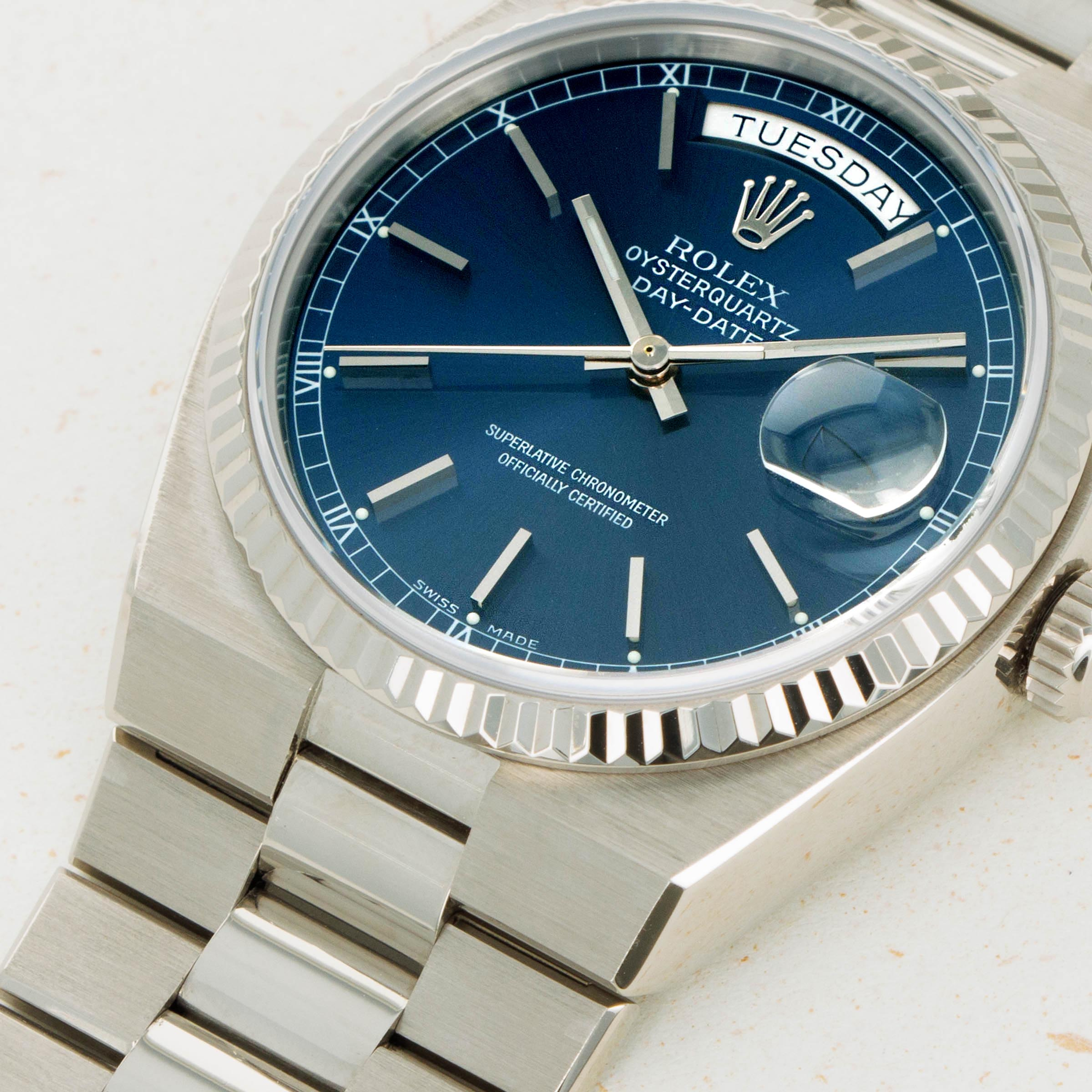 A stunning shade of electric blue, this Oysterquartz's dial pops against its bright 18kt white gold construction and provides a legible backdrop for its 18kt white gold hands and applied indices. Please note, the dial is a luminova service dial fitted during a service.