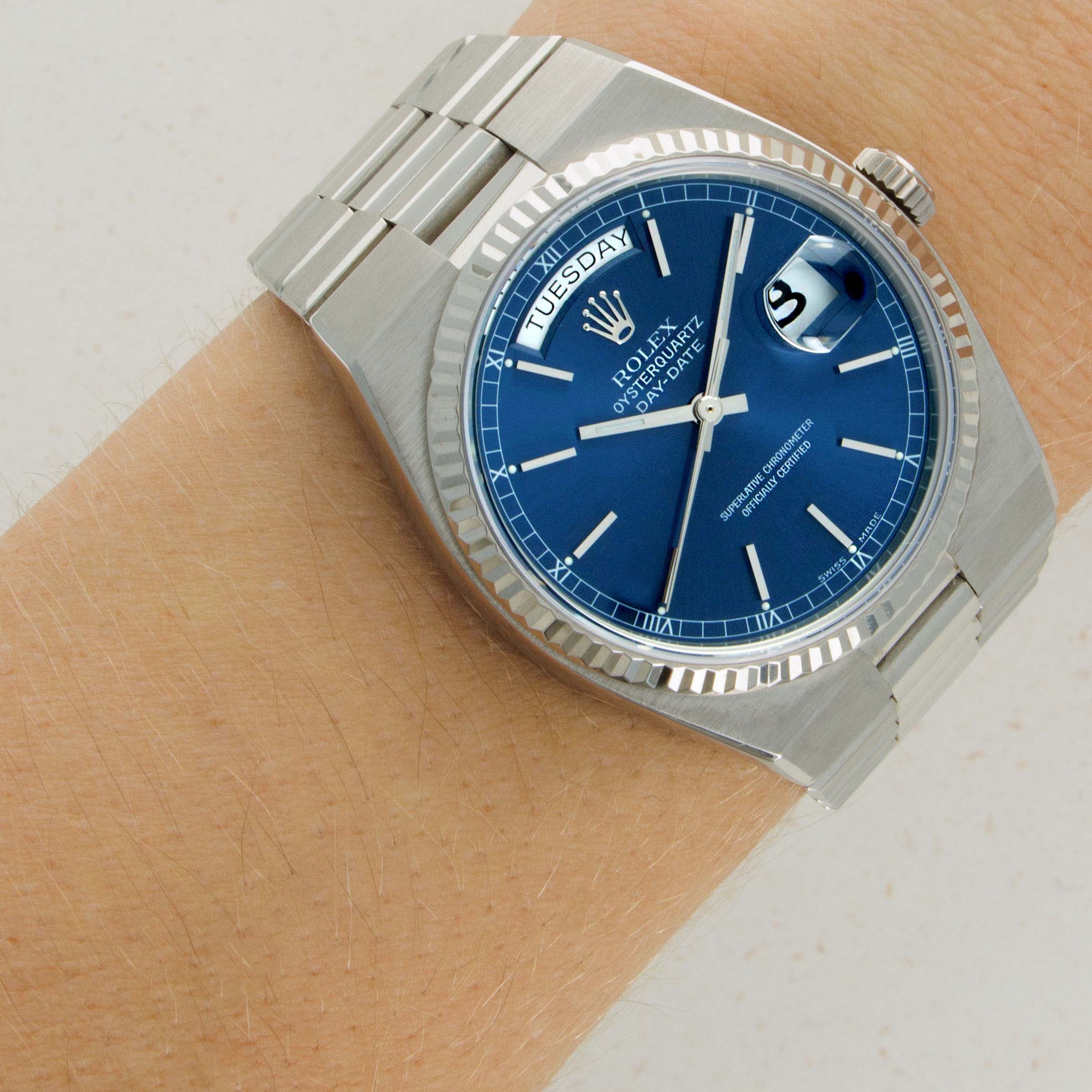 Measuring 36mm in diameter, the Day-Date's Oysterquartz's integrated bracelet and tonneau-shaped case help beef up its 18kt white gold construction so that it fills the wrist with the same heft as its mechanical sibling.