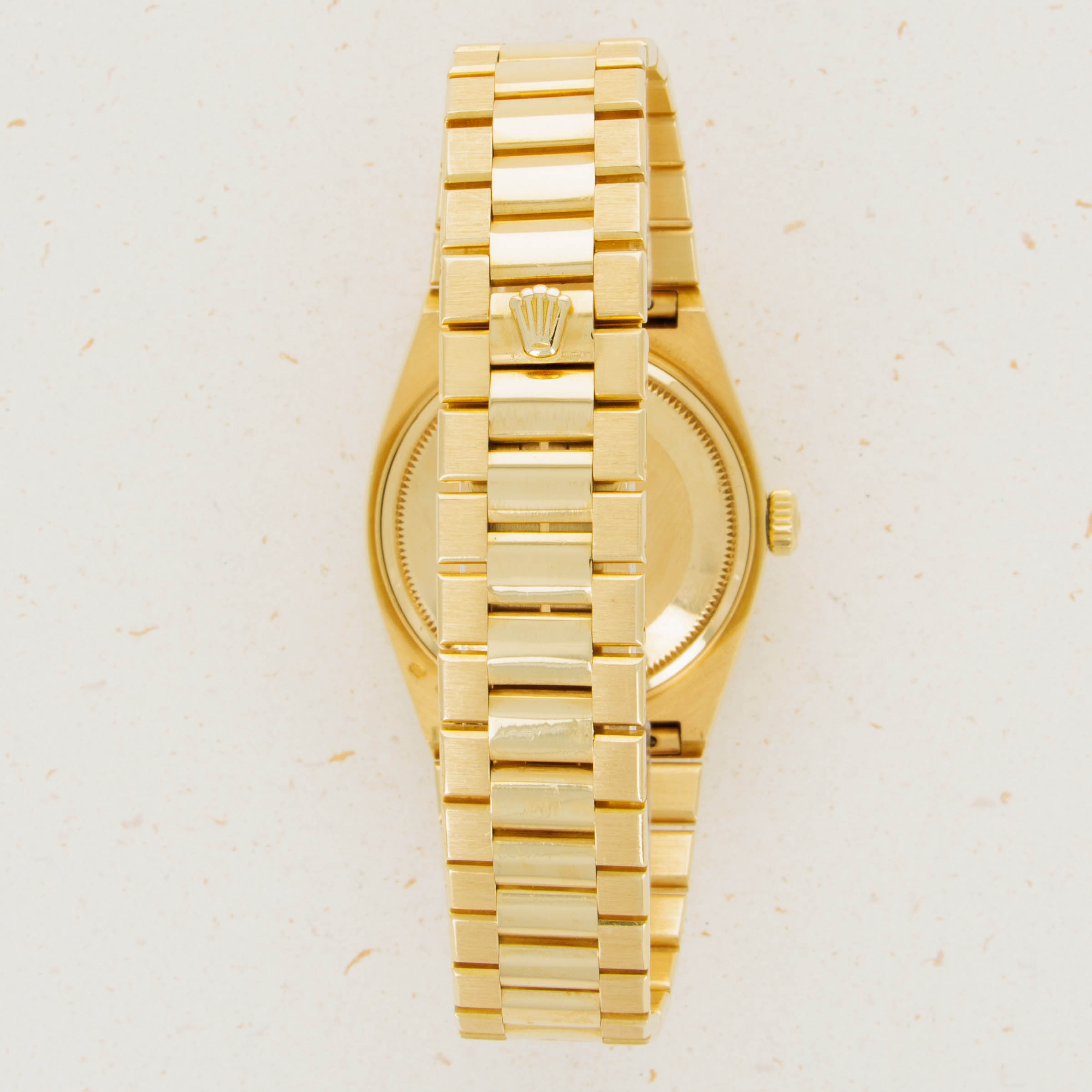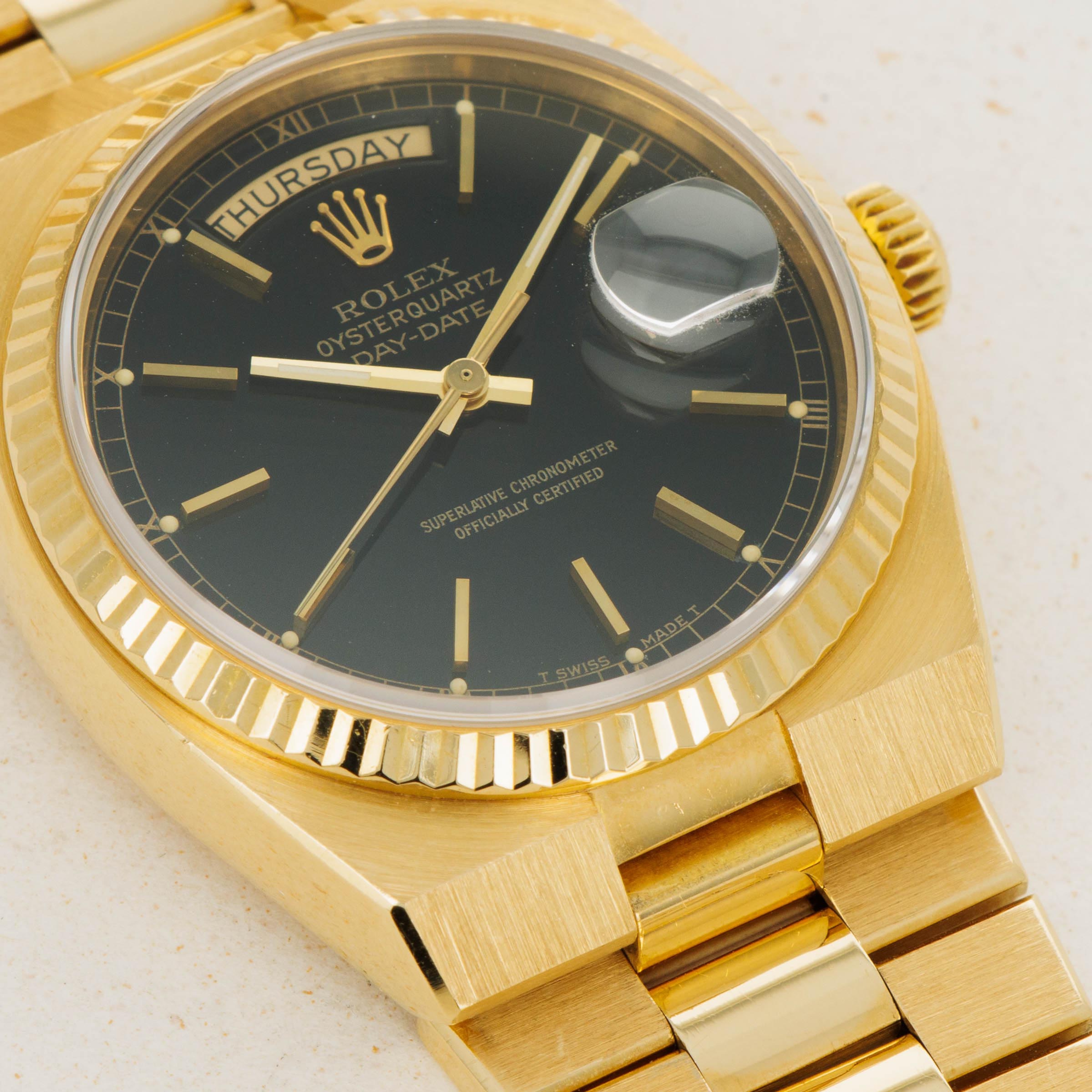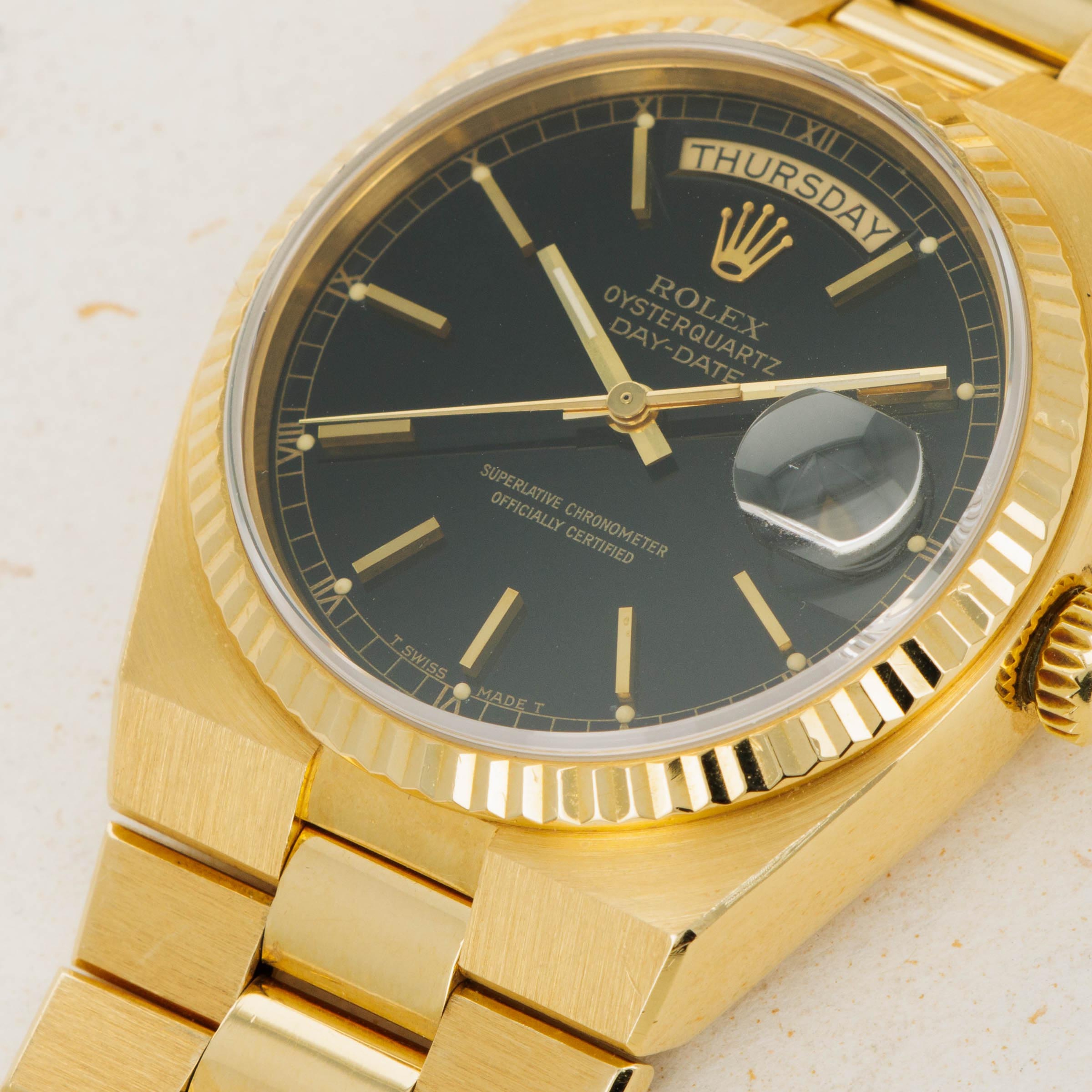 Featuring a stunning jet black dial, this ref. 19018 boasts a color combo that is as timeless as they come, black and gold. With its golden inscriptions and dial furniture placed within a jet-black backdrop surrounded by gold, this Oysterquartz Day-Date oozes pure luxury.