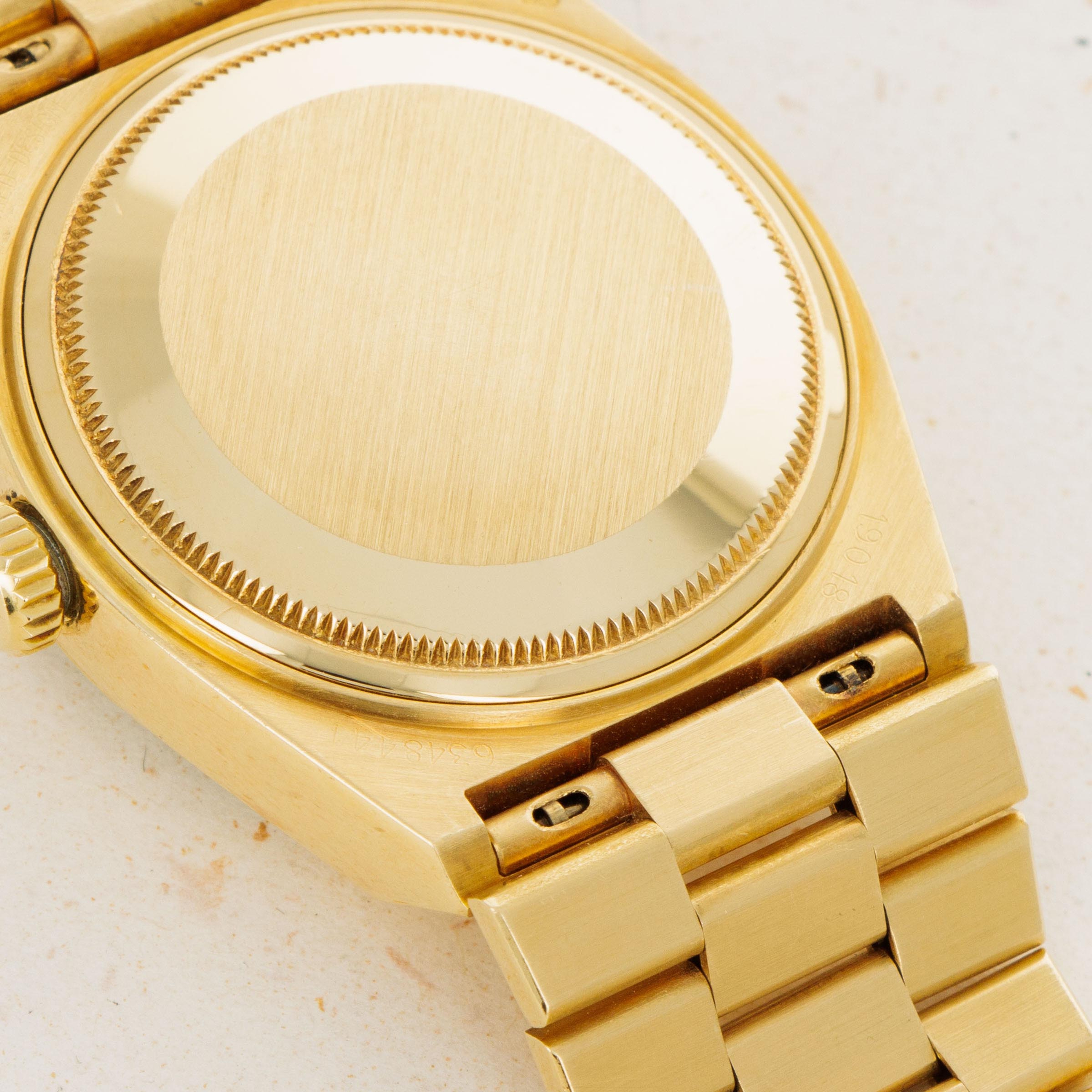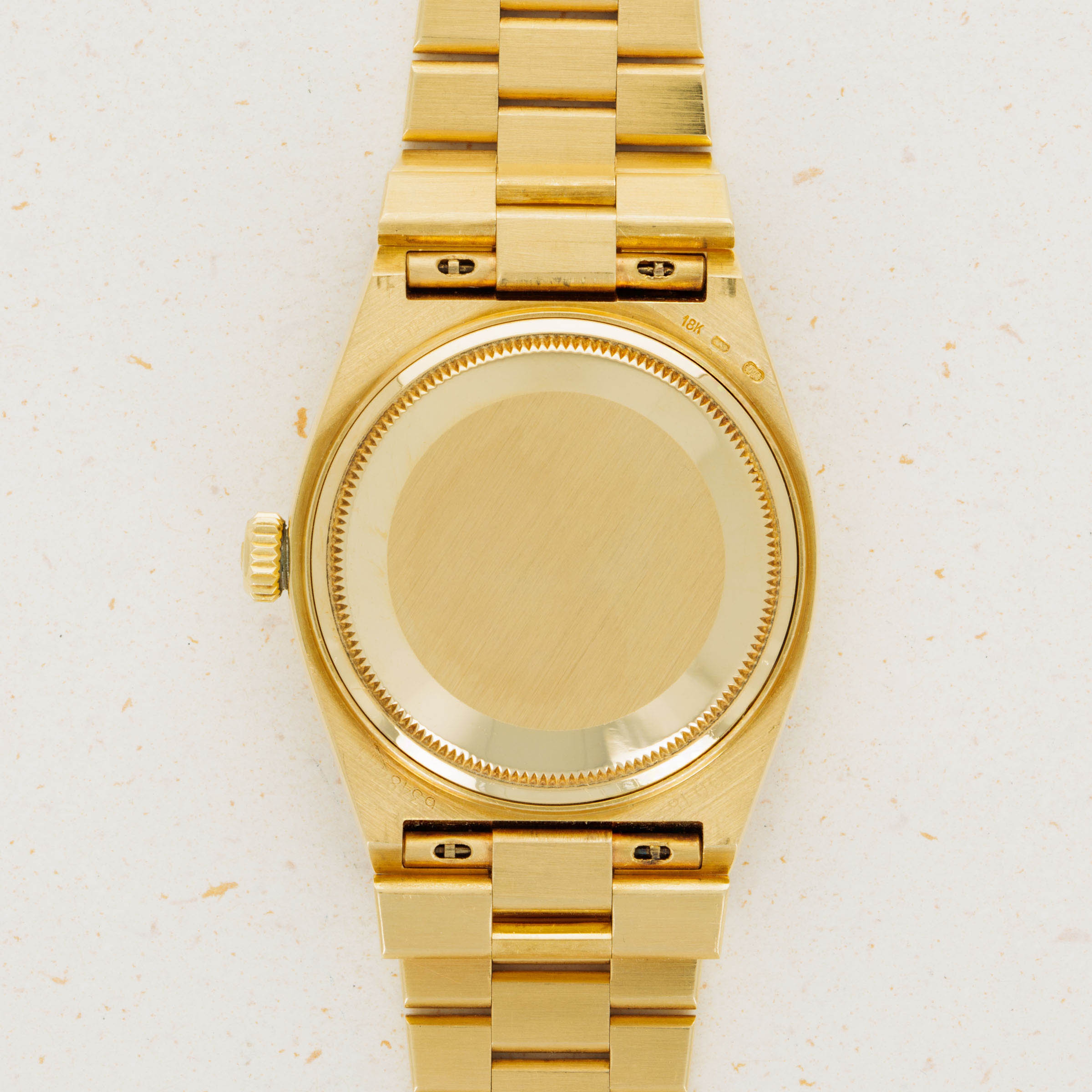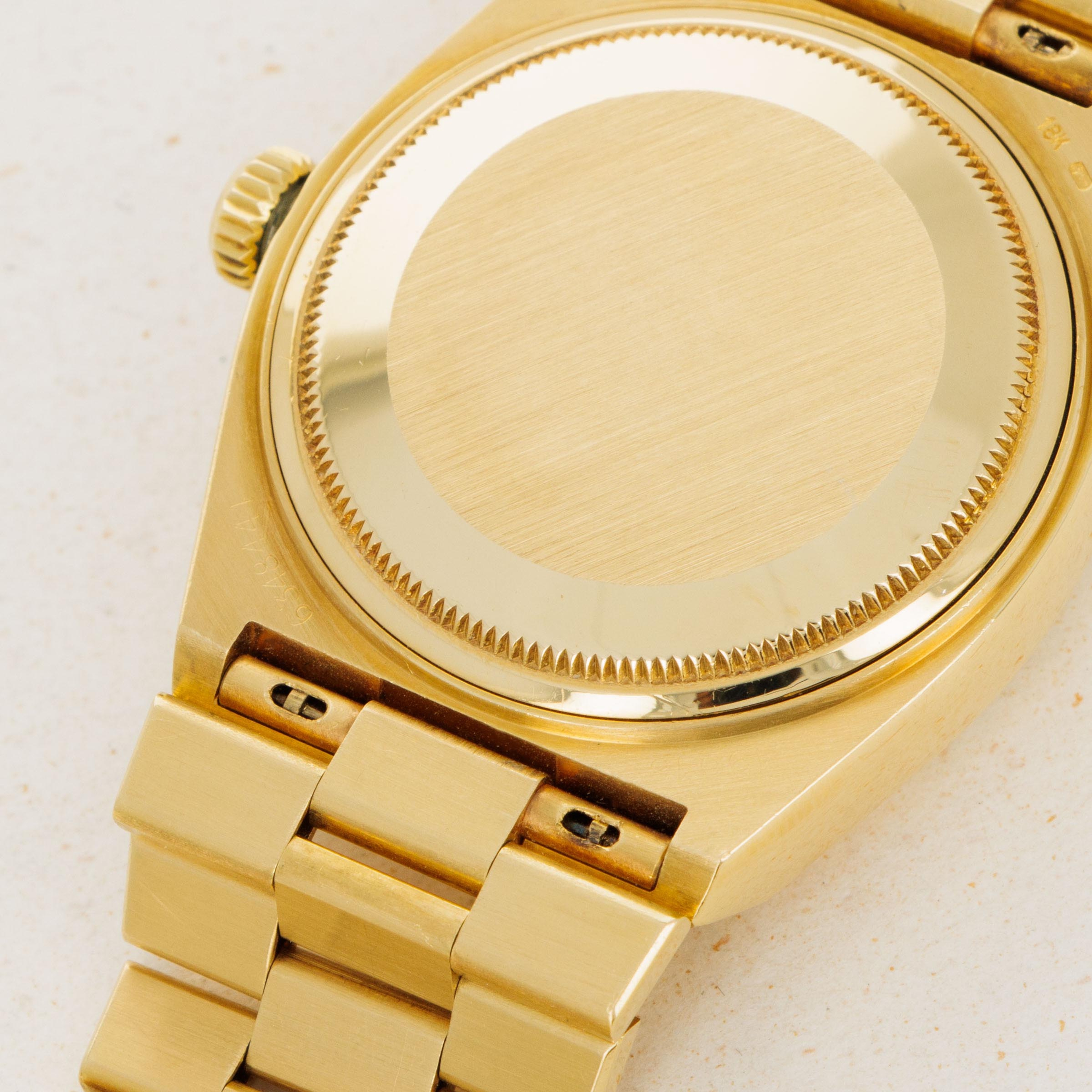 During the onslaught of the Japanese-led Quartz Crisis of the 70s and 80’s, Swiss watchmakers for forced to adapt to remain competitive in the market, or let themselves be swallowed up by their competition. As a way to deal with the Quartz Crisis, Rolex decided to release their own quartz timepiece in 1977, the Oysterquartz. In 1970, Rolex had released the precursor to the Oysterquartz, the Quartz Date 5100, powered by the Beta 21 movement, the result of a large-scale Swiss collaboration. While the Oysterquartz was loosely based on the ref. 5100, the Oysterquartz’ movement was in a league of its own. With 11 jewels, the latest CMOS circuitry, a 32000-hertz oscillator, and analog thermocompensation to regulate the quartz crystal, the Oysterquartz’s movement was held to just as high a standard as Rolex’s more typical mechanical movements. Besides its unusual movement, the Oysterquartz also features a unique construction in terms of its case shape and bracelet design, with an integrated bracelet attaching to a tonneau-shaped case. Additionally, the ref. 19018 is one of the most sought-after Oysterquartz variants with its Day-Date functionality, fluted bezel, hefty 18kt gold construction, and Day-Date Oysterquartz bracelet complete with a concealed clasp - something every Day-Date connoisseur can appreciate.