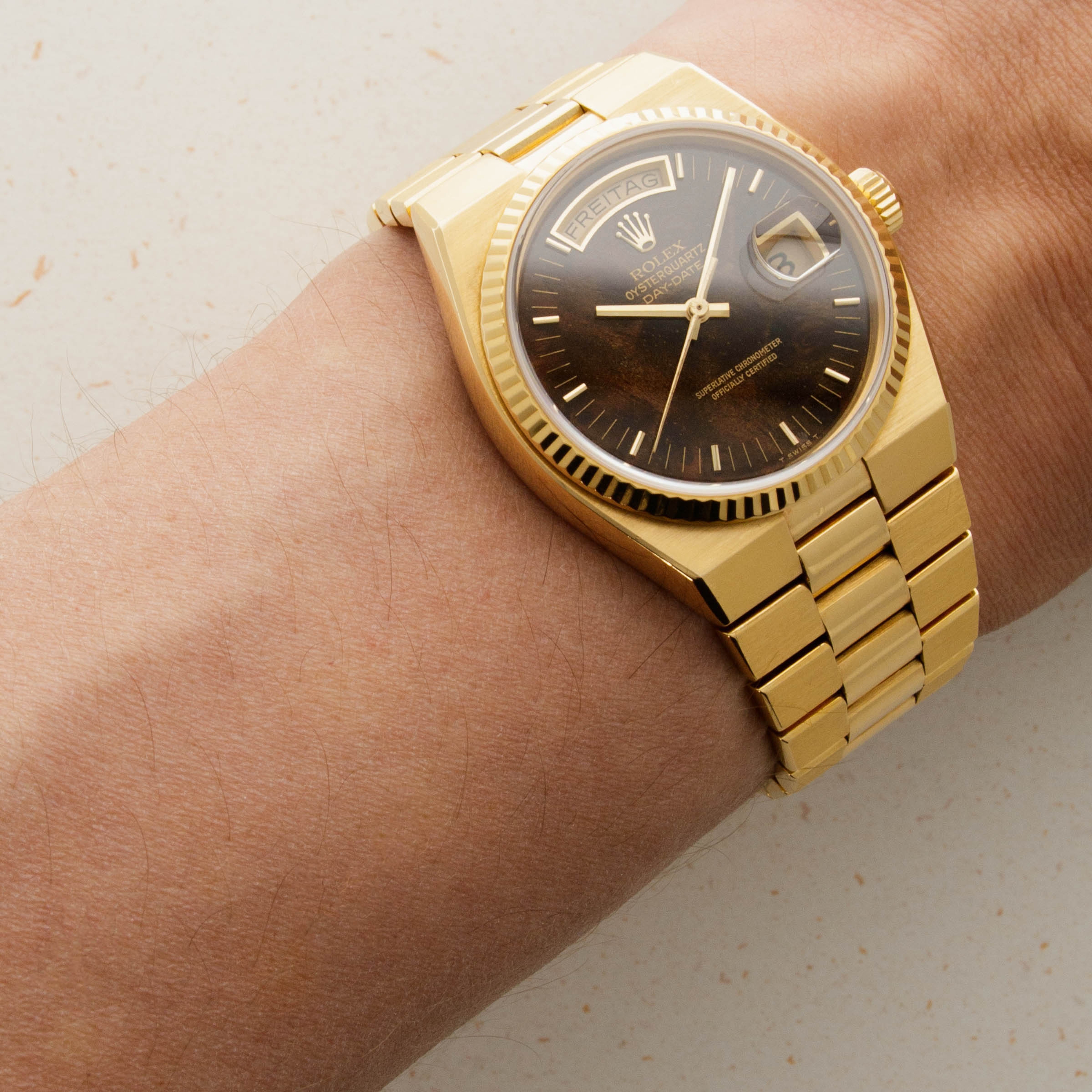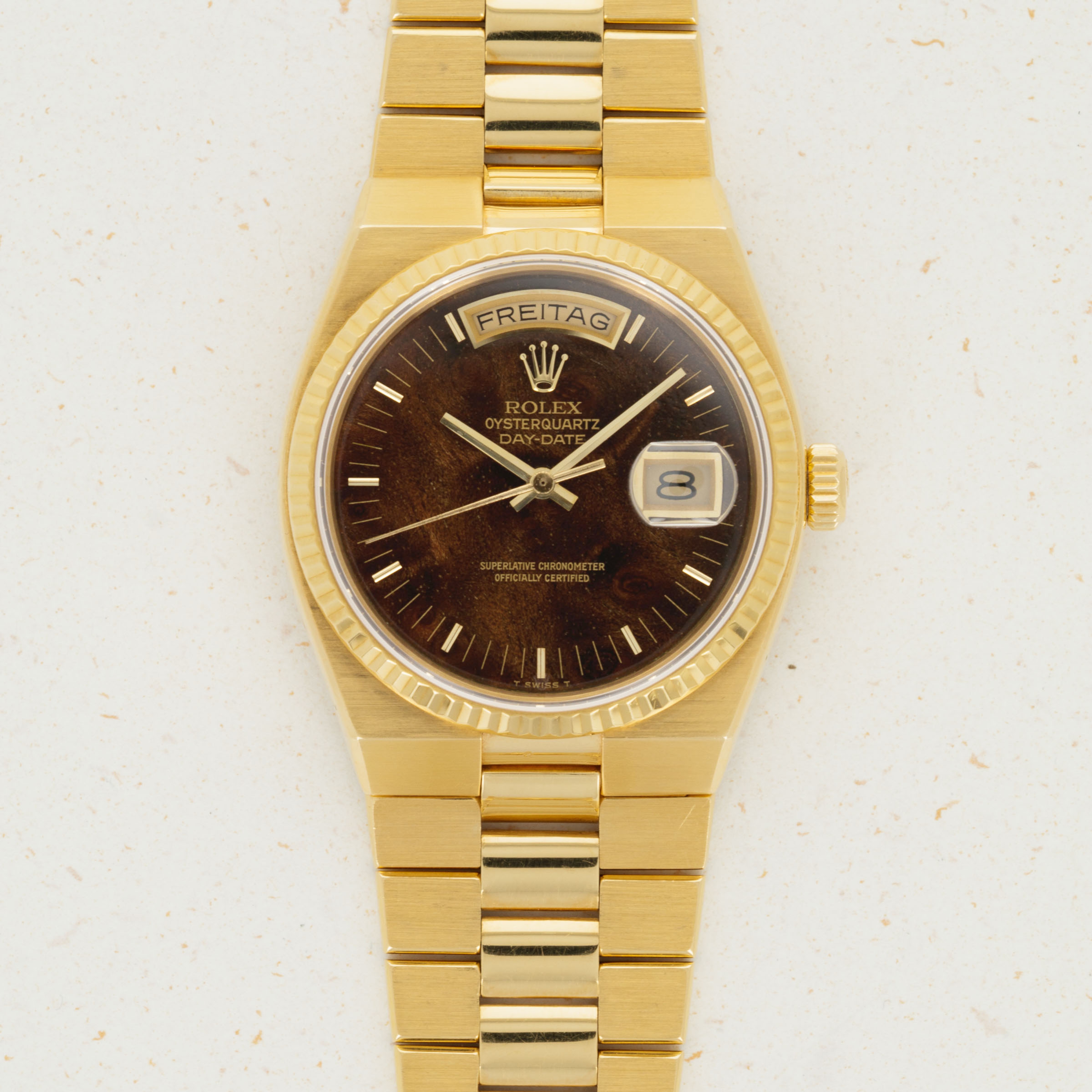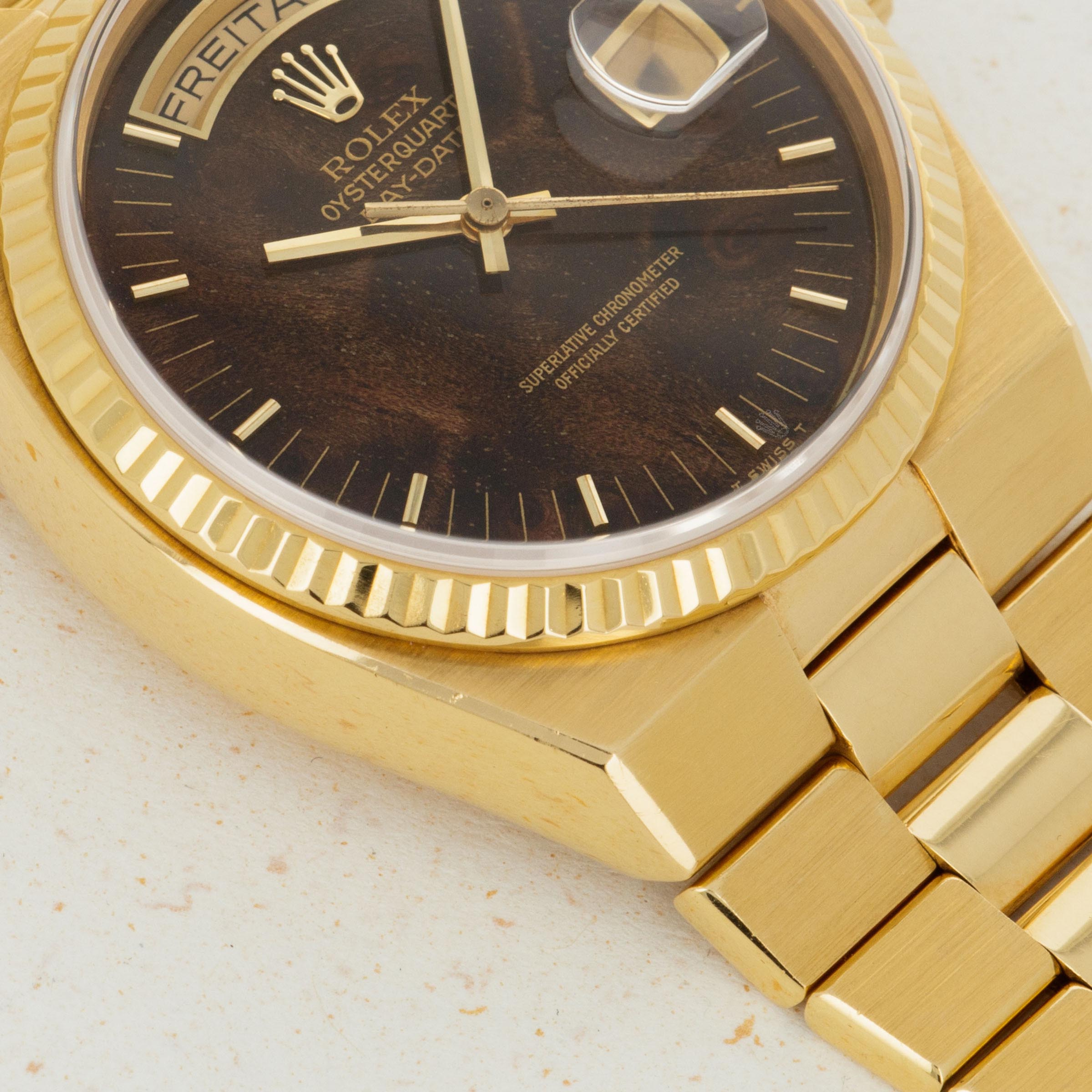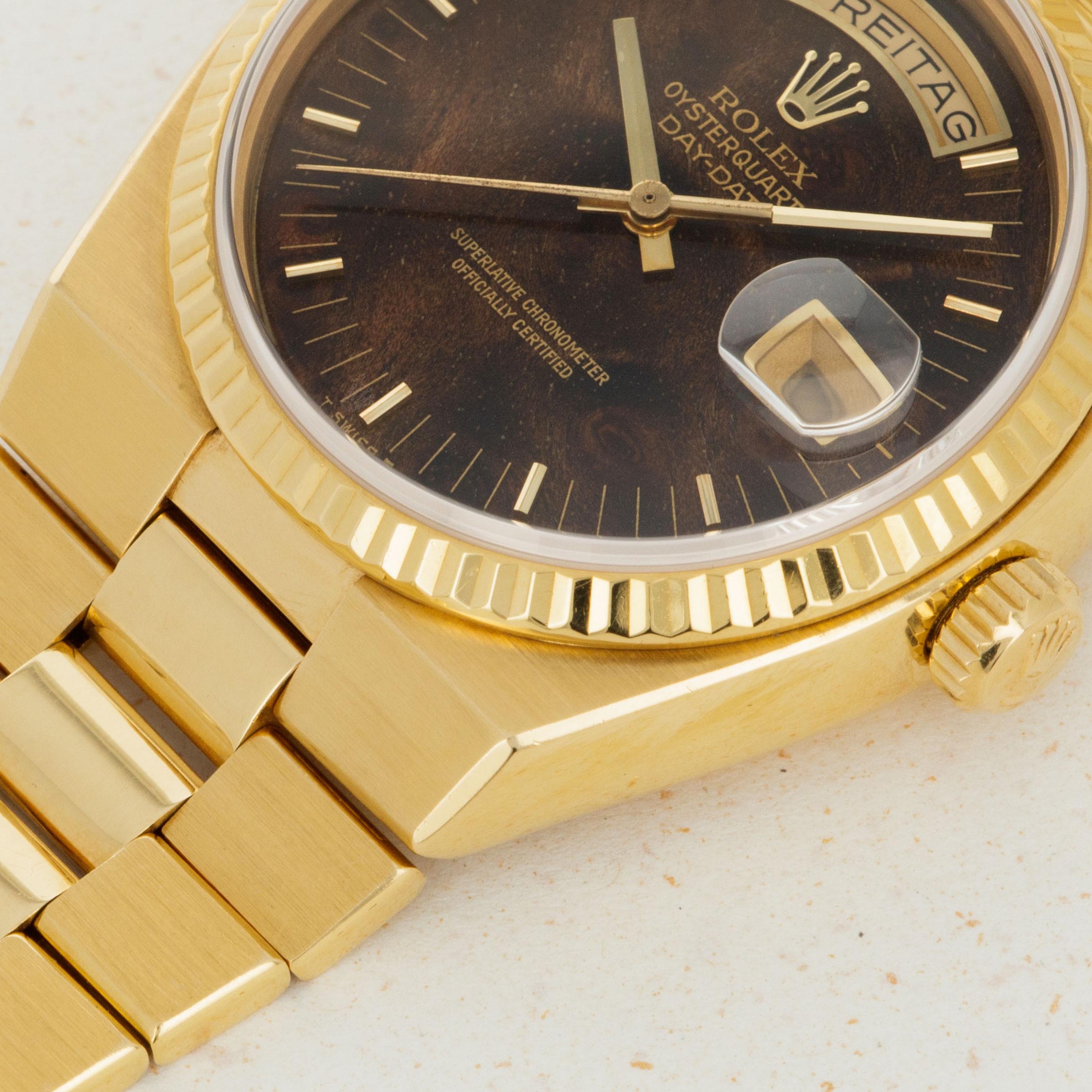 Featuring the very best Rolex had to offer at the time, the ref. 19018 sports an unsurprisingly over-engineered quartz movement, as a result of their response to the Quartz Crisis, and a beautifully executed luxurious construction that is stunning in its own right. Added with its burl dial, this example is truly spectacular.