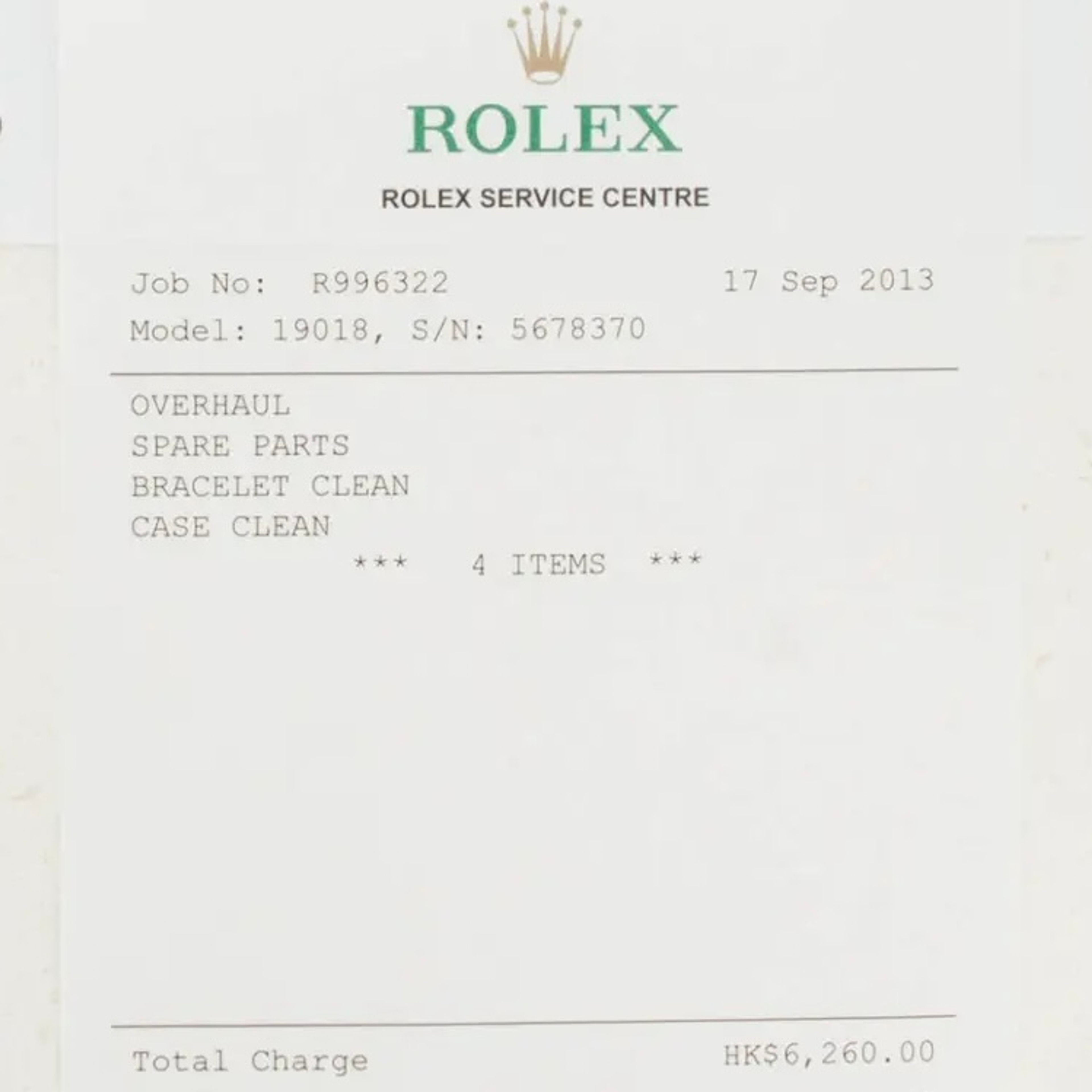 Watch is in overall excellent condition. There is some surface wear and a few minor scratches along the case. Watch comes with a service invoice from 2013 showing a full overhaul performed at Rolex HK. The burl wood dial is mint and free from any damage. The bracelet has 23 links total, 4 of which are removable. There is minimal stretch to the band.