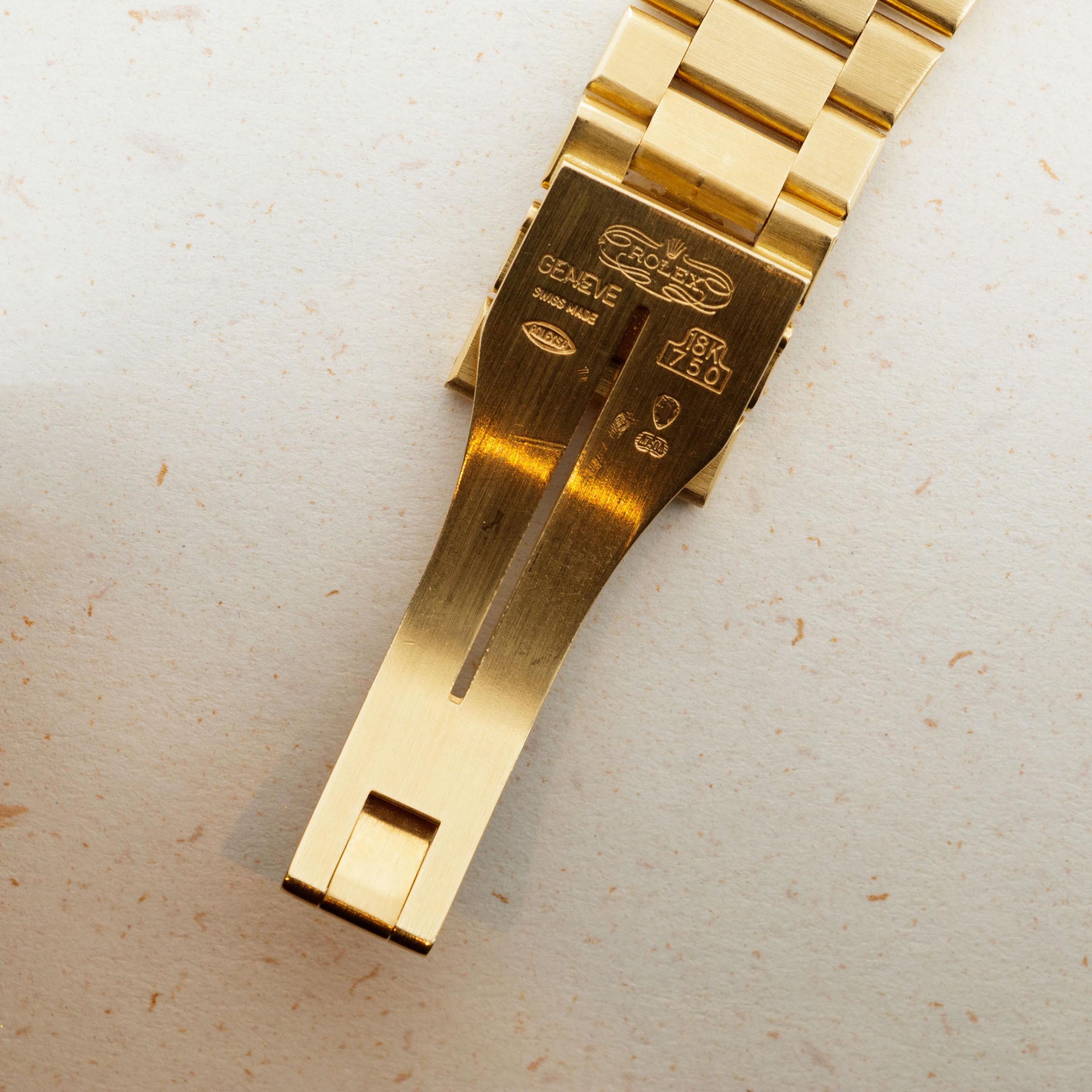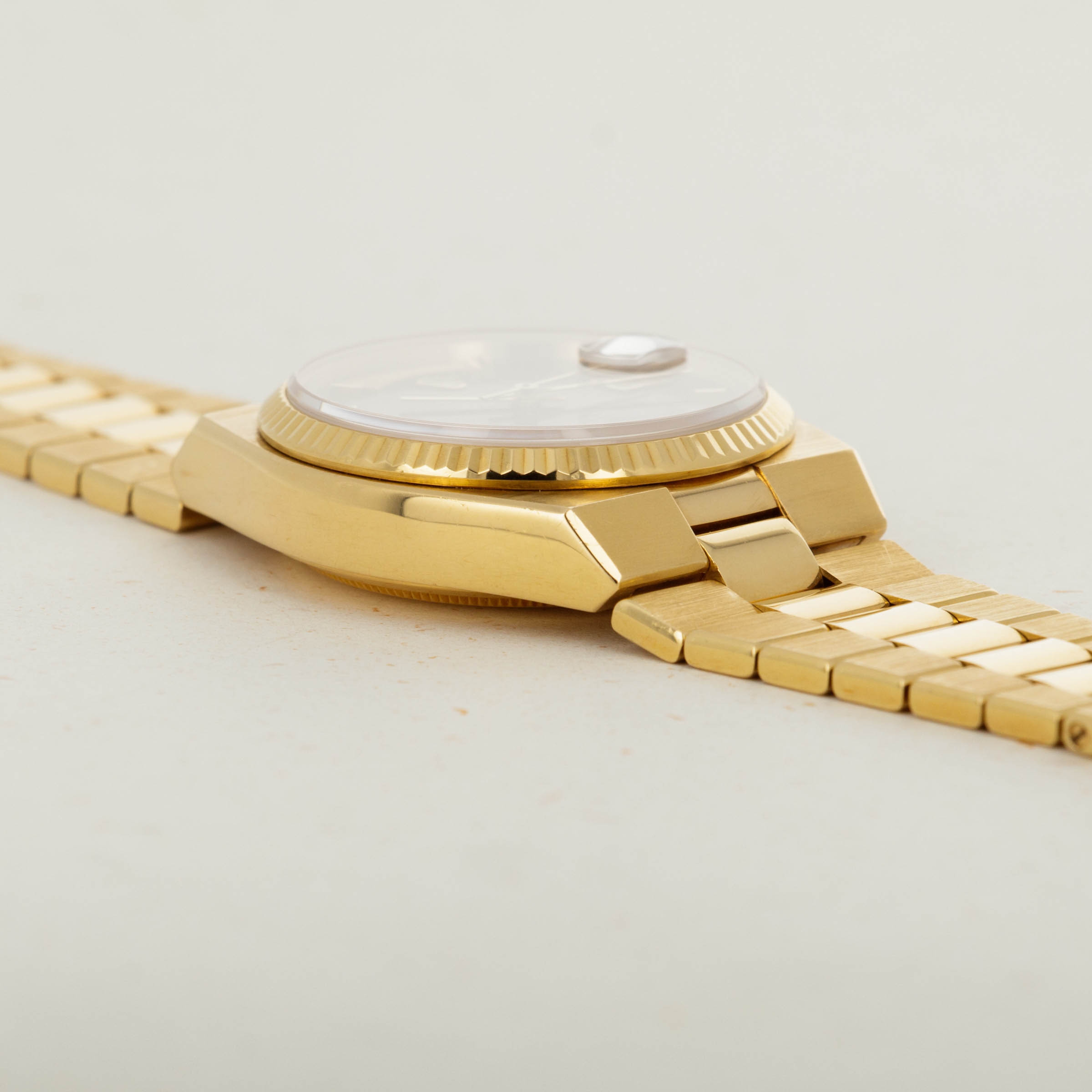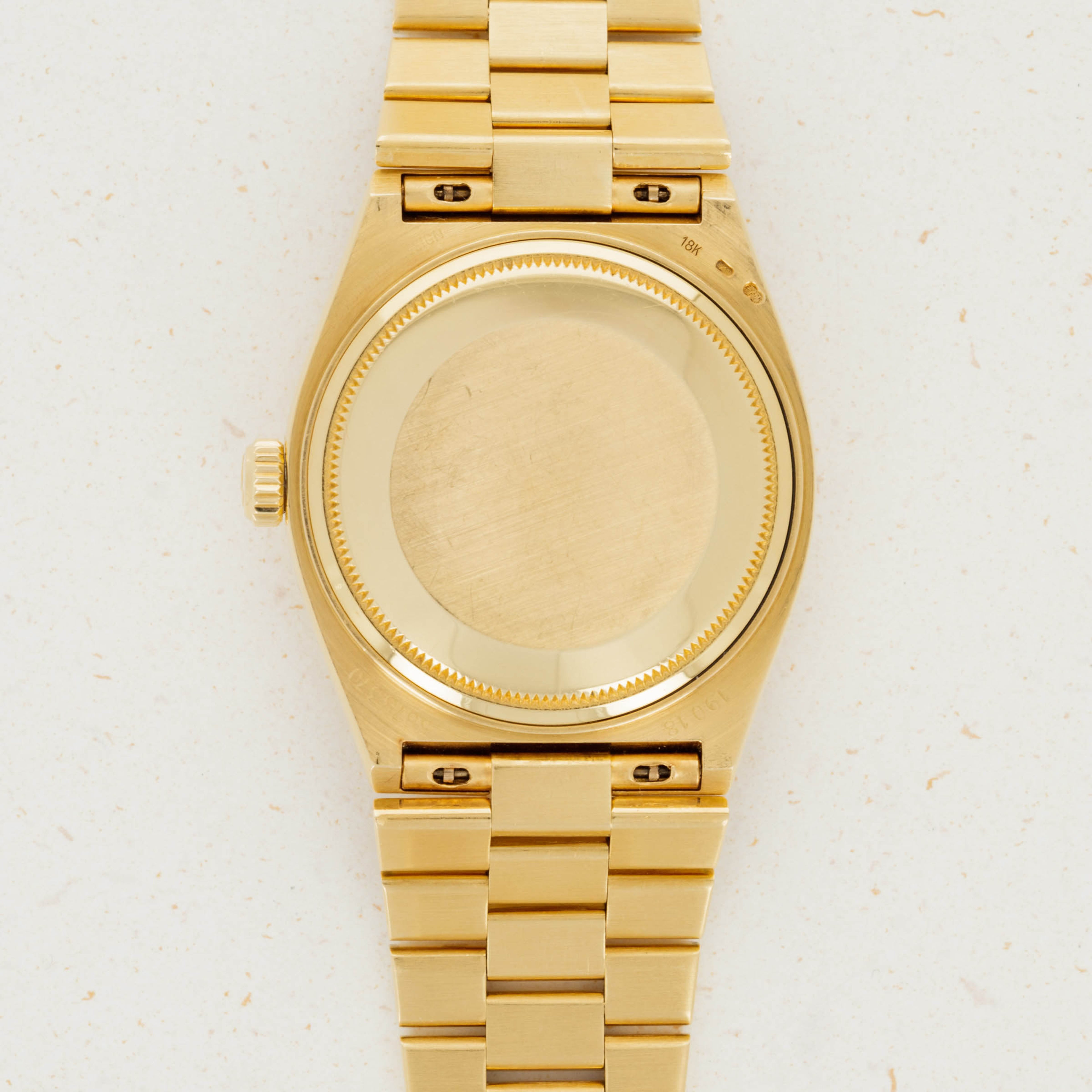 During the onslaught of the Japanese-led Quartz Crisis of the 70s and 80’s, Swiss watchmakers for forced to adapt to remain competitive in the market, or let themselves be swallowed up by their competition. As a way to deal with the Quartz Crisis, Rolex decided to release their own quartz timepiece in 1977, the Oysterquartz. In 1970, Rolex had released the precursor to the Oysterquartz, the Quartz Date 5100, powered by the Beta 21 movement, the result of a large-scale Swiss collaboration. While the Oysterquartz was loosely based on the ref. 5100, the Oysterquartz’ movement was in a league of its own. With 11 jewels, the latest CMOS circuitry, a 32000-hertz oscillator, and analog thermocompensation to regulate the quartz crystal, the Oysterquartz’s movement was held to just as high a standard as Rolex’s more typical mechanical movements. Besides its unusual movement, the Oysterquartz also features a unique construction in terms of its case shape and bracelet design, with an integrated bracelet attaching to a tonneau-shaped case. Additionally, the ref. 19018 is one of the most sought-after Oysterquartz variants with its Day-Date functionality, fluted bezel, hefty 18kt gold construction, and Day-Date Oysterquartz bracelet complete with a concealed clasp - something every Day-Date connoisseur can appreciate.