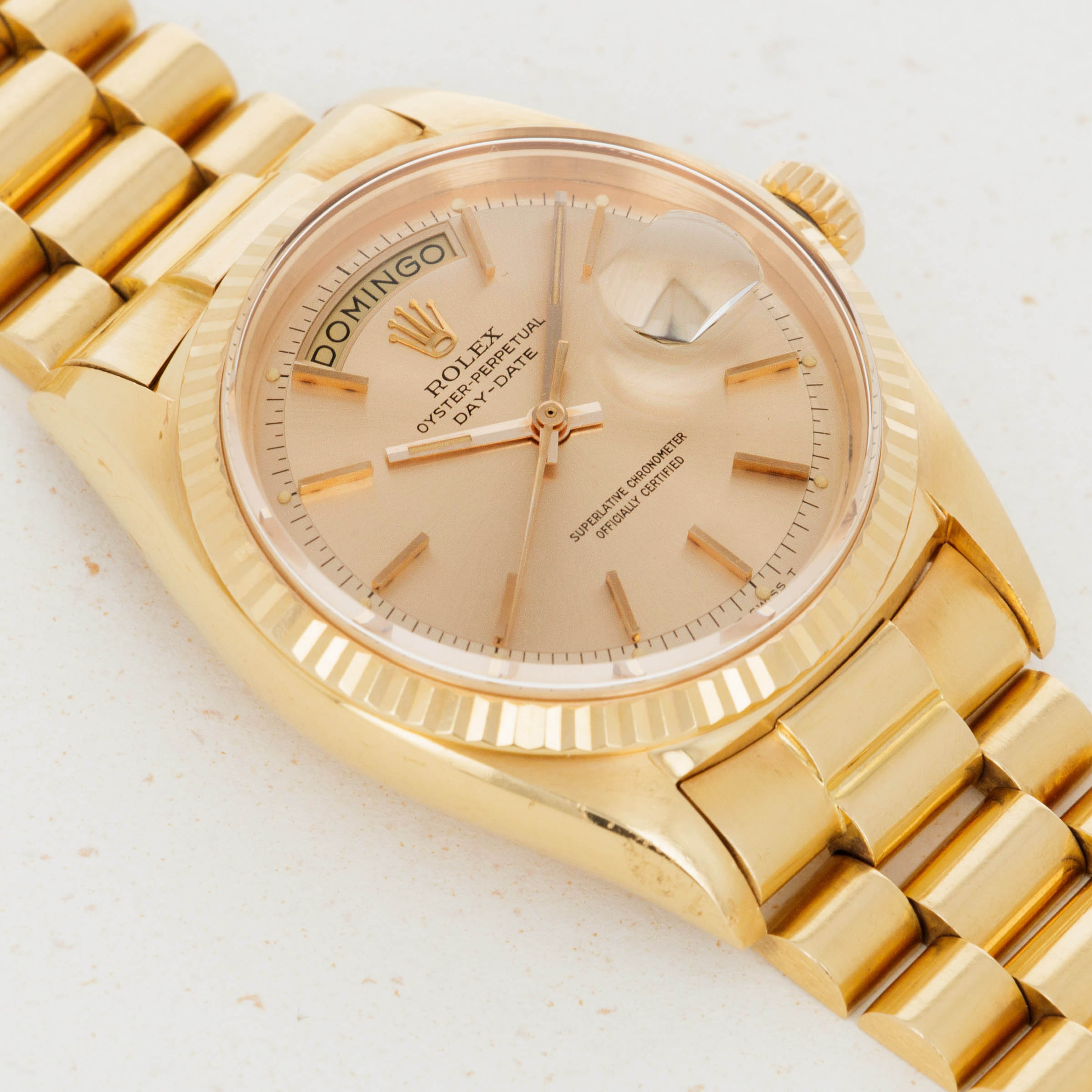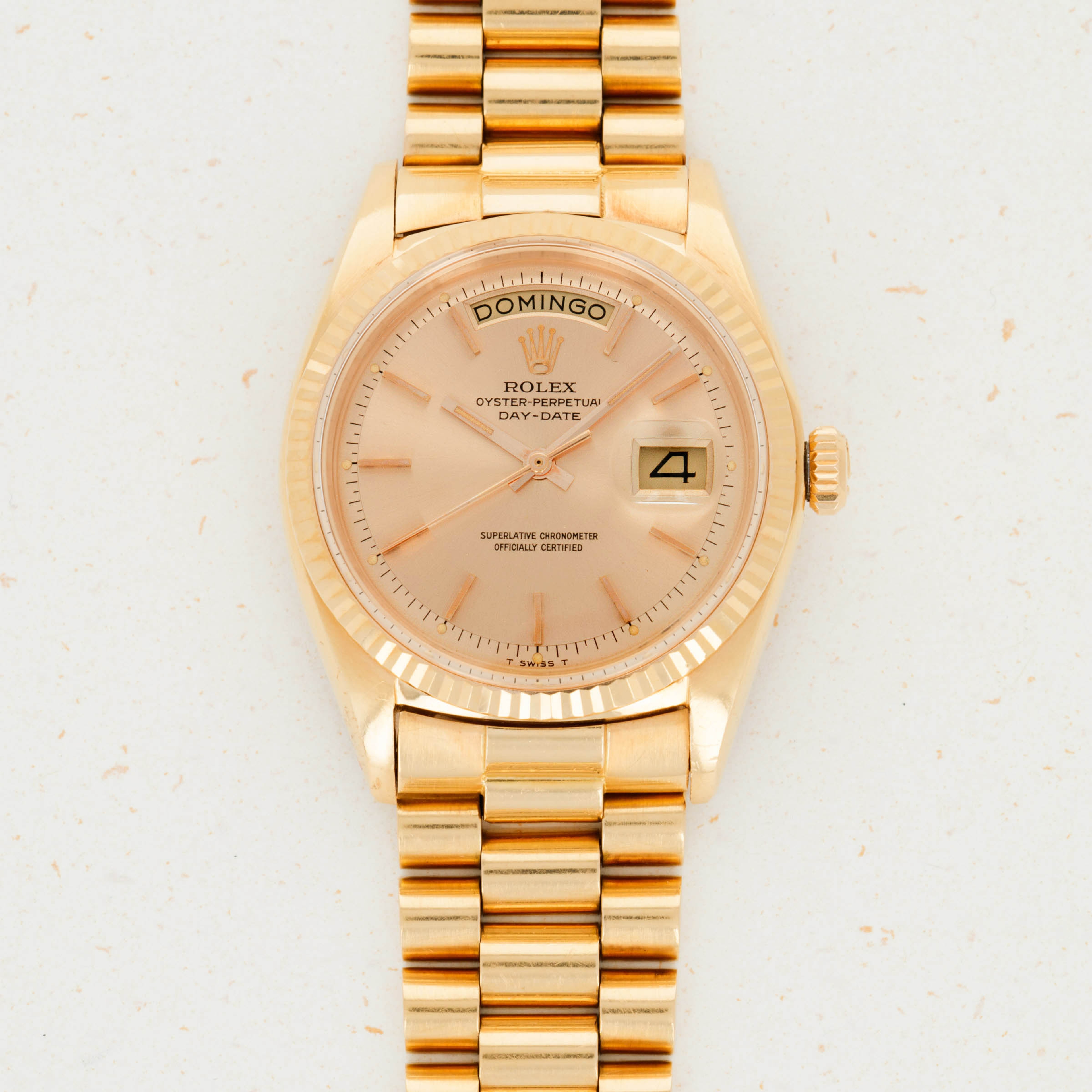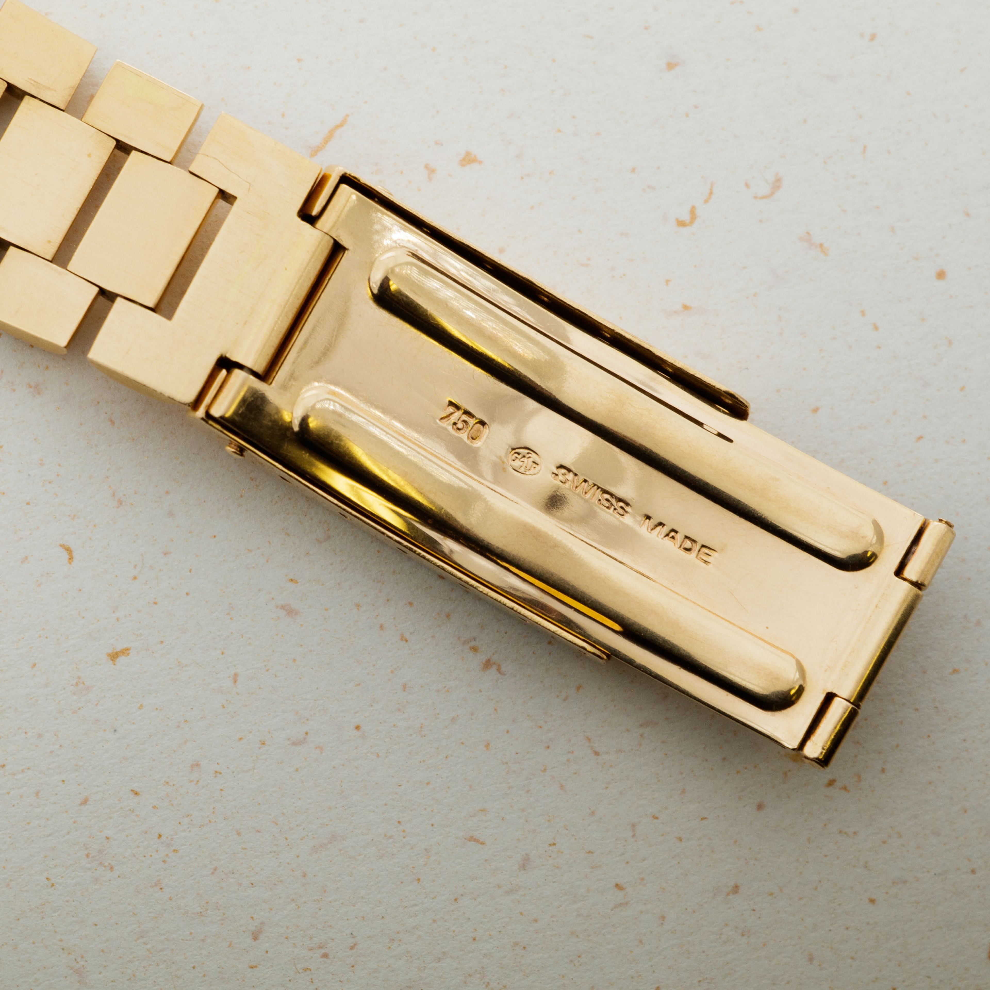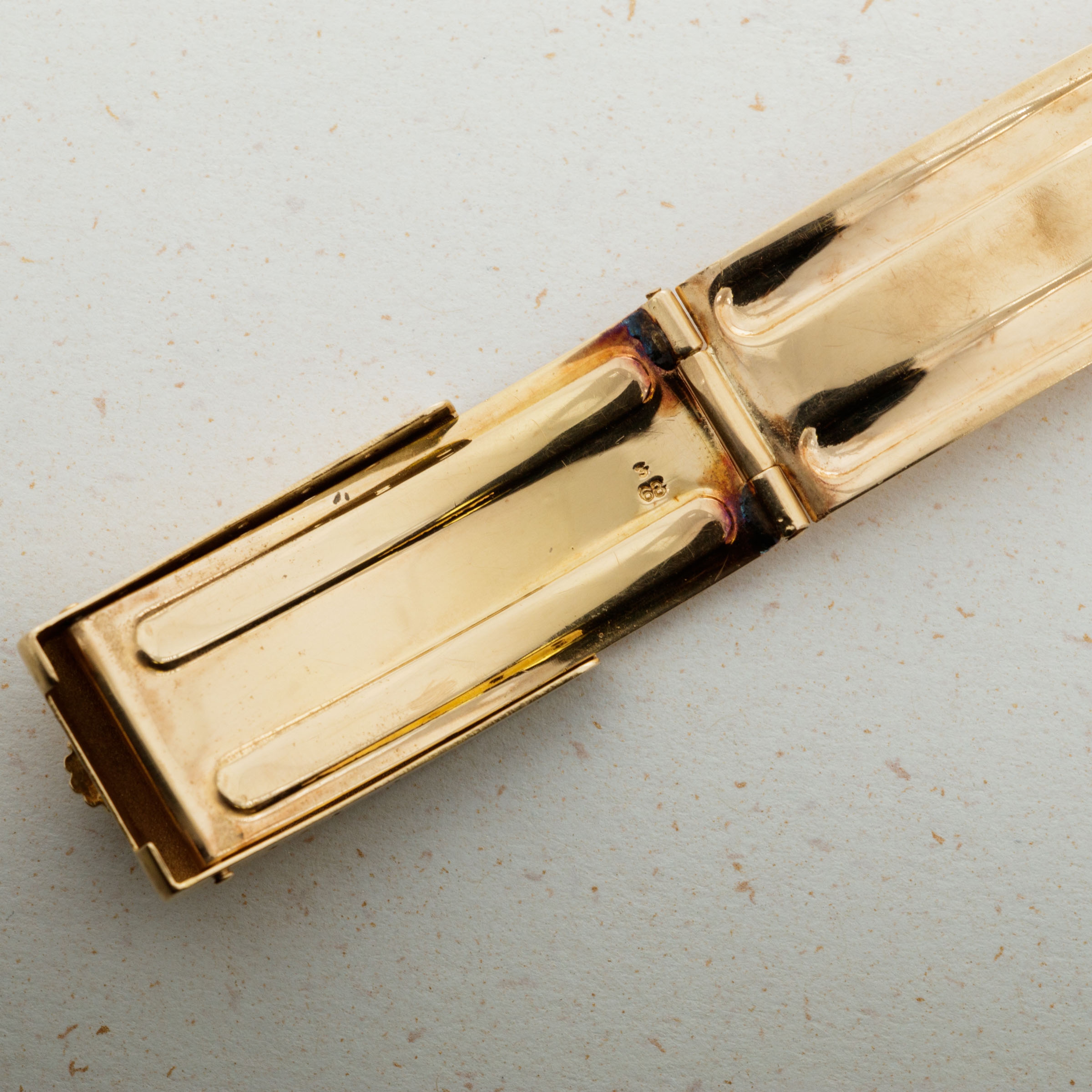 The overall condition of the watch is very good. Pink colored dial is in excellent condition with creamy luminous and matching hands. Case and bracelet have minor surface abrasions throughout. Bracelet has a total of 19 links. There is moderate stretch consistent with average use. Band is signed GF with a Rolex clasp, and dated 1968. South American market pink gold bands were all signed GF, but they are otherwise exactly the same as their Rolex signed counterparts. The watch has a Spanish date wheel, supporting the fact that it was likely first sold in South America.