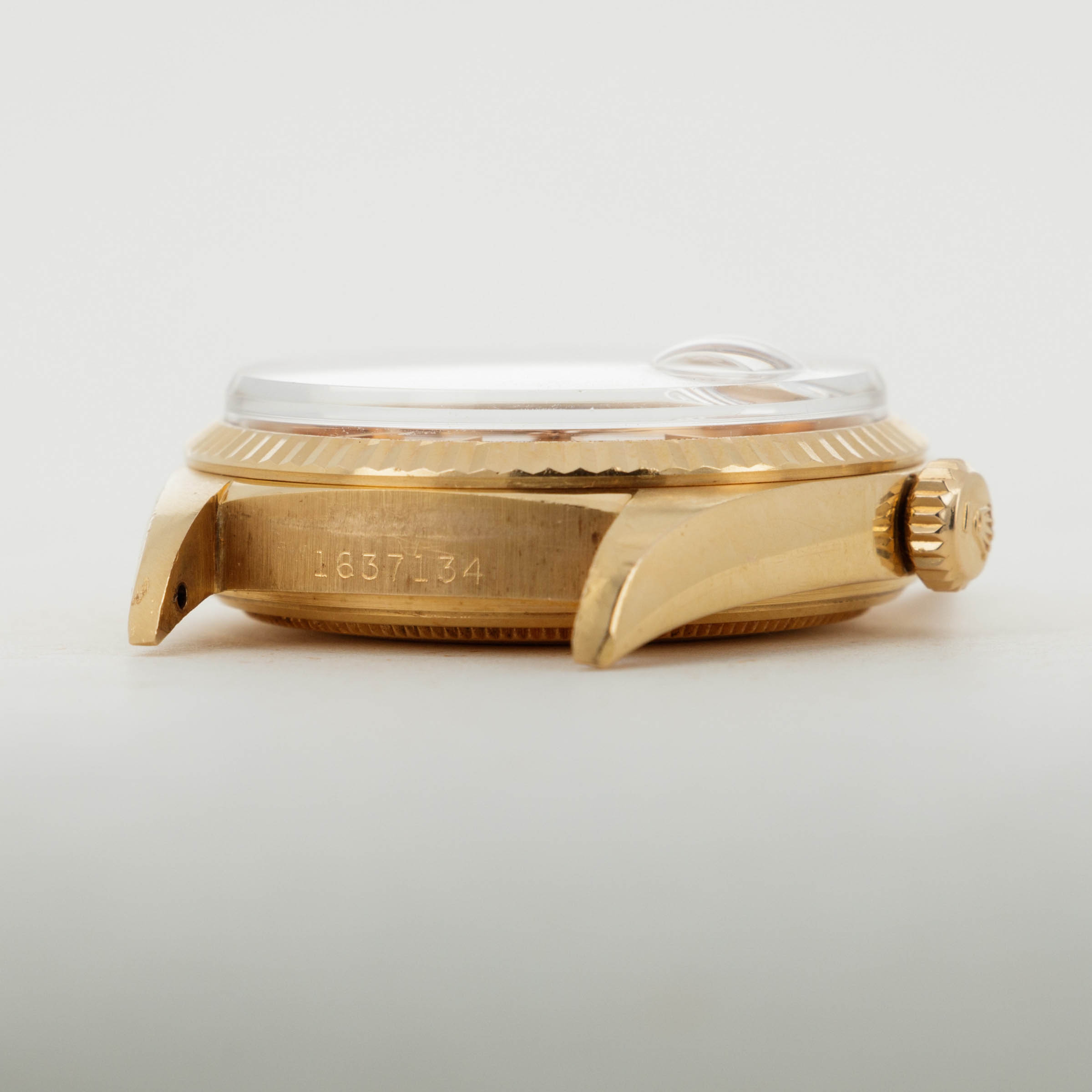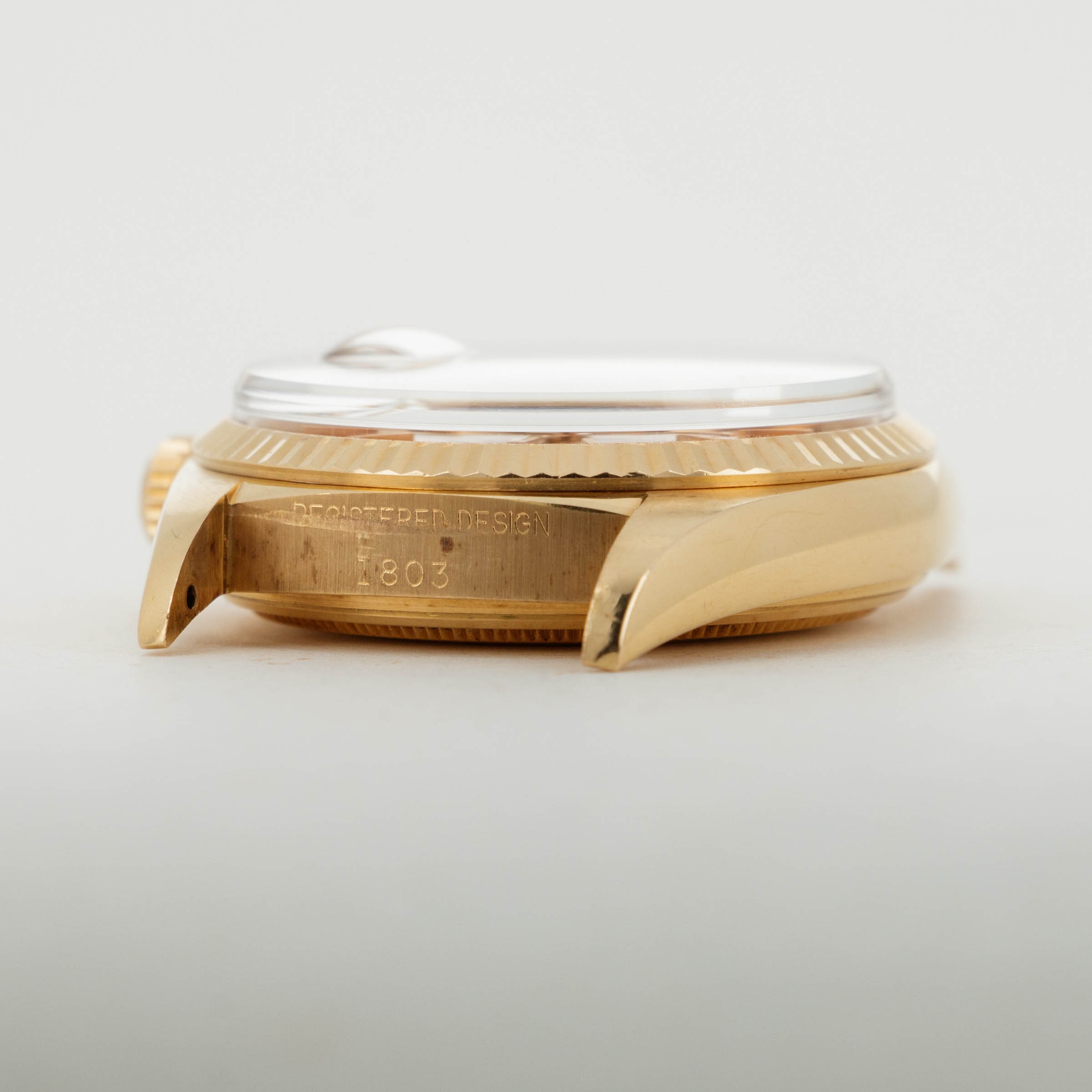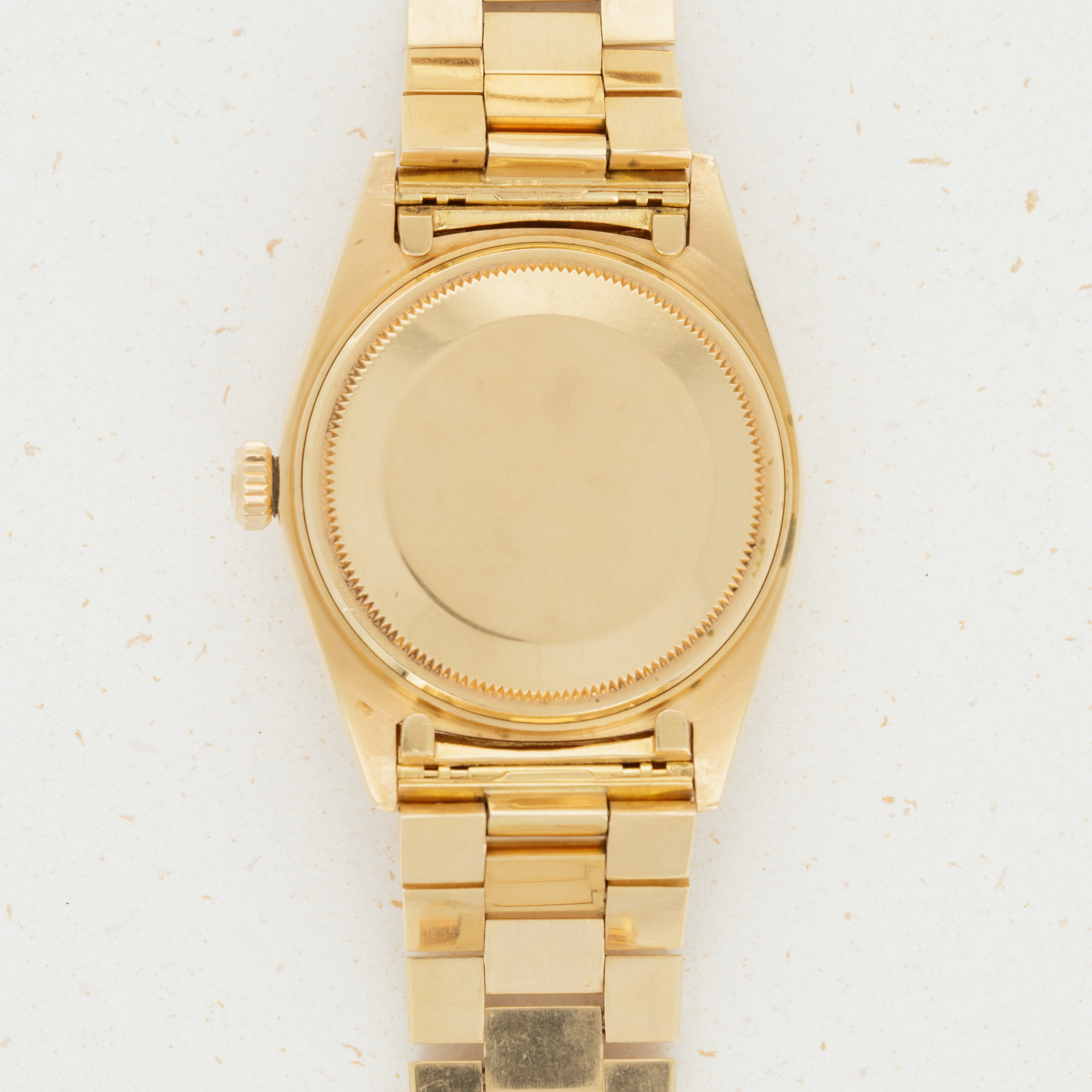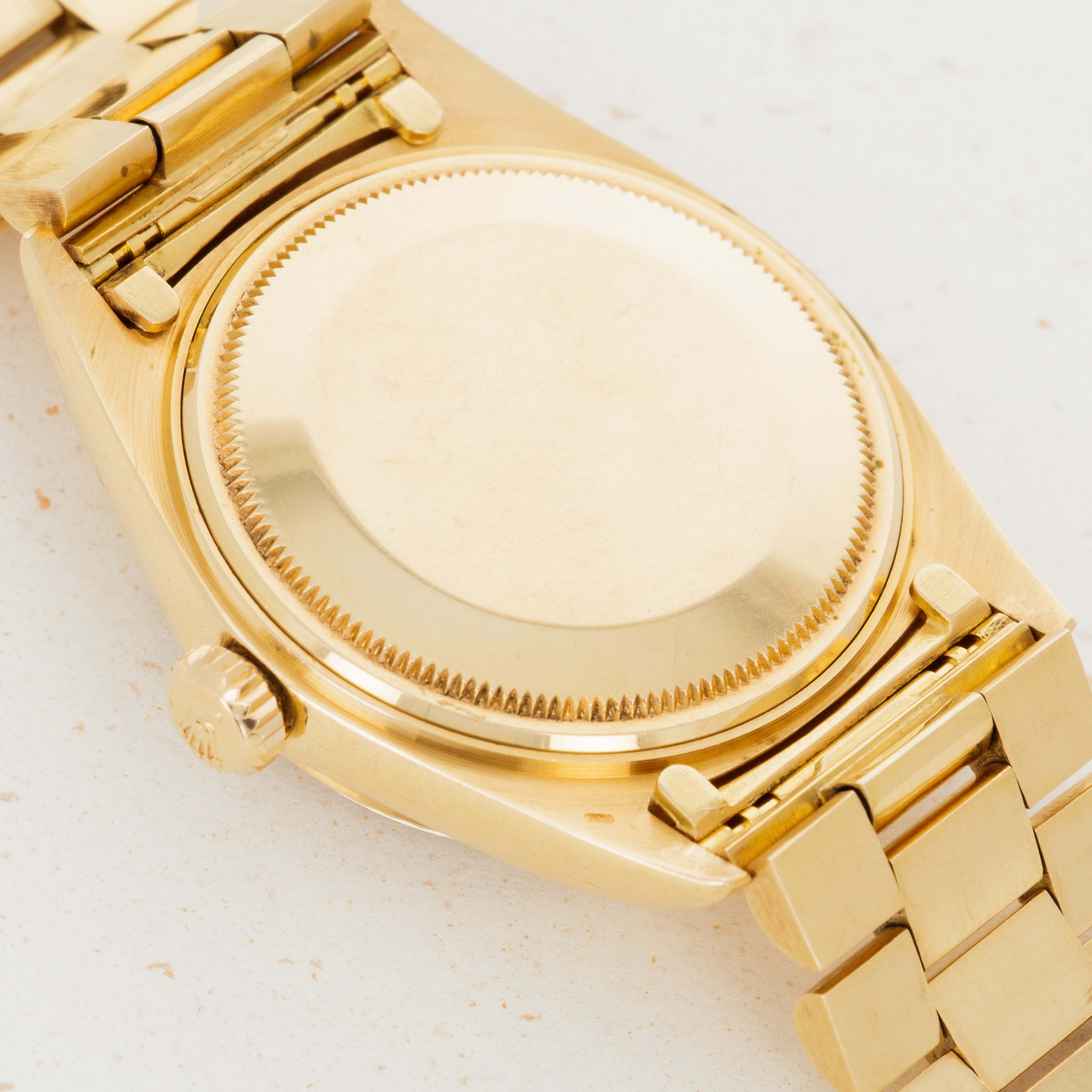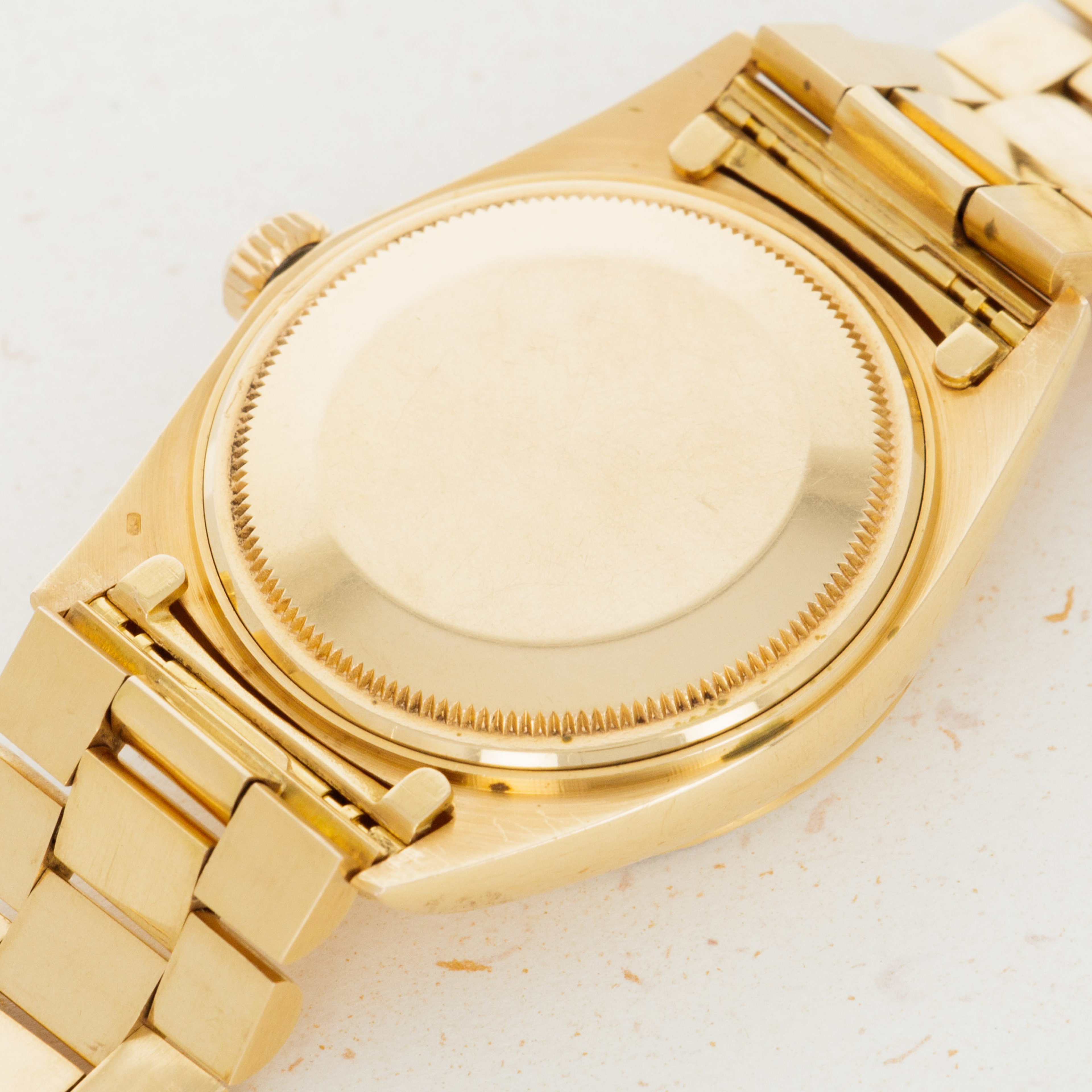 The overall condition of the watch is very good. Pink colored dial is in excellent condition with creamy luminous and matching hands. Case and bracelet have minor surface abrasions throughout. Bracelet has a total of 19 links. There is moderate stretch consistent with average use. Band is signed GF with a Rolex clasp, and dated 1968. South American market pink gold bands were all signed GF, but they are otherwise exactly the same as their Rolex signed counterparts. The watch has a Spanish date wheel, supporting the fact that it was likely first sold in South America.