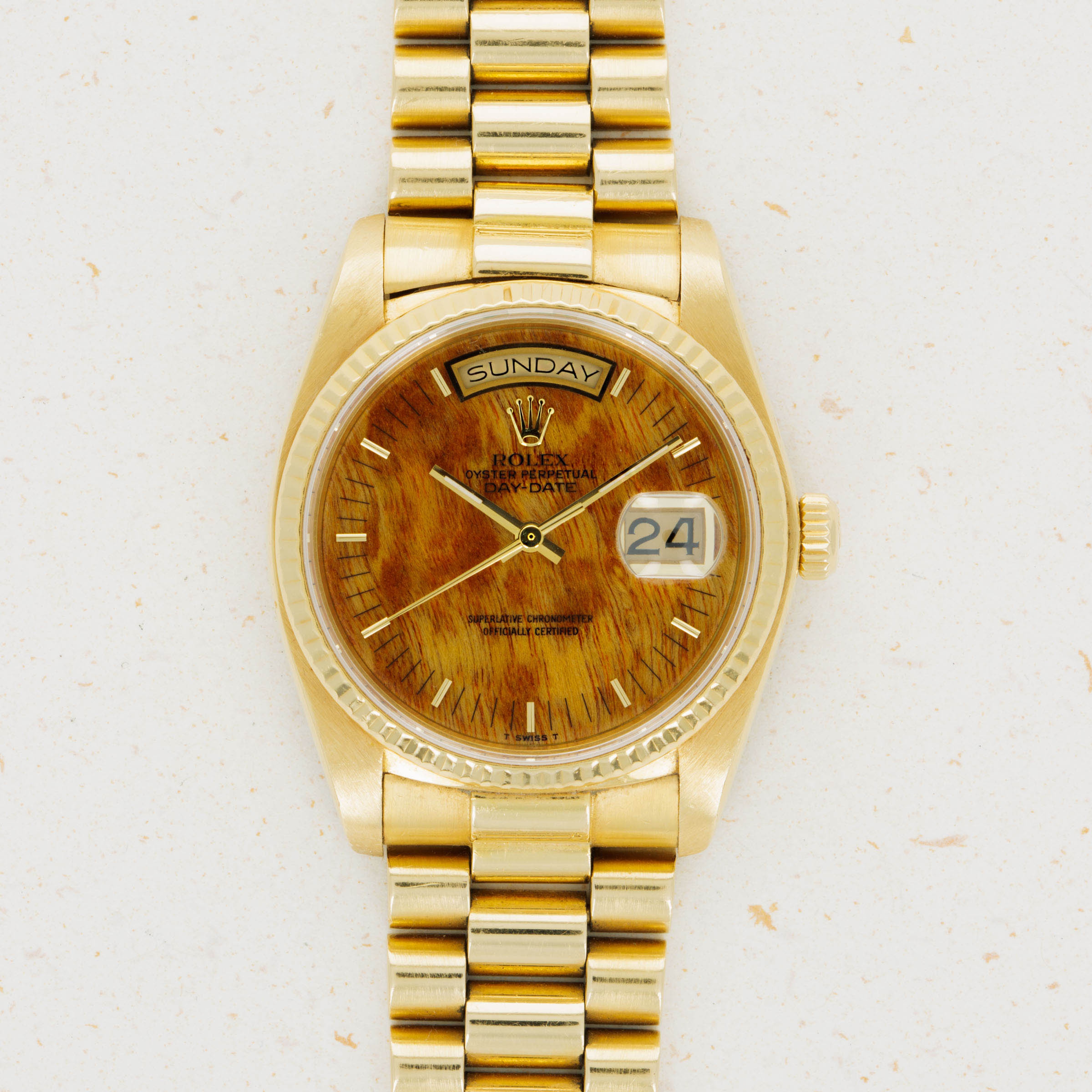 Offered with an extensive service record and an utterly stunning birch dial this example's utterly unique aesthetic sets it apart from a normal watch, which has been the essence of the Day-Date since its launch in 1956.