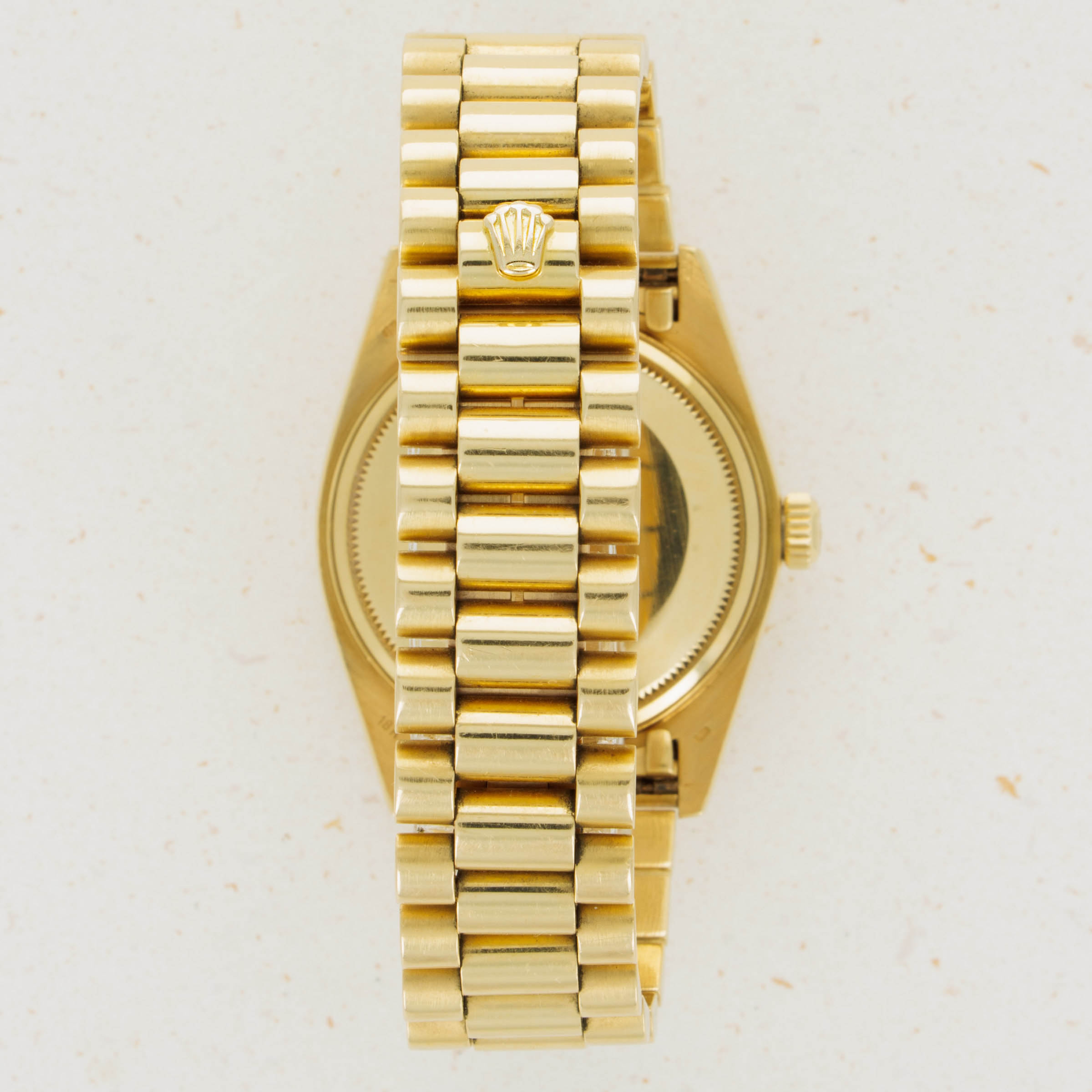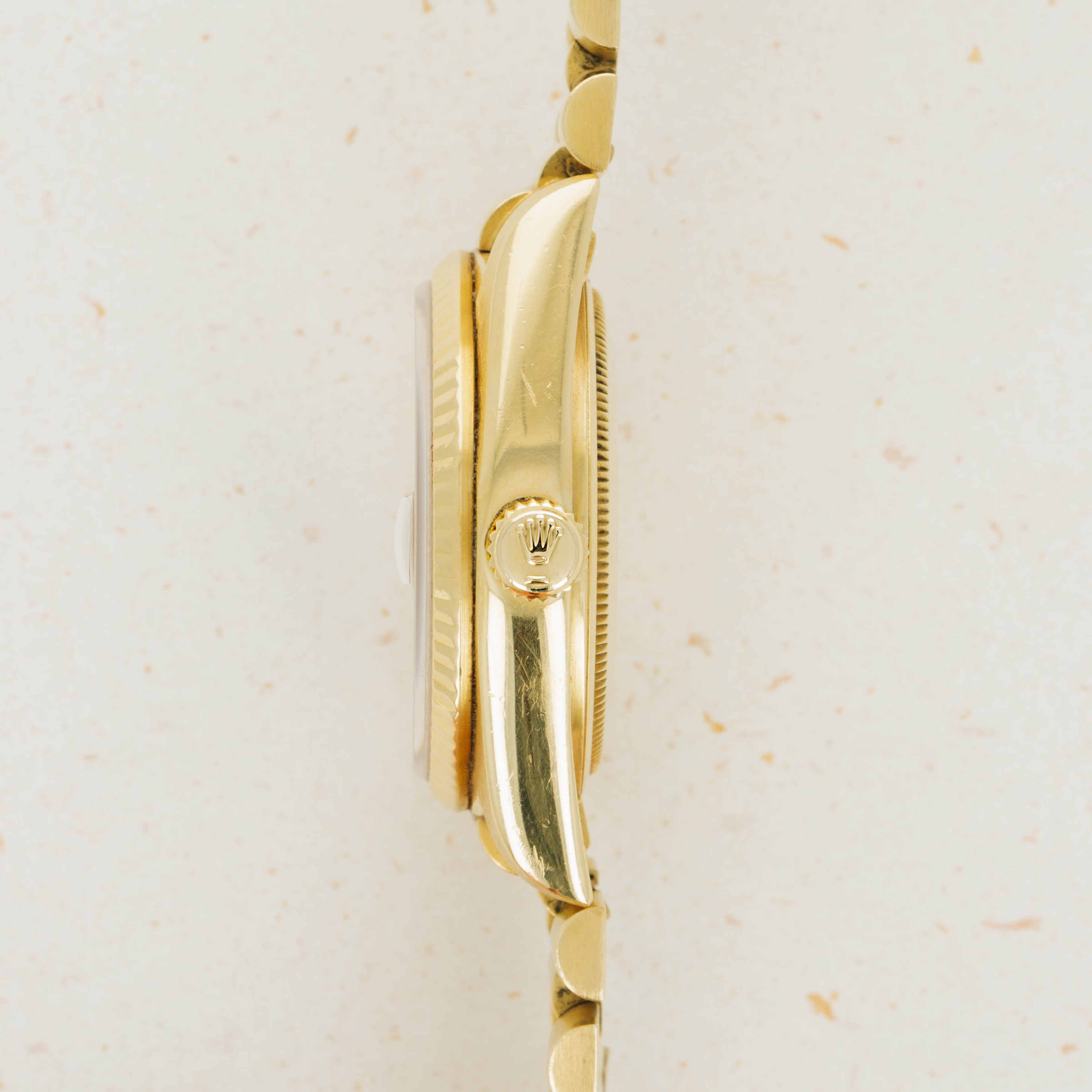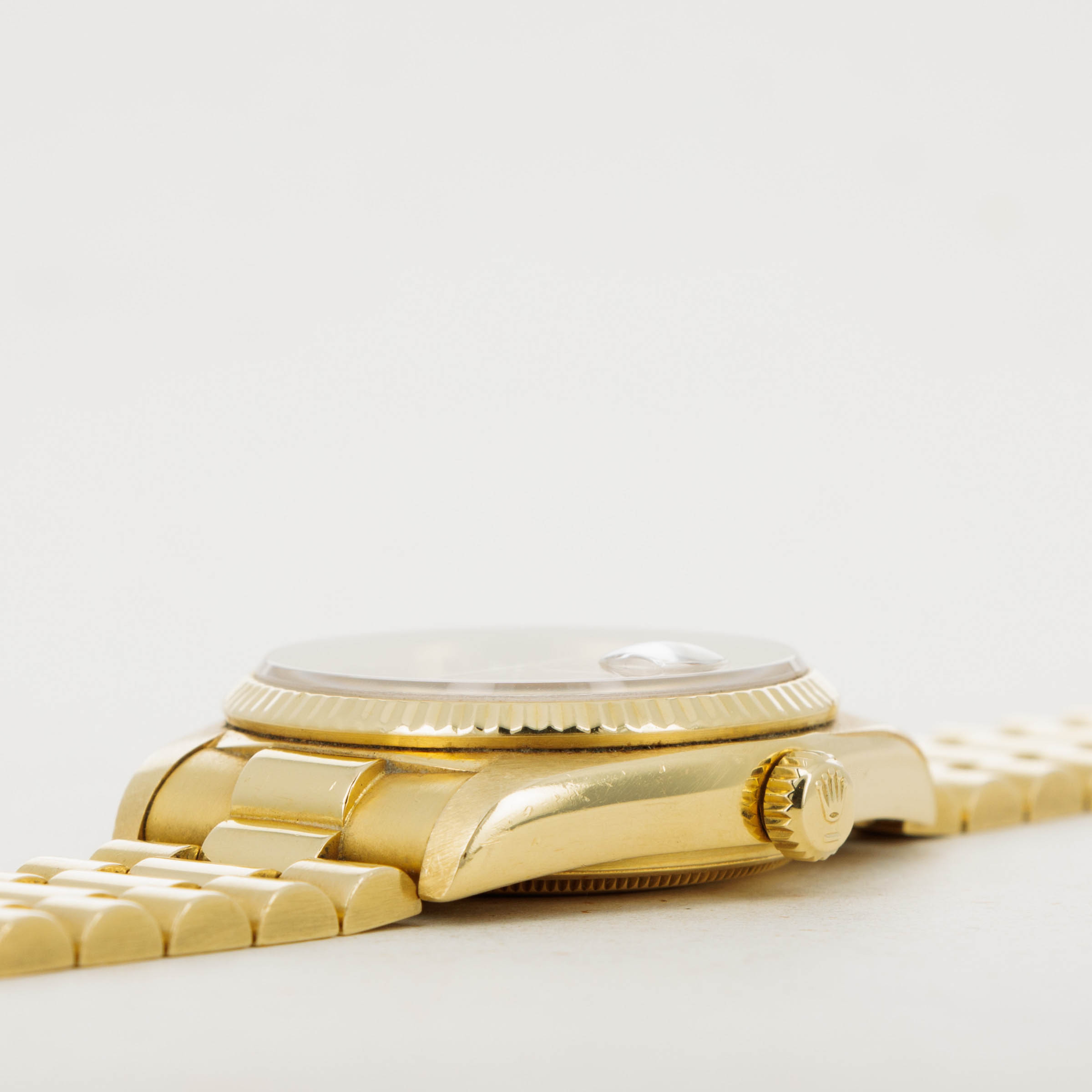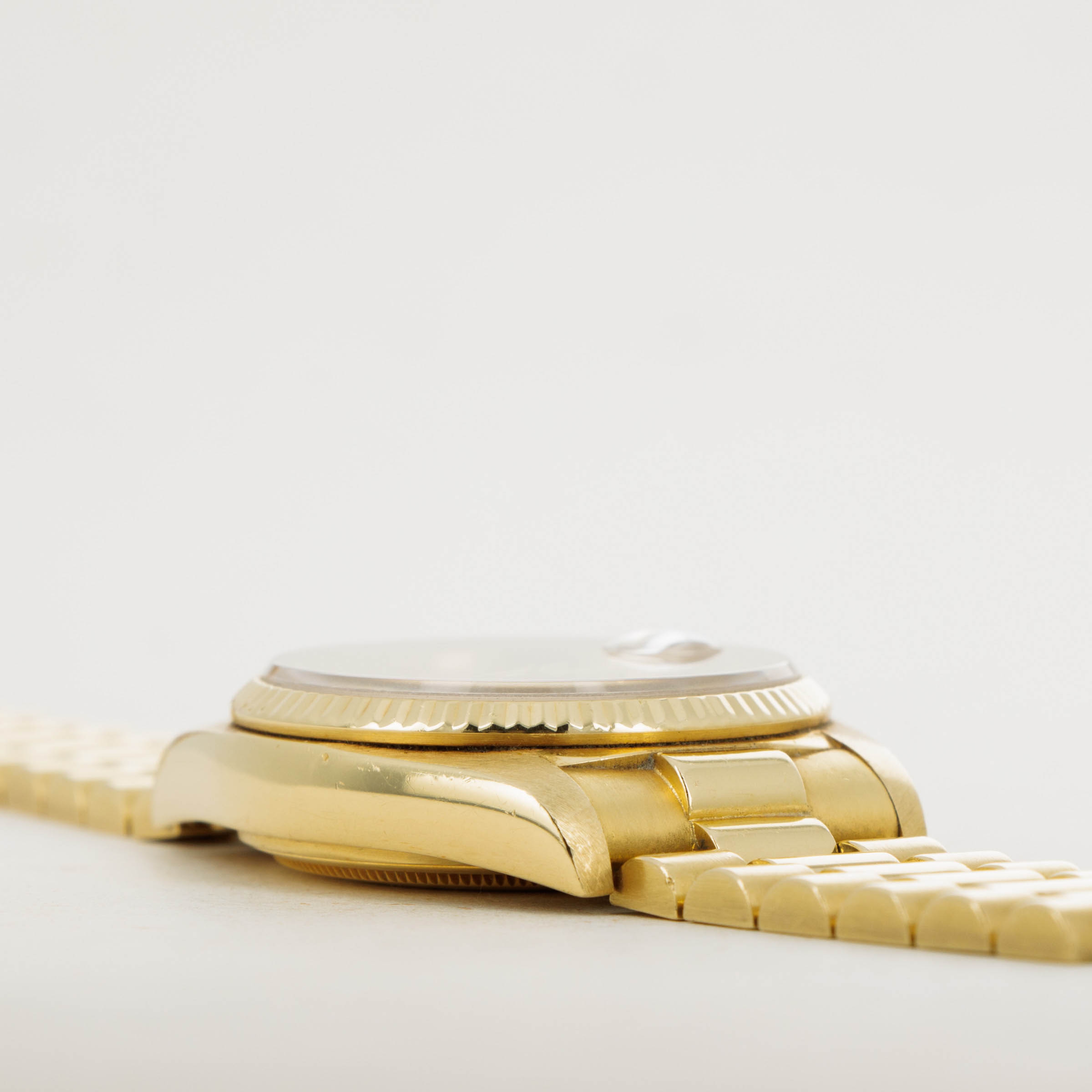 Utterly classical in its design, the Day-Date's 18k yellow gold construction is iconic with its Presidential bracelet and fluted bezel. However, this example's