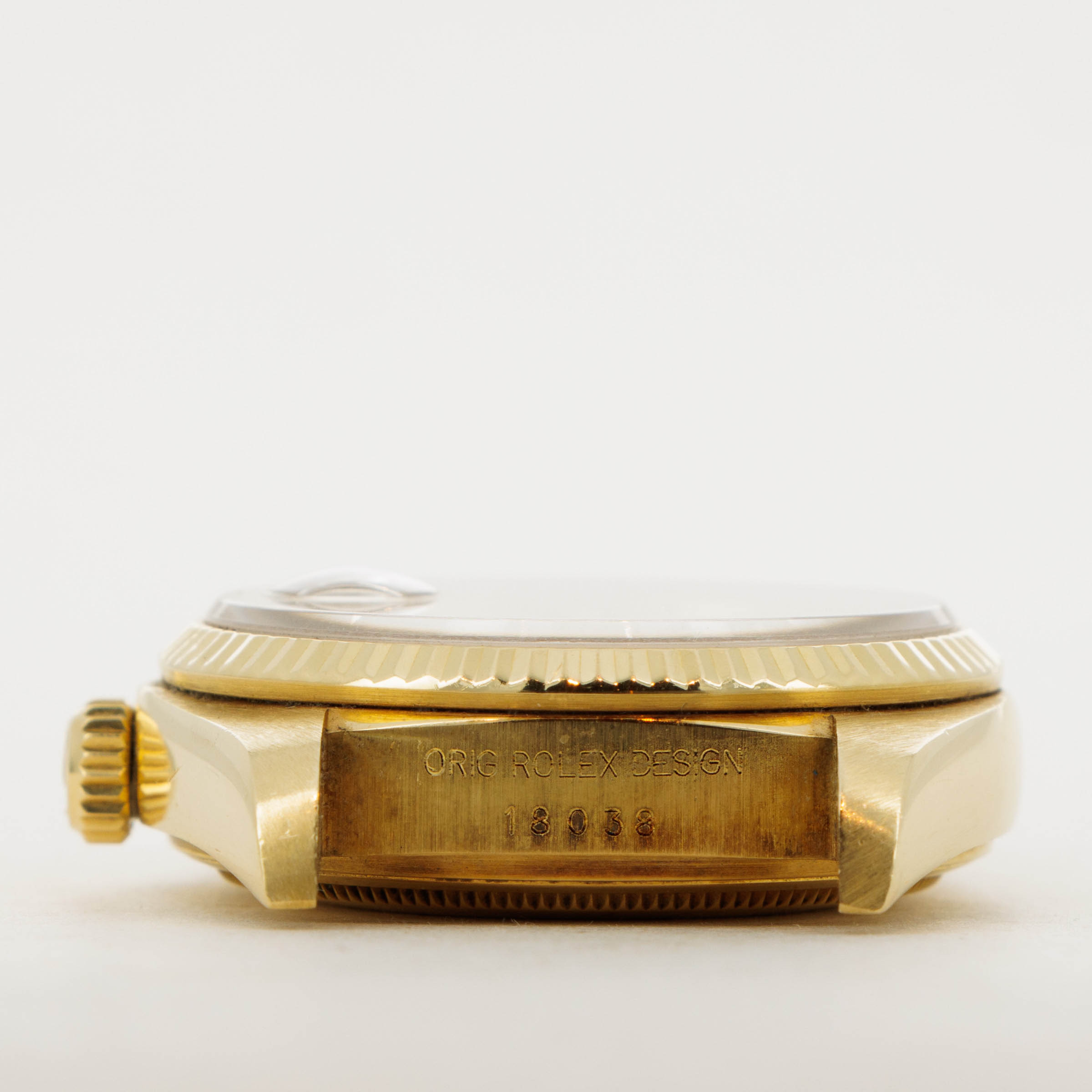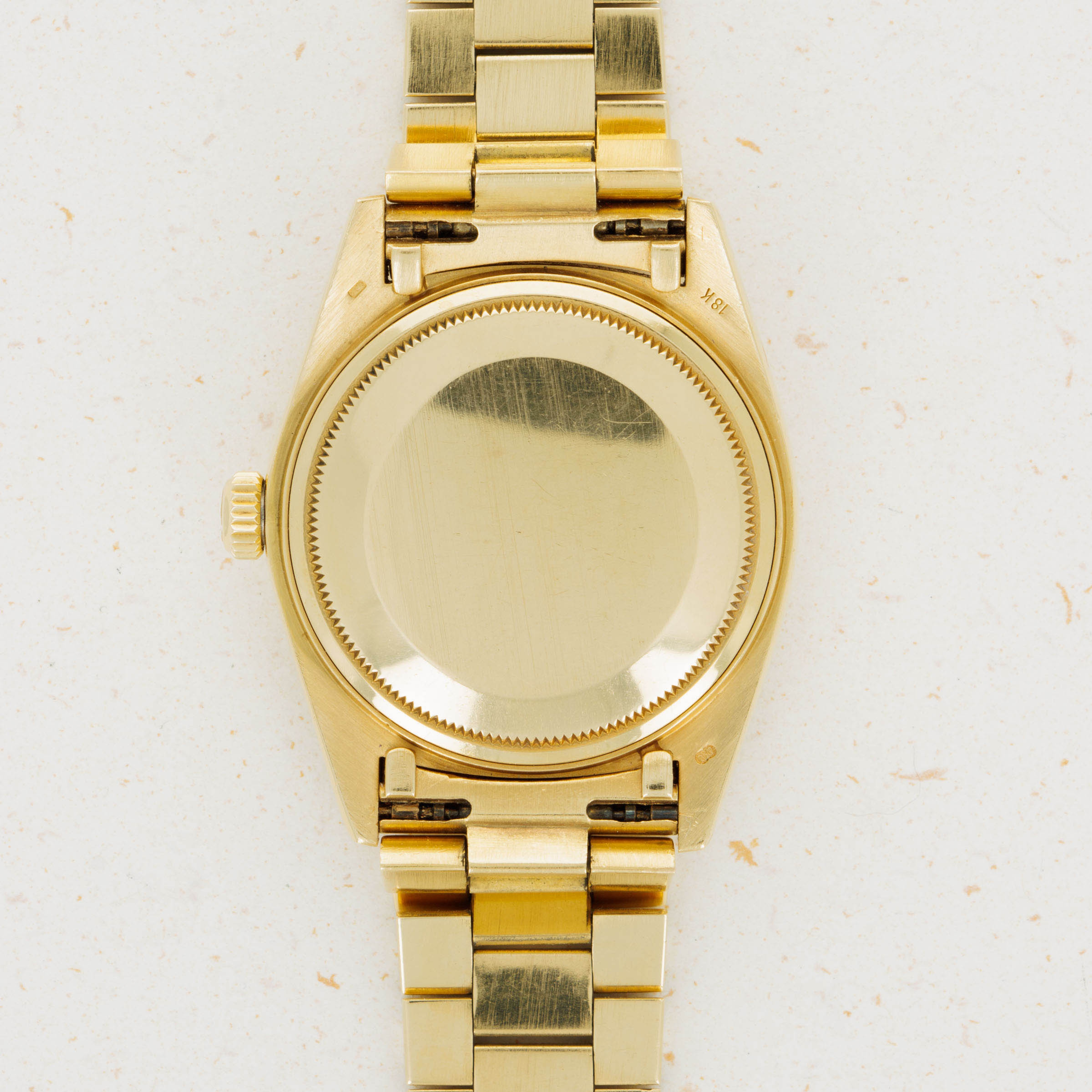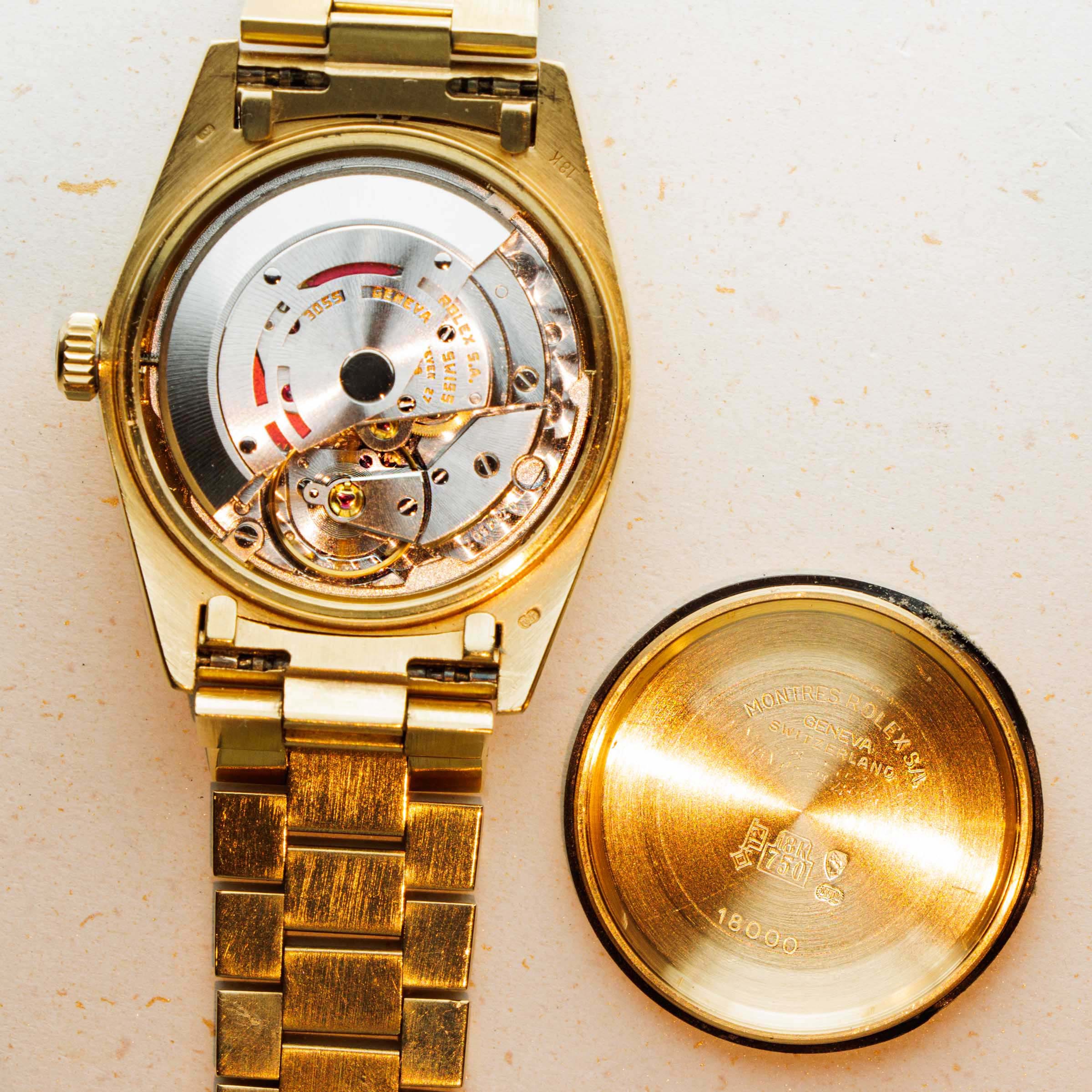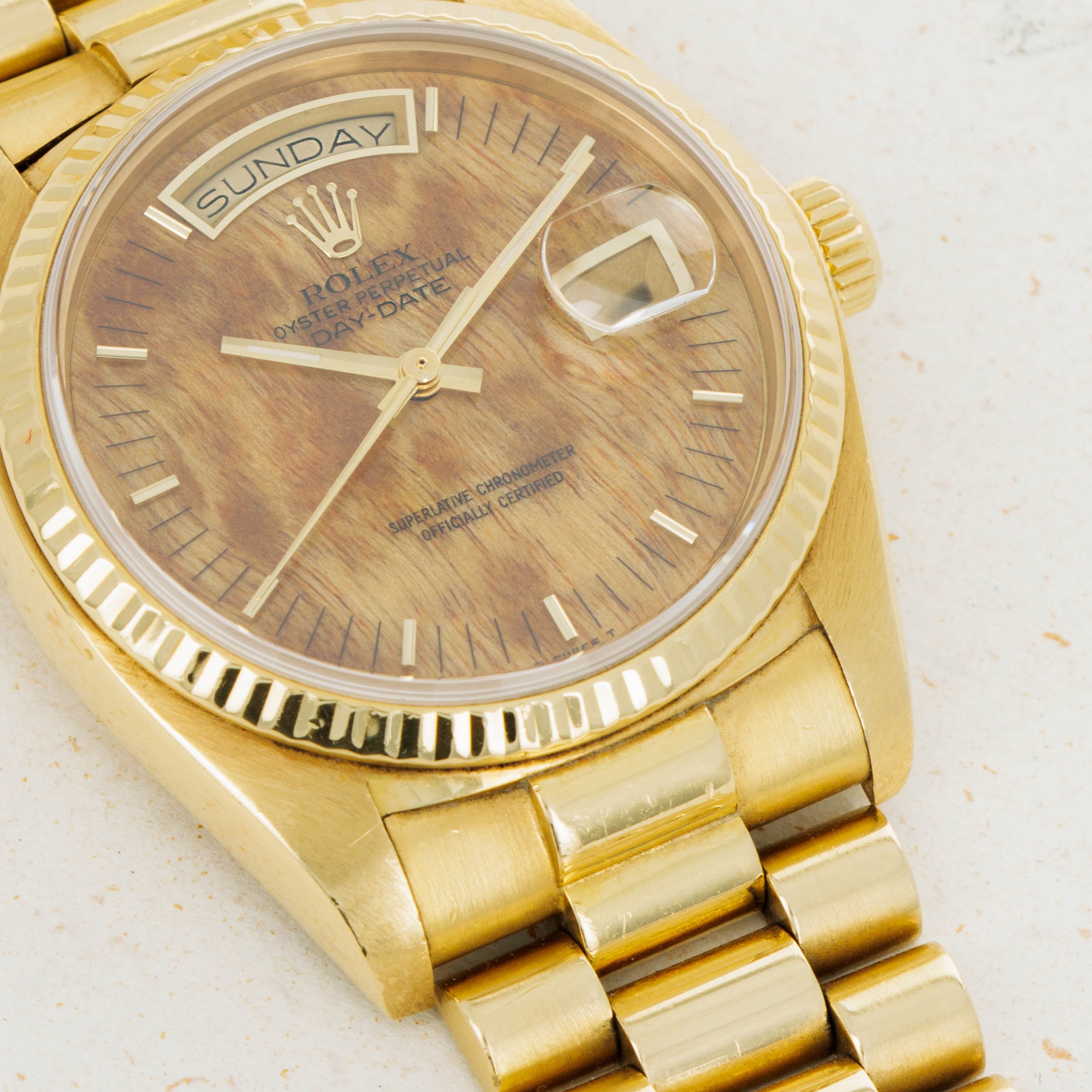 Utterly classical in its design, the Day-Date's 18k yellow gold construction is iconic with its Presidential bracelet and fluted bezel. However, this example's