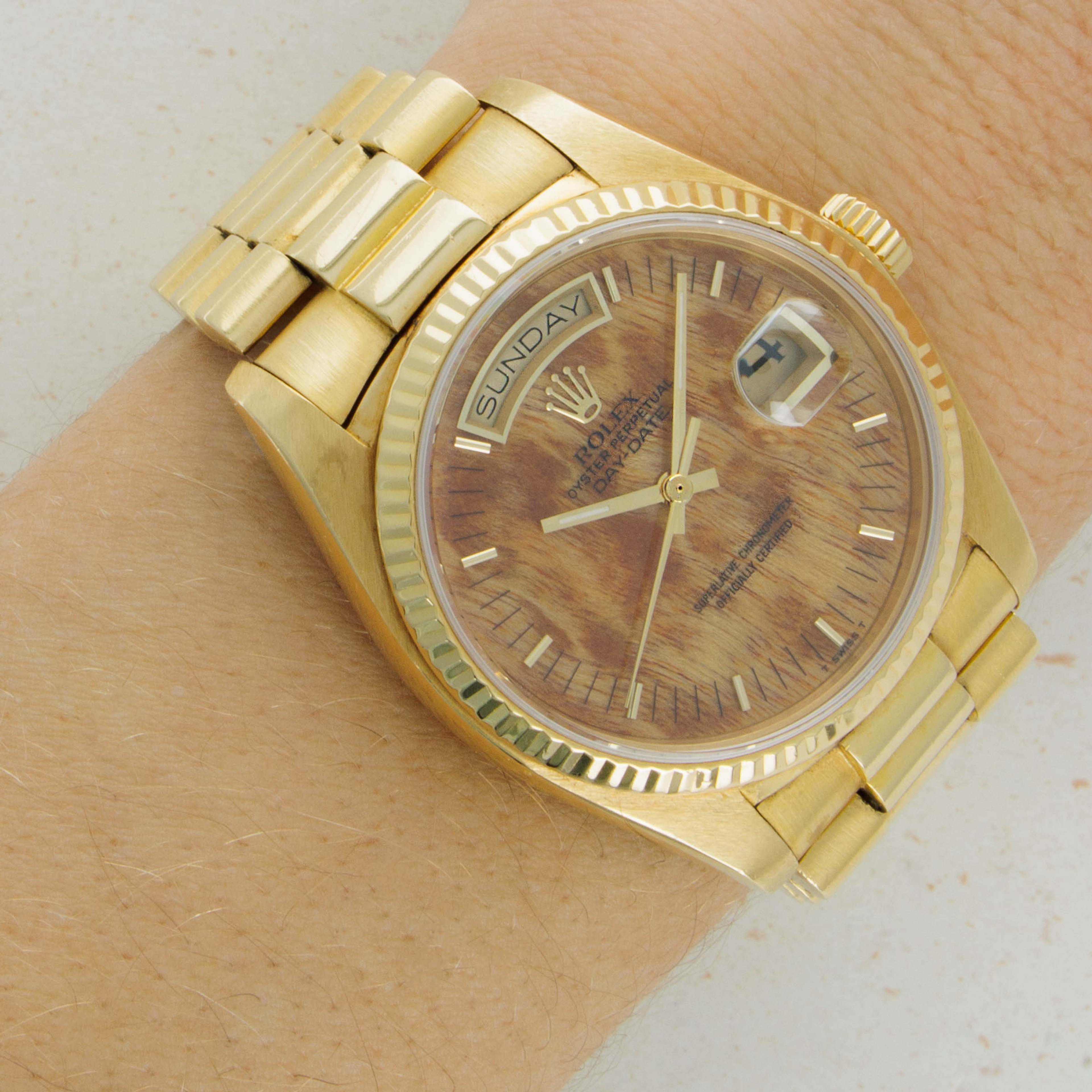 pièce de résistance is its burl dial, which provides it with a unique aesthetic that no other Day-Date dial can achieve.