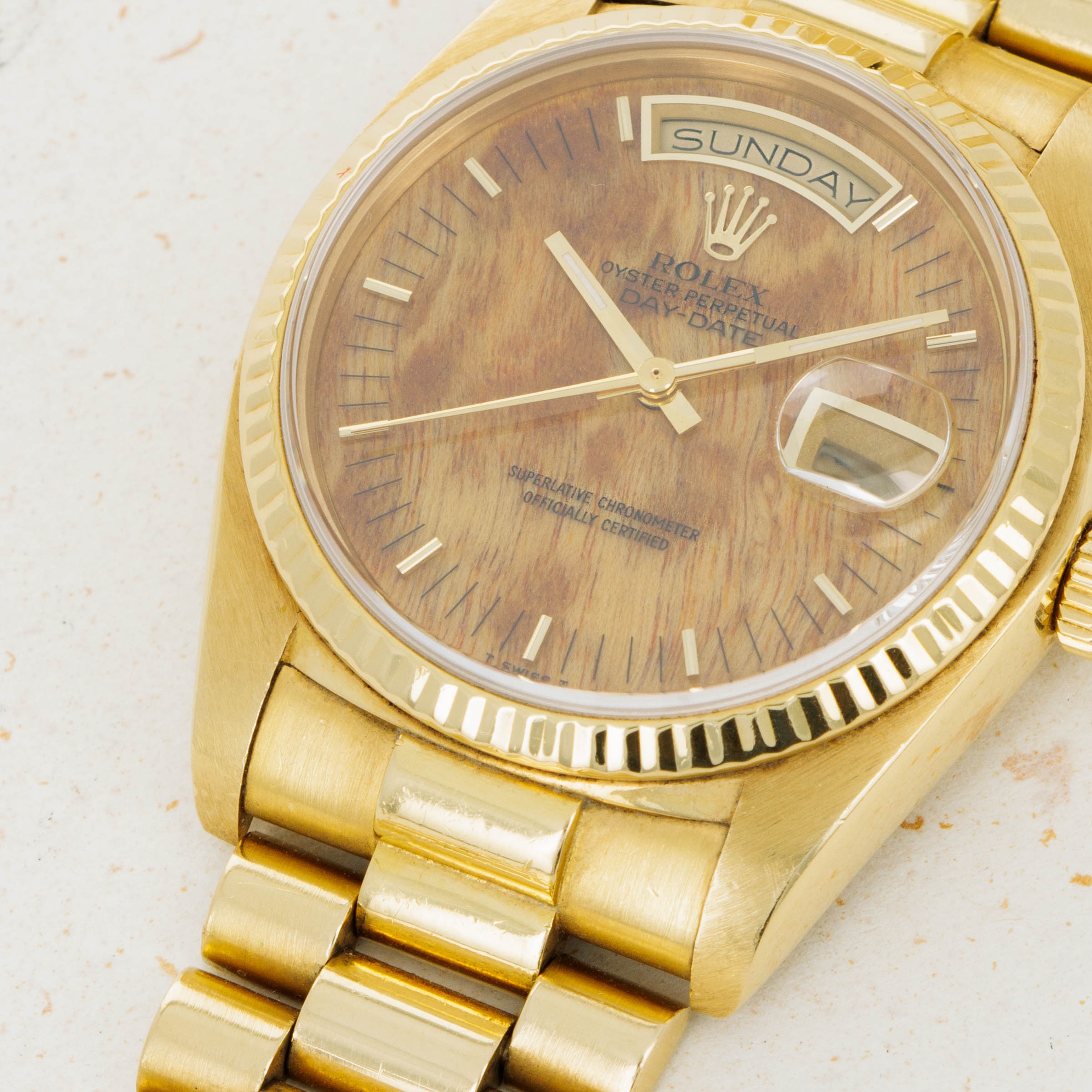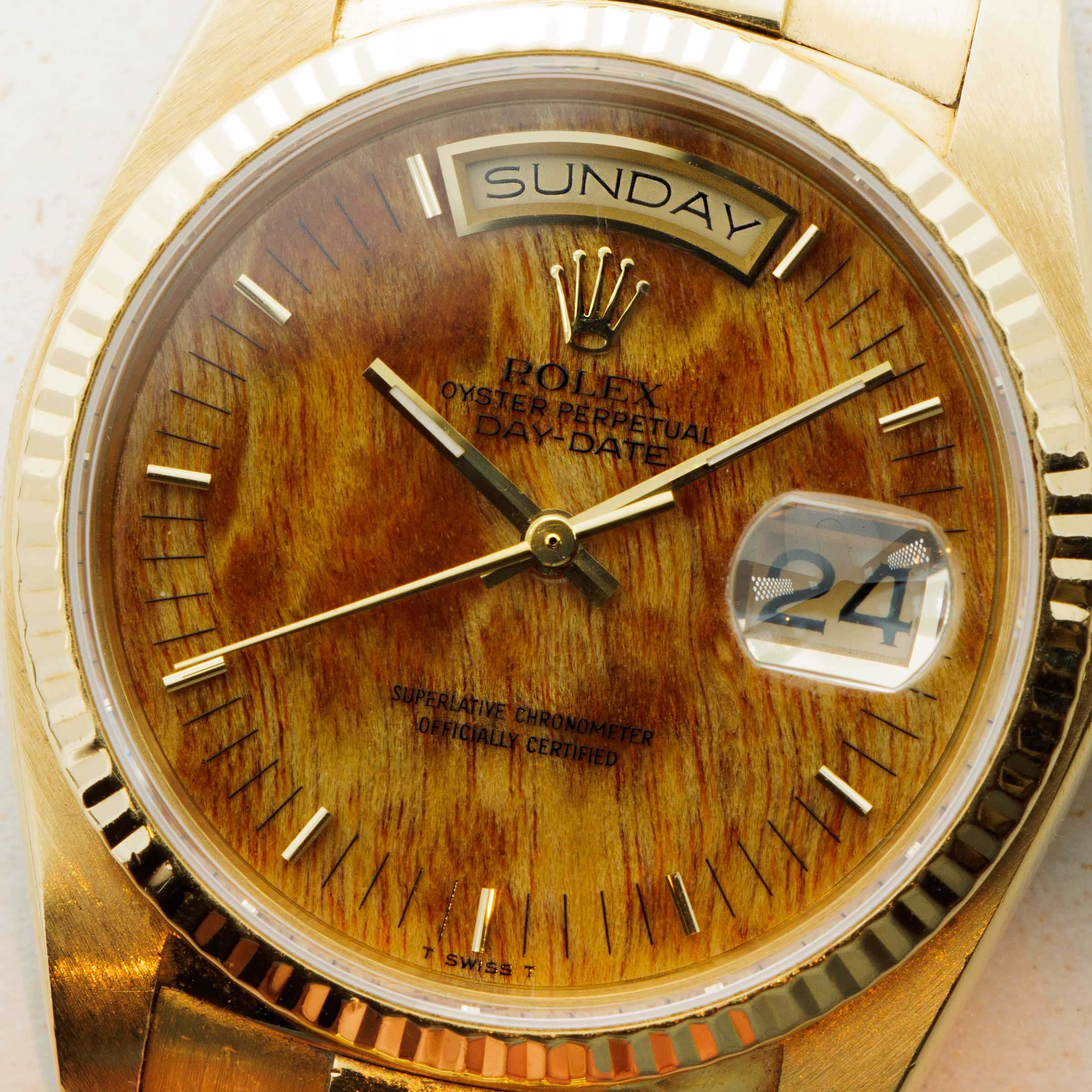 Fashioned from a polished piece of birch wood, this ref. 18038's dial sports a swirling pattern thanks to a naturally occurring deformity that impacted its growth, known as a burl. This pattern makes for a wonderfully unique and luxurious backdrop for the ref. 18038's handset and indices and makes each example unique.