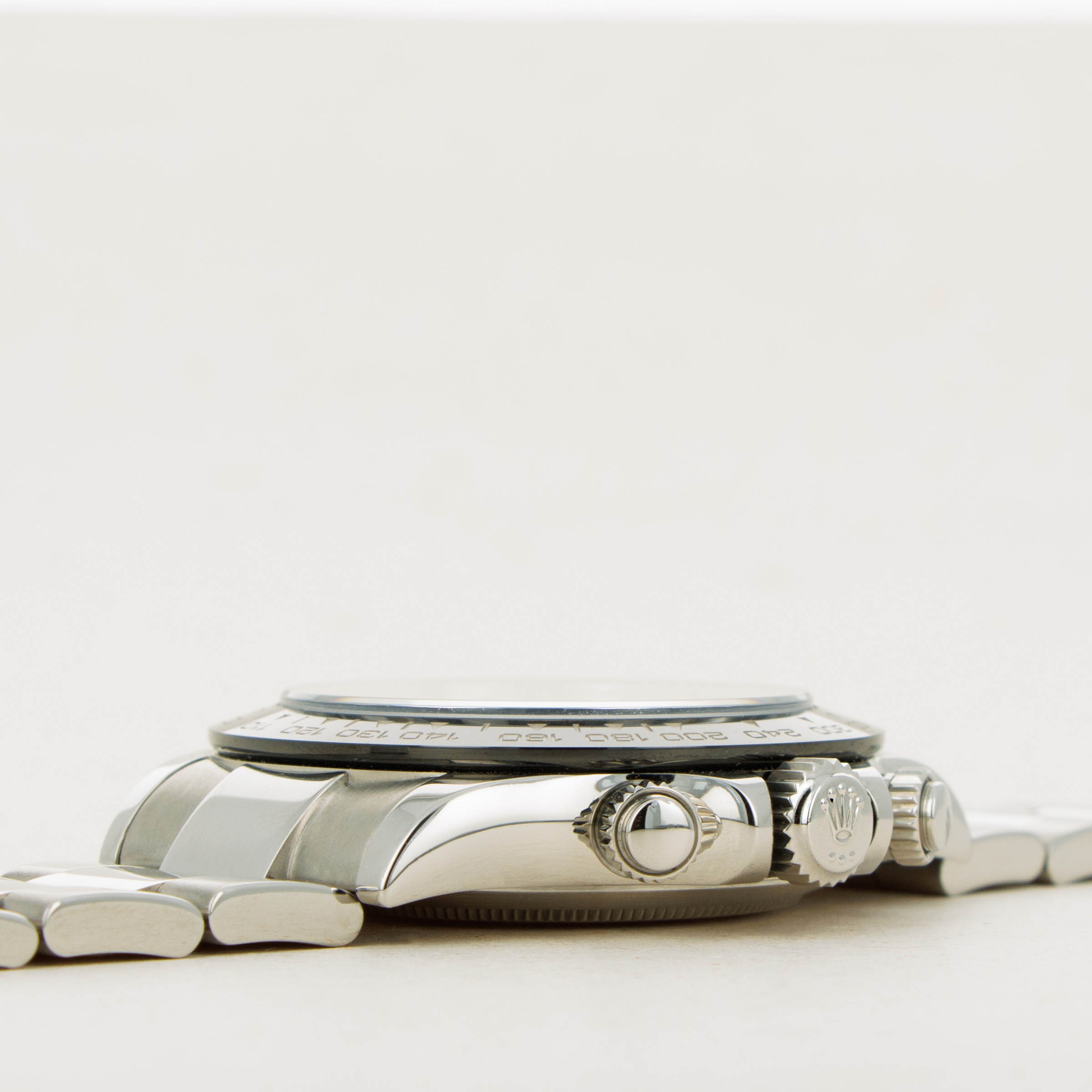 Amongst some of the most recognisable dials in watchmaking, this Daytona sports a jet black dial with silver subdial chapter rings that combine to match its black Cerachrom bezel and stainless steel construction.