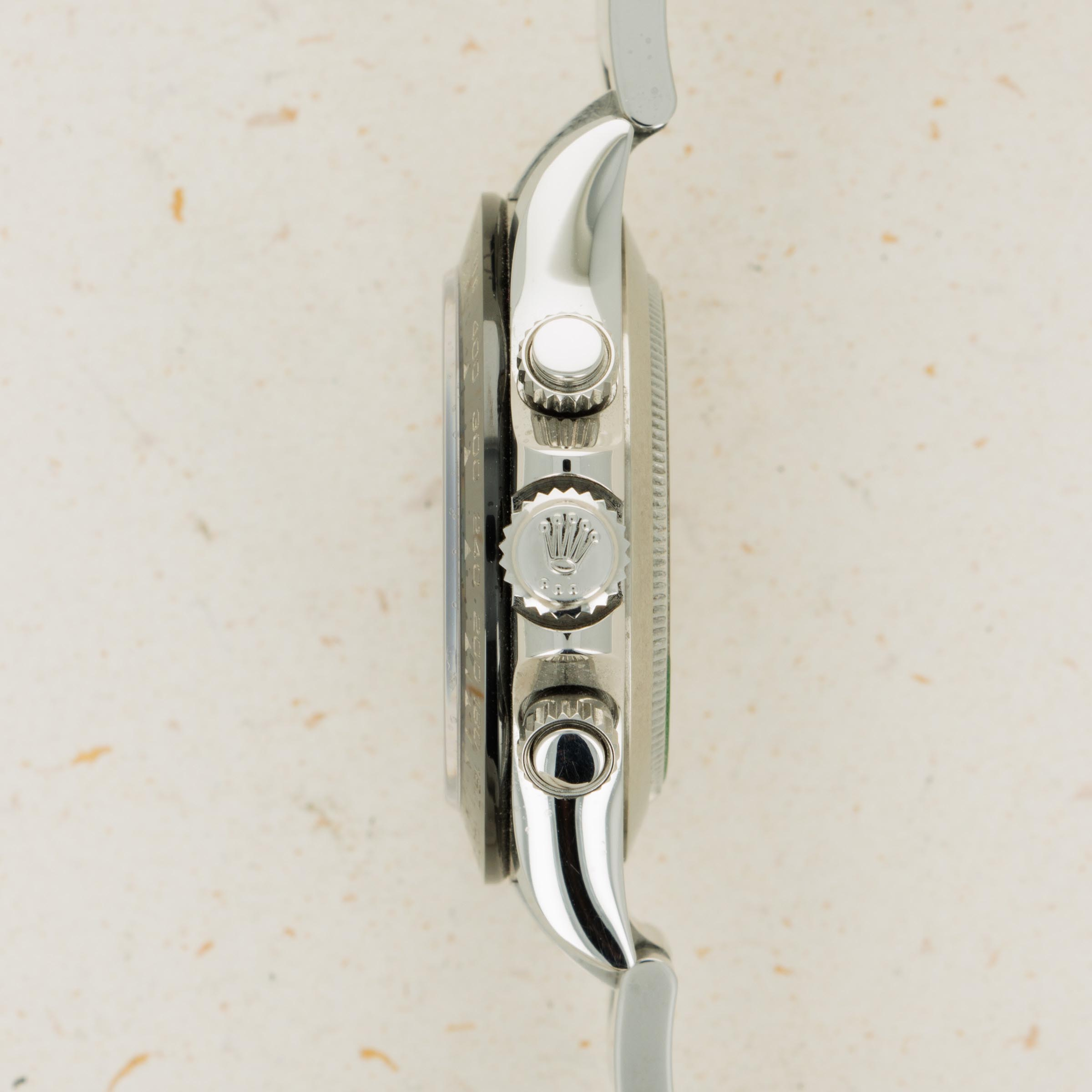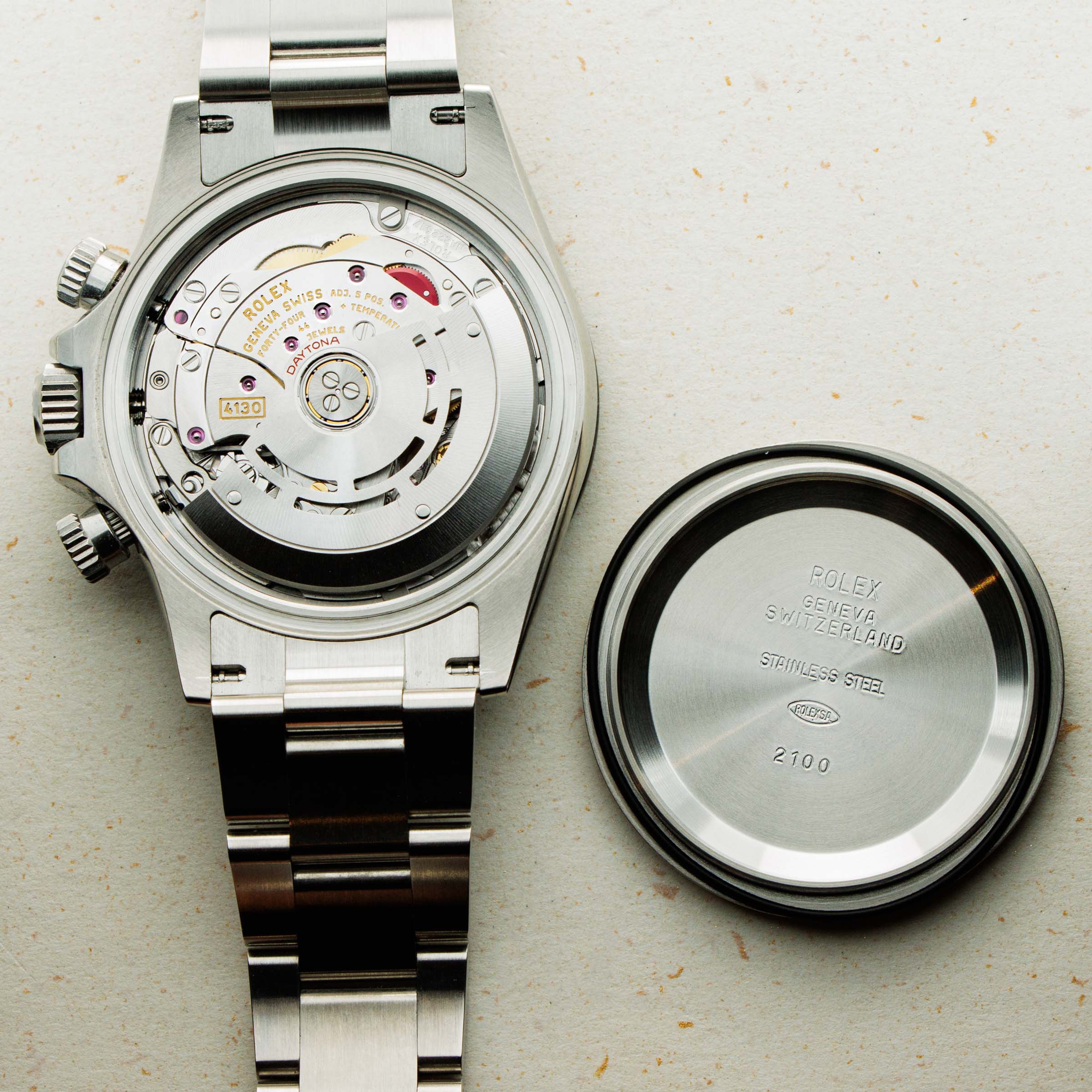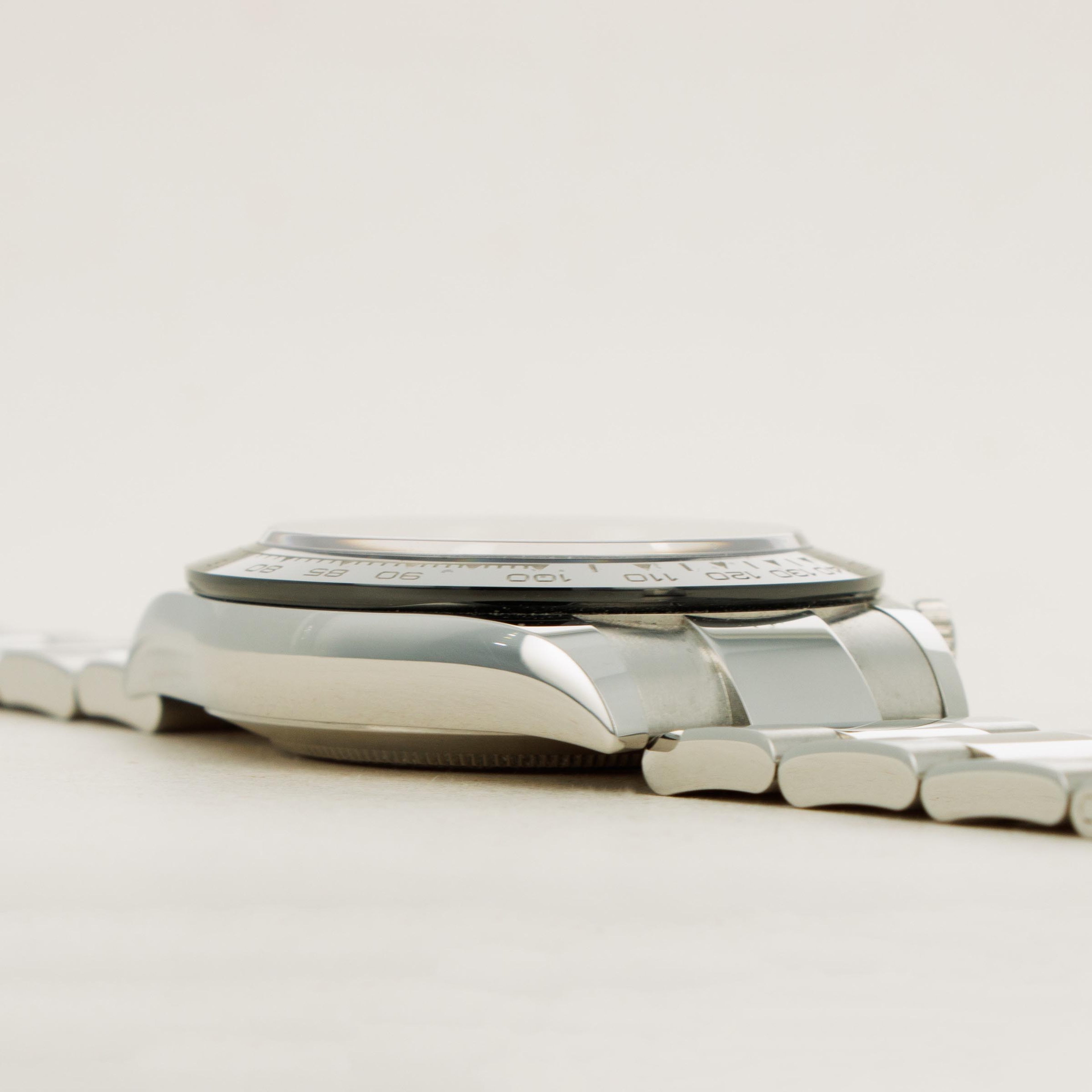 Released in 2000 as a brand new generation of Daytona, Rolex made several subtle changes to the previous “Zenith” Daytona. To begin with, the dial layout had changed slightly, with the running seconds subdial moving from 9 o'clock to 6' clock. Additionally, the subdials were no longer in line with the center of the dial. Instead, they moved up slightly above the middle of the dial (running from 9 to 3 o'clock). Additionally, Rolex gave the new Daytona broader indices to accommodate more lume, longer lugs, and a mirror finish on the case flanks to differentiate the latest generation even further. But, without doubt, the latest generation’s most significant upgrade was Rolex’s new (at the time) in-house automatic cal. 4130 chronograph movement. Designed to be ruthlessly efficient, it has just 201 parts - a 20% decrease on the previous movement, the cal. 4030, making for an even more reliable movement requiring even less servicing. Additionally, with more space free to accommodate a larger mainspring, Rolex increased the cal. 4030's power reserve from 50 to 72 hours in the cal. 4130. All in all, even for a 20+ year old movement, the cal. 4130 is incredible even by today’s standards and fitting for the Daytona’s legendary legacy.