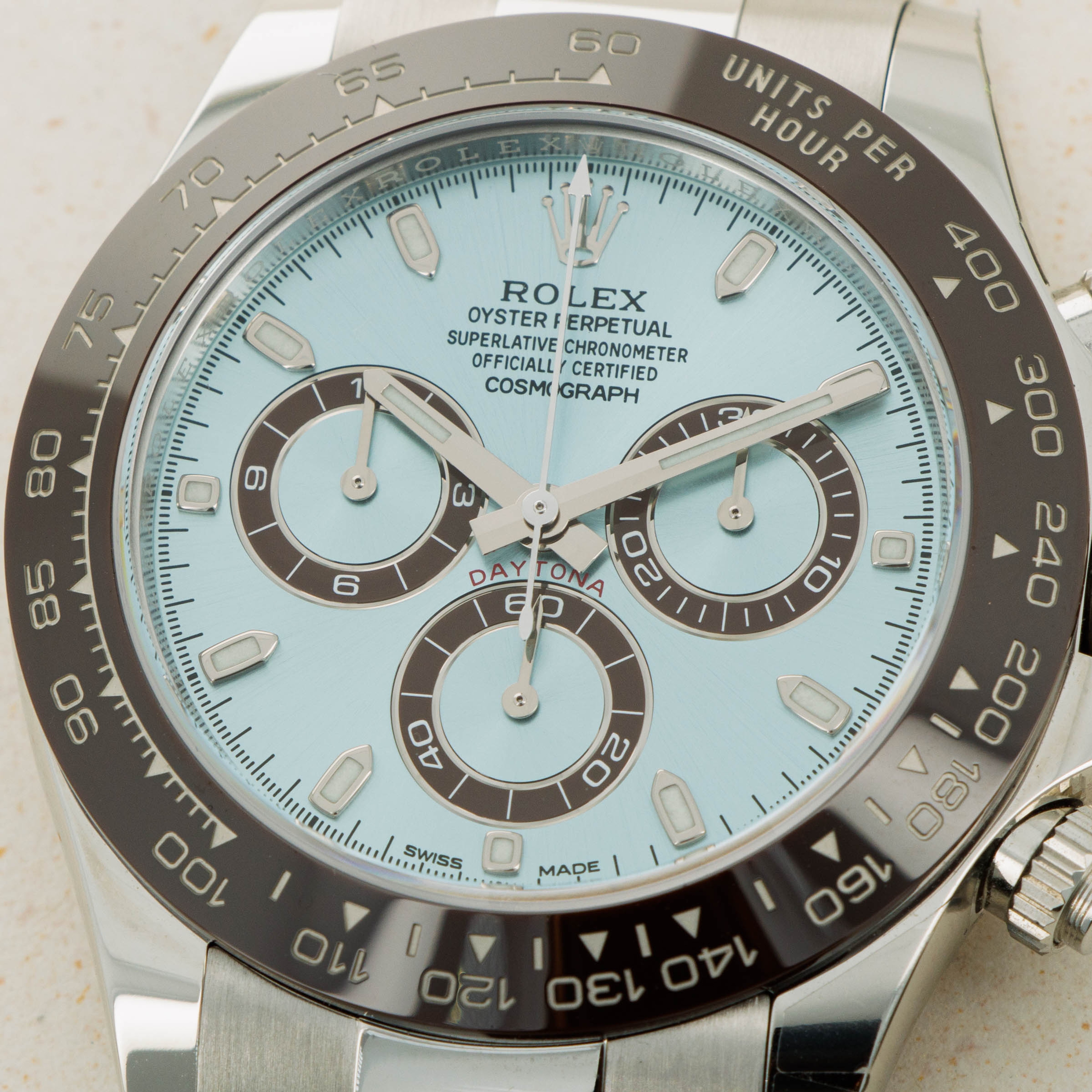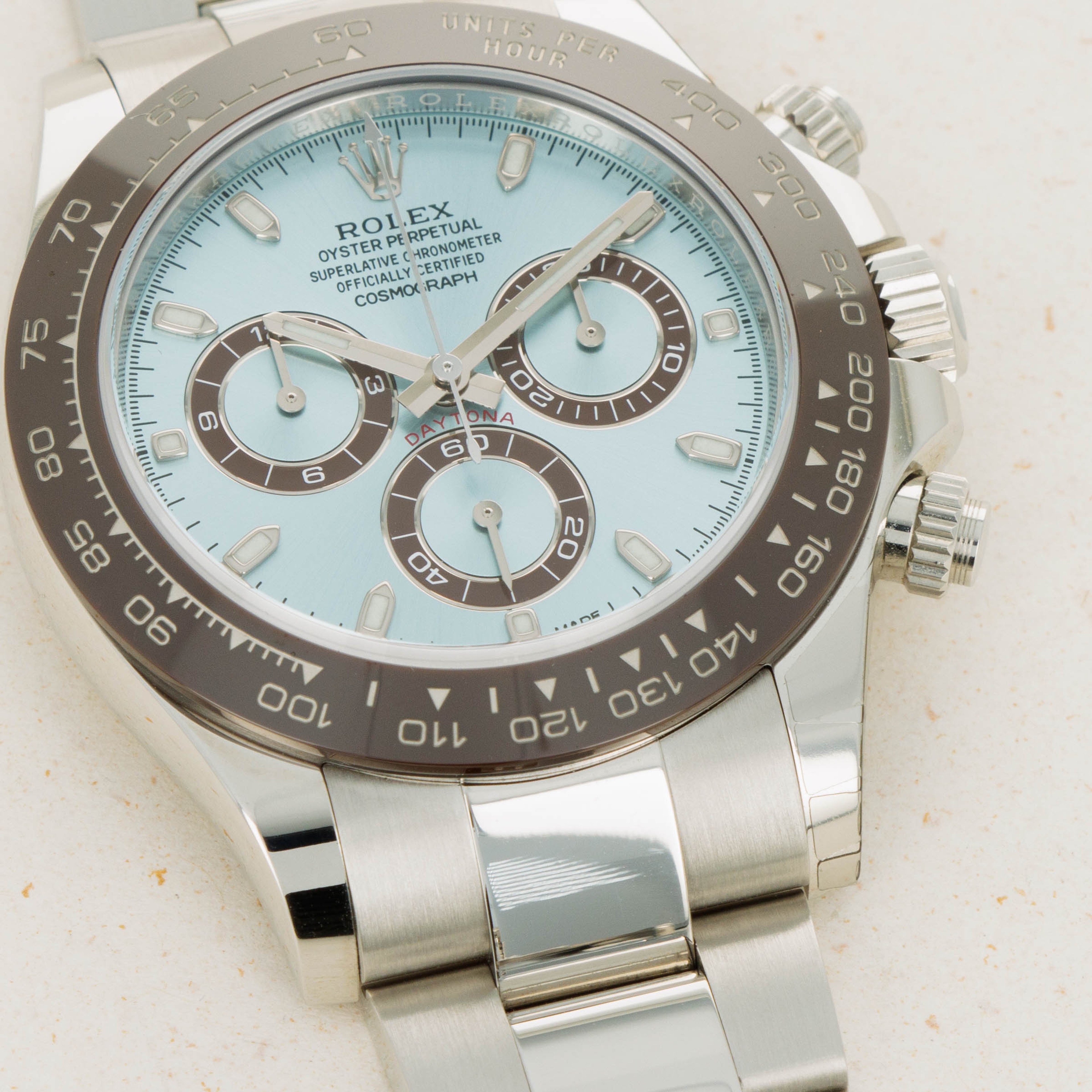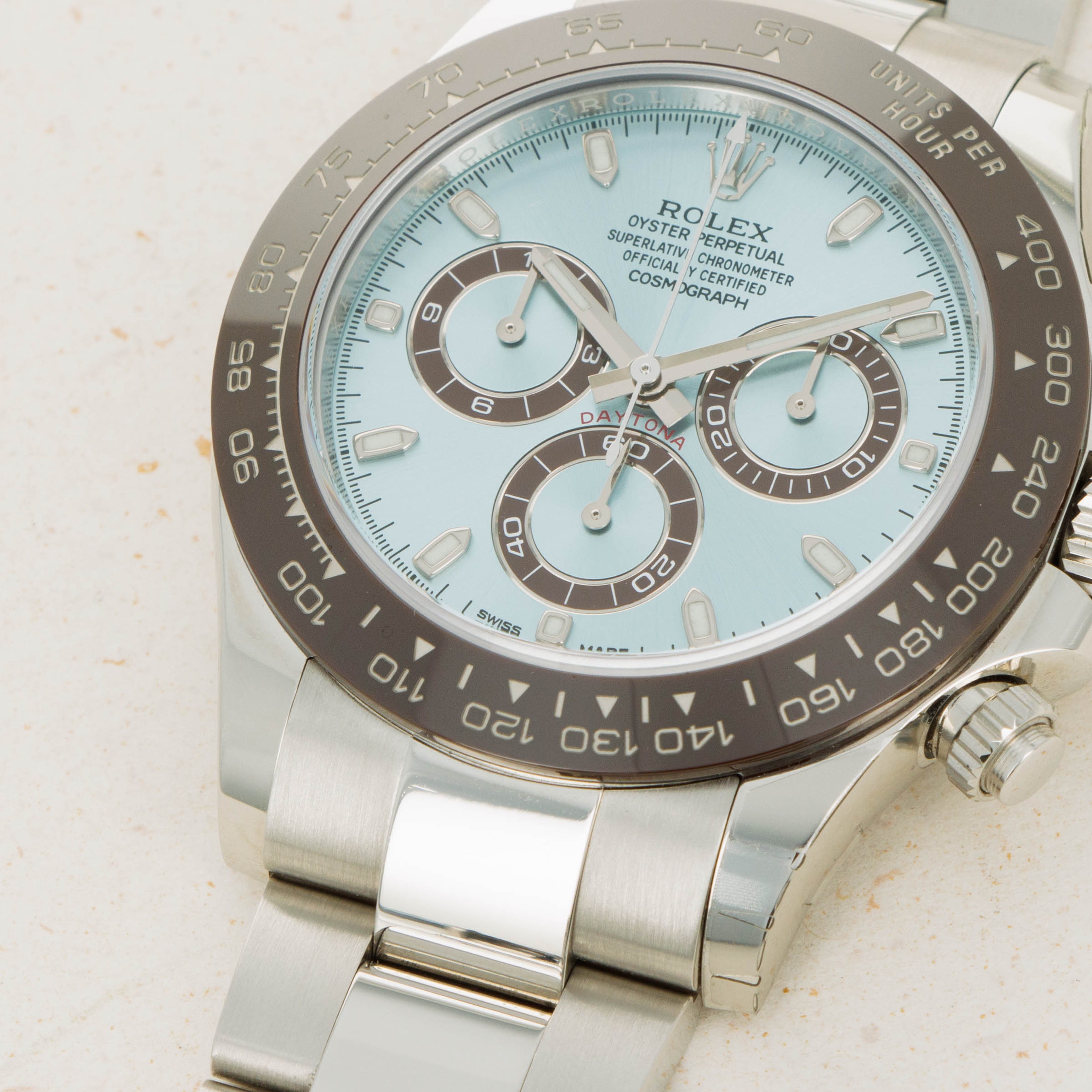 Ever since it was first launched in 1963, the Rolex Daytona has had an abundance of incredible variants join its ranks. From diamond-studded yellow gold vintage variants to modern stainless steel variants with ceramic bezels, the collection has seen it all. Perhaps one of the most luxurious of all of those is the ref. 116506 that we have here. Inarguably the most exclusive modern Daytona reference available, the Daytona ref. 116506 was released in 2013 to celebrate the Daytona's 50th anniversary. Offered as the first Daytona to ever be constructed of platinum, the Platona, as it has become known, also features a stunning brown ceramic bezel made of Rolex's patented Cerachrom, and Rolex's exclusive-to-platinum ice-blue dial with brown subdial chapter rings to match its brown ceramic bezel. With every other Daytona variant already as revered and collectable as they are, the ref. 116506 brings a whole new level of exclusivity to the coveted collection with its anniversary status, colorful design and truly exclusive nature ensuring the vast majority of Rolex's VIPs are vying to add this wonderful timepiece to their collection.