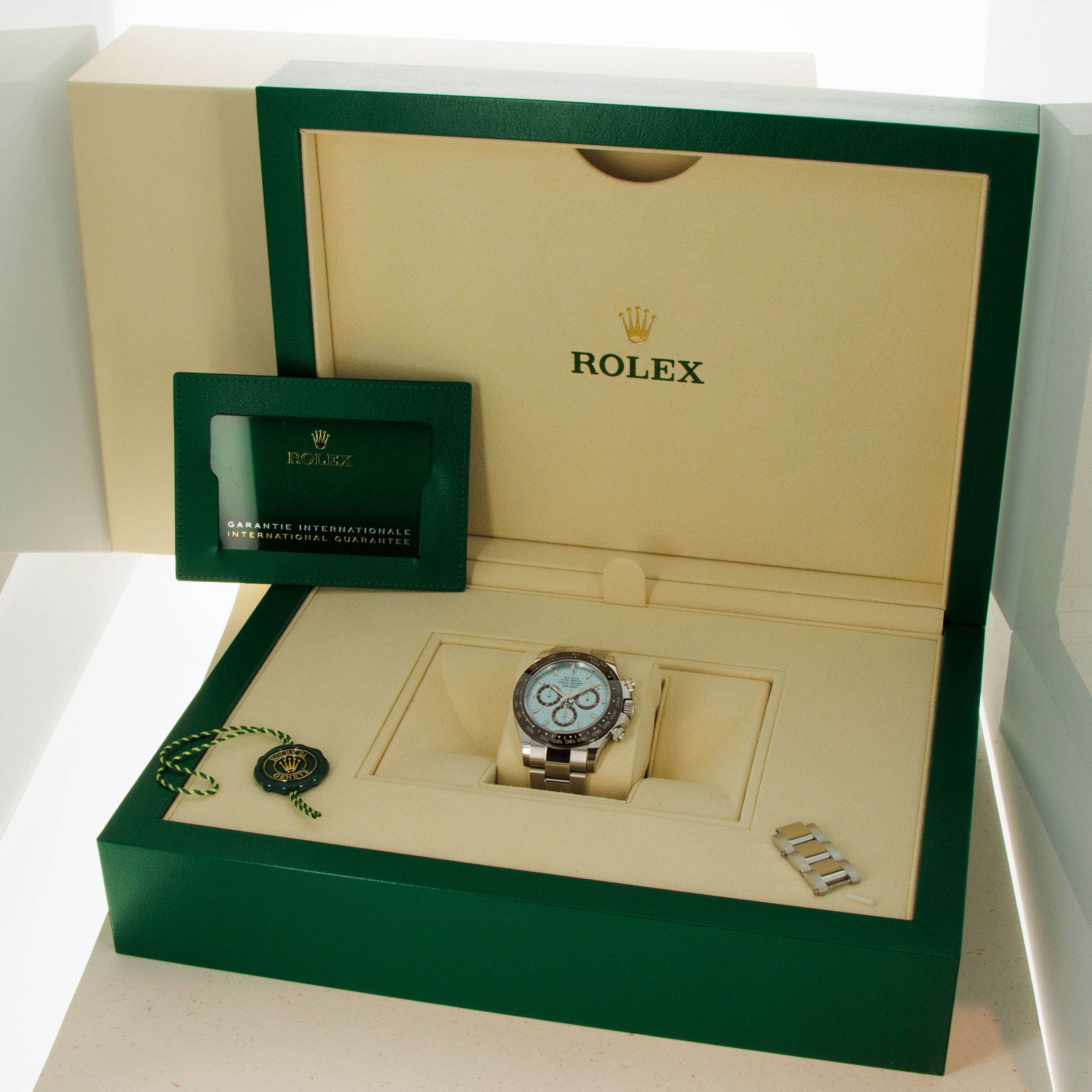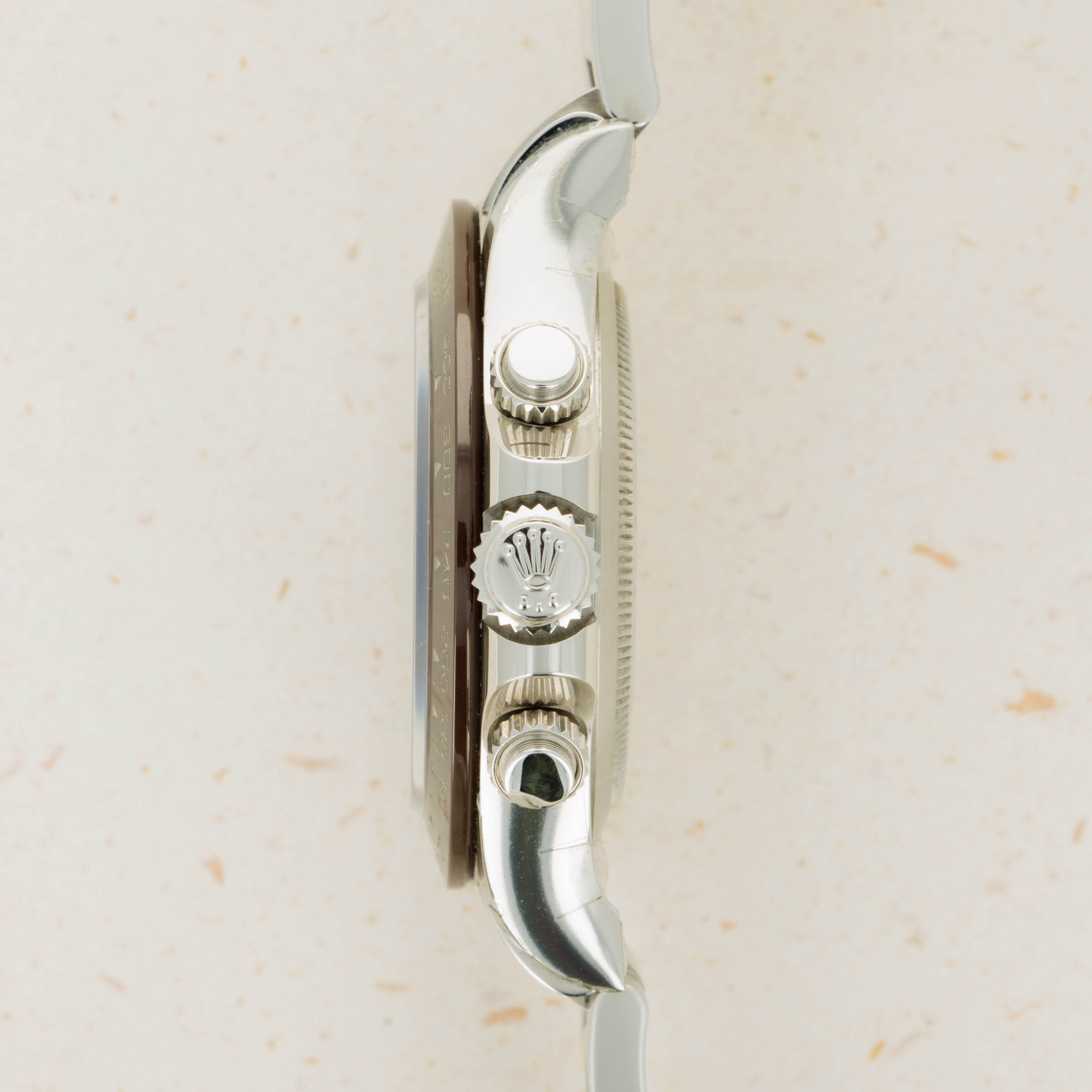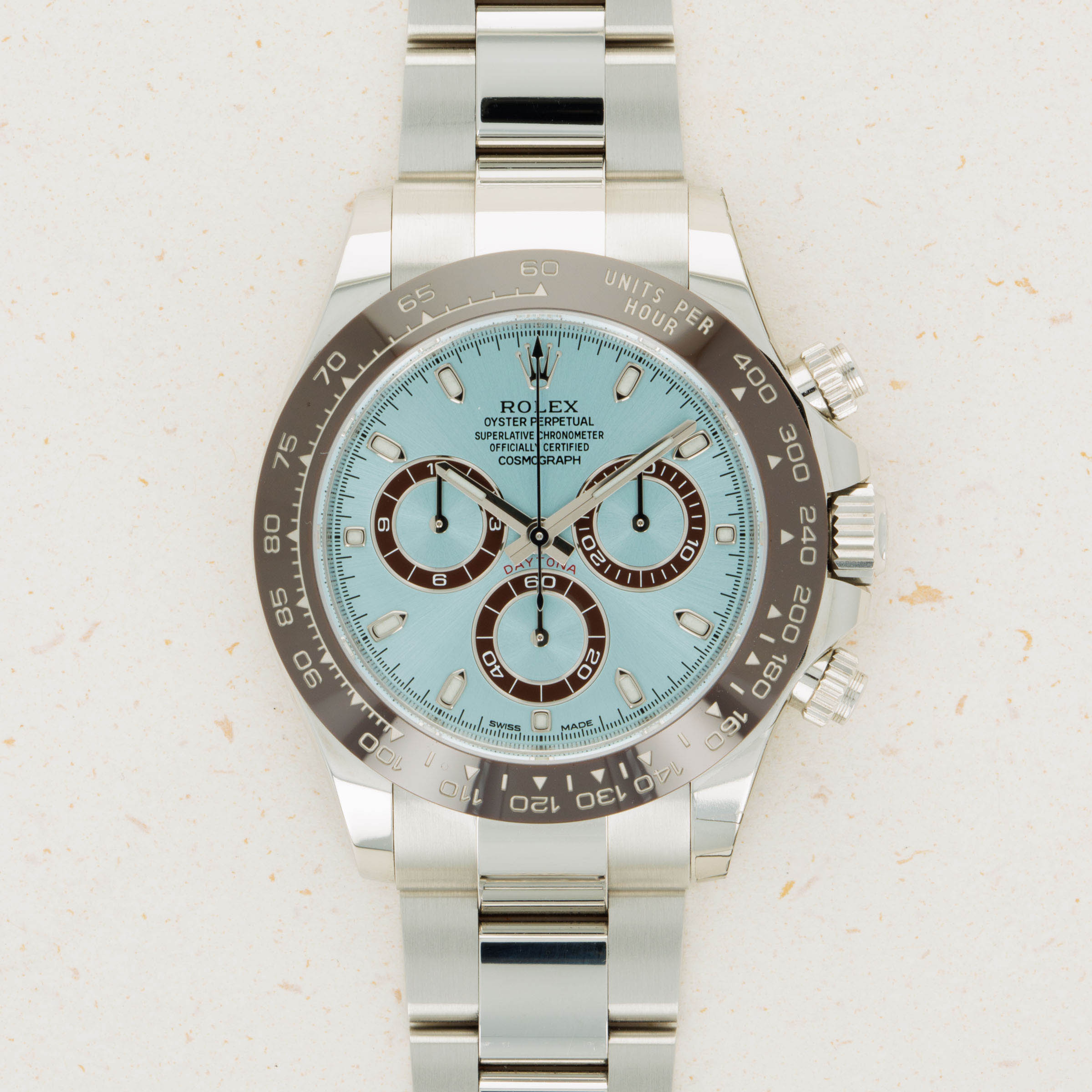 Ever since it was first launched in 1963, the Rolex Daytona has had an abundance of incredible variants join its ranks. From diamond-studded yellow gold vintage variants to modern stainless steel variants with ceramic bezels, the collection has seen it all. Perhaps one of the most luxurious of all of those is the ref. 116506 that we have here. Inarguably the most exclusive modern Daytona reference available, the Daytona ref. 116506 was released in 2013 to celebrate the Daytona's 50th anniversary. Offered as the first Daytona to ever be constructed of platinum, the Platona, as it has become known, also features a stunning brown ceramic bezel made of Rolex's patented Cerachrom, and Rolex's exclusive-to-platinum ice-blue dial with brown subdial chapter rings to match its brown ceramic bezel. With every other Daytona variant already as revered and collectable as they are, the ref. 116506 brings a whole new level of exclusivity to the coveted collection with its anniversary status, colorful design and truly exclusive nature ensuring the vast majority of Rolex's VIPs are vying to add this wonderful timepiece to their collection.