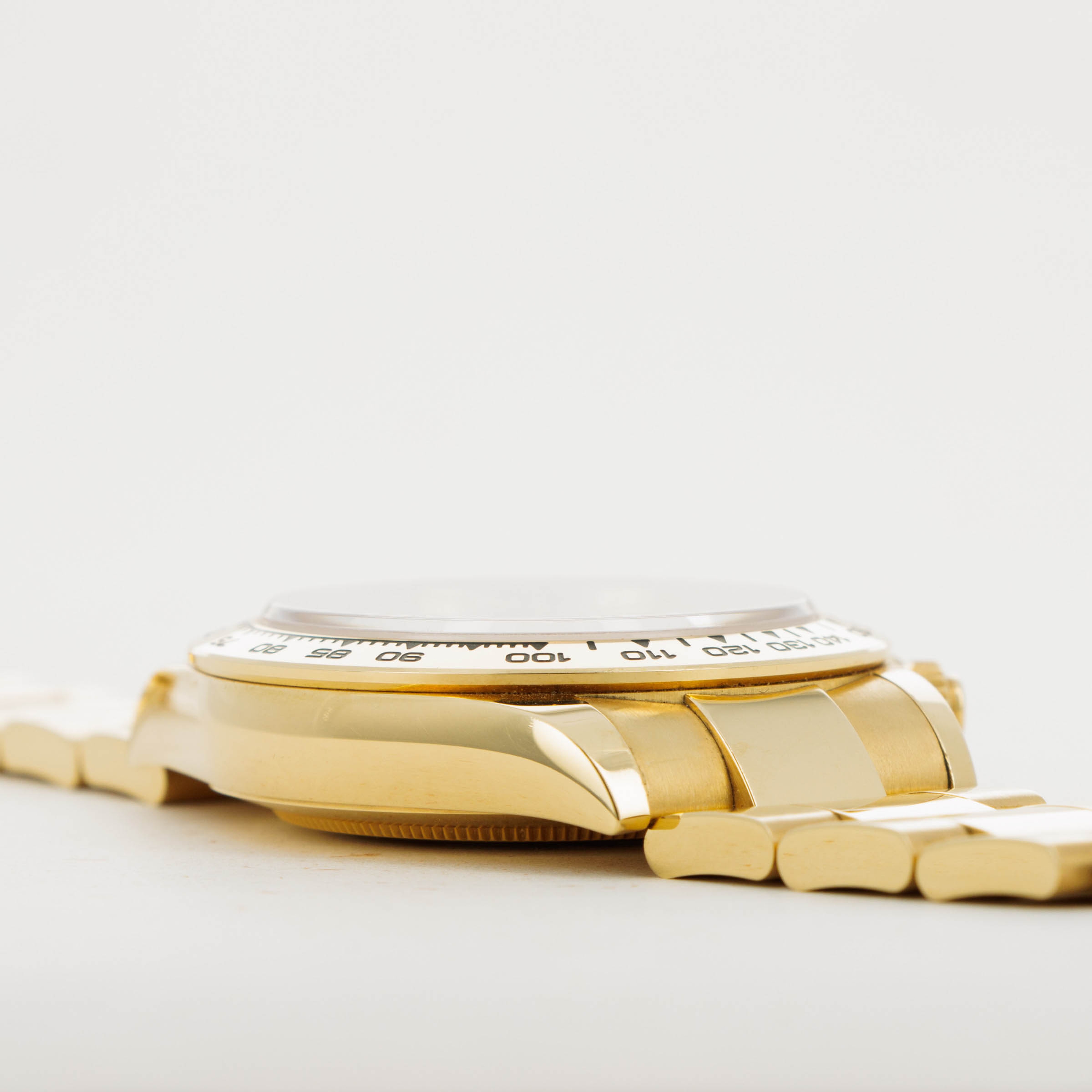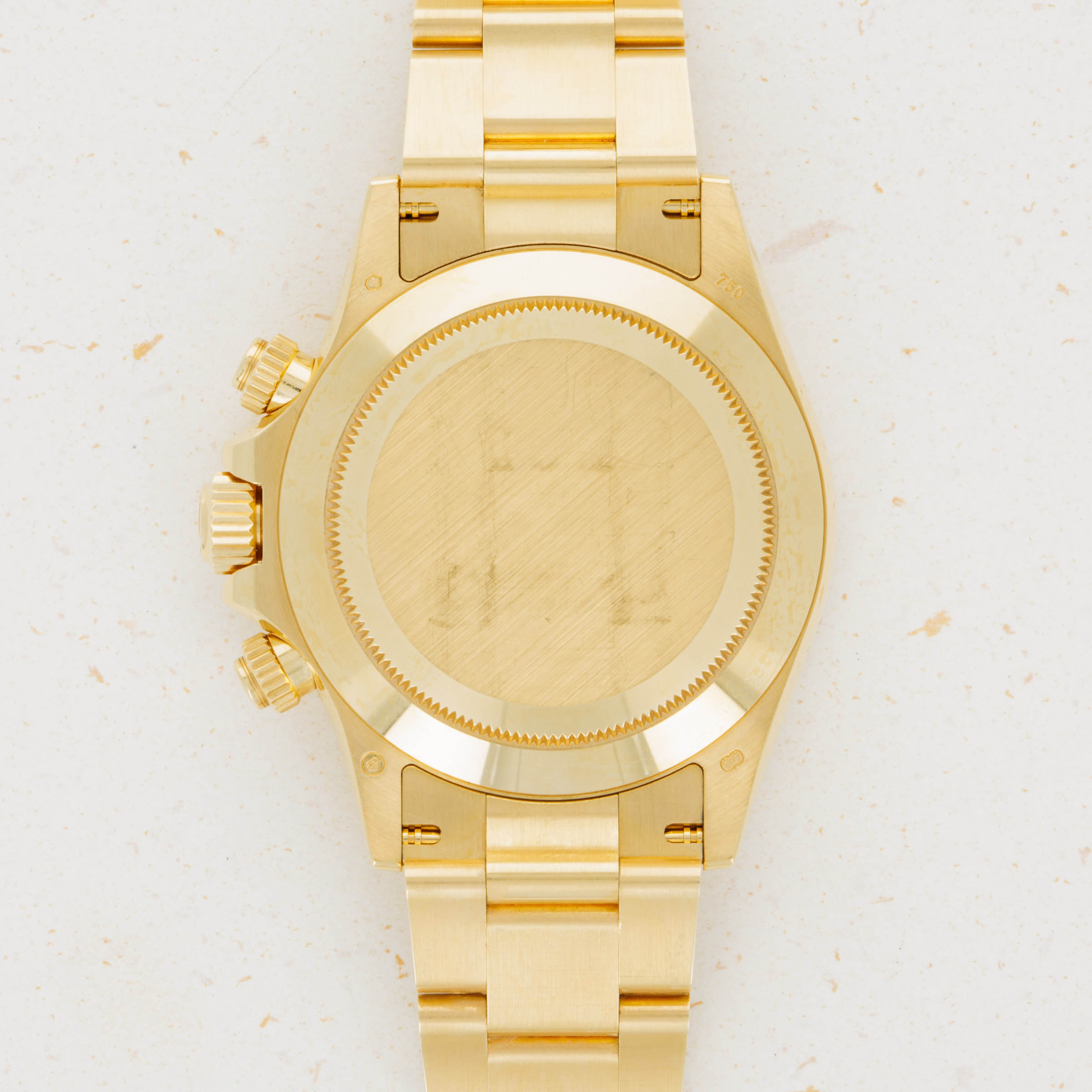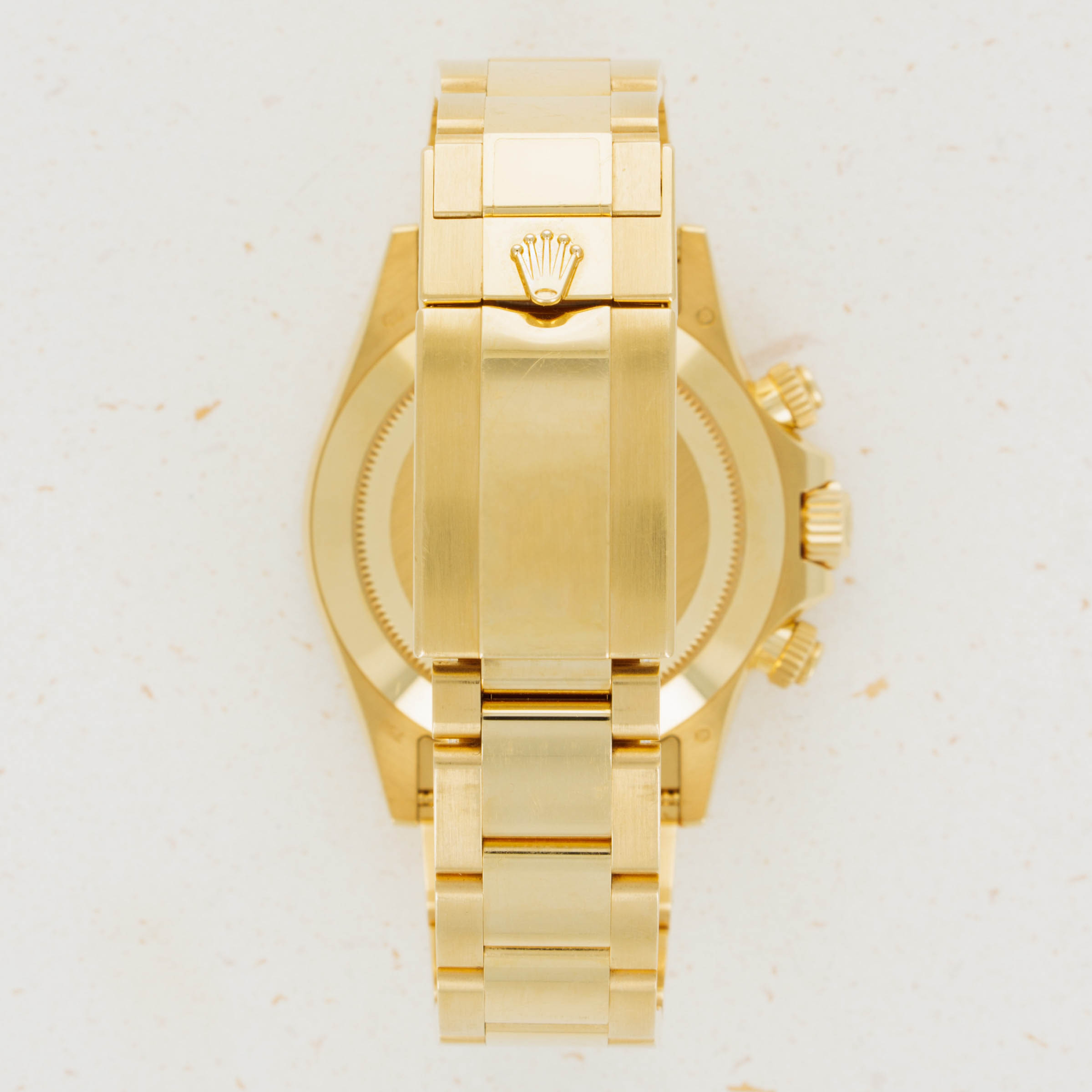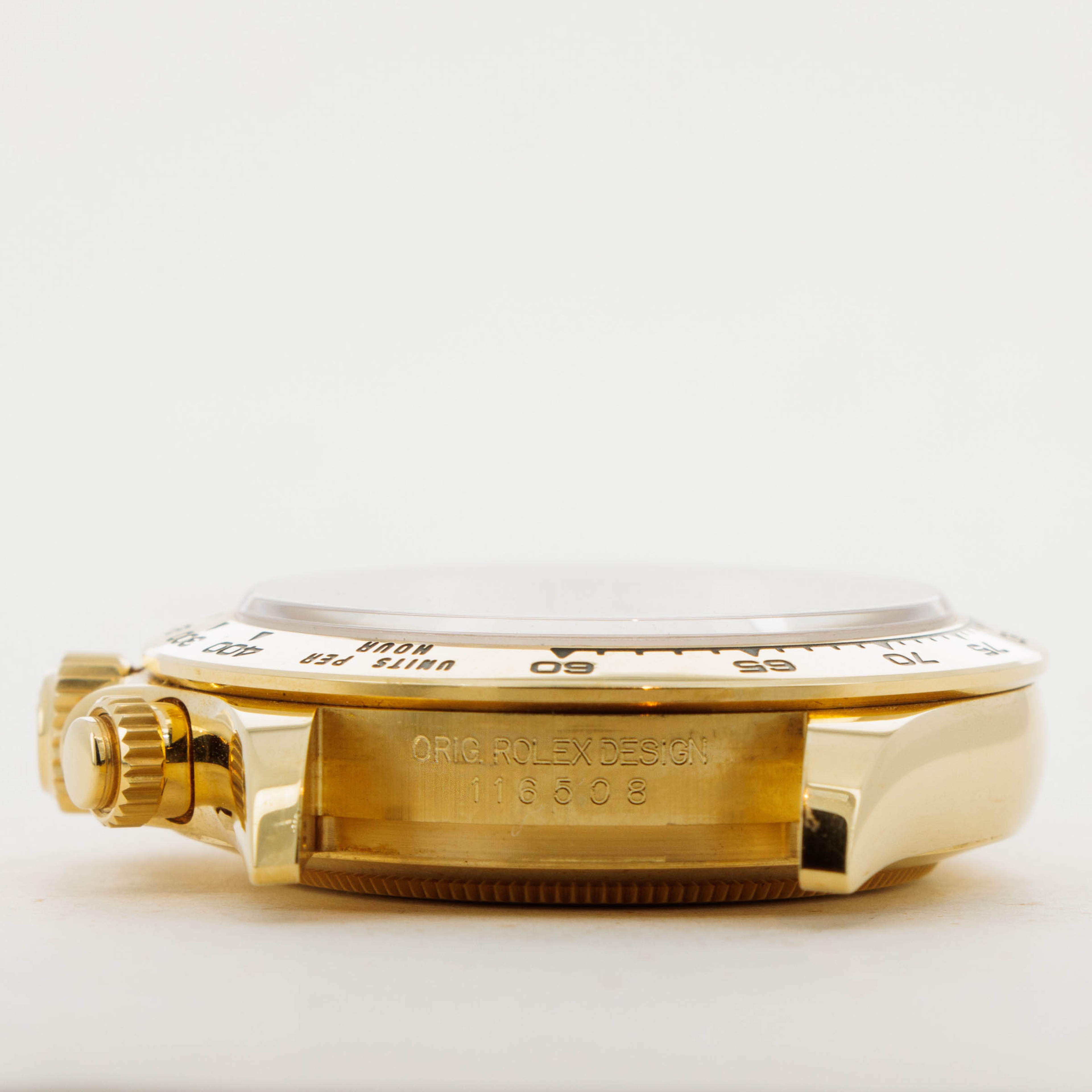 Made of 18kt yellow gold, the ref. 116508's construction is that of total luxury. and is complete with an 18kt yellow gold bracelet, an increasingly rare feature of precious metal Daytonas due to the proliferation of the Oysterflex bracelet across the collection.