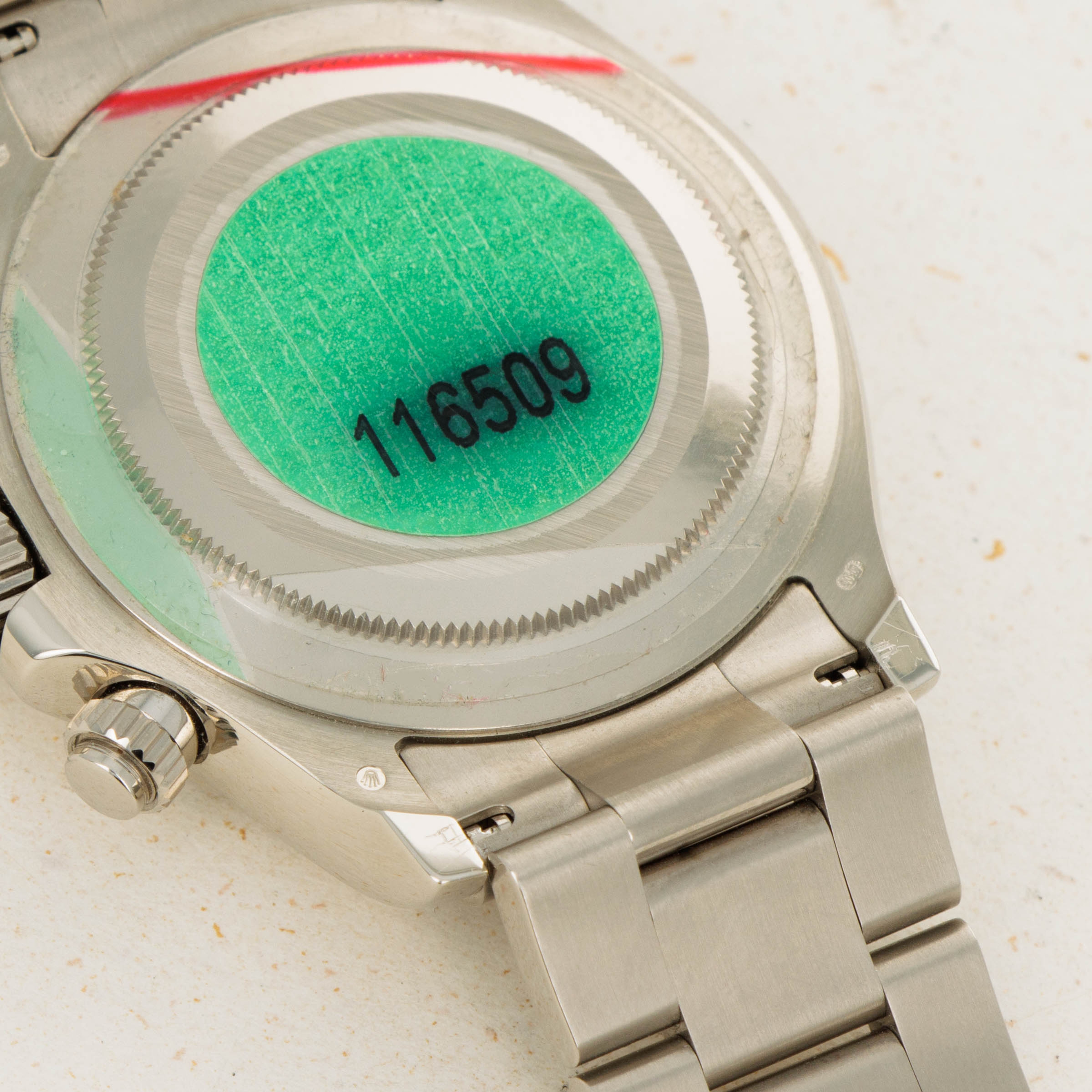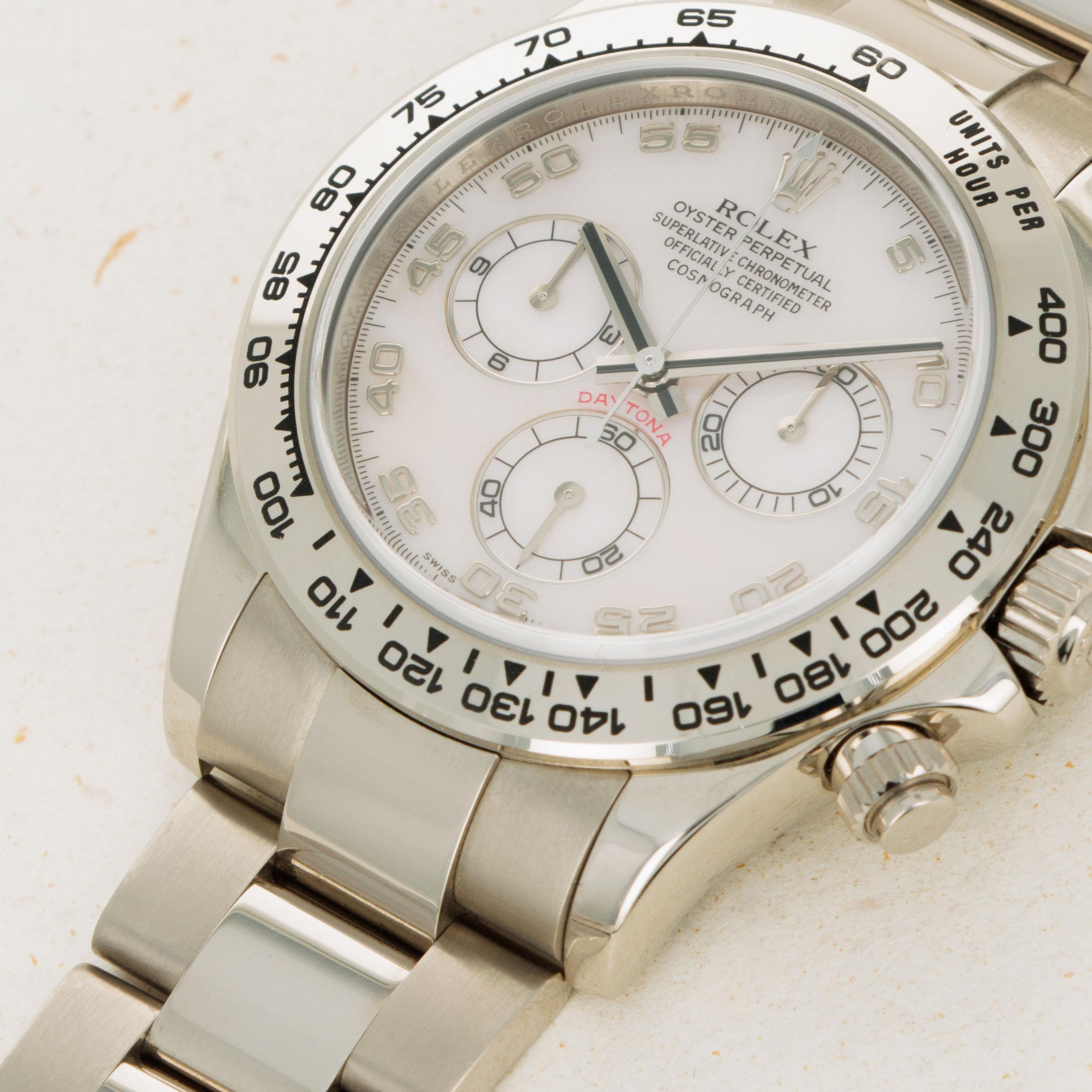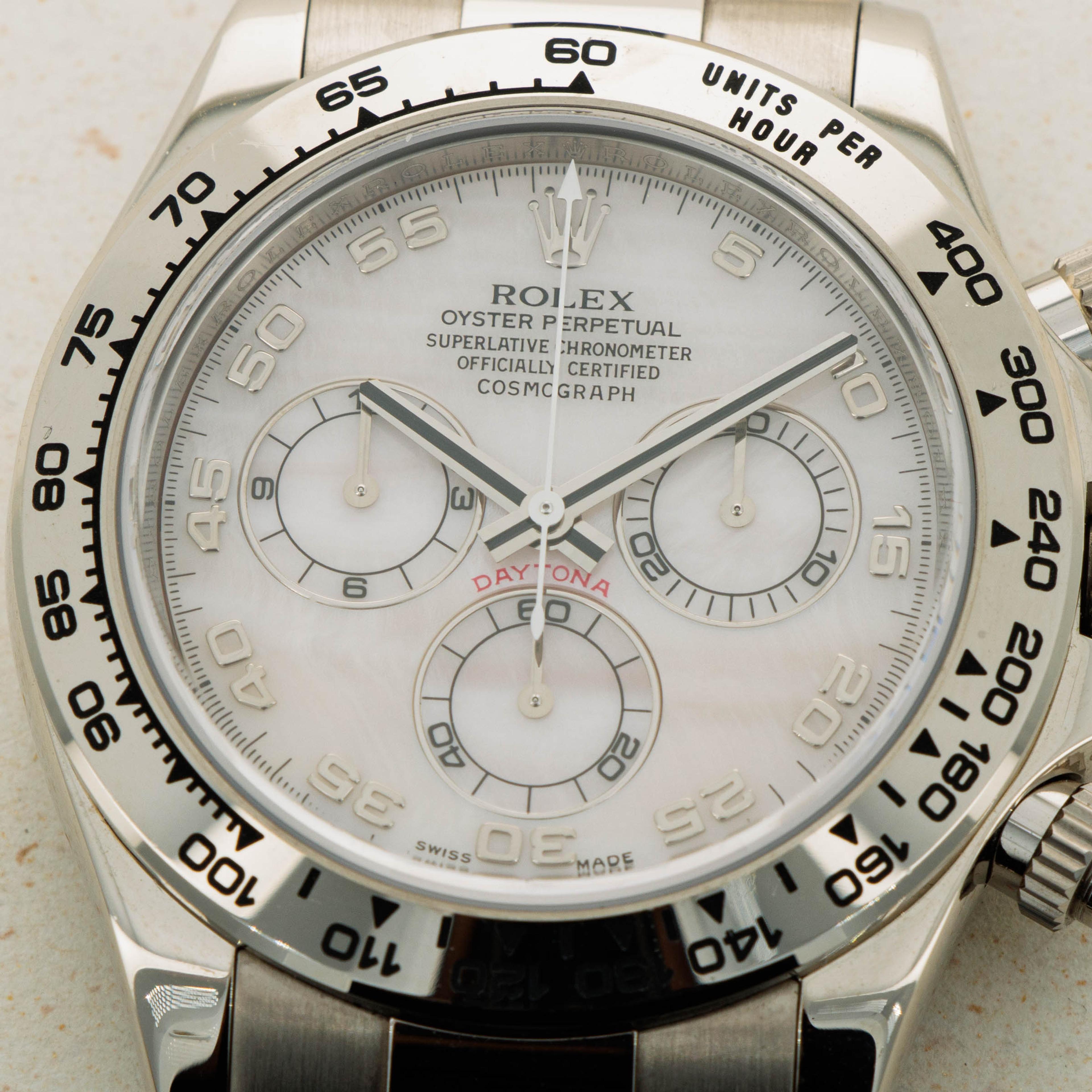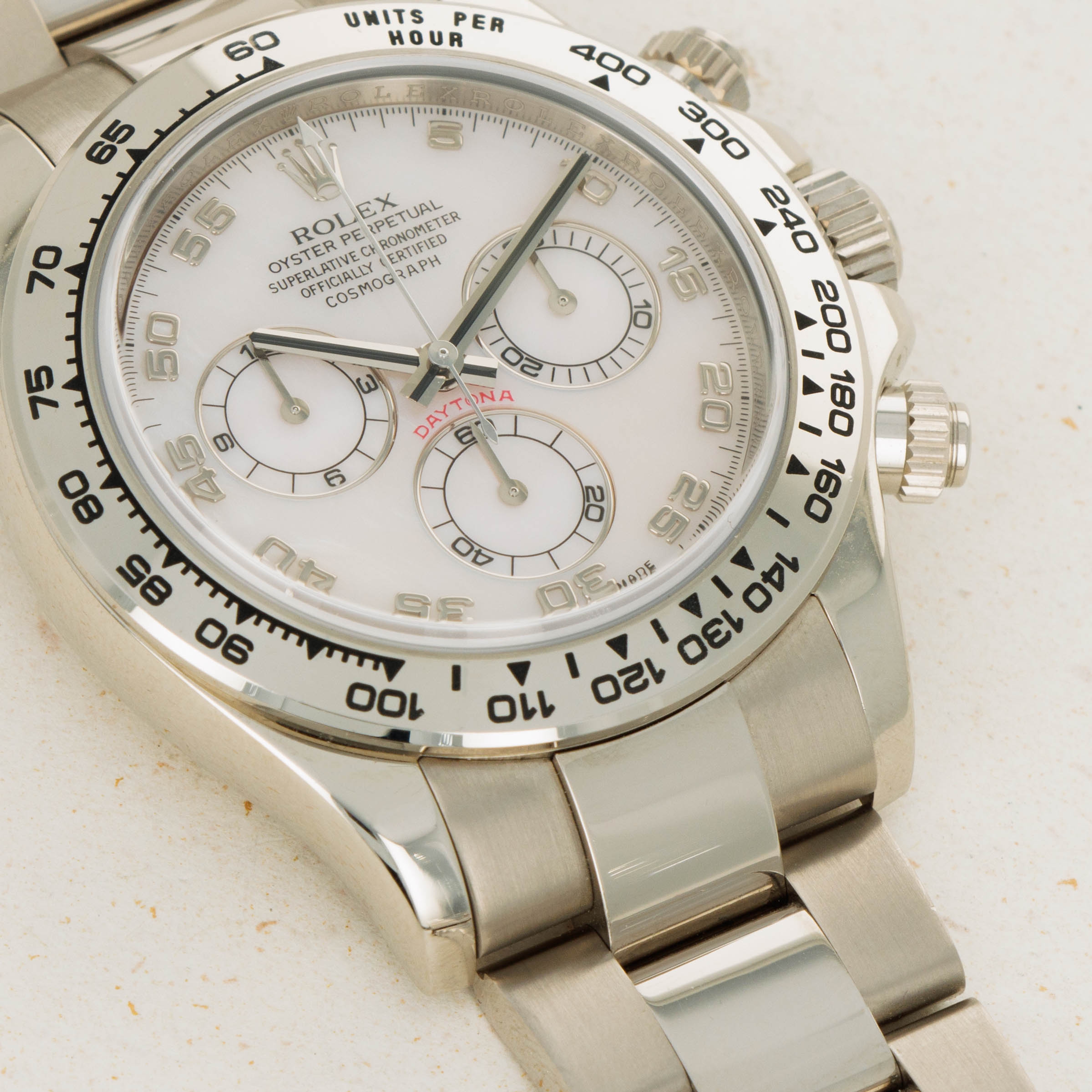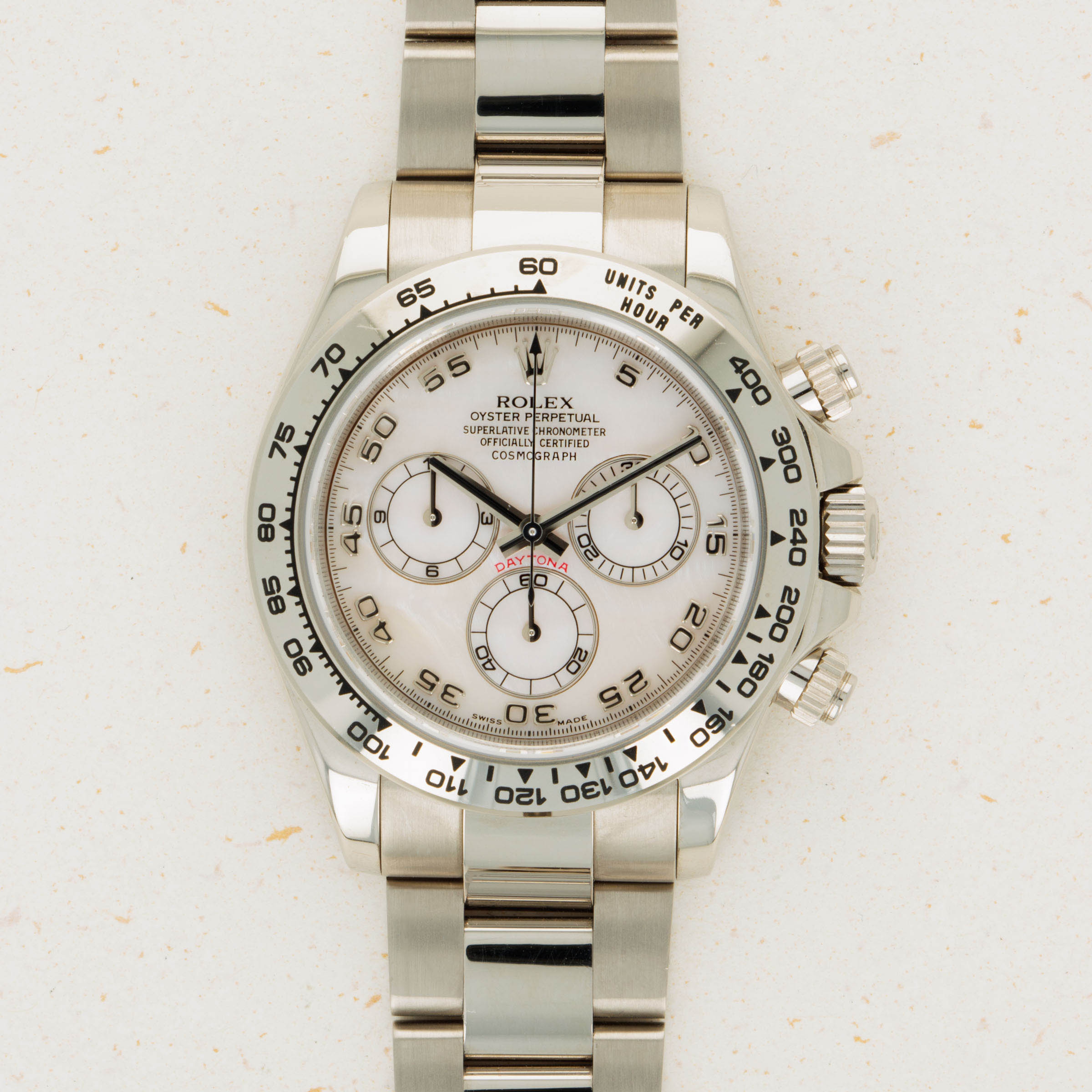 An incredibly luxurious, rare, and beautiful variant of the illustrious Daytona, this ref. 116509's MOP dial combines with its 18kt white gold case and bracelet to create a monochromatic marriage of unadulterated style and exuberance.