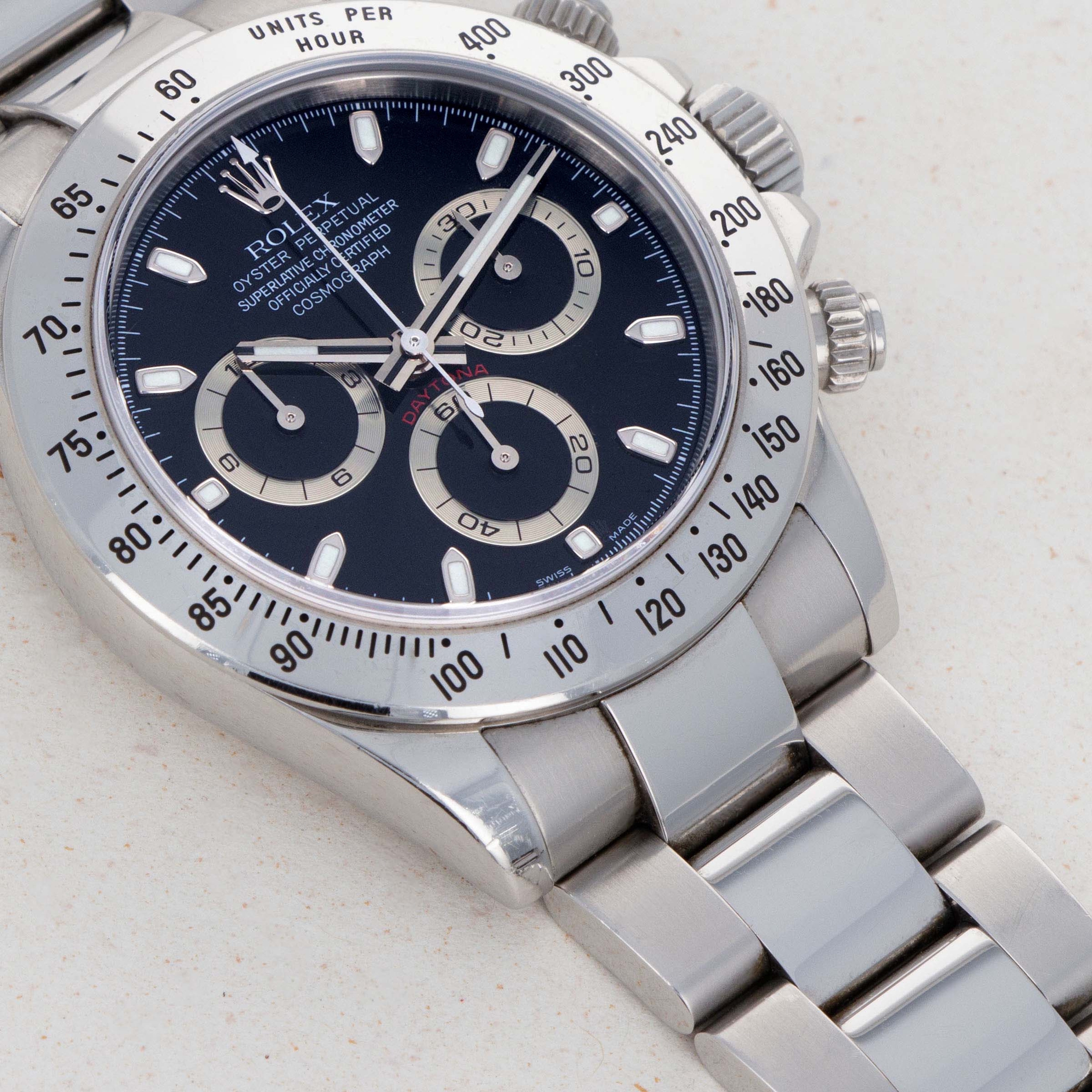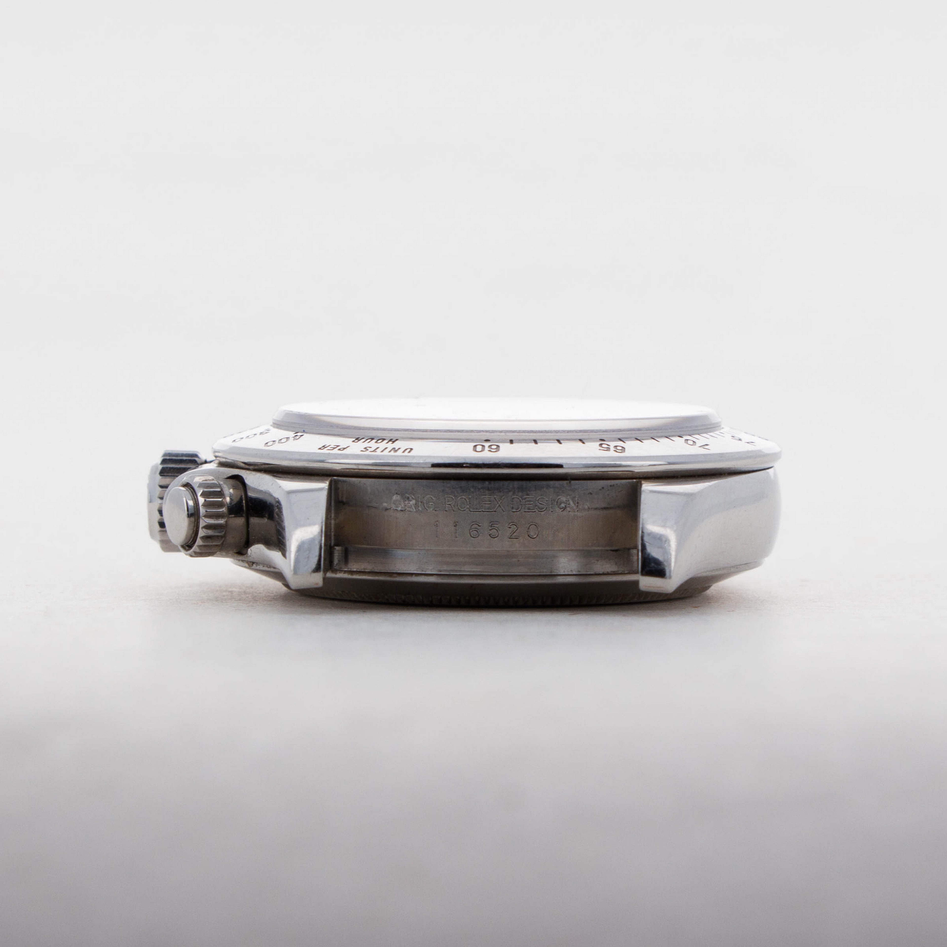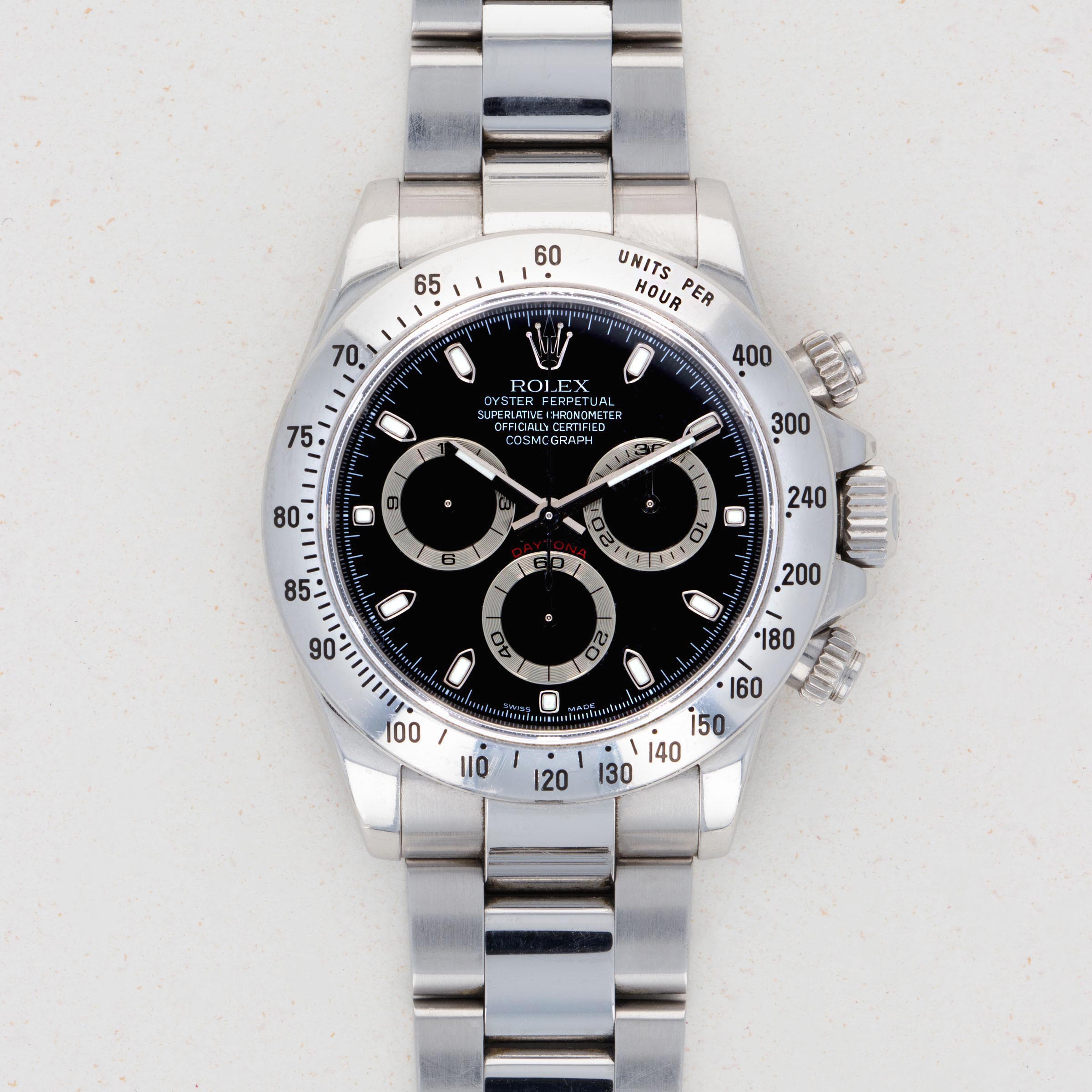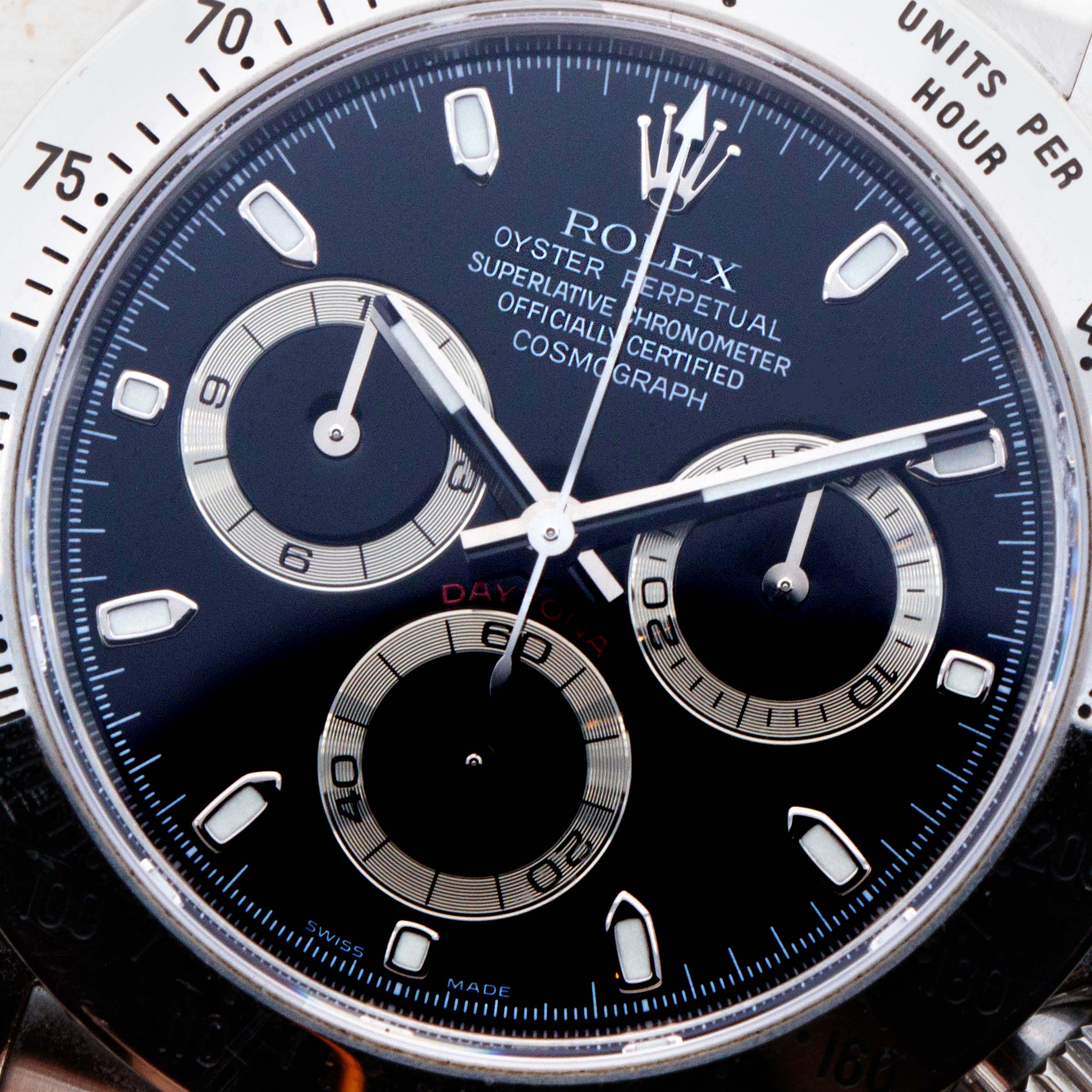 Featuring one of the most recognizable dials in all of watchmaking, the ref. 116520 sports silver subdials and 18kt white gold applied indices and hands which sit atop its black dial and reflect the aesthetic of its famed stainless steel construction.