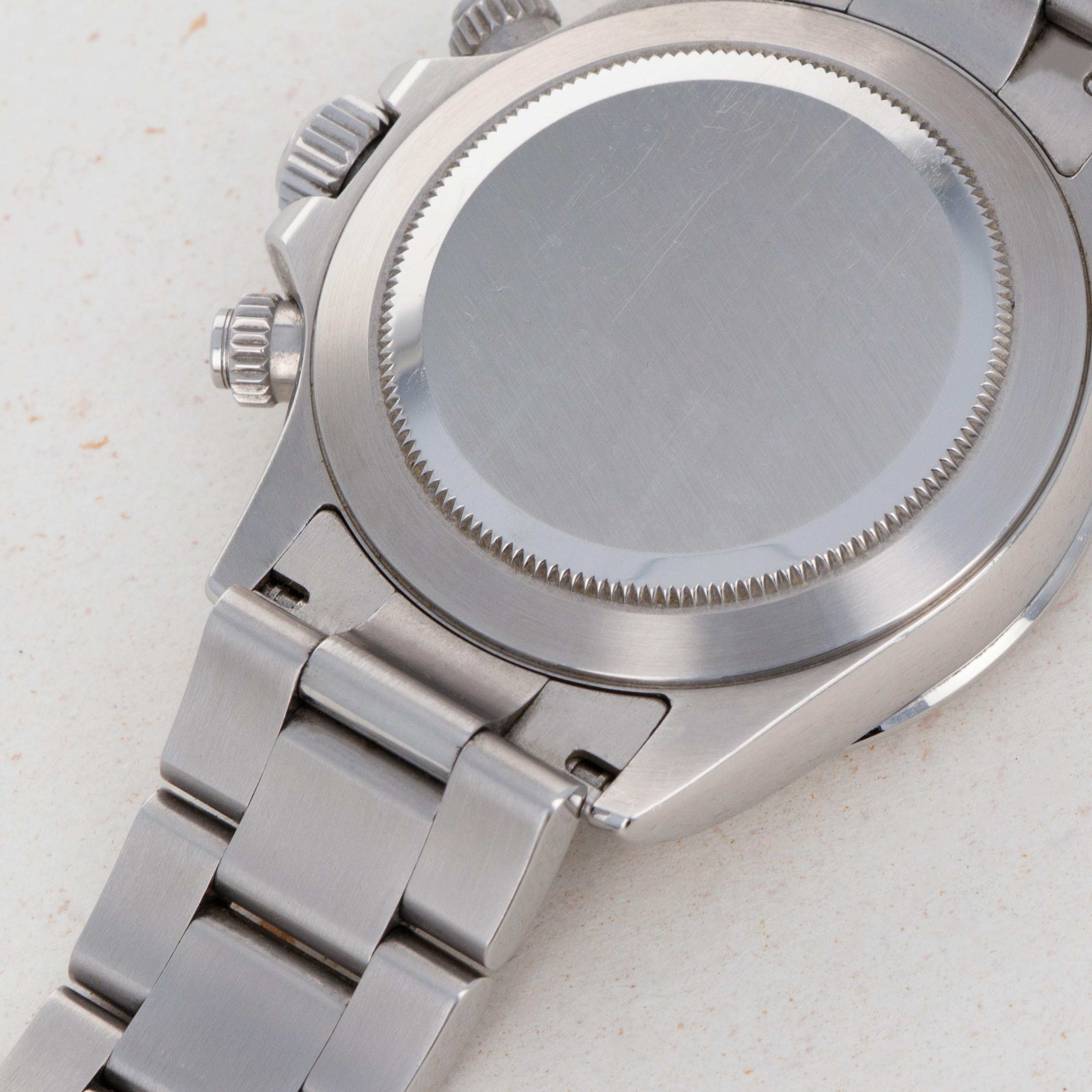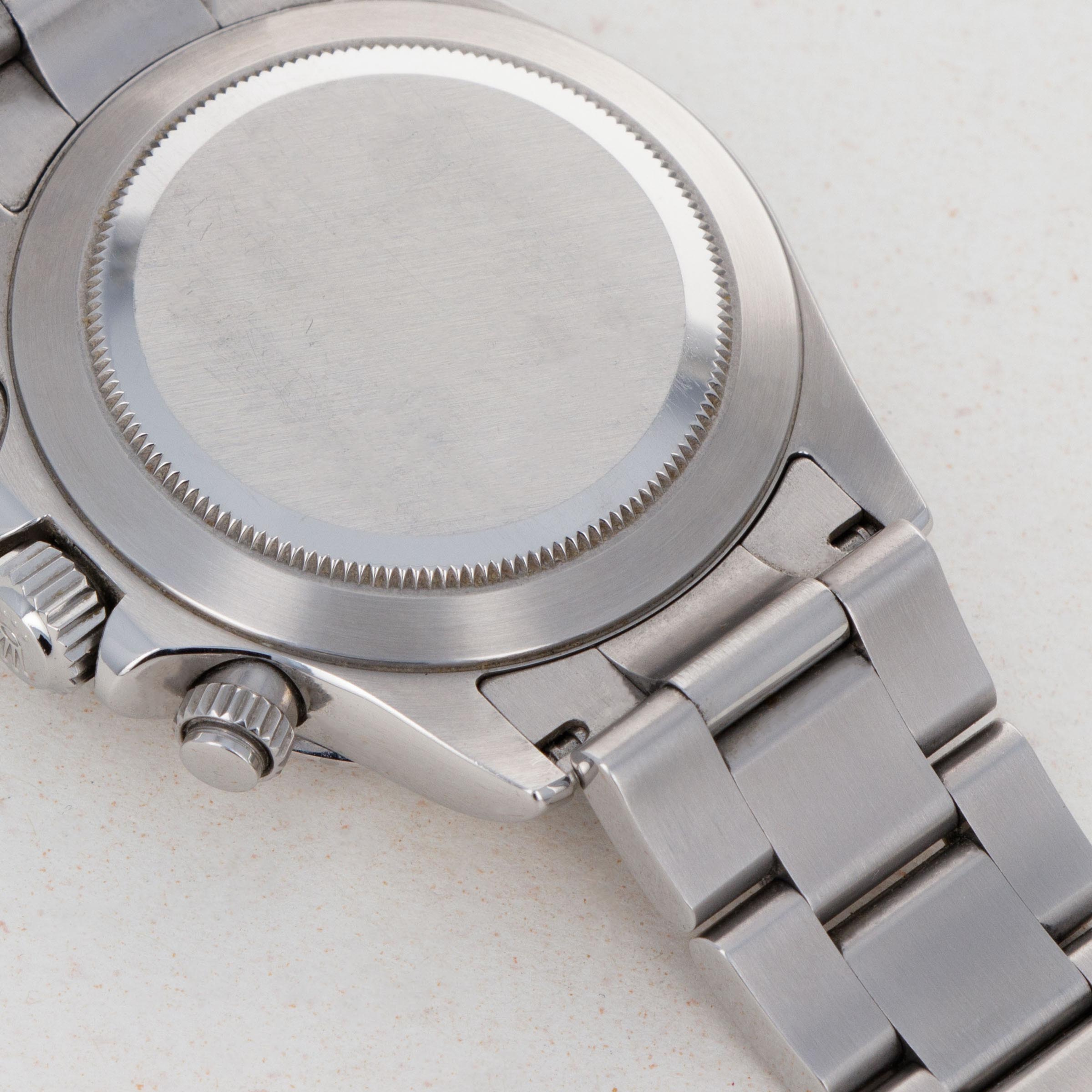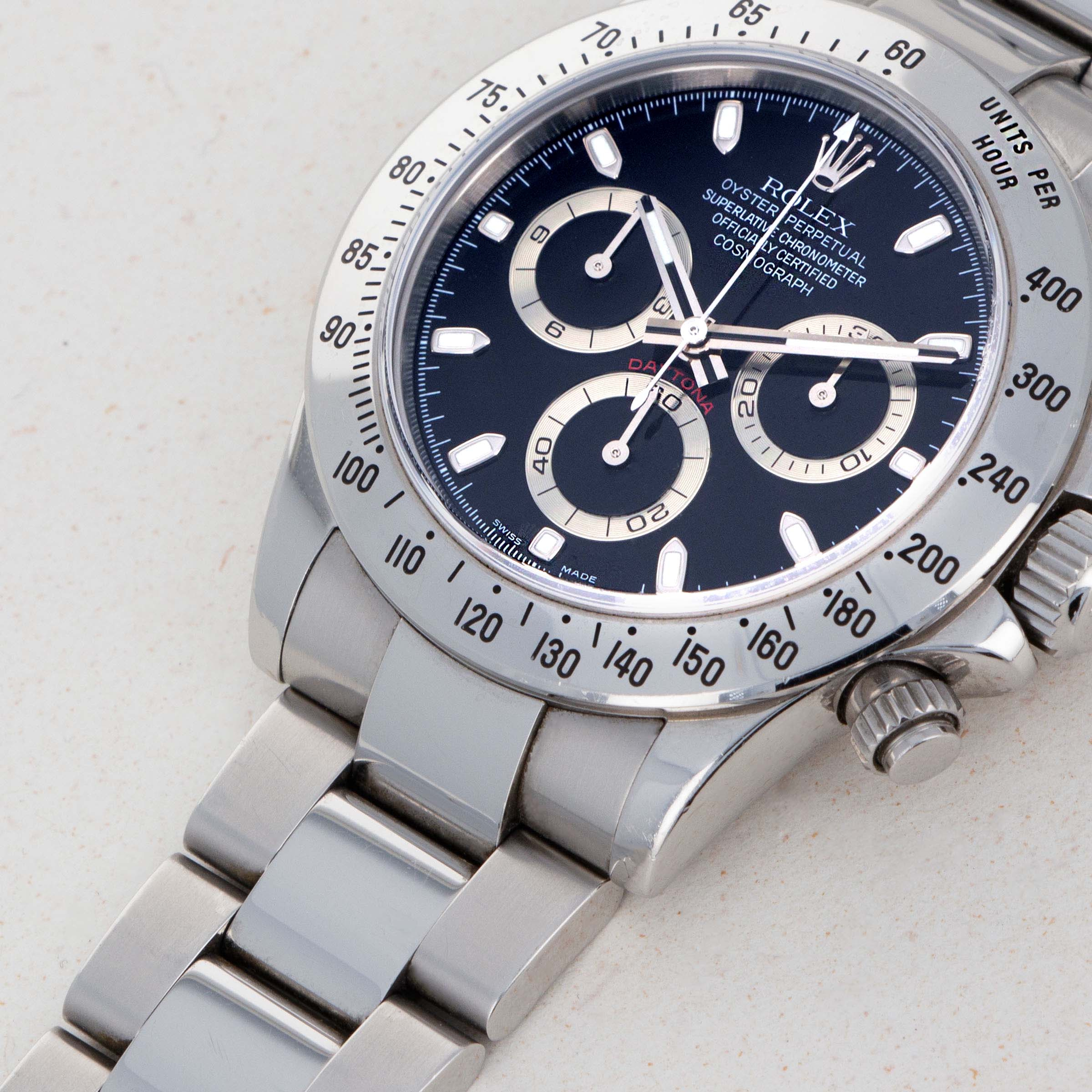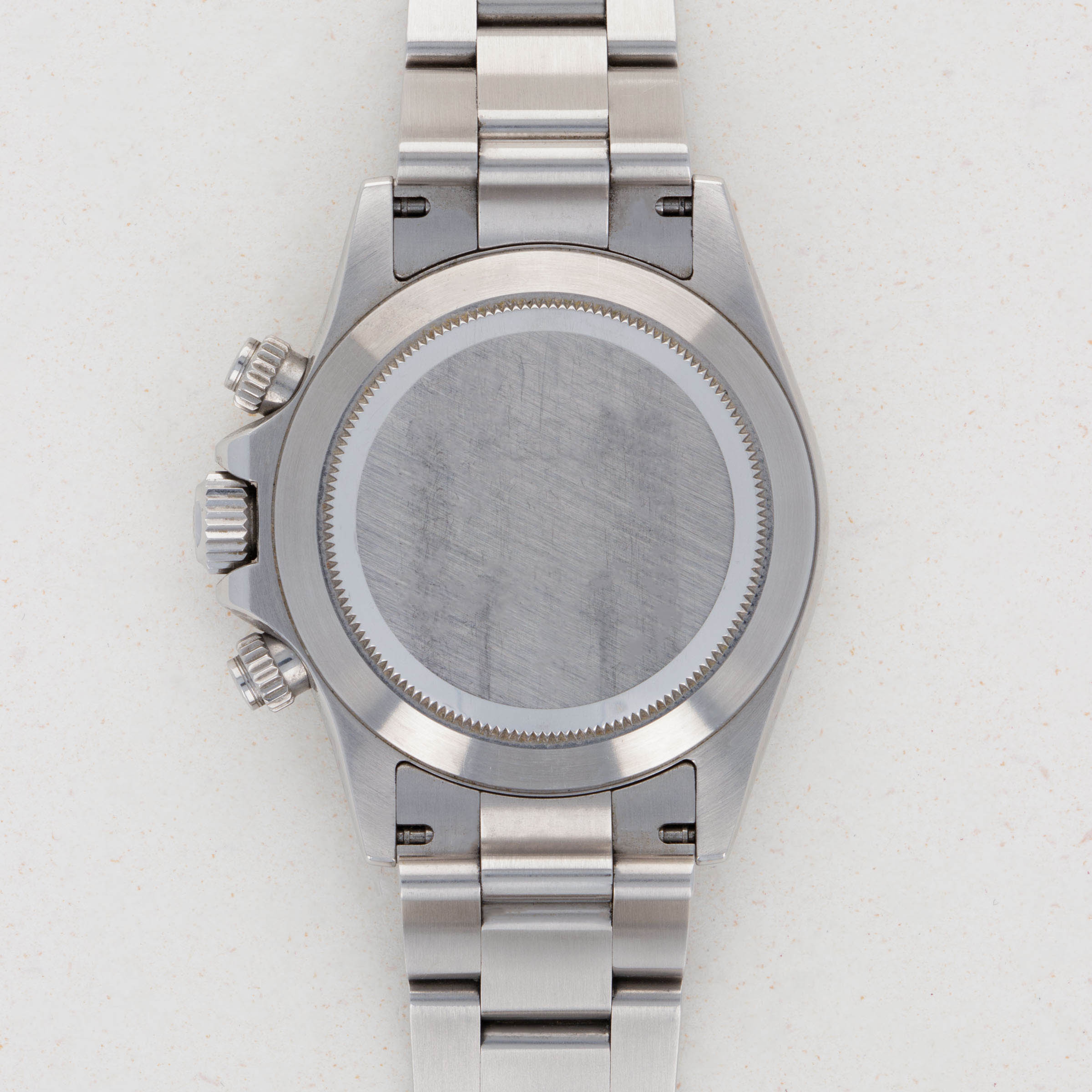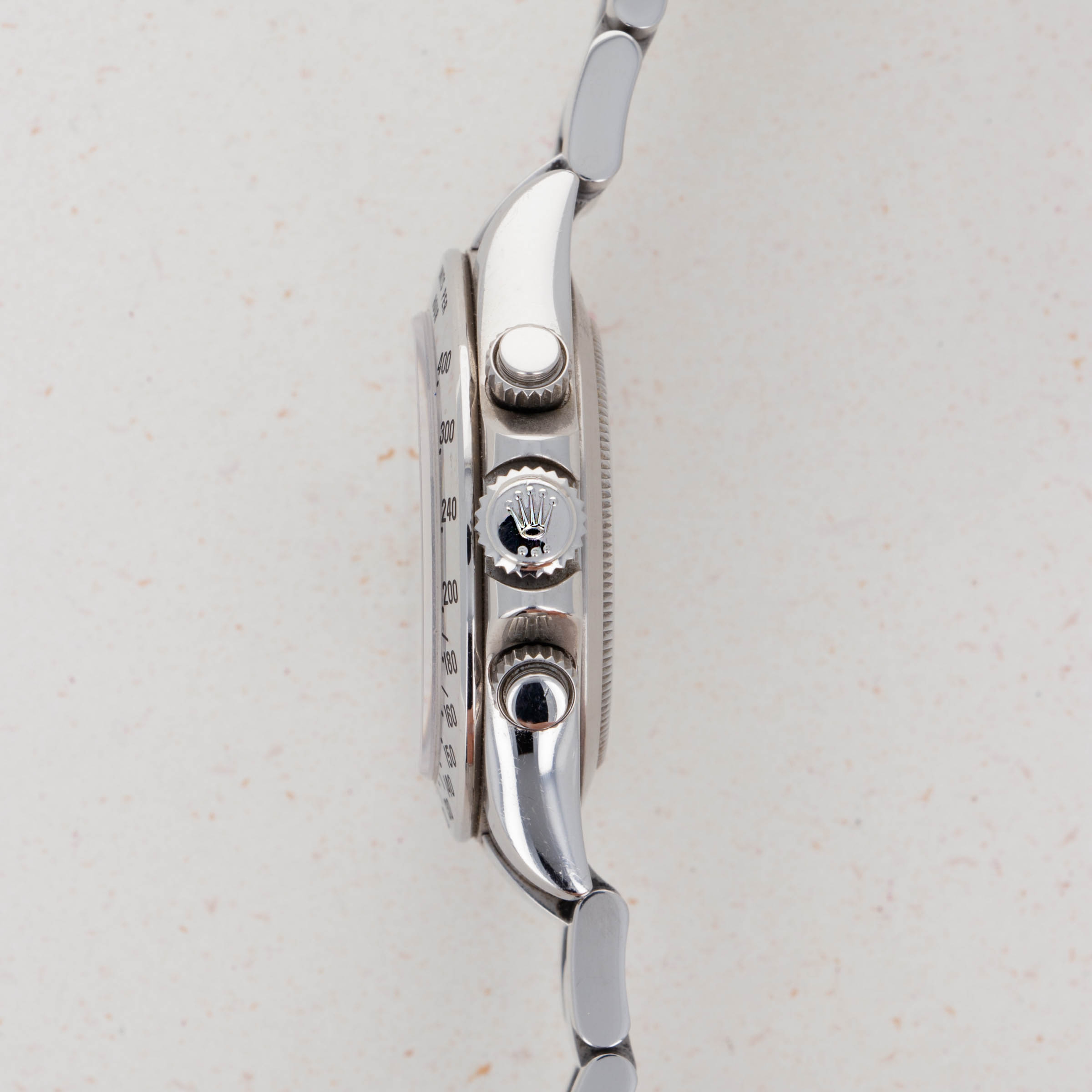 Featuring one of the most recognizable dials in all of watchmaking, the ref. 116520 sports silver subdials and 18kt white gold applied indices and hands which sit atop its black dial and reflect the aesthetic of its famed stainless steel construction.