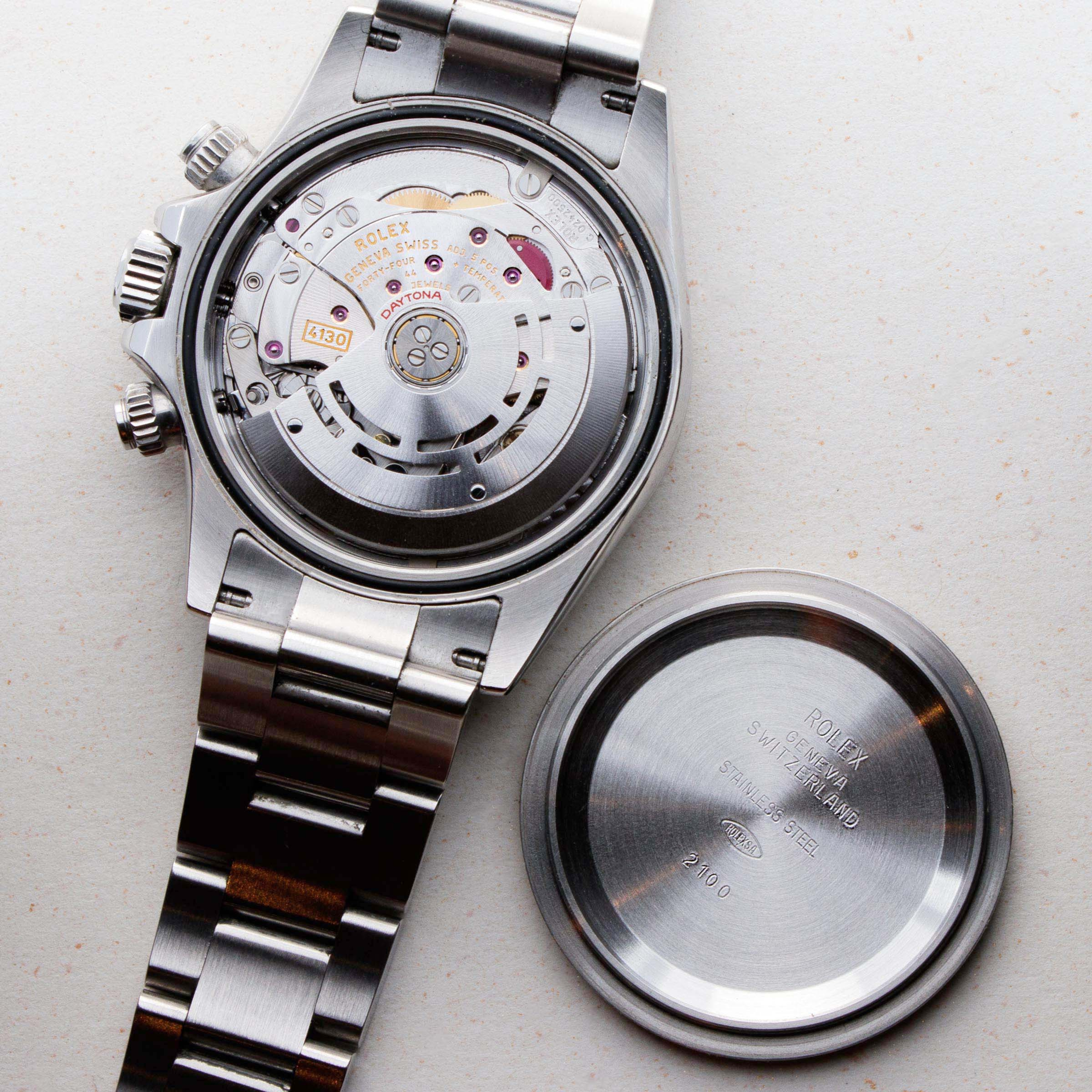 Released in 2000 as a brand new generation of Daytona, the ref. 116520 featured much of the same unchanged design that the previous “Zenith” Daytona had, except for several relatively minor details. To begin with, the dial layout had changed slightly, so the running seconds subdial went from 9 o'clock to 6' clock, and the subdials were no longer in line with the center of the dial. Instead, they moved up slightly above the middle of the dial (running from 9 to 3 o'clock). Additionally, Rolex gave the new Daytona broader indices to accommodate more lume, longer lugs, and a mirror finish on the case flanks to differentiate the latest generation even further. But, without doubt, the latest generation’s most significant upgrade was Rolex’s new (at the time) in-house automatic cal. 4130 chronograph movement. Designed to be ruthlessly efficient, it has just 201 parts - a 20% decrease on the previous movement, the cal. 4030, making for an even more reliable movement requiring even less servicing. Additionally, with more space free to accommodate a larger mainspring, Rolex increased the cal. 4030's power reserve from 50 to 72 hours in the cal. 4130. All in all, even for a 20+ year old movement, the cal. 4130 is incredible even by today’s standards and fitting for the Daytona’s legendary legacy.