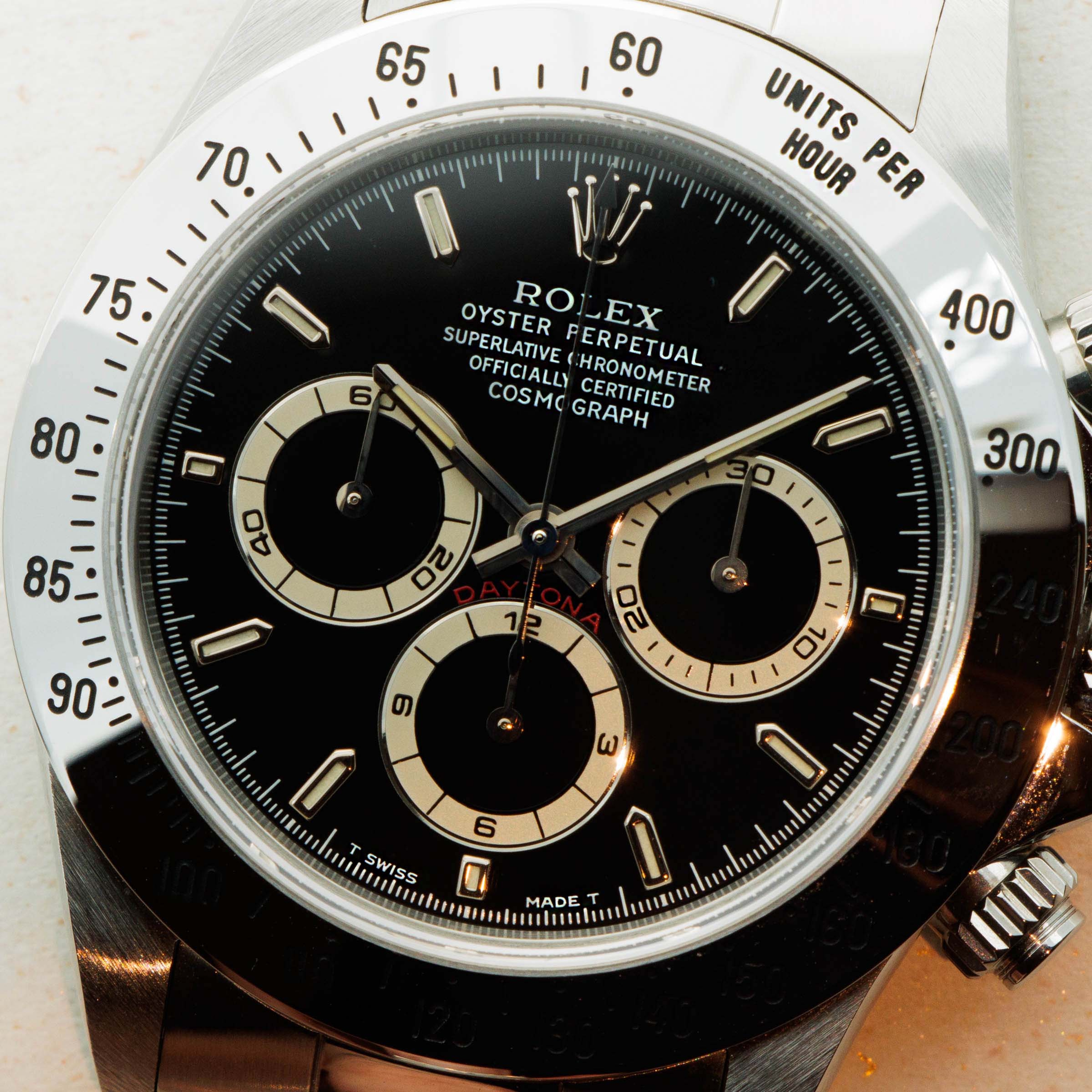 Featuring a jet-black dial to contrast the silver color of its stainless steel construction, the Daytona ref. 16520 is a wonderfully legible timepiece. Indeed, this example's hour markers and hands have also aged to include a subtle creamy patina that is most enjoyable.
