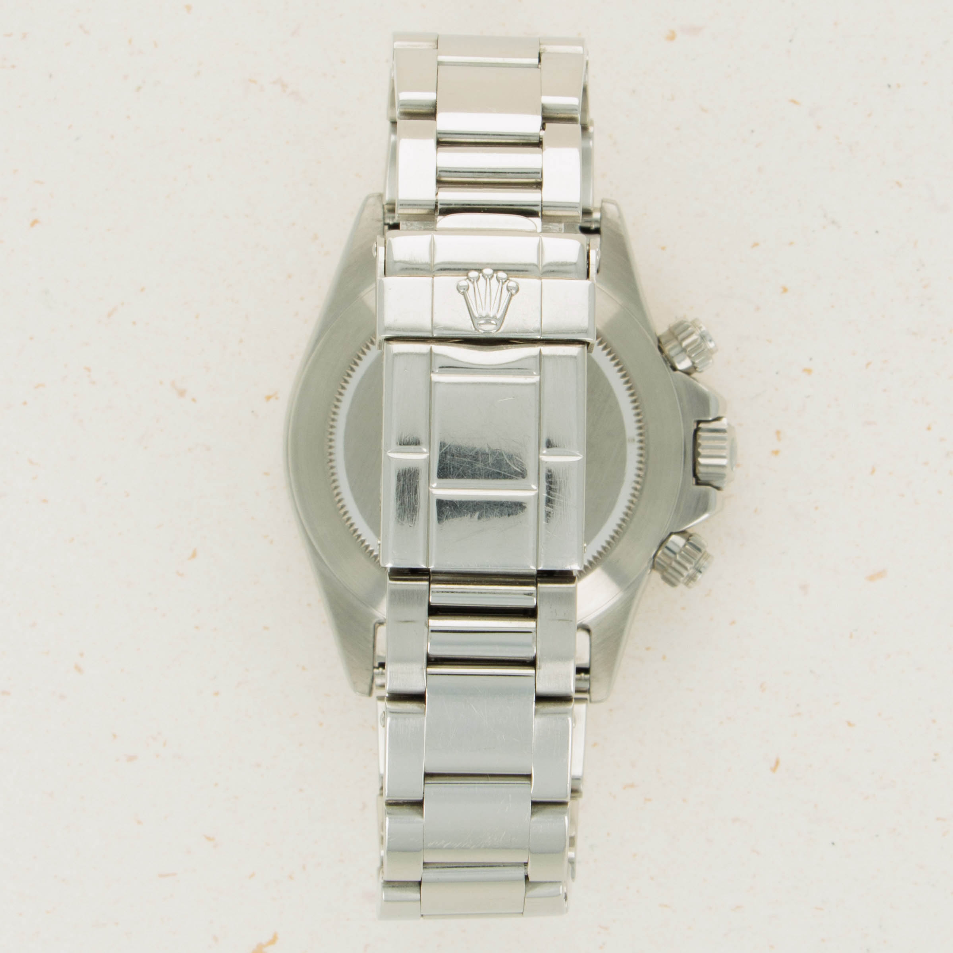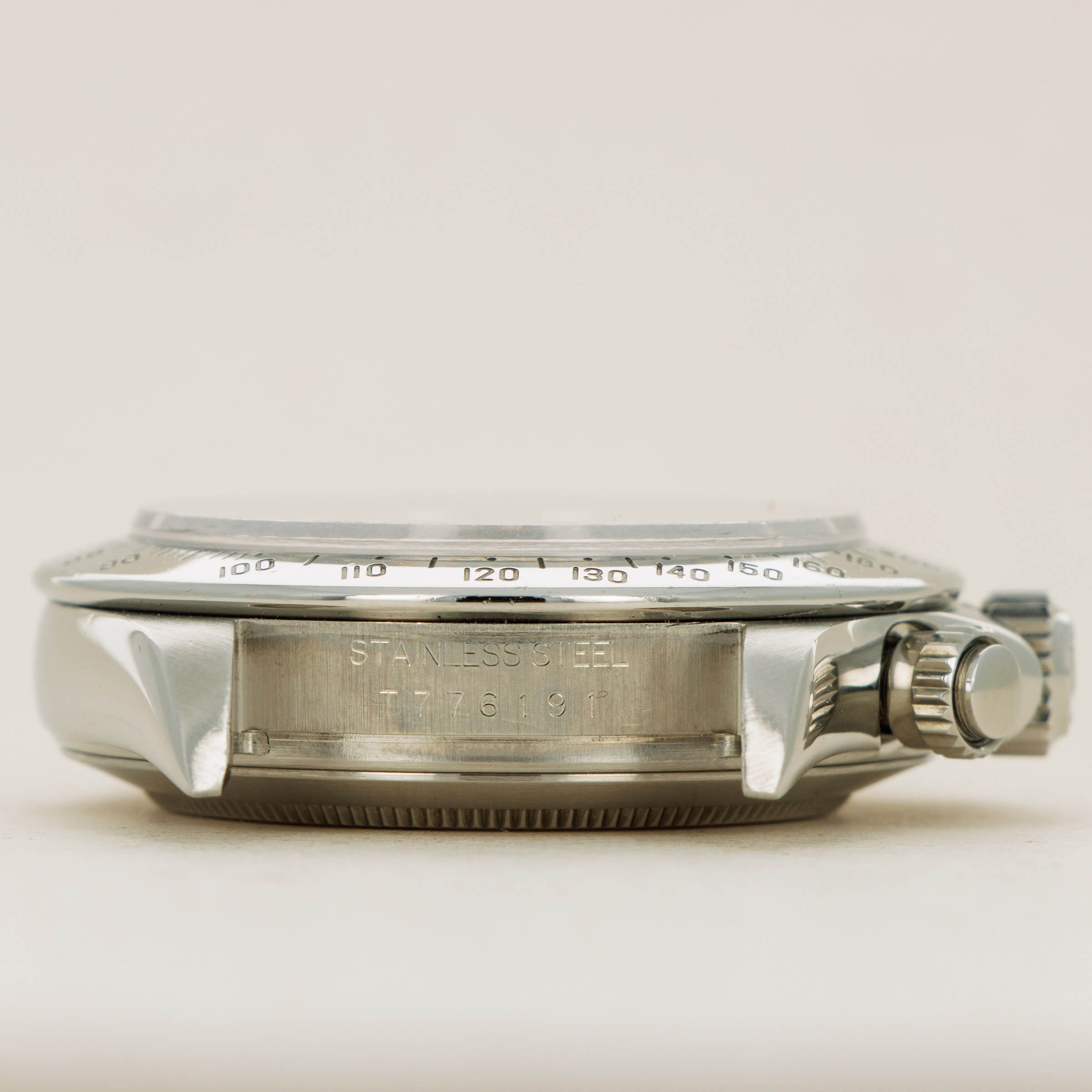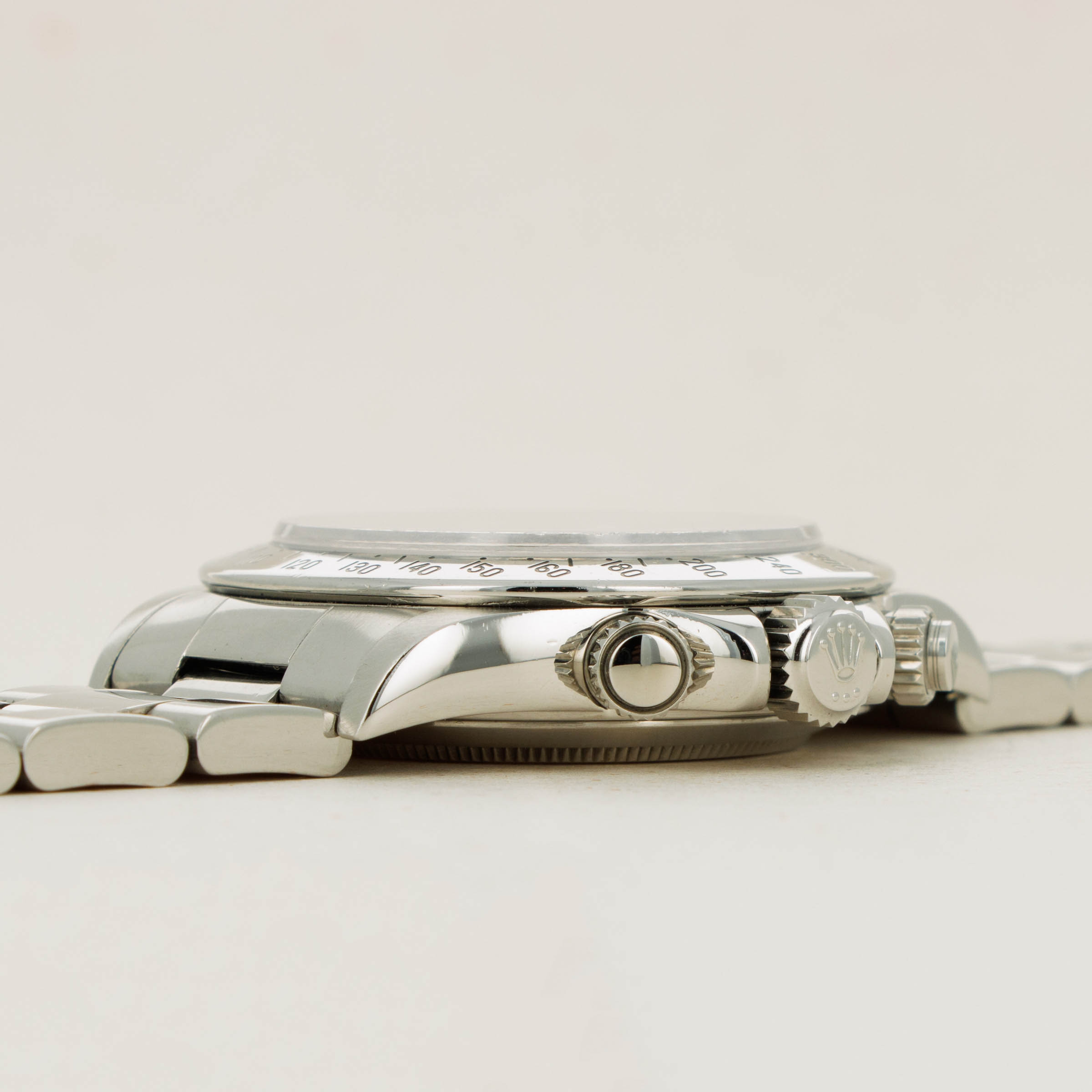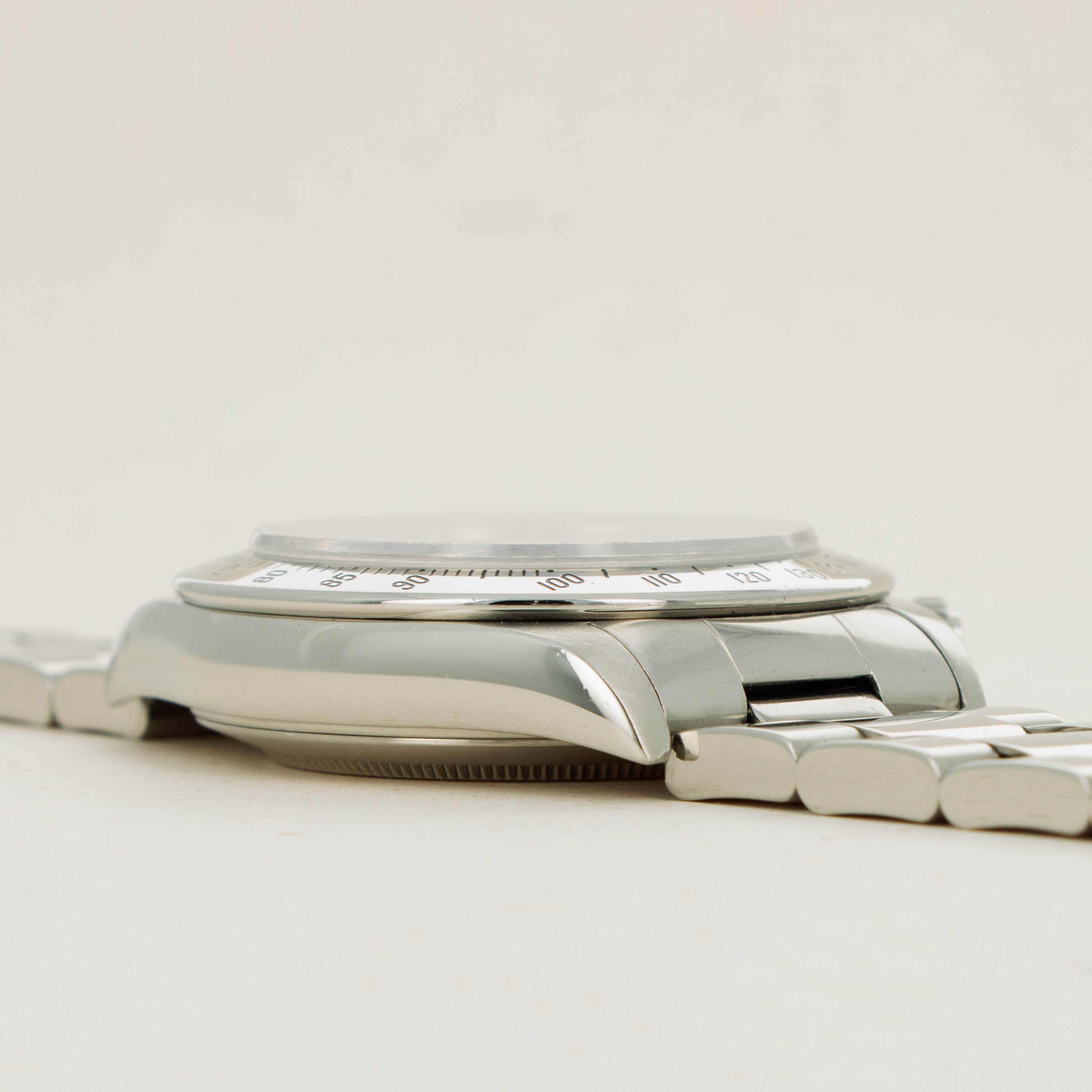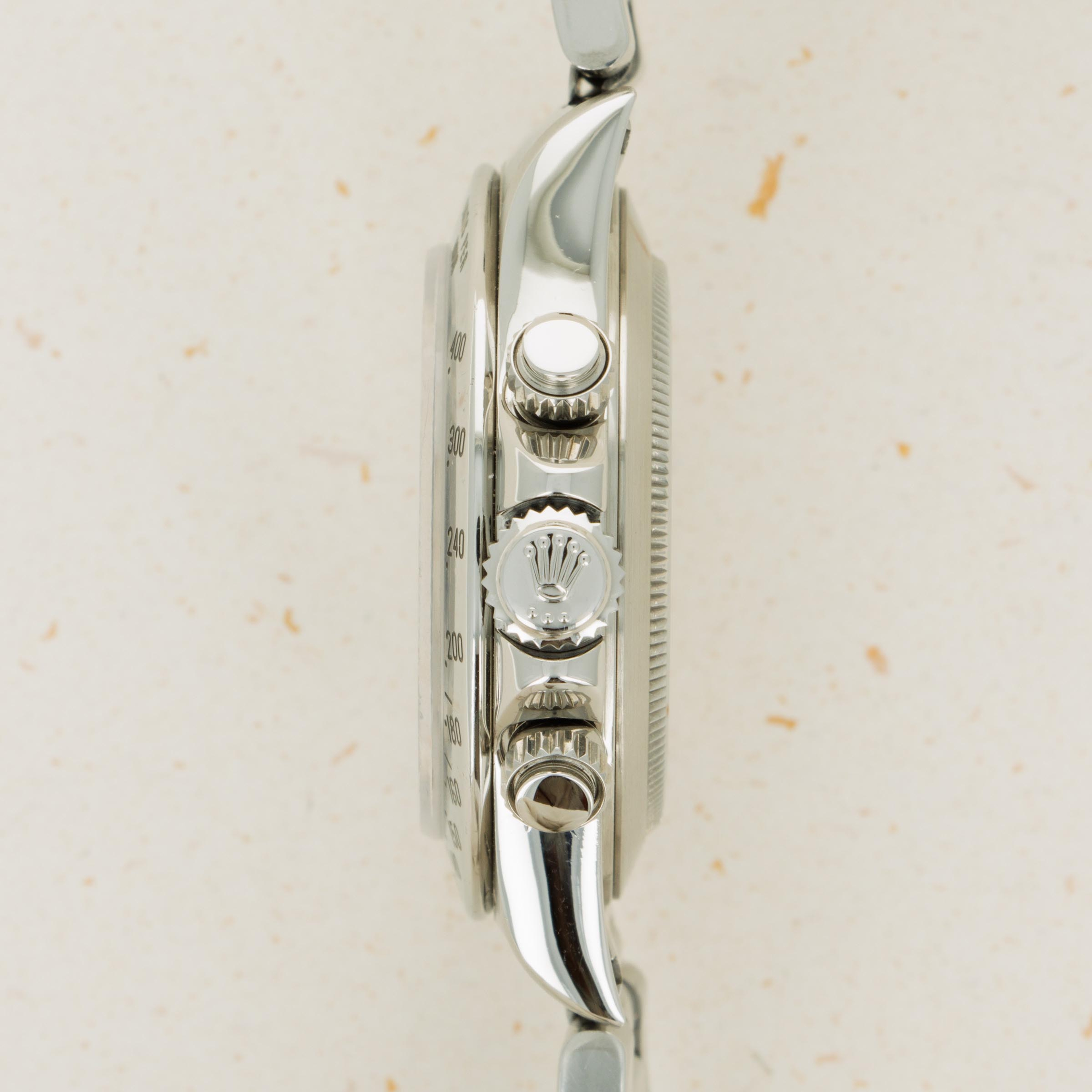 The most classical of all Daytona displays, this ref. 16520 boasts a black dial with silver subdial chapter rings to match its stainless steel construction and white gold indices and hands that pop against their dark backdrop.