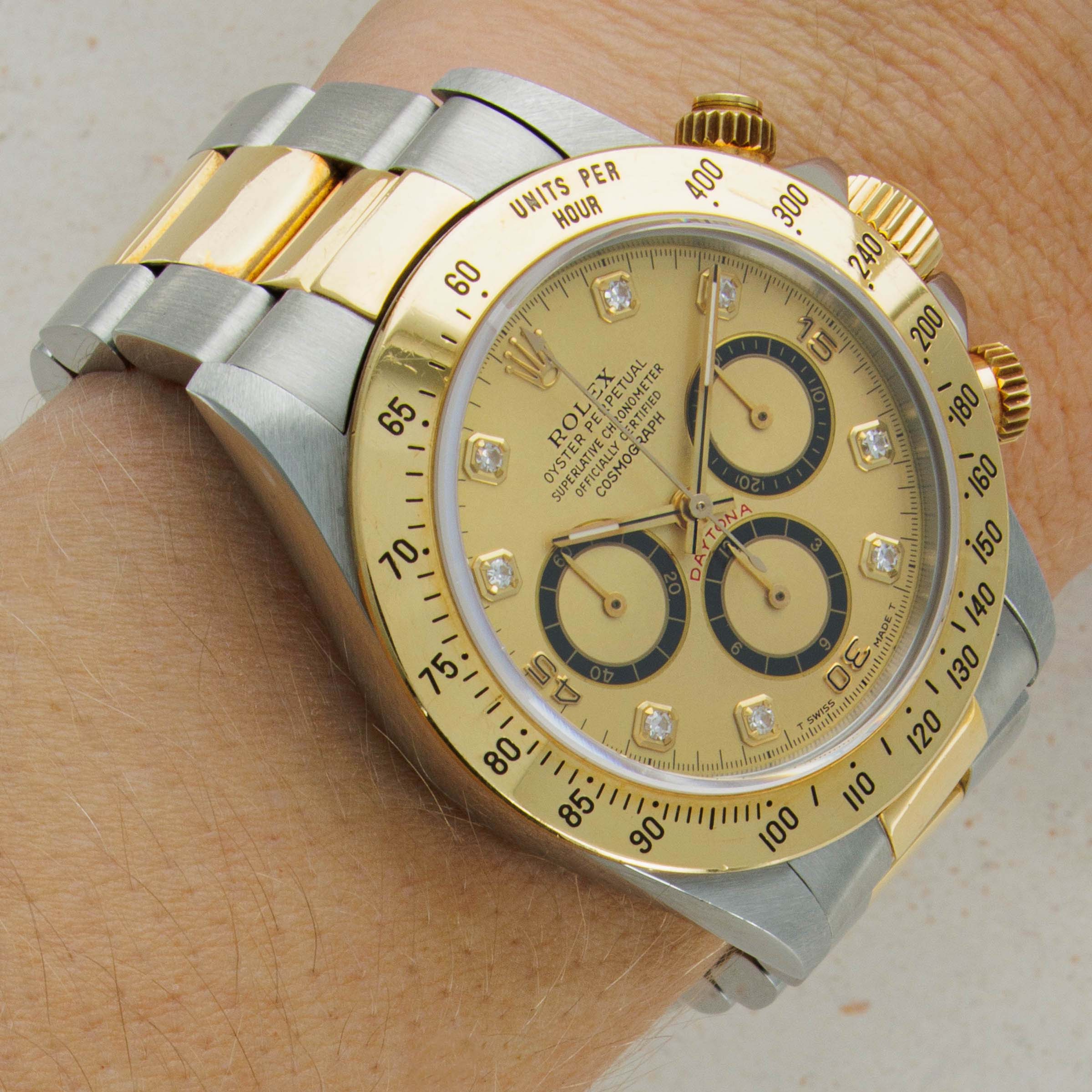 Matching its bezel, pushers, winding crown, and center links, this example features a rich golden champagne dial with black subdial chapter rings that sound out prominently alongside its diamond-set hour markers.