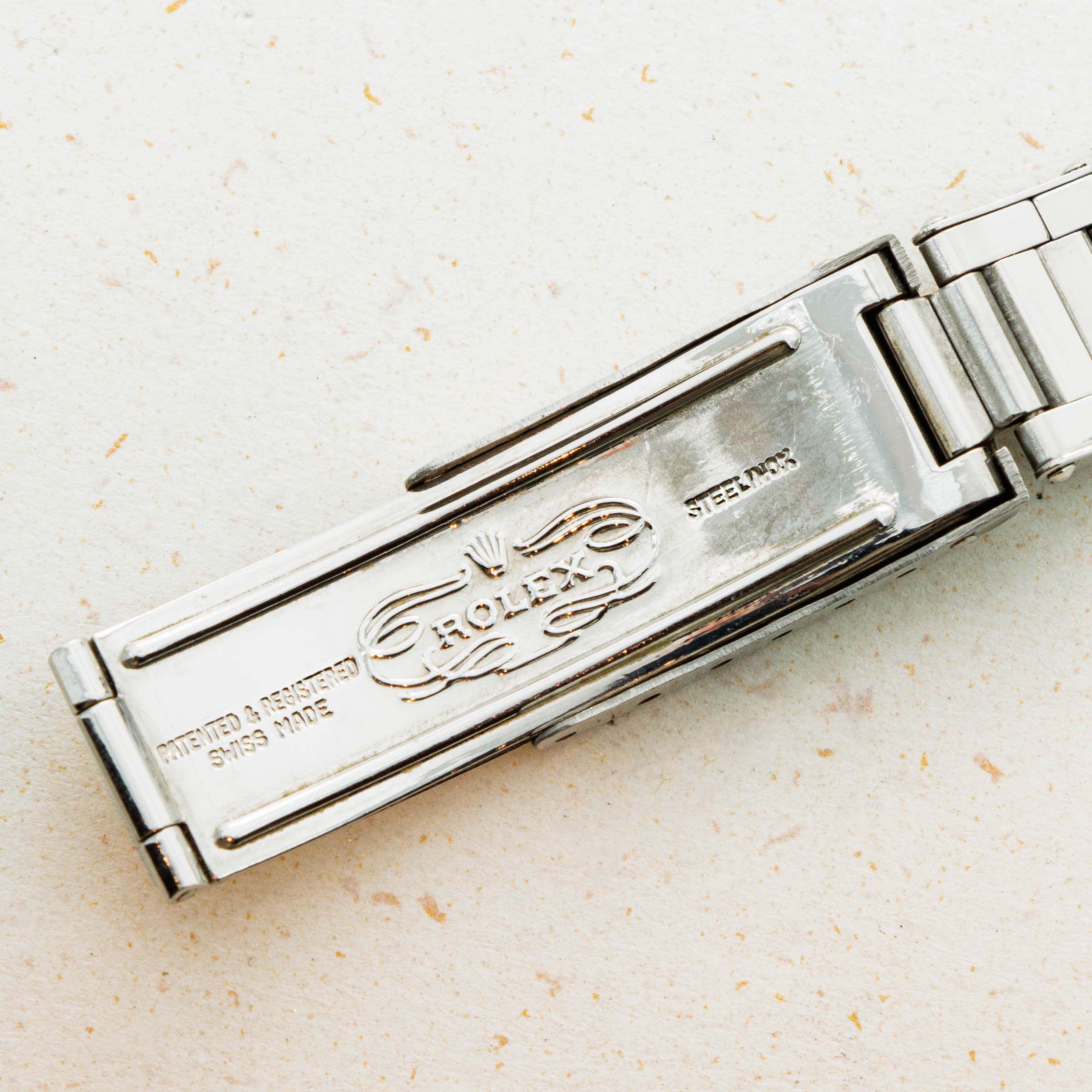 Watch is in excellent overall condition. Case has been previously polished and exhibits a clean brushed finish on top of the lugs, with some minor surface scratches visible on the polished sides. The bezel shows nice definition in the engravings with most of the black enamel still intact. The black three-color dial is in excellent condition, with intact luminous dots and a clean bright surface. The luminous dots have some shadowing underneath. The white track ring around the dial has some small areas of discoloration and wear on the edge. There is some minor wear on edge of the subdials but the surface concentric circles do not have any scratches visible. The 57 end piece oyster band has 13 links. There is little stretch.