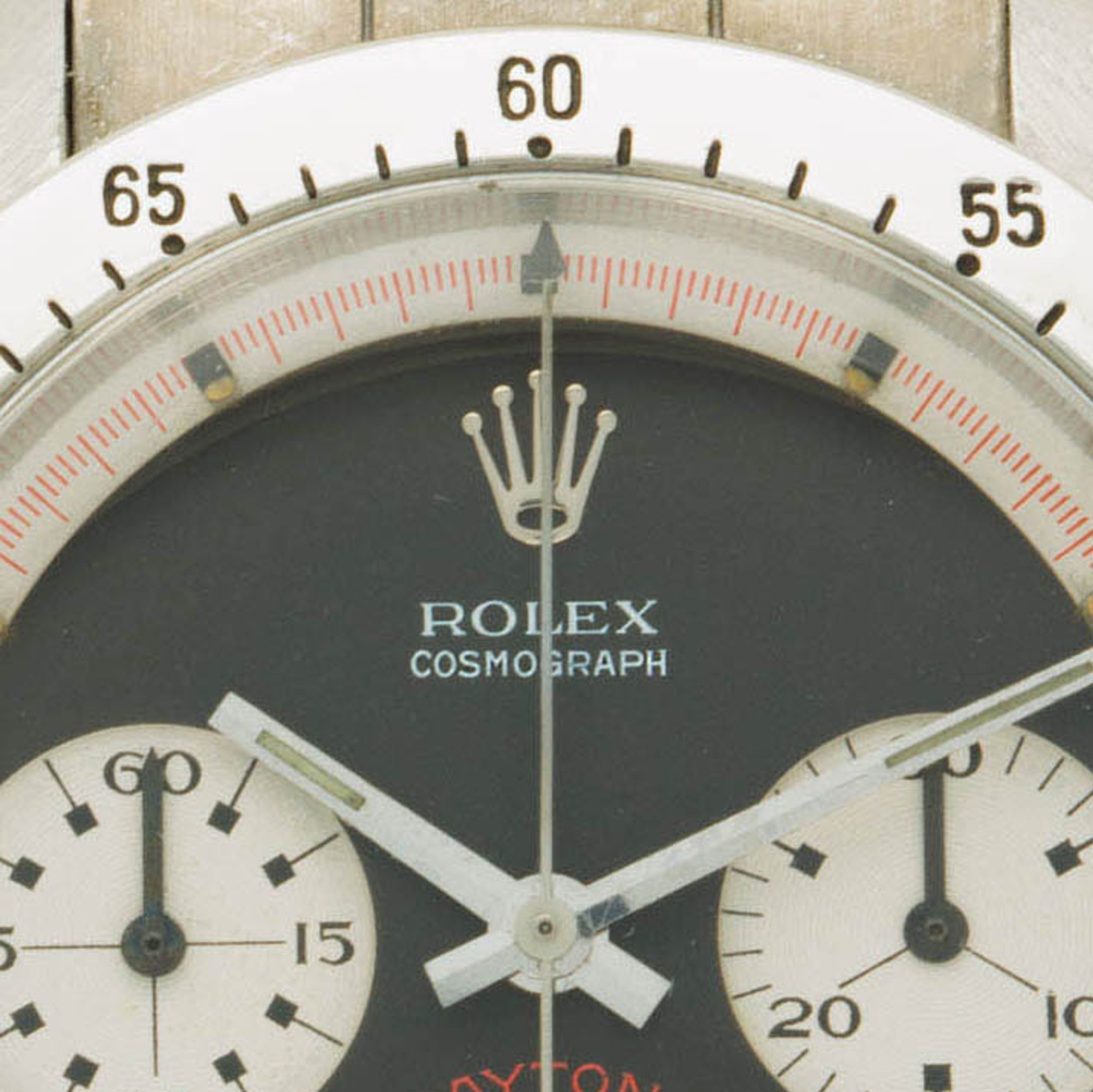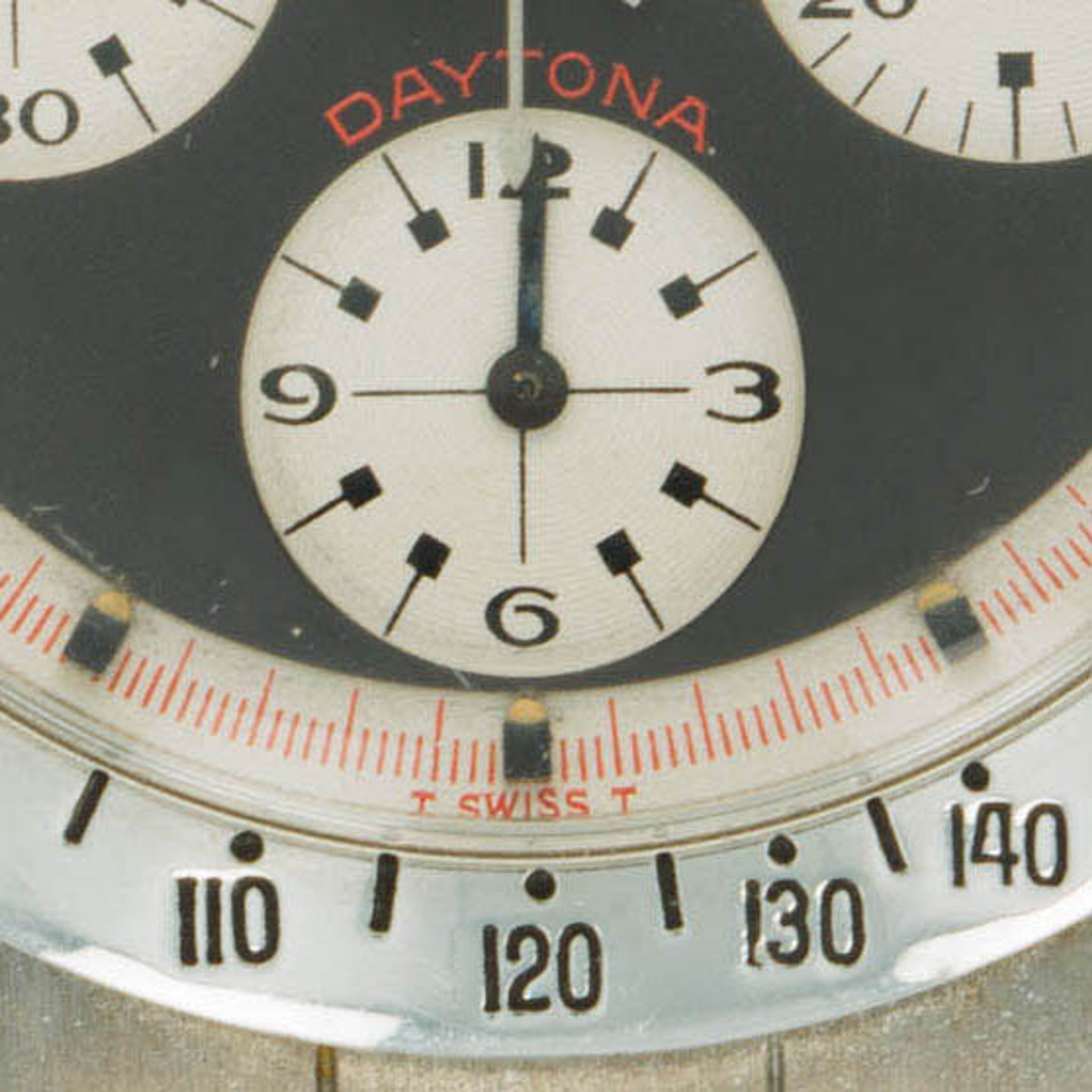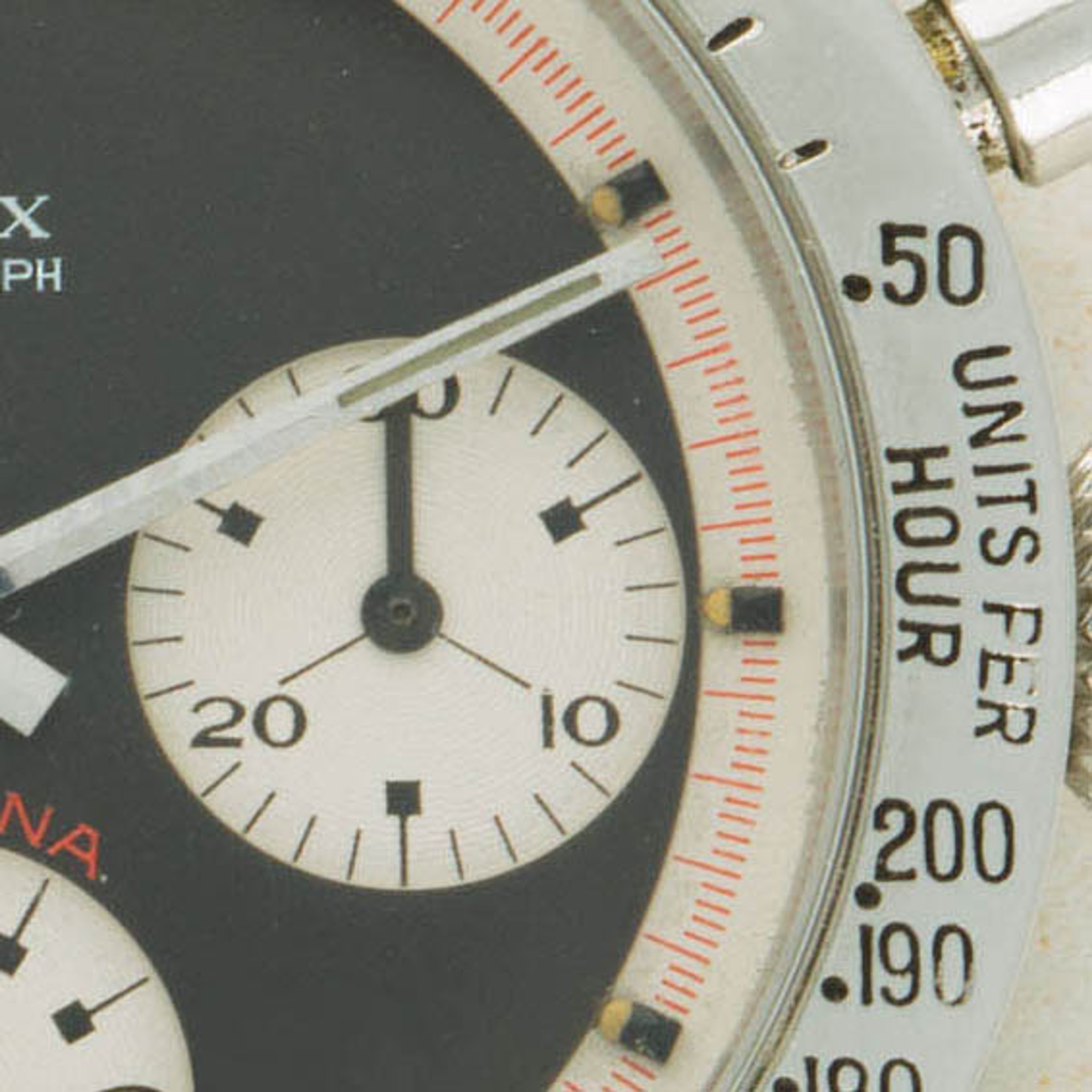 Released in 1963, the Rolex Cosmograph Daytona has become perhaps the most iconic chronograph the world has ever seen. Famed for its legendary design, a rich heritage in motorsport and ties to famed actor and race car driver Paul Newman whose wearing the watch spurred a watch collector frenzy, the Daytona's reputation precedes itself. However, it wasn’t always that way for the Daytona. Released to celebrate Rolex becoming the Daytona International Speedway's official timekeeper the year before in 1962, the Cosmograph was actually a commercial failure in the early years of its launch. Debuting as the ref. 6239, the reference we have here and the same reference that Paul Newman himself wore, the Cosmograph was up against industry titans like Heuer, Breitling and others. Measuring in at 37mm and powered by the iconic Valjoux cal. 722 movement, the ref. 6239 was up to the task, but customers would choose the other options instead. While Rolex had called the Cosmograph both the Le Mans and the Daytona, they eventually stuck with the Daytona name in 1965 and birthed the fully-fledged icon that we know today. In addition to the evolution of its name, another tactic Rolex employed to popularize their watch was giving it new dial variants, with the exotic dial, or “Paul Newman” dial as it is known existing as one of those dial variants. Best known for the square counters in its subdials and red accents along its chapter ring, the dial our ref. 6239 here features is indeed the ‘Paul Newman’ dial in black with white subdials, otherwise known as a "Reverse Panda" dial. An icon of horology and greater pop culture, the Paul Newman Daytona was popularized in the 1980s when collectors caught on to Paul Newman wearing his famous example, and since then the Daytona as a whole has become one of the most desirable watches in horology, and the four digit ‘Paul Newman’ exotic dial examples like the one we have here stand as the apex predator of that food chain.
