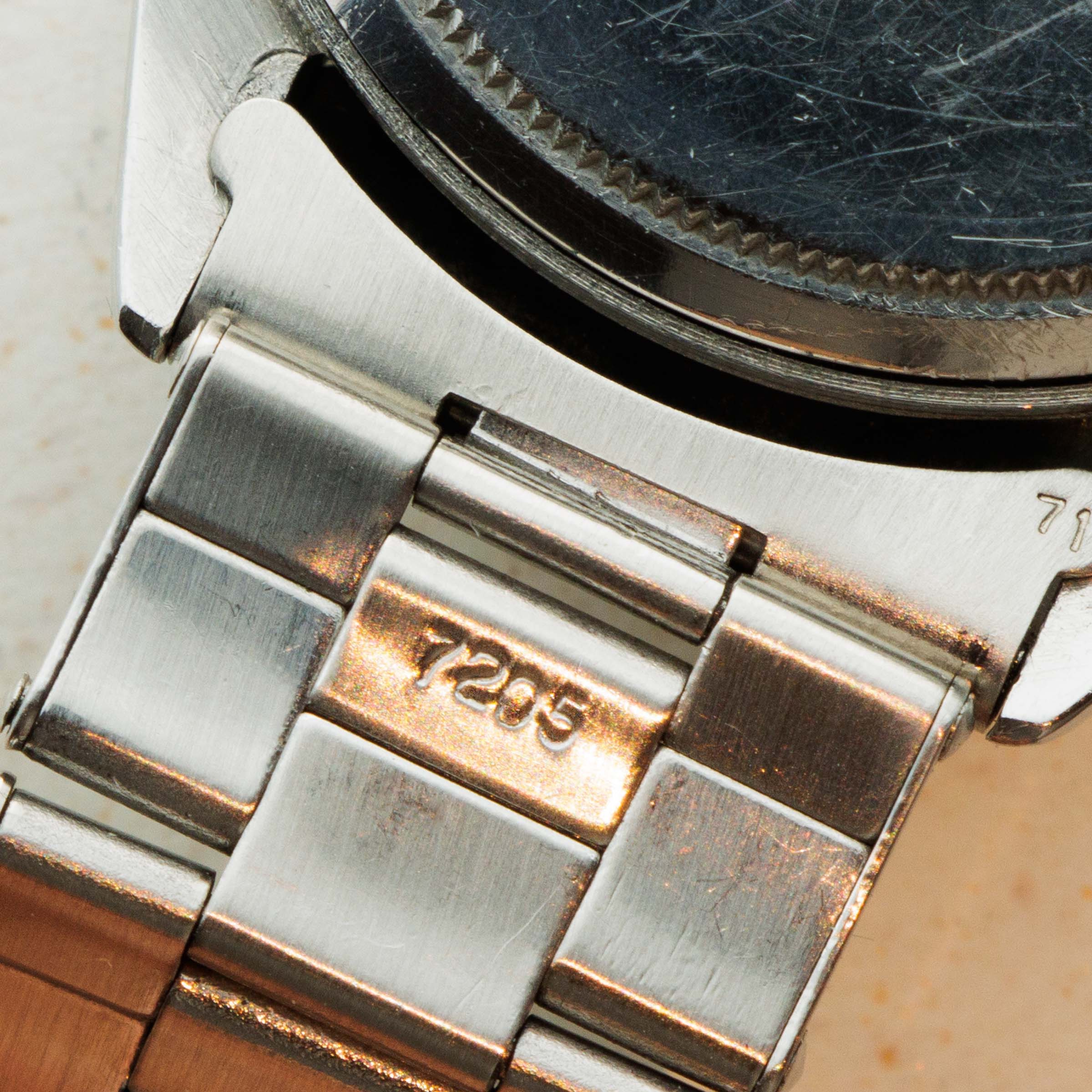 Watch is in near-mint overall condition. Case shows light signs of wear, with superficial scratches primarily visible on the polished case sides. Metal bezel has full enameling of the numbers in black, and only minor surface wear on the surface and edge. The dial is in near-mint condition. Luminous plots are all intact and have a pleasing cream tone that matches the hands. Crystal shows minor surface scratches. Bracelet is a 7025 Swiss rivet band with the proper 71 end links. It has 11 links total, and there is light stretch.