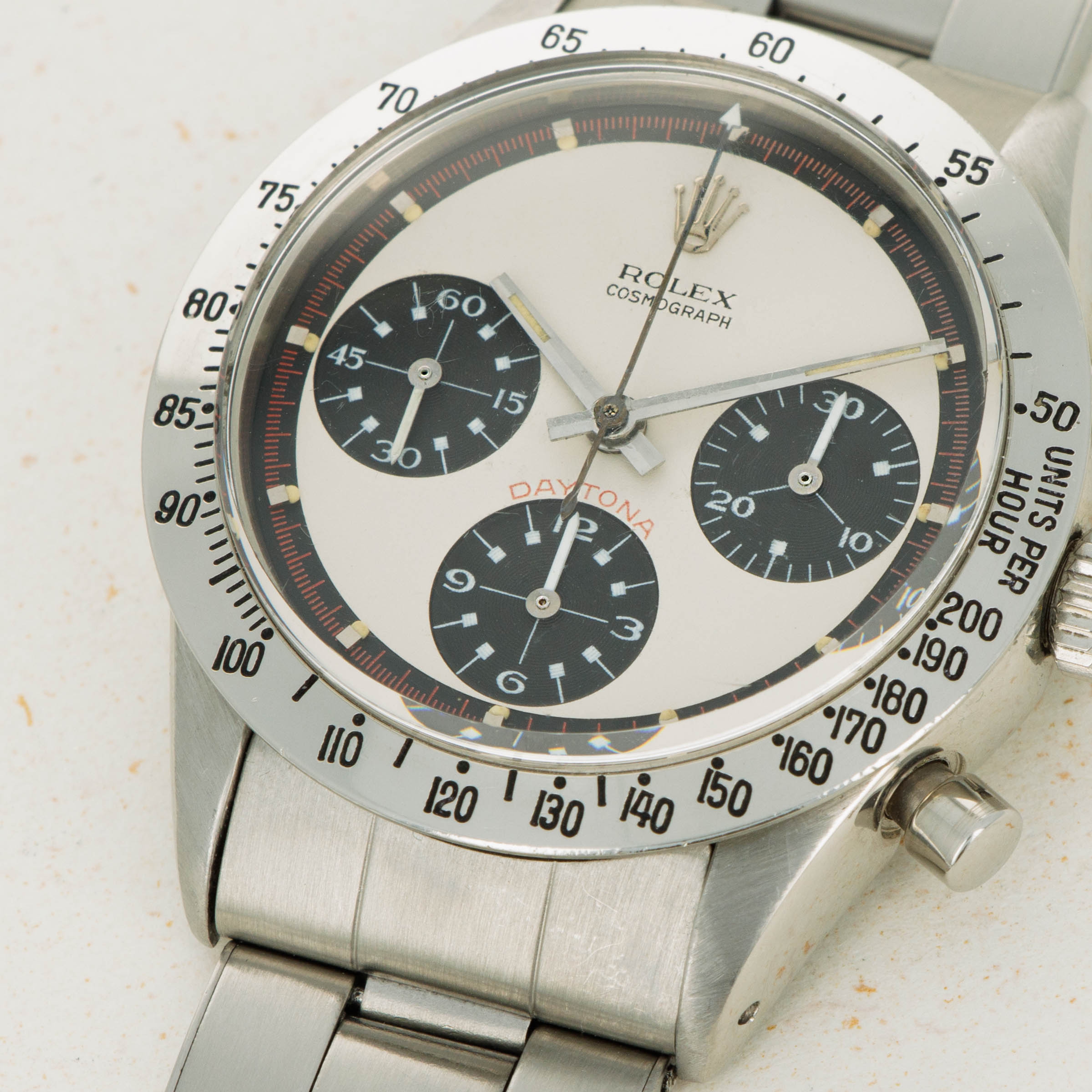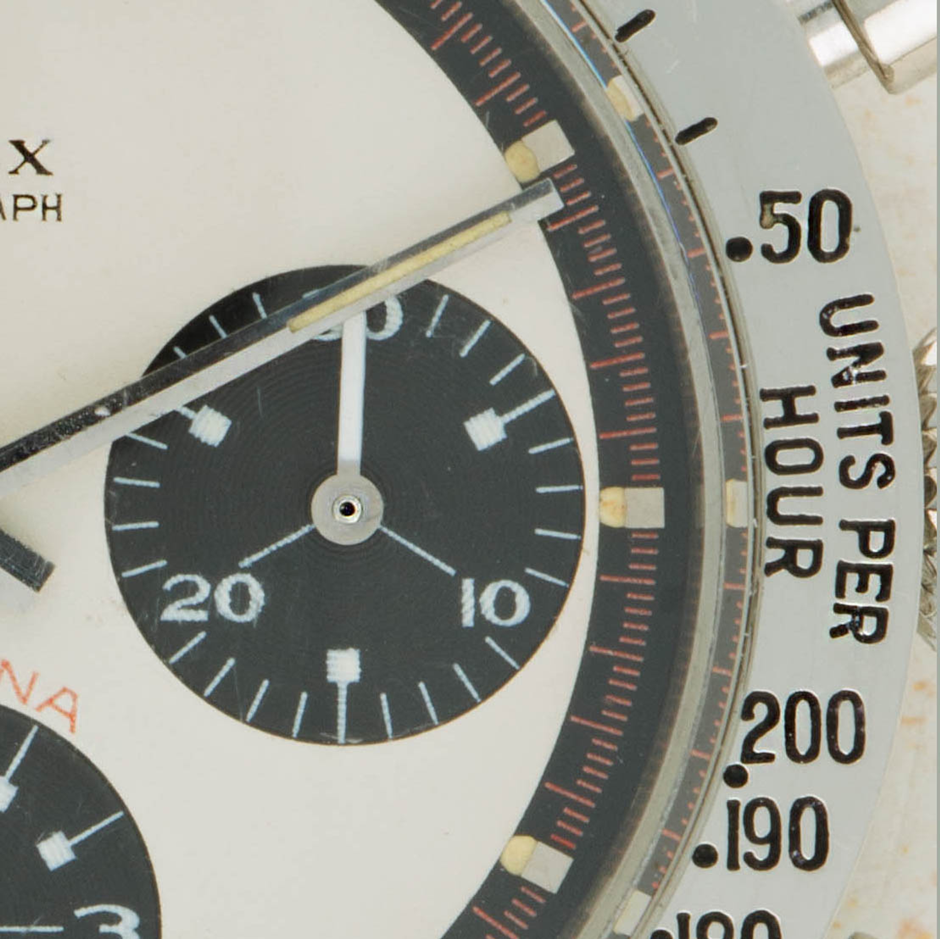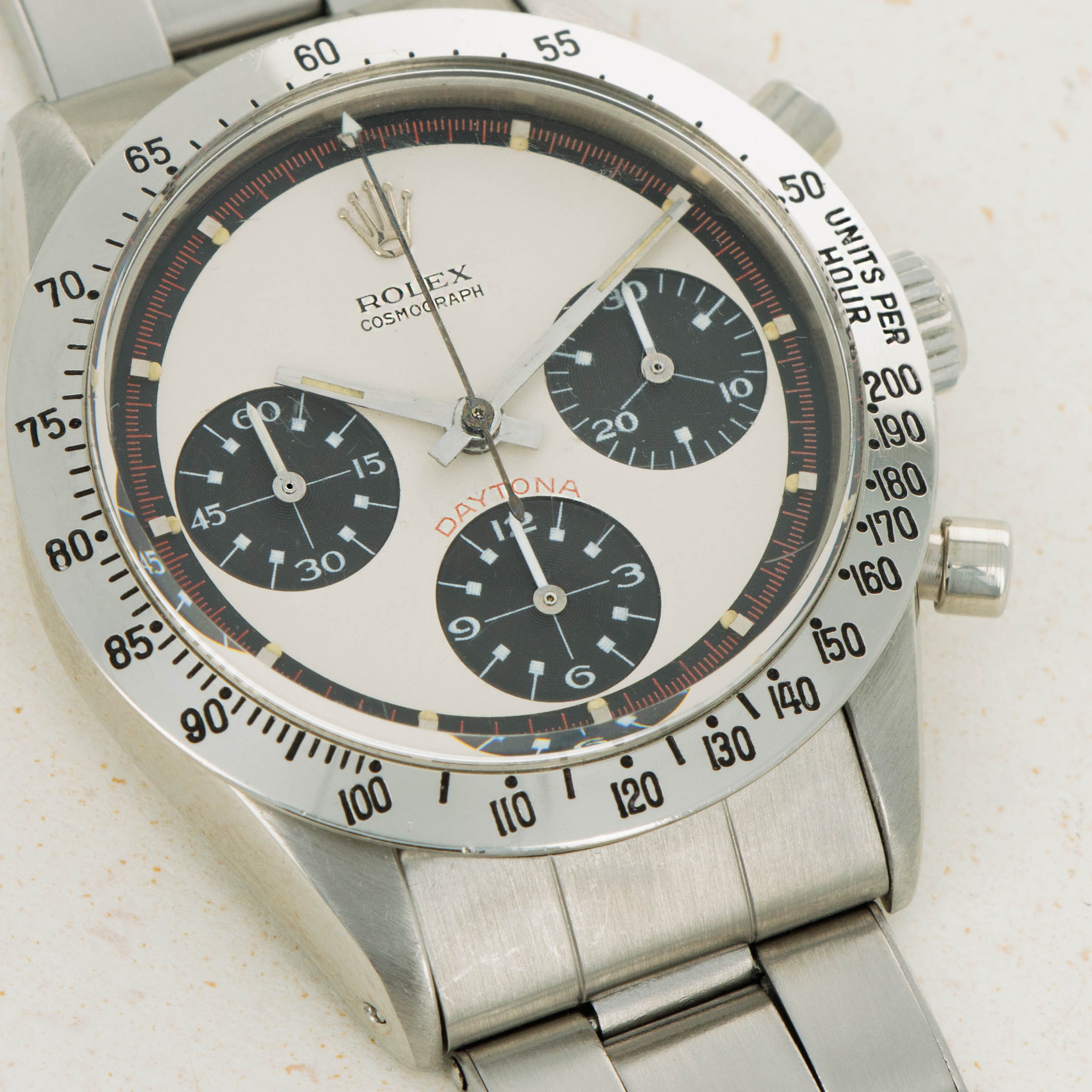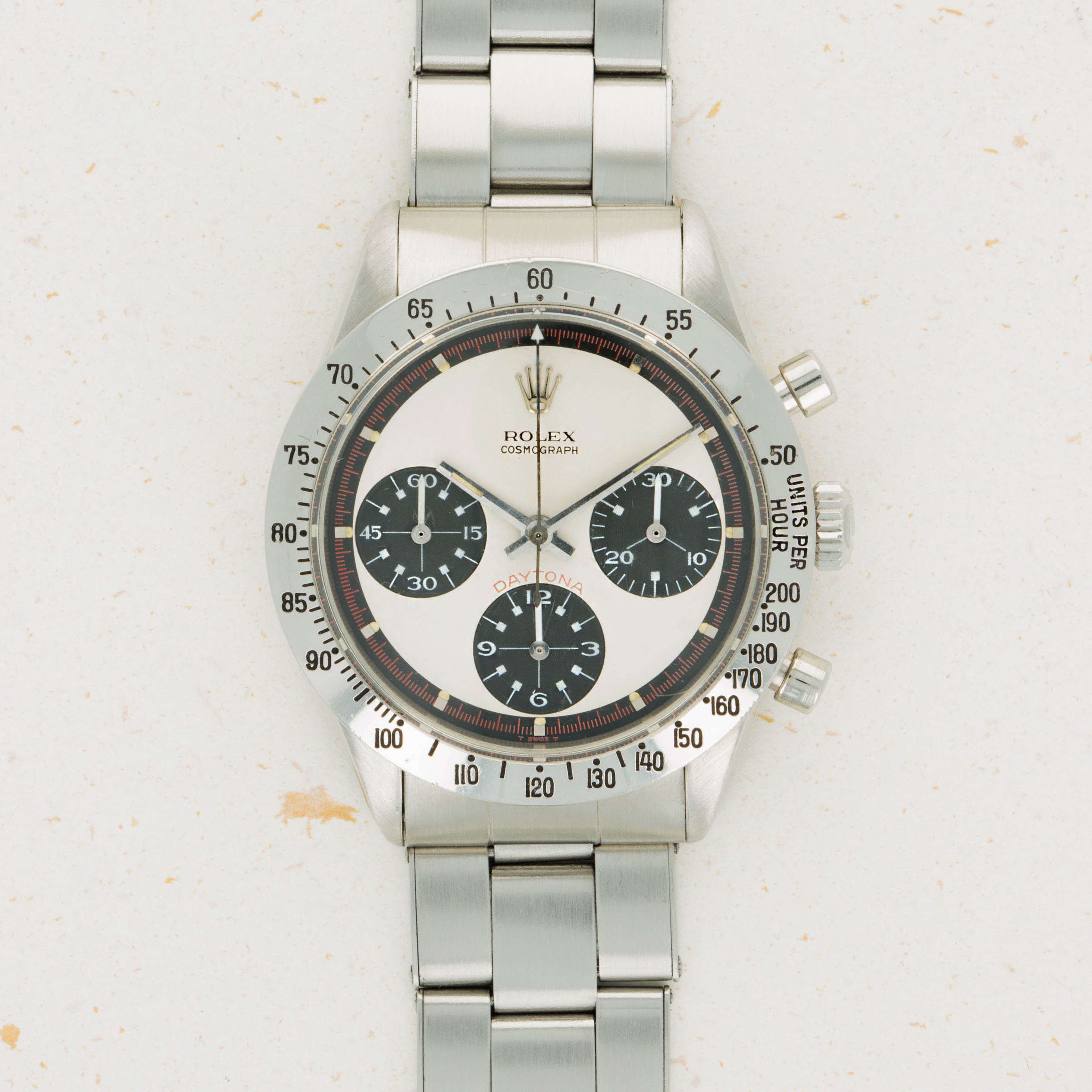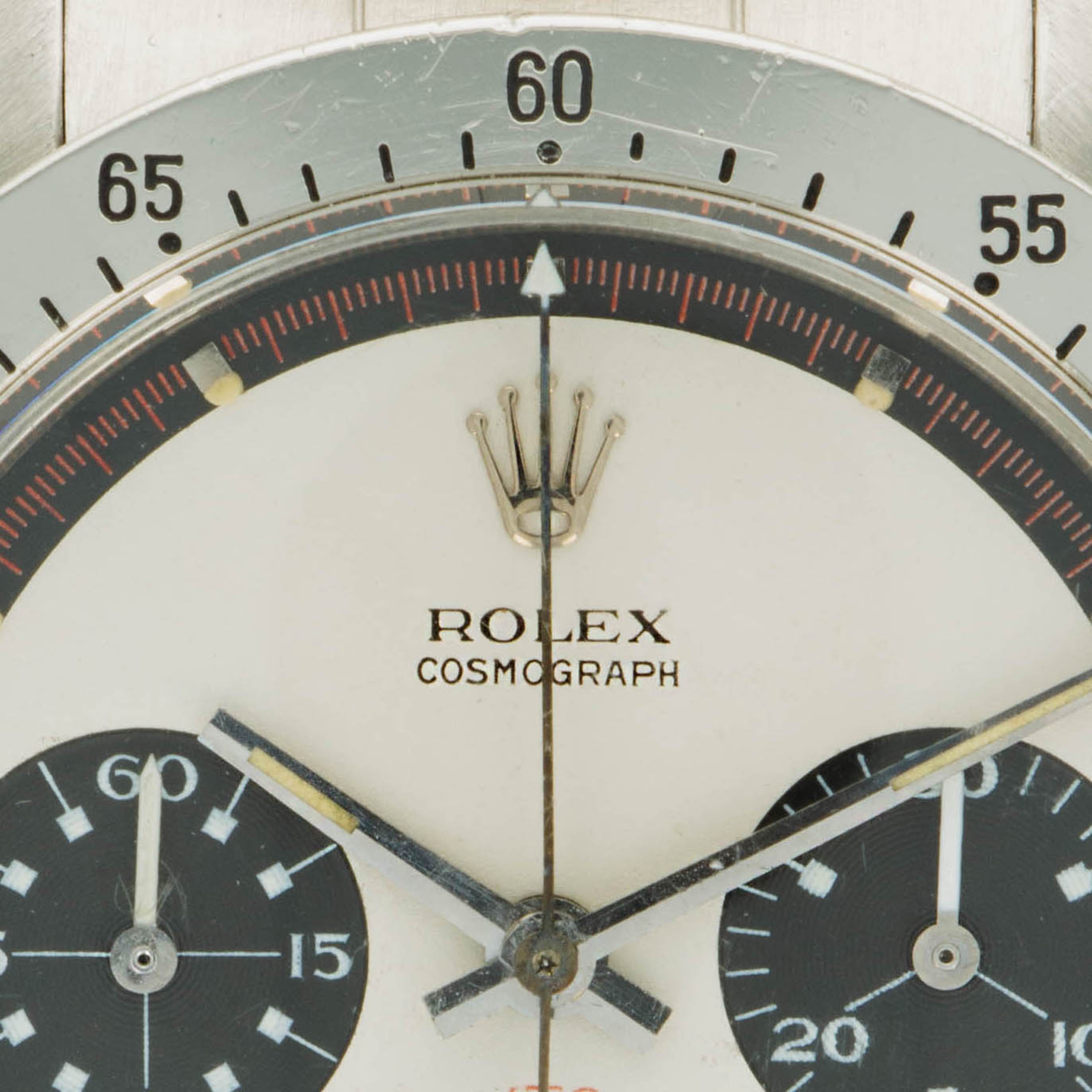 Released in 1963, the Rolex Cosmograph Daytona has become perhaps the most iconic chronograph the world has ever seen. Famed for its legendary design, a rich heritage in motorsport and ties to famed actor and race car driver Paul Newman whose wearing the watch spurred a watch collector frenzy, the Daytona's reputation precedes itself. However, it wasn’t always that way for the Daytona. Released to celebrate Rolex becoming the Daytona International Speedway's official timekeeper the year before in 1962, the Cosmograph was actually a commercial failure in the early years of its launch. Debuting as the ref. 6239, the reference we have here and the same reference that Paul Newman himself wore, the Cosmograph was up against industry titans like Heuer, Breitling and others. Measuring in at 37mm and powered by the iconic Valjoux cal. 722 movement, the ref. 6239 was up to the task, but customers would choose the other options instead. While Rolex had called the Cosmograph both the Le Mans and the Daytona, they eventually stuck with the Daytona name in 1965 and birthed the fully-fledged icon that we know today. In addition to the evolution of its name, another tactic Rolex employed to popularize their watch was giving it new dial variants, with the exotic dial, or “Paul Newman” dial as it is known existing as one of those dial variants. Best known for the square counters in its subdials and red accents along its chapter ring, the dial our ref. 6239 here features is indeed the ‘Paul Newman’ dial. An icon of horology and greater pop culture, the Paul Newman Daytona was popularized in the 1980s when collectors caught on to Paul Newman wearing his famous example, and since then the Daytona as a whole has become one of the most desirable watches in horology, and the four digit ‘Paul Newman’ exotic dial examples like the one we have here stand as the apex predator of that food chain.