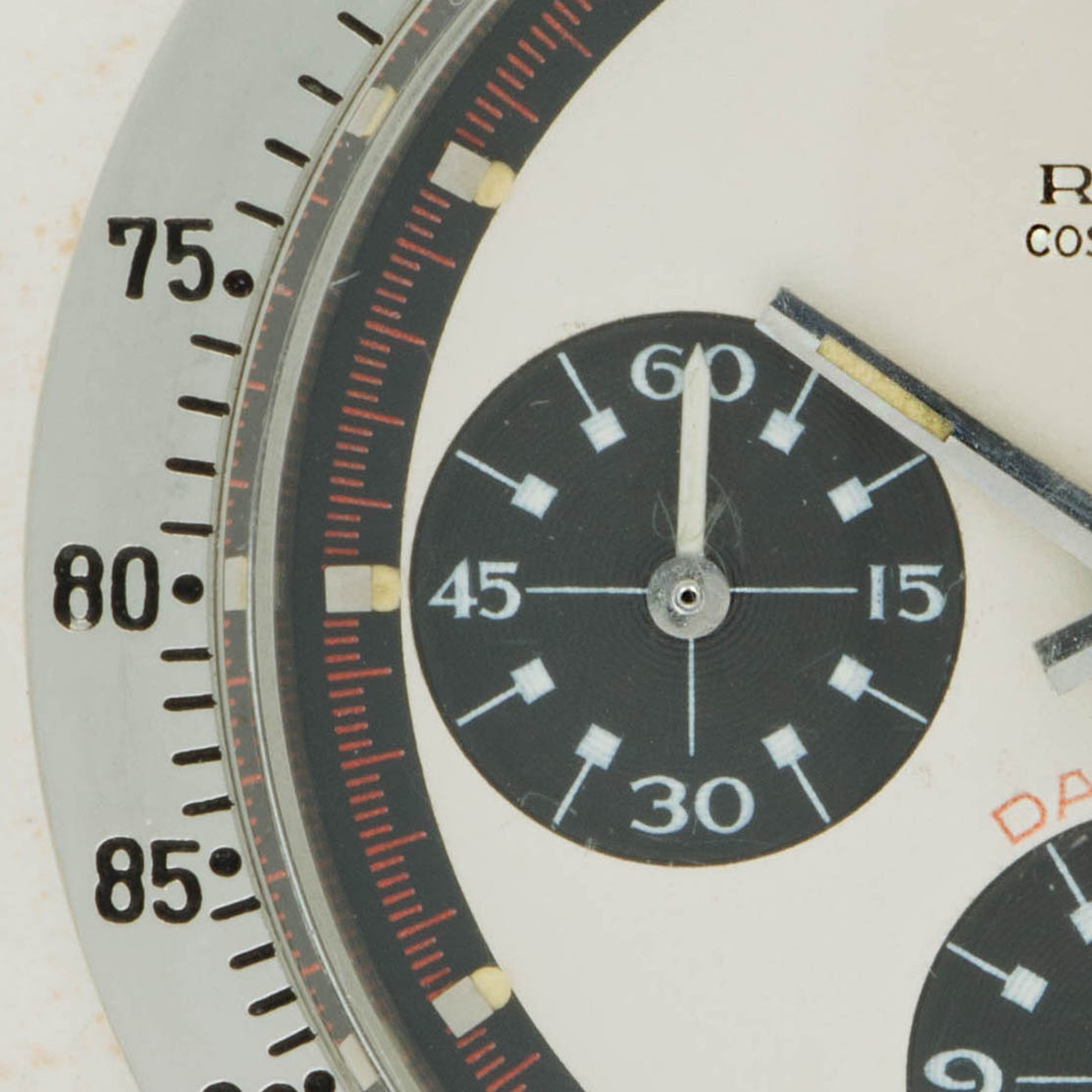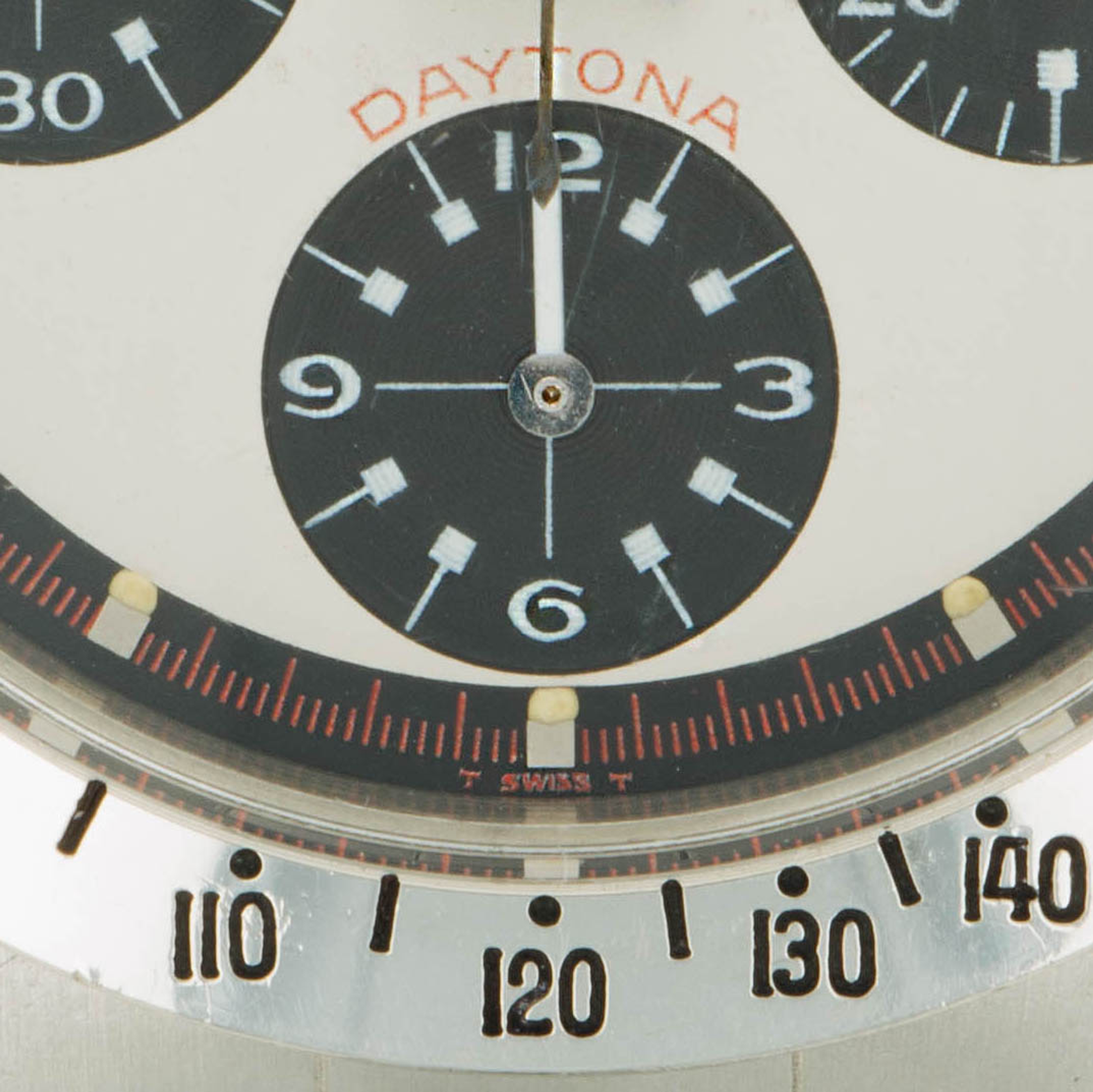 Boasting the exotic or "Paul Newman" dial, this ref. 6239 features a panda dial with its black subdials sporting a unique serif font with red inscriptions along its chapter ring.