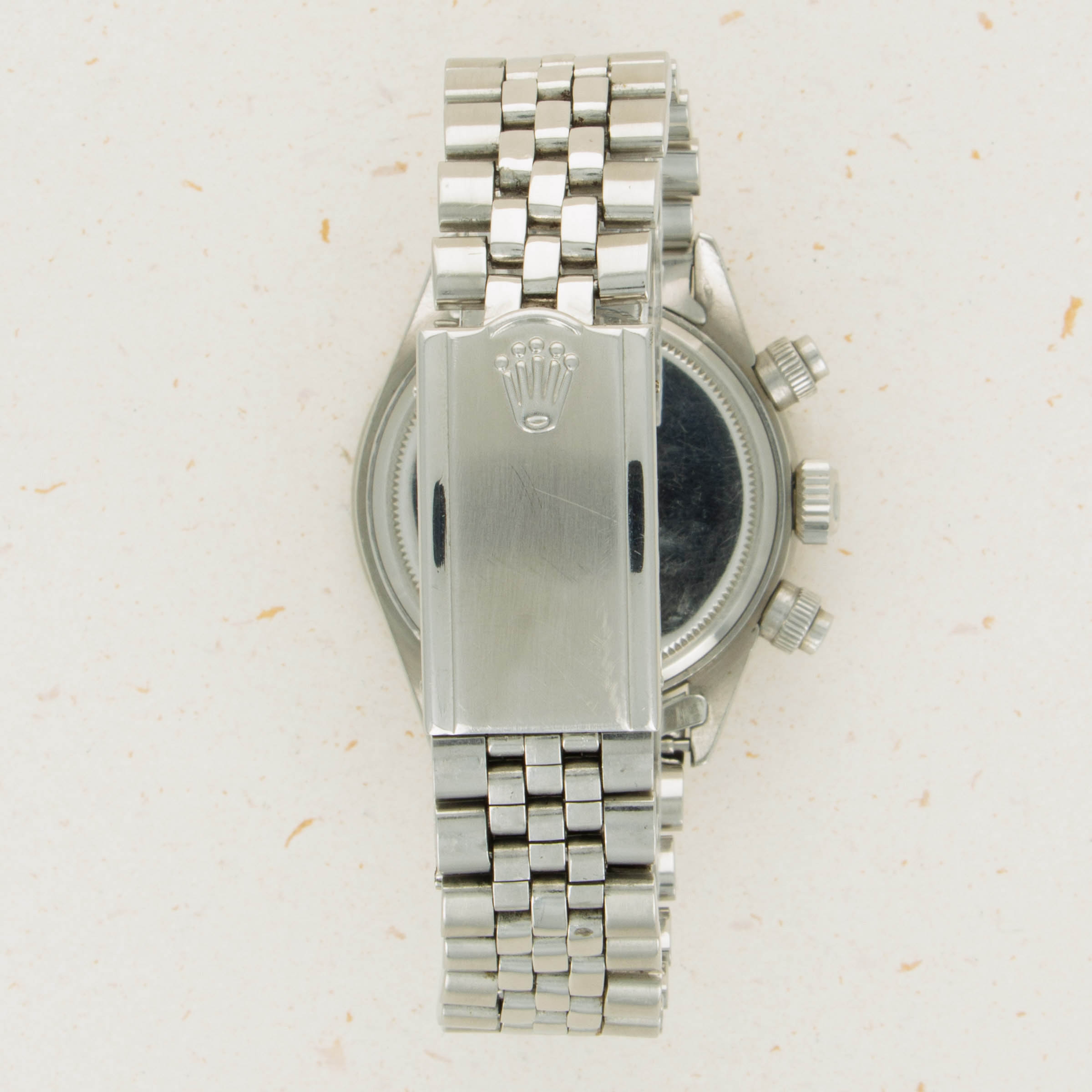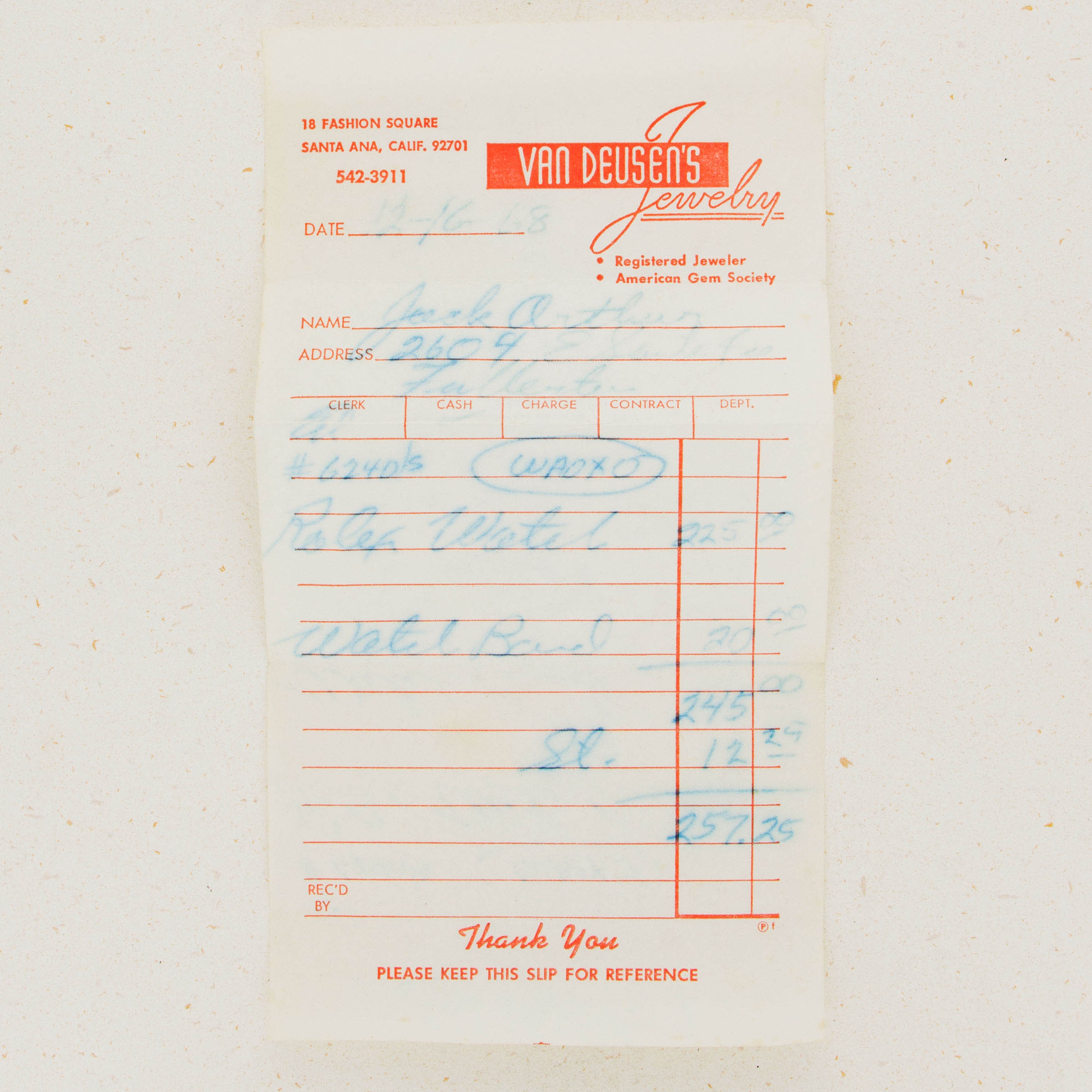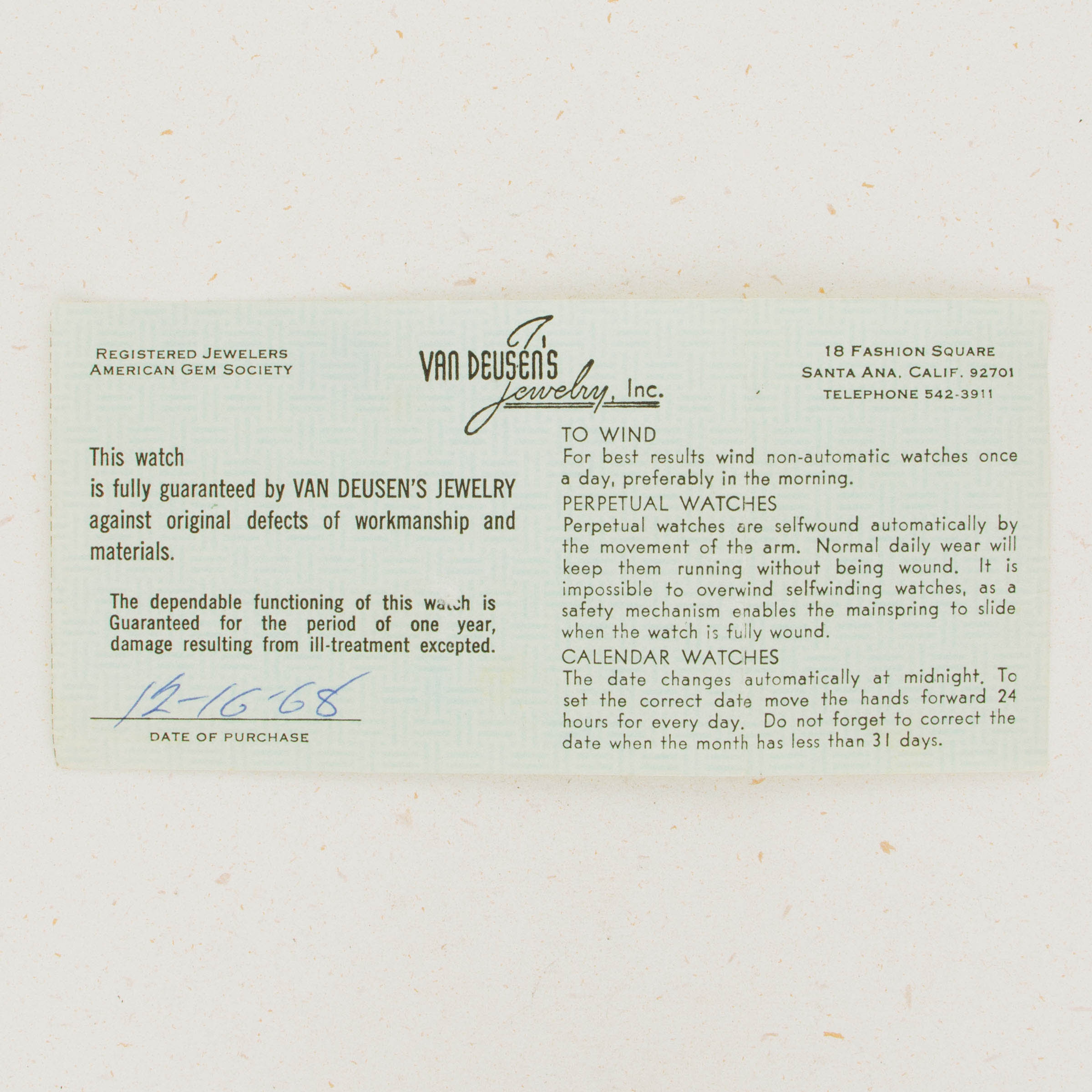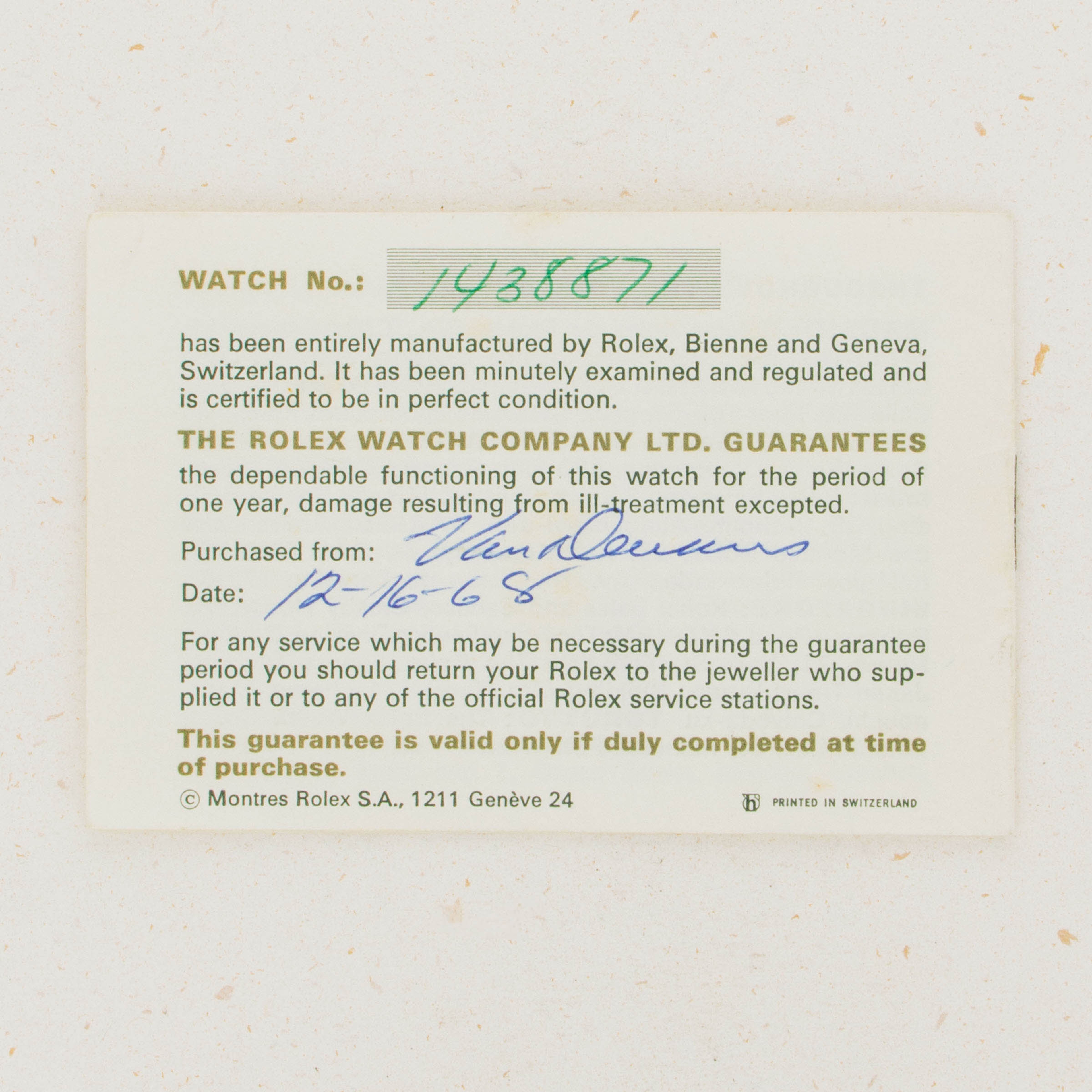 While this timepiece was sold in 1968, as its card and receipt states, it was actually produced in 1966 and, as a result, still lacks the "Oyster" designation on its dial. Adding to its rarity, this example's dial also features large "Daytona" print, and tropical patina on its subdials, making it a true collector's quality timepiece.
