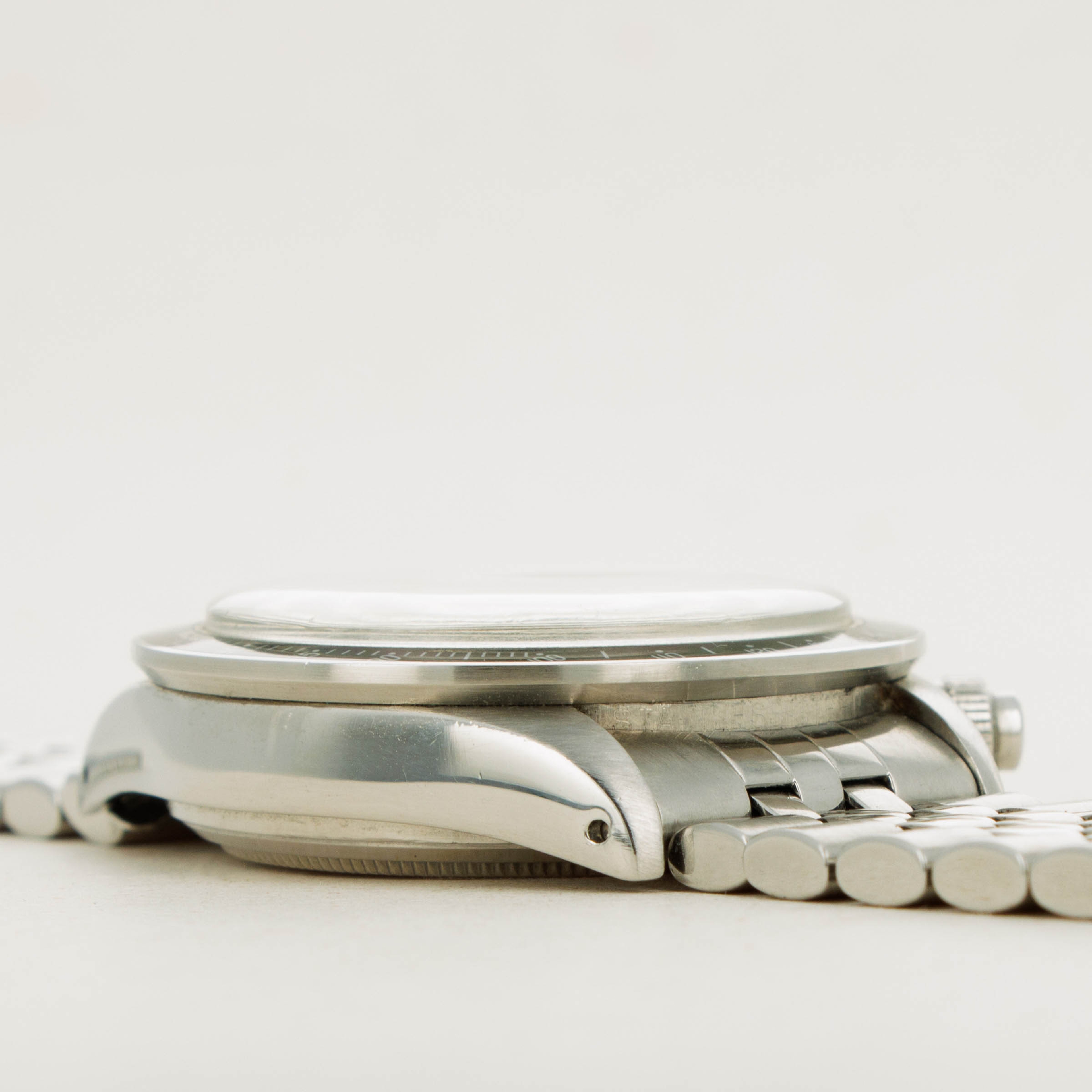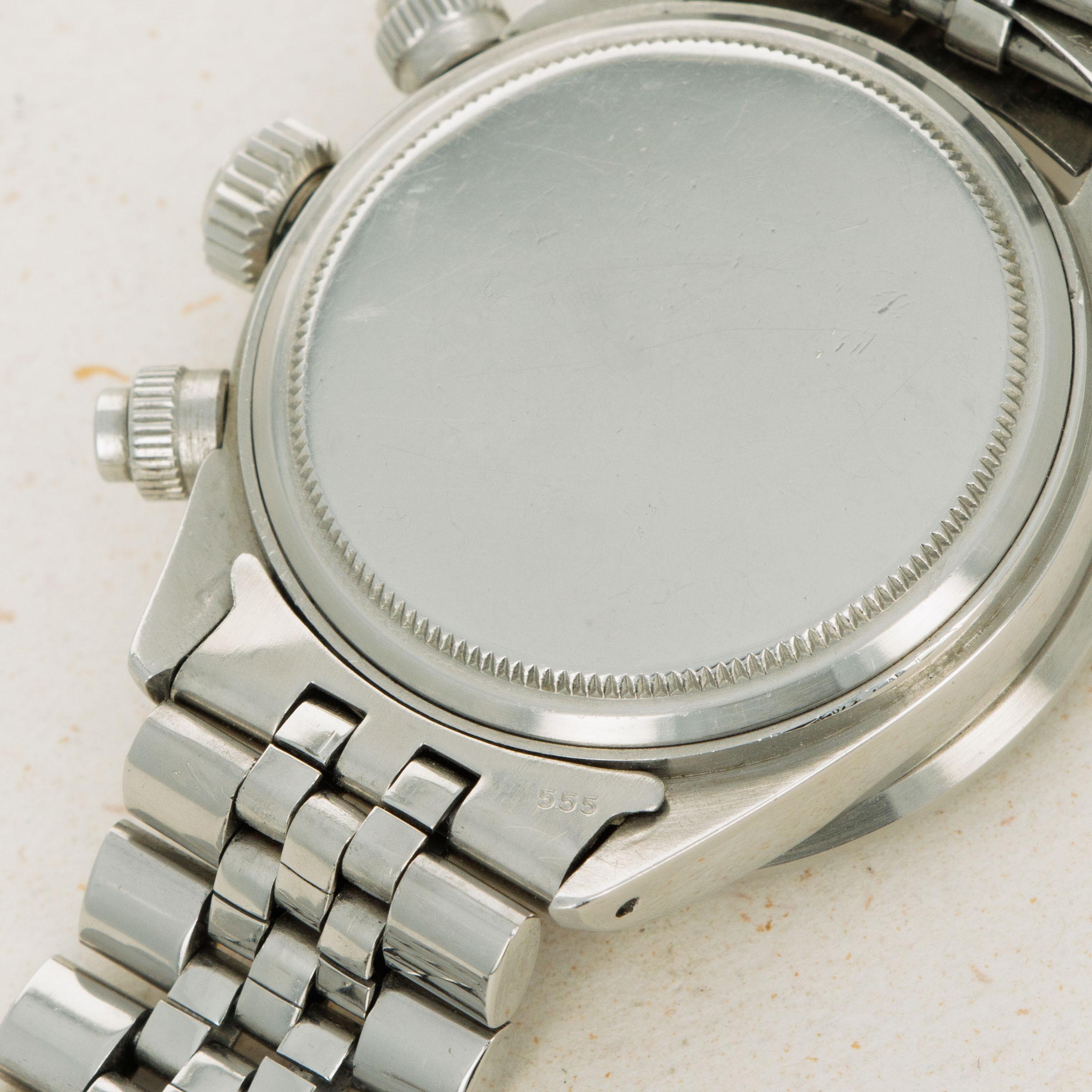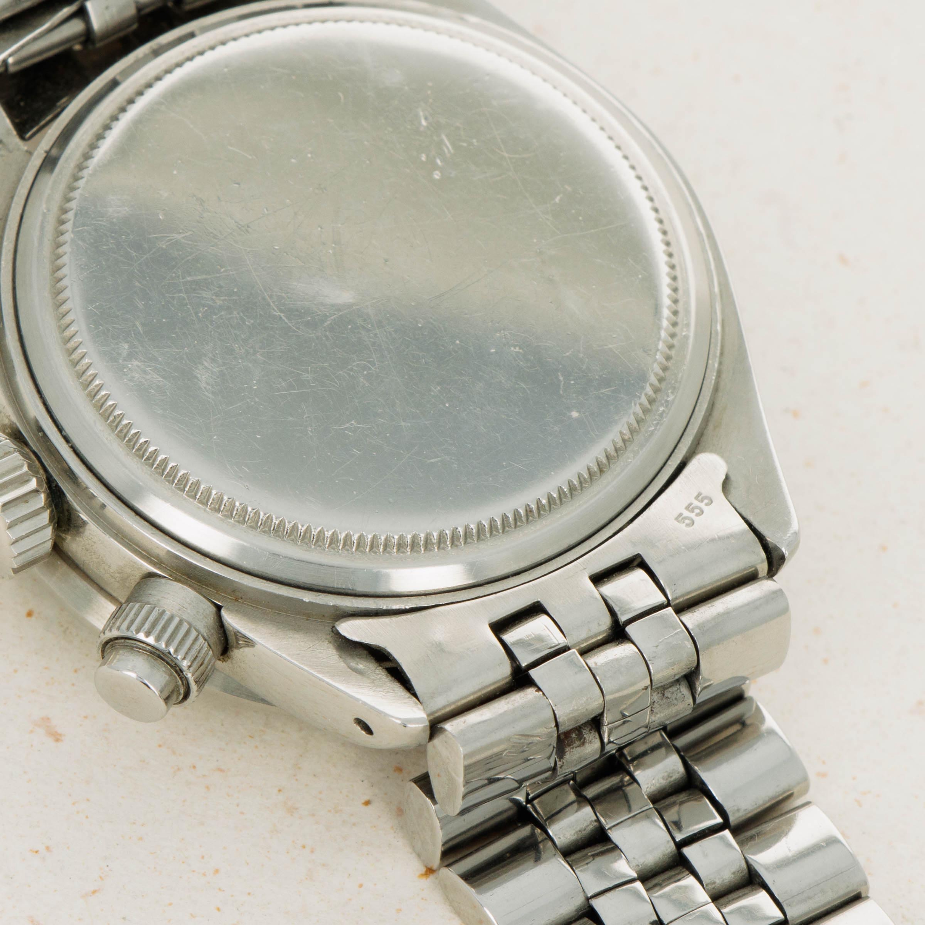 Watch is in very good overall condition. Case exhibits typical signs of wear, with surface marks and scratches. Numbers between the lugs are crisp and visible. Original MK0 pushers have some light oxidation and wear. Bezel is fitted with an original "MK 1" bezel in excellent condition. There are no cracks in the plastic, but there is a minor area of delimitation from around 75-70 on the tachometer scale. Dial in very good overall condition. Subdials have aged to a nice dark chocolate tone, with no substantial signs of wear. There are a few broken luminous dots around the dial, as well as two imperfections from the edge of the dial radiating towards the subdial at 3 o'clock. Watch is fitted on a jubilee bracelet with 20 links total. There is some stretch. Watch is accompanied by a later box as well as original sales receipt, guarantee card and associated paperwork.