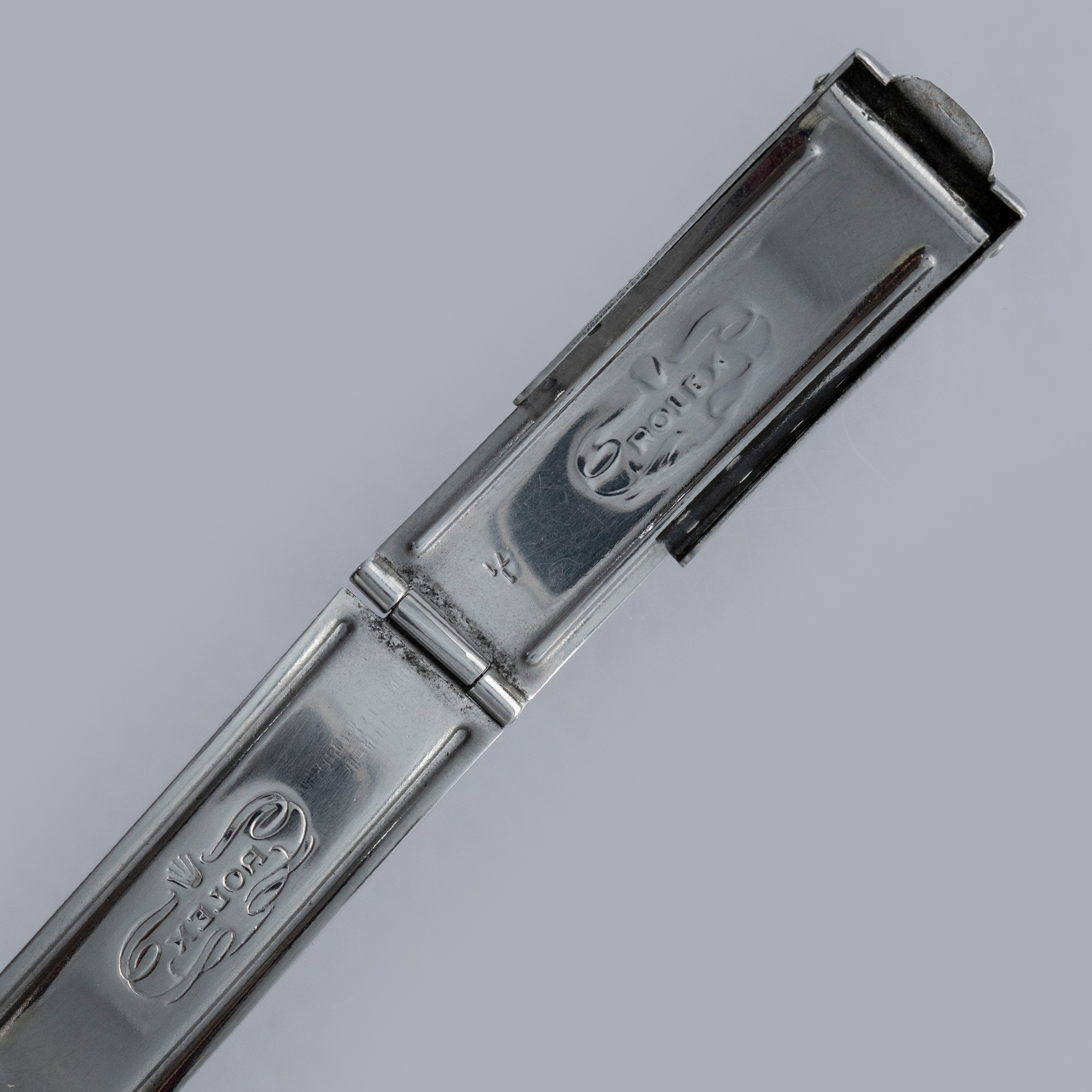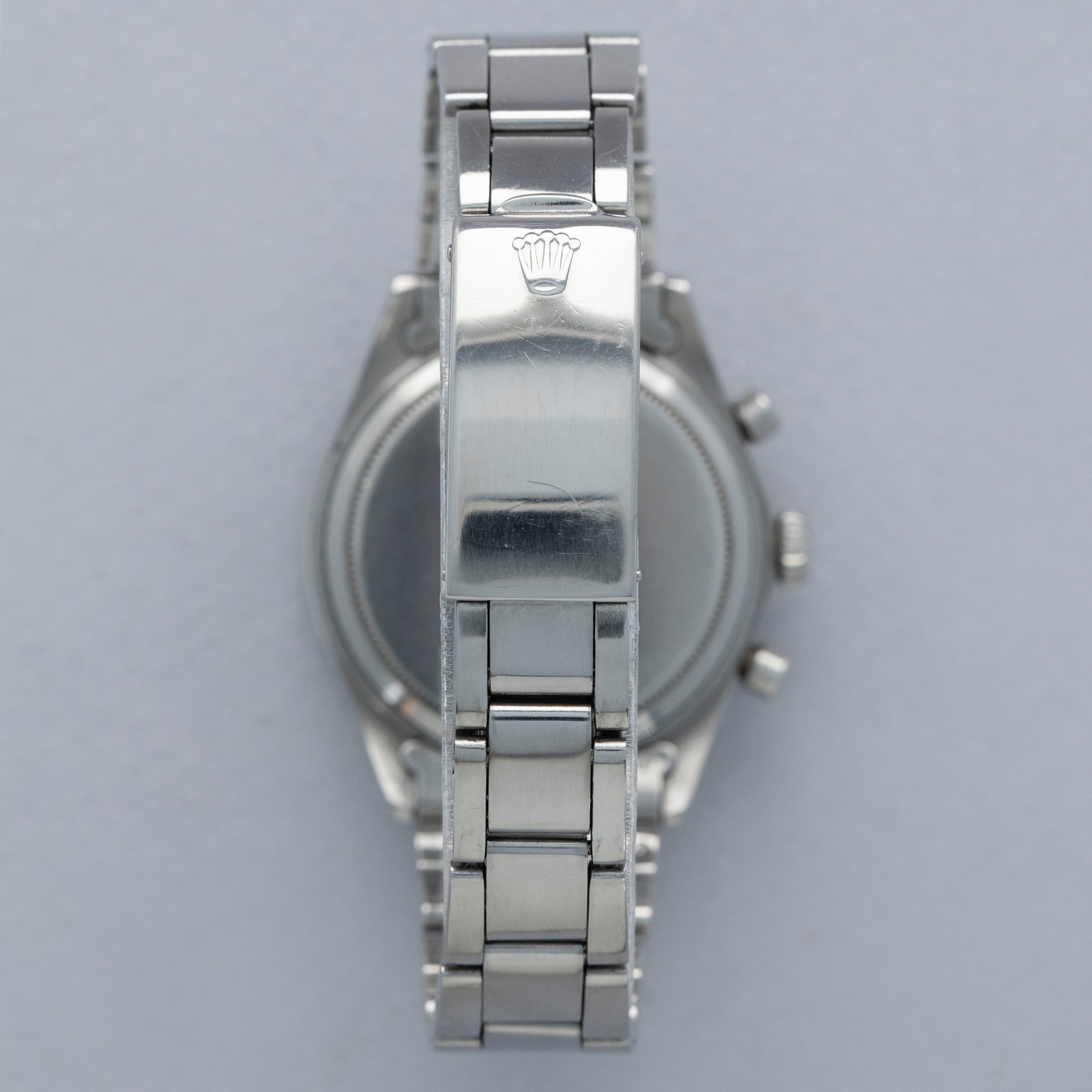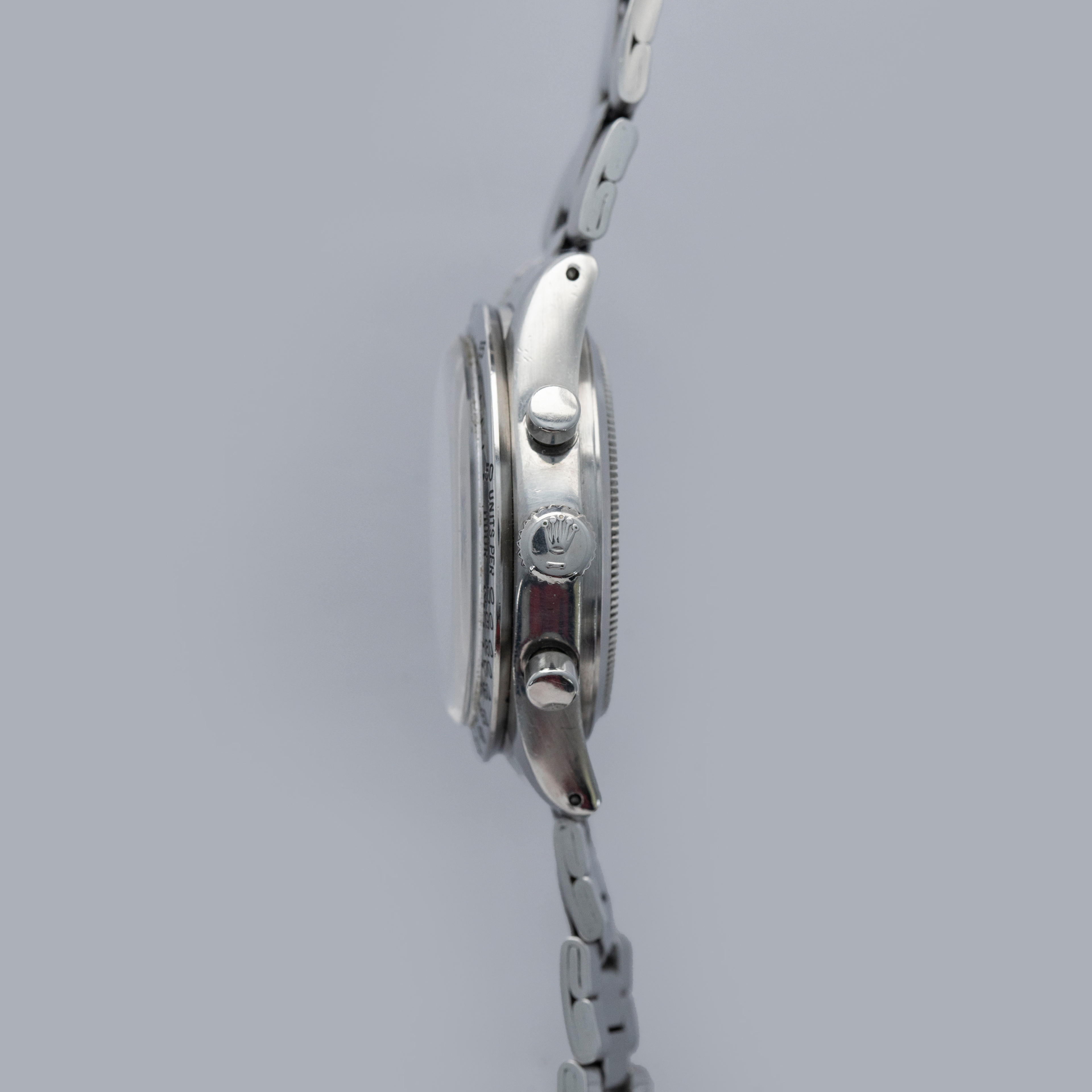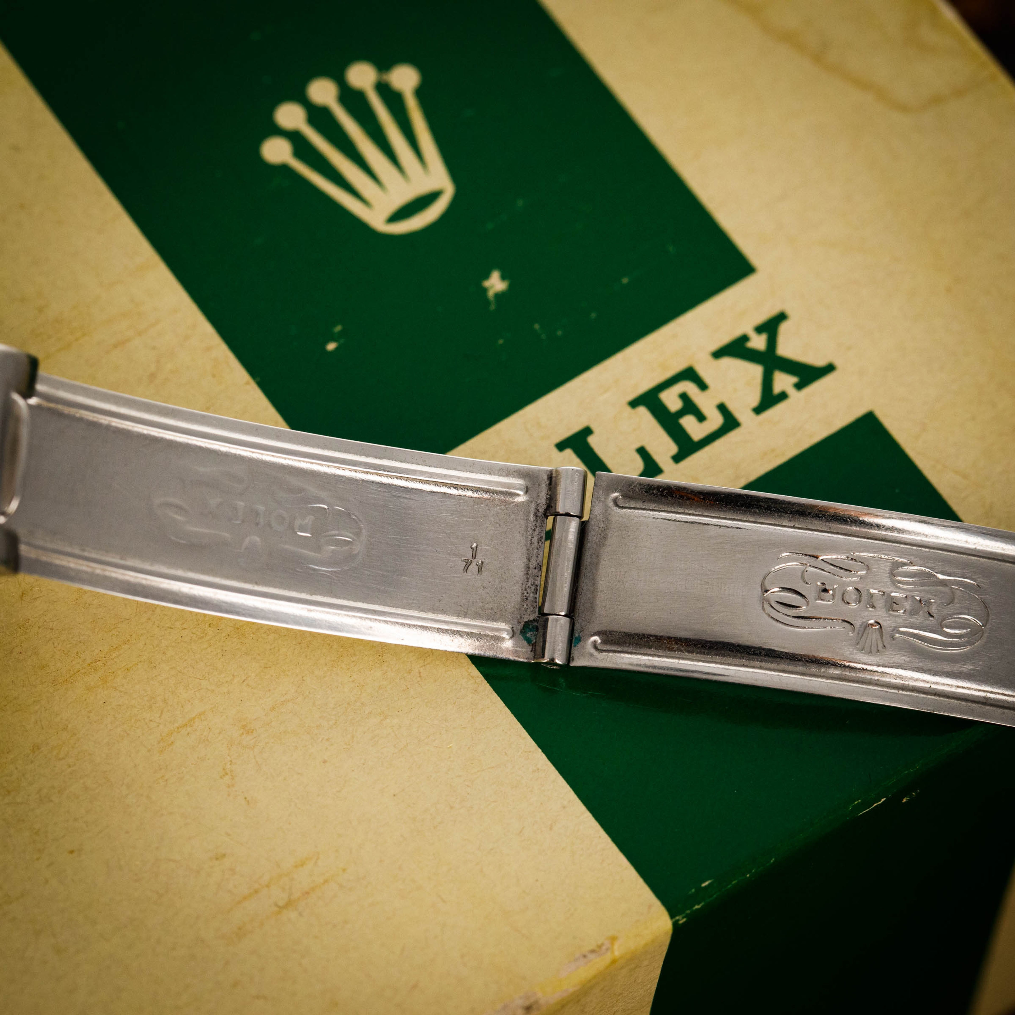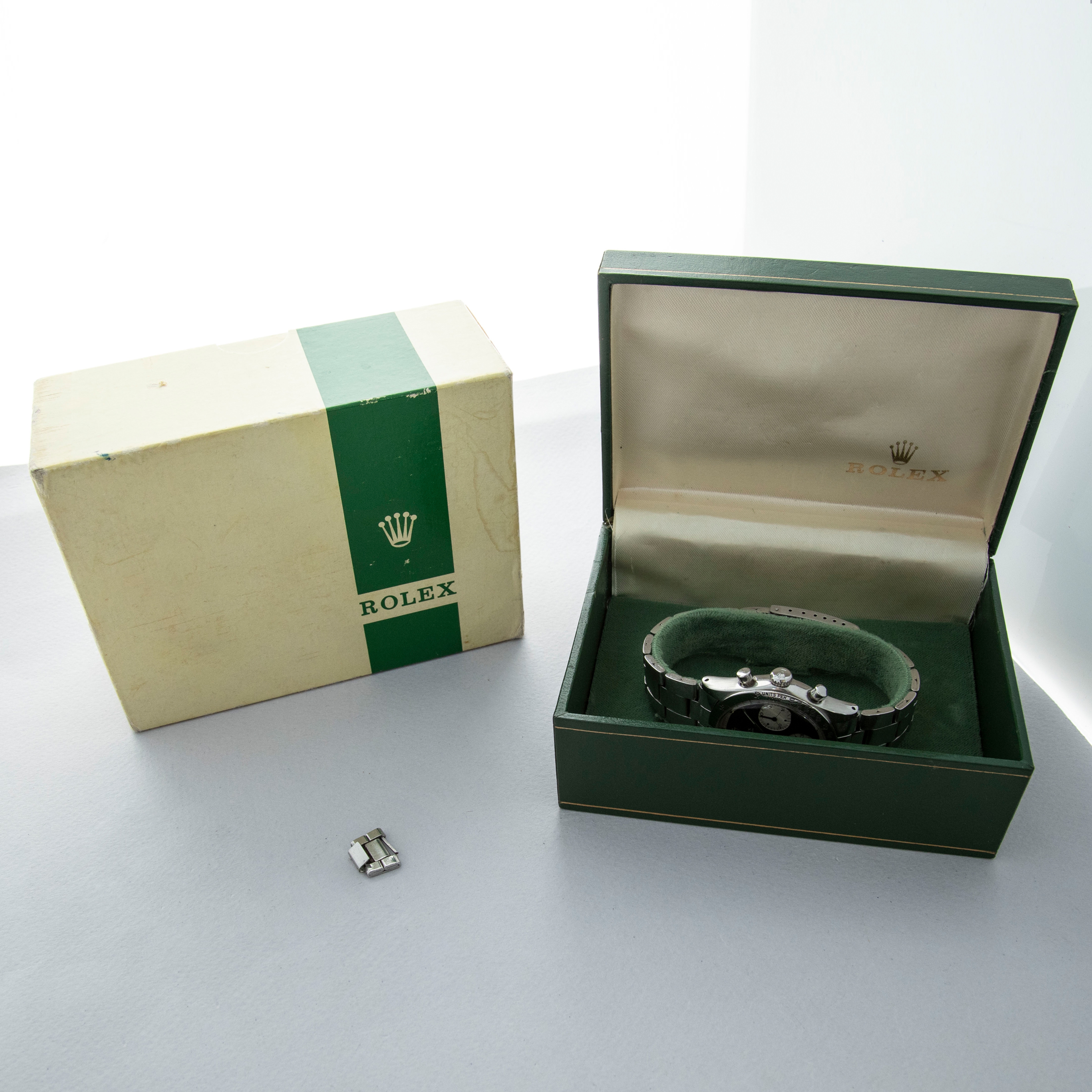 Watch is in excellent overall condition. Case lugs are thick and well defined, with a high polish sheen that has developed on the top lug surfaces. There are minor dings and marks visible, but nothing noteworthy. The bezel has nearly all of its black enamel fully intact. Oyster crown shows signs of surface wear and some surface marks visible on the embossed coronet. The dial is in excellent condition. The dial exhibits bright whites and reds, with little to no signs of fading typically found on these dials. Luminous dots remain intact with minimal signs of aging visible on them. There are light areas of discoloration visible in the subdials as seen in the images. Luminous inserts in the hands are toned similarly to the dial. Watch comes on a period folded oyster band, with 12 links, fitting approx. a 7 1/4" wrist, with proper 271 Daytona endpieces. Watch is accompanied by a period inner and outer box set.